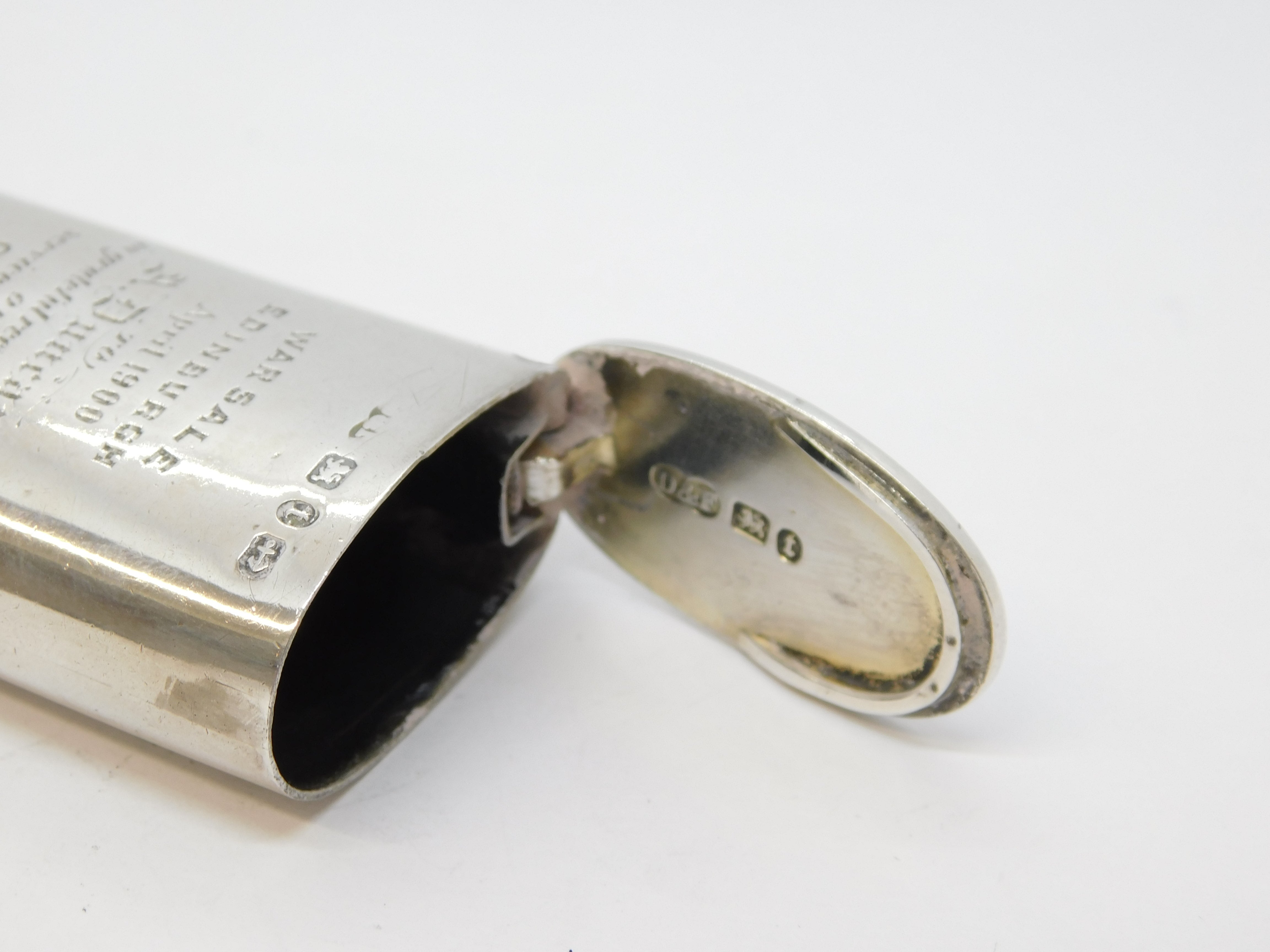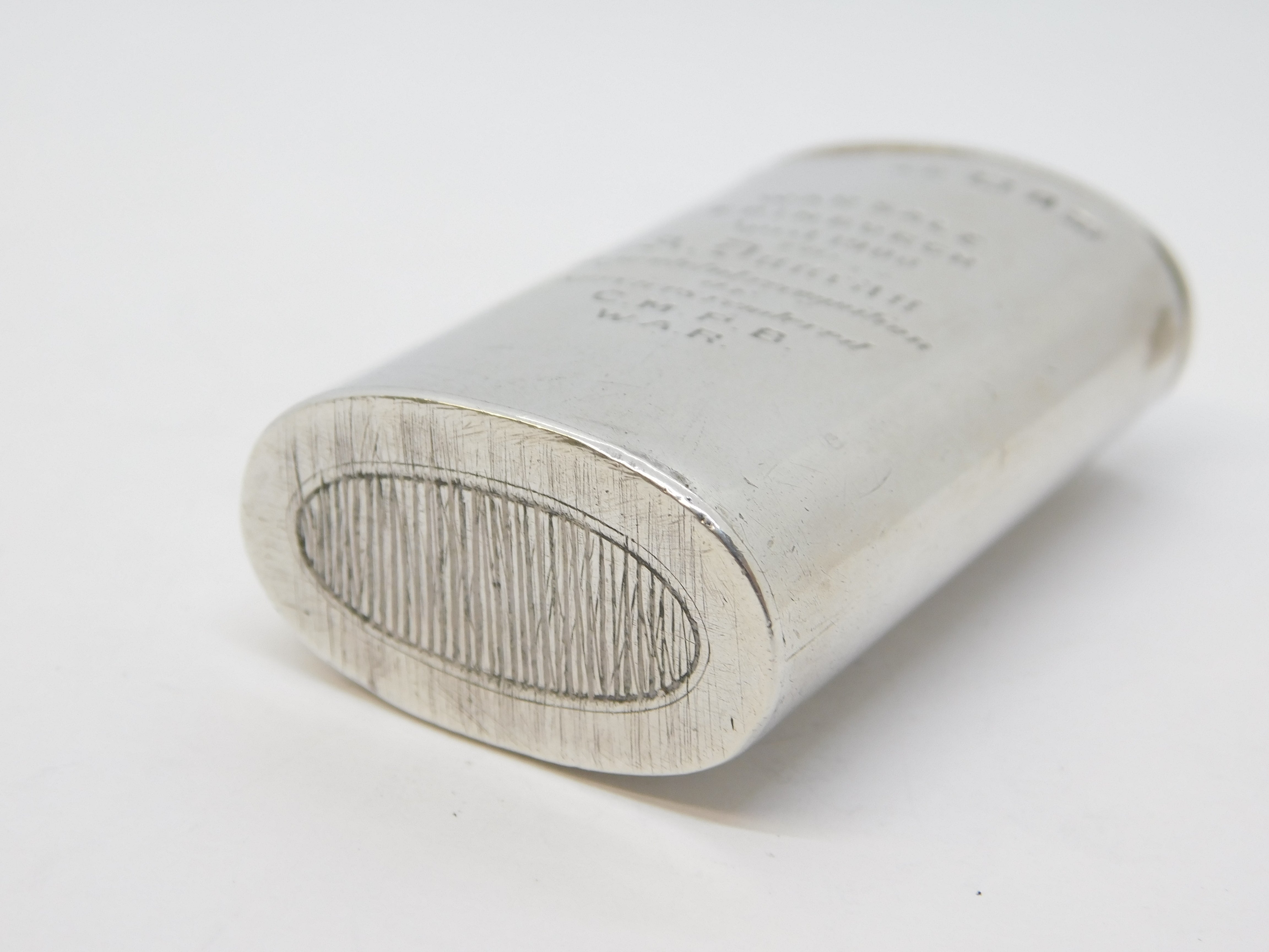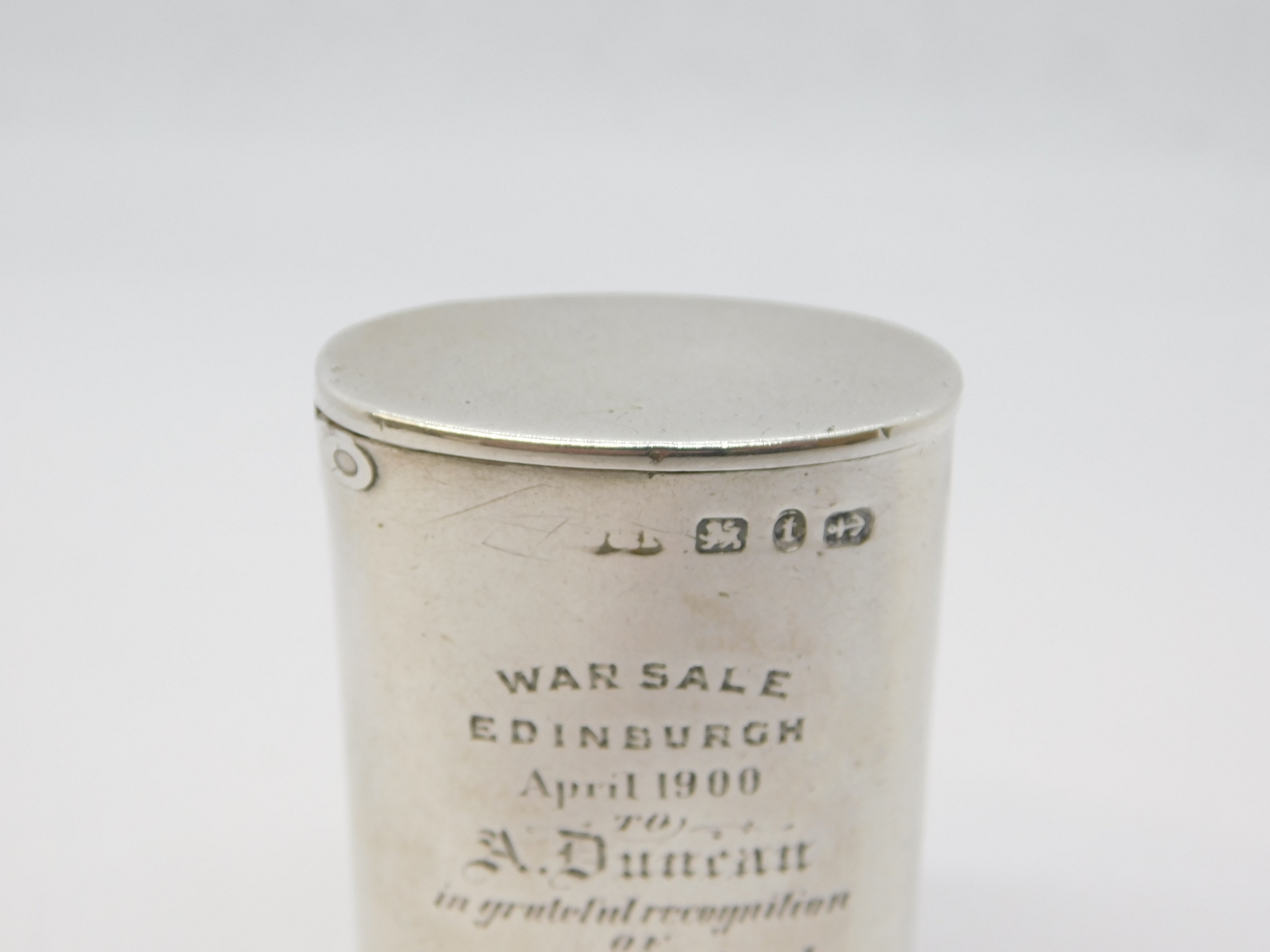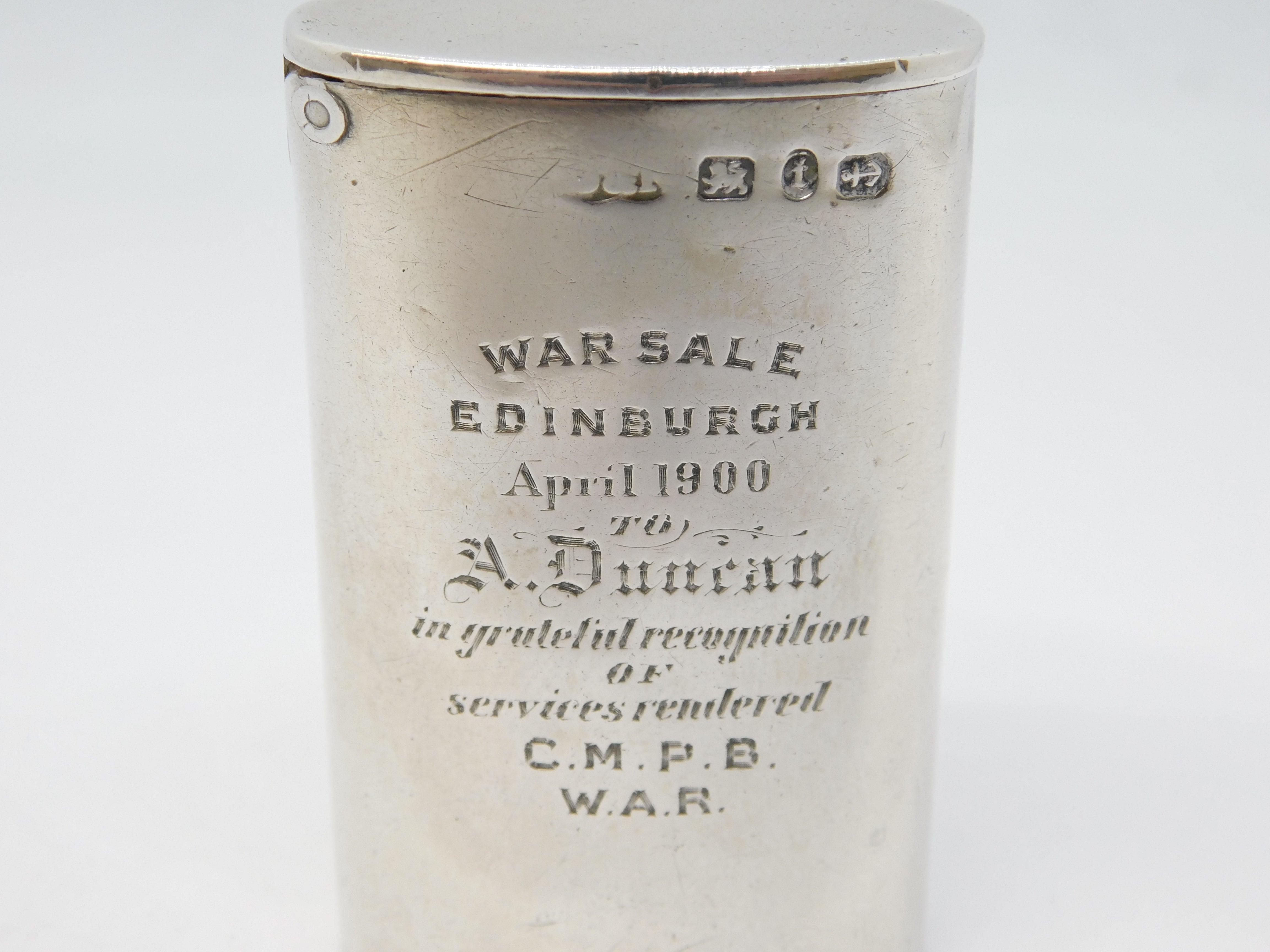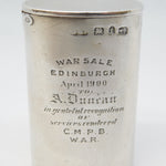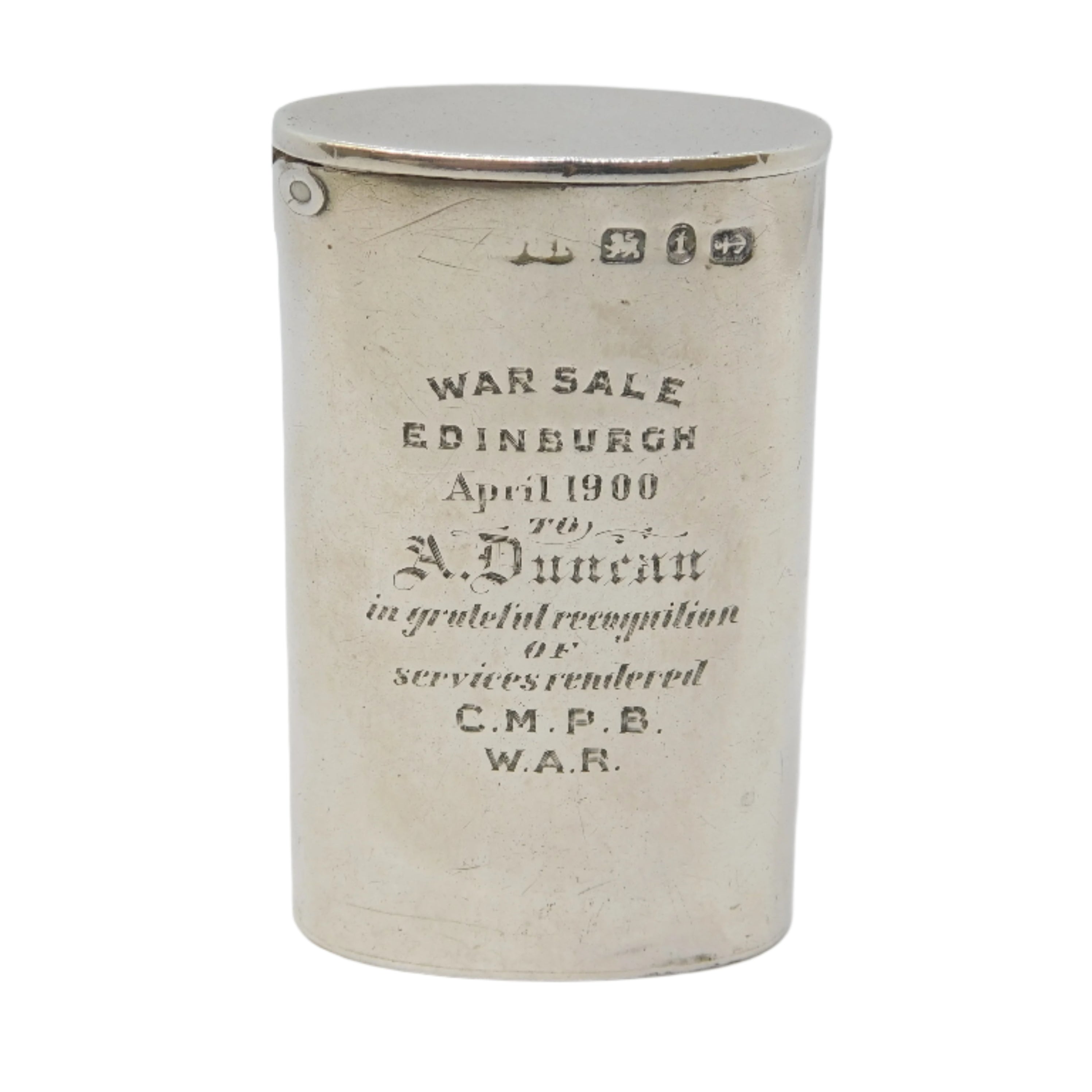Details: A fantastic and wonderfully designed antique Victorian sterling silver oval shaped vesta case with interesting Boer War 'War Sale Edinburgh' inscription to the front hallmarked Birmingham 1893 by Deakin & Francis. This is a wonderful item that would make a perfect gift or addition to any collection.