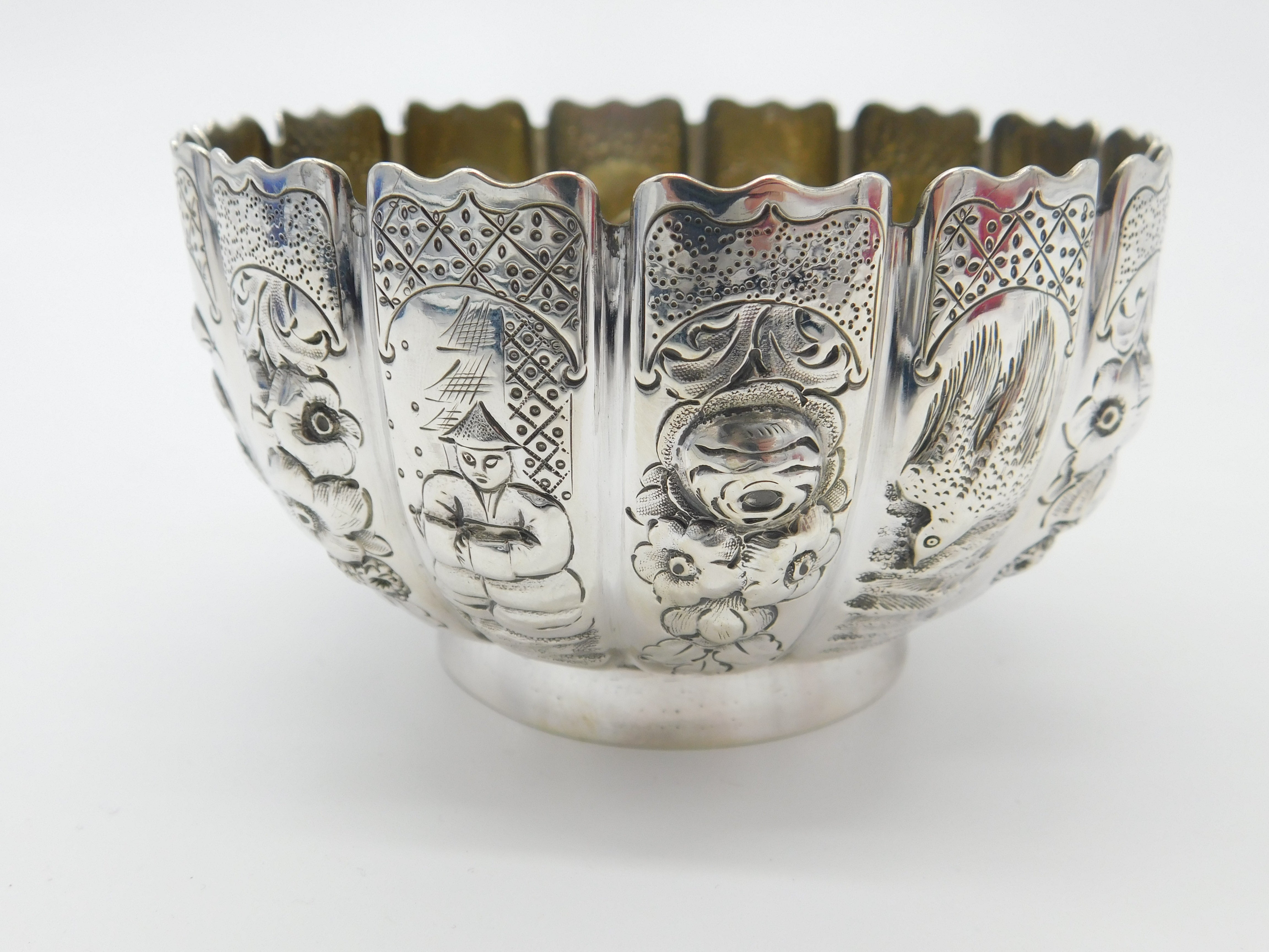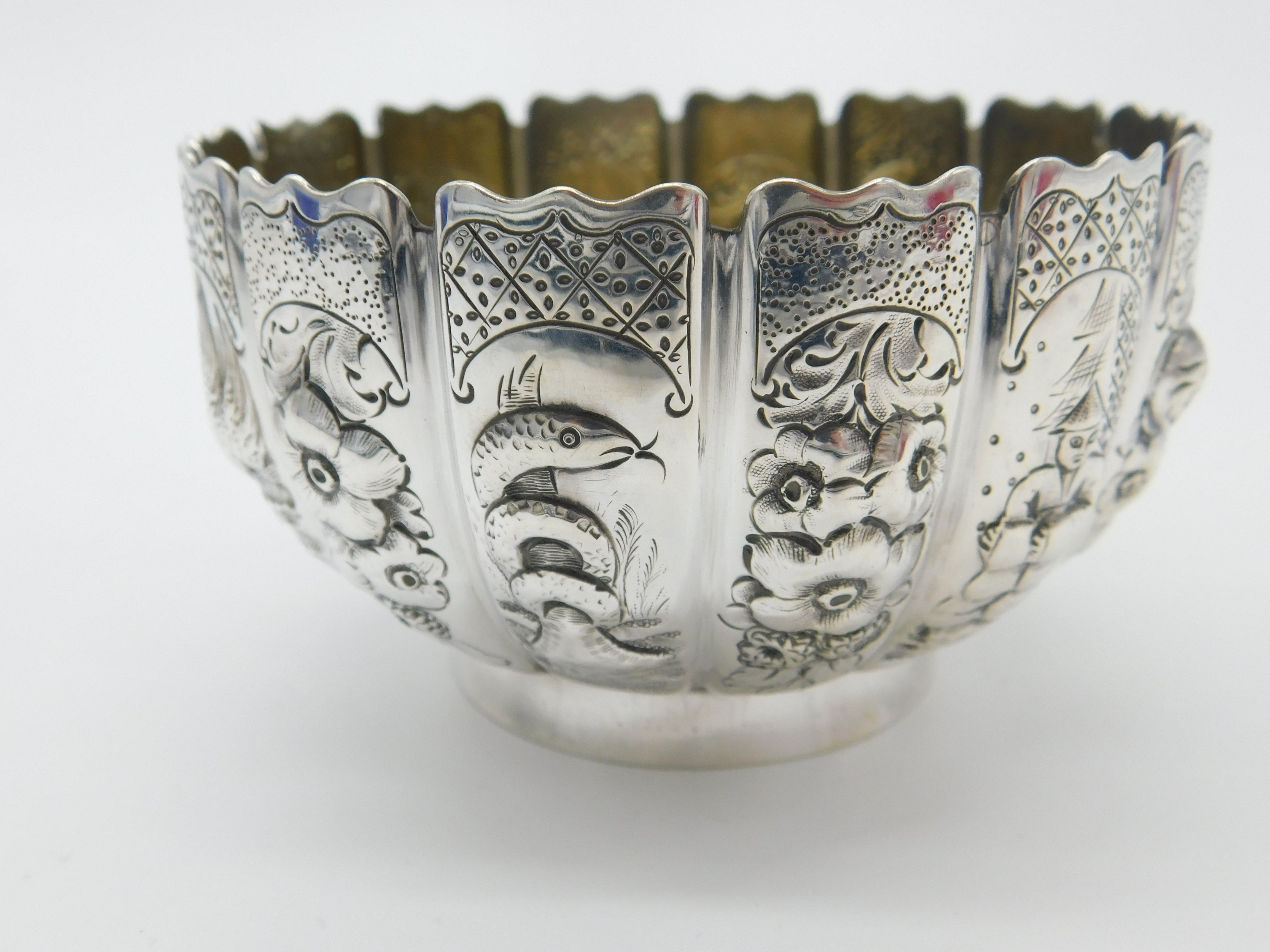 Details: A fantastic and wonderfully designed antique Victorian sterling silver heavily repousse worked bowl in true art nouveau style featuring squirrels, snakes, fish, swallows and a Chinese figure surrounding the cartouche to the centre hallmarked London 1876 by F.B Thomas & Co of New Bond Street. Simply beautiful! This is a wonderful item that would make a perfect gift or addition to any collection. The BOX pictured is for PRESENTATION ONLY and is NOT included in the listings but used to frame the pictures unless specifically stated otherwise.