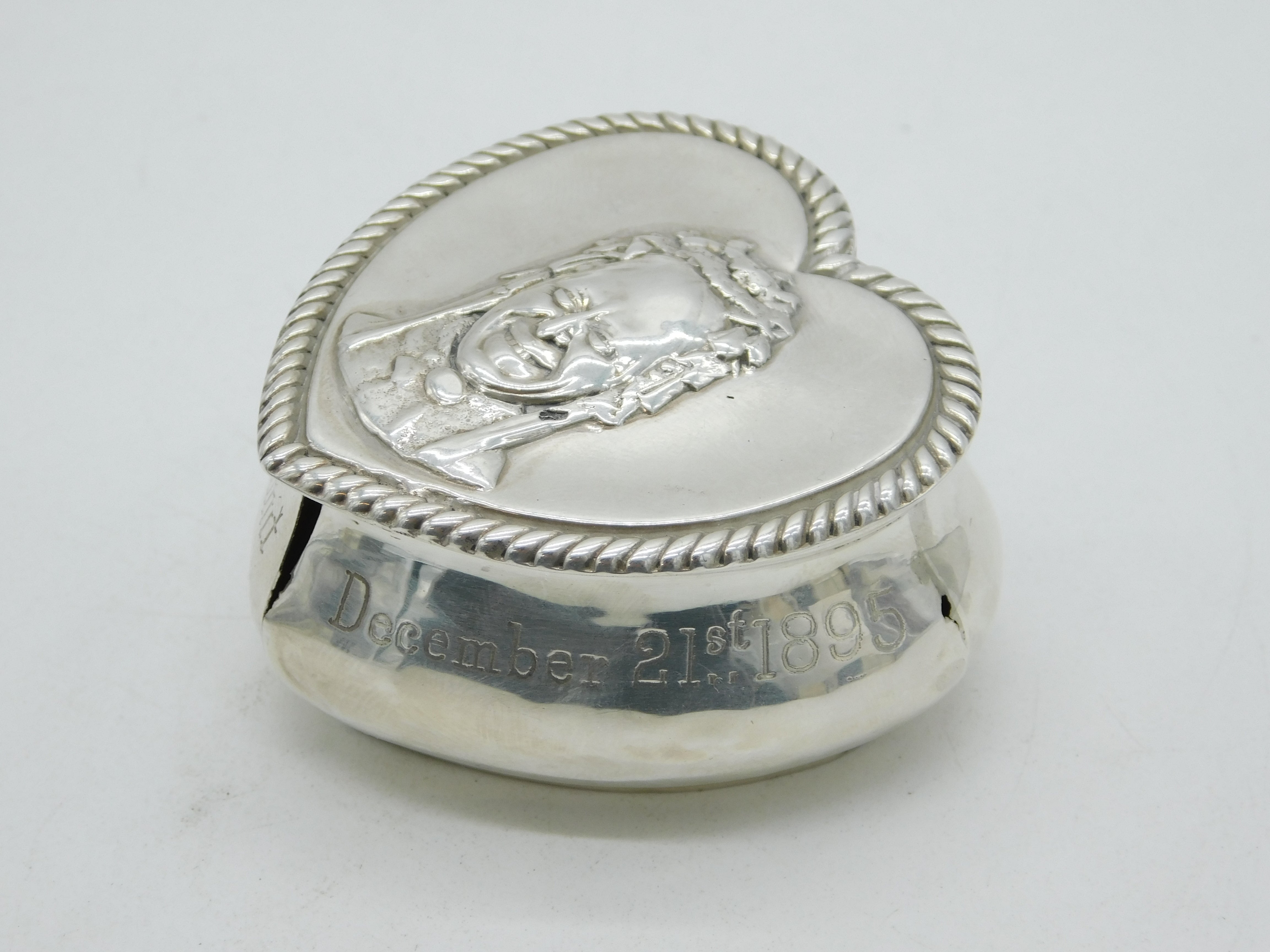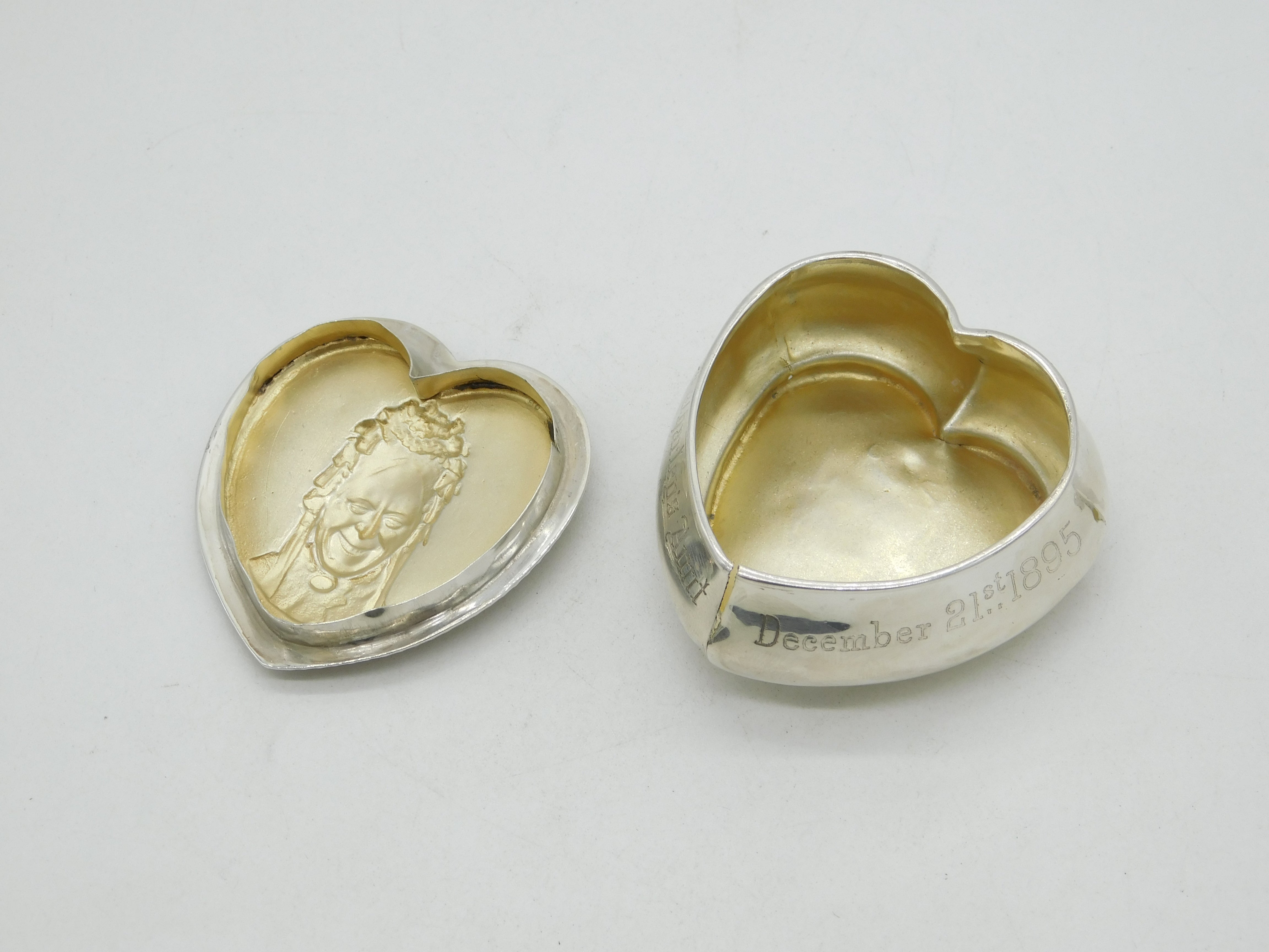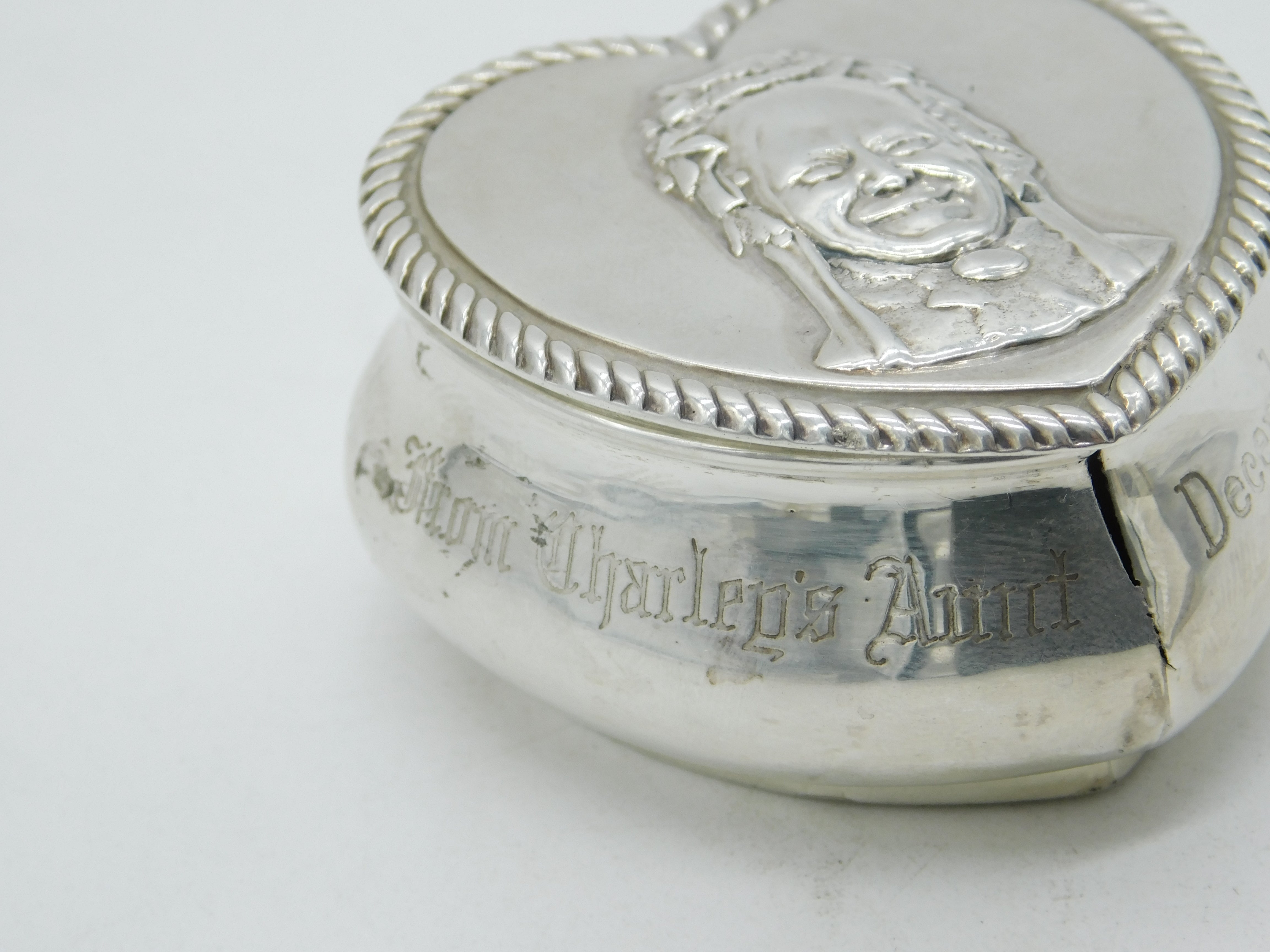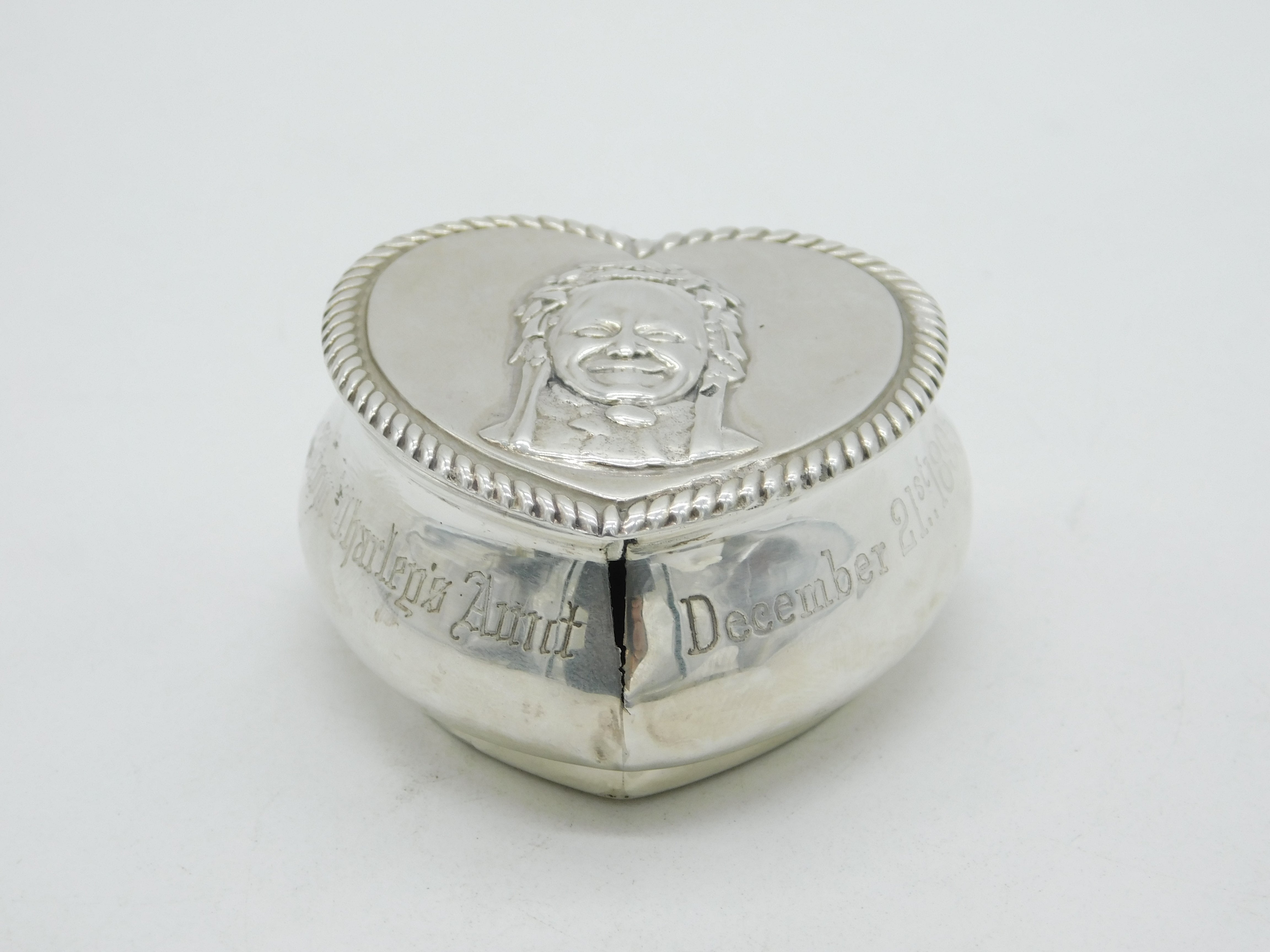 Details: A fantastic and wonderfully designed antique Victorian heart shaped sterling silver trinket box with engraving around the edge given to certain members of the audience of the farcical production 'Charley's Aunt' at the Globe Theatre on December 21st 1895, hallmarked Sheffield 1895 to the base. This is a wonderful item that would make a perfect gift or addition to any collection. The BOX pictured is for PRESENTATION ONLY and is NOT included in the listings but used to frame the pictures unless specifically stated otherwise.