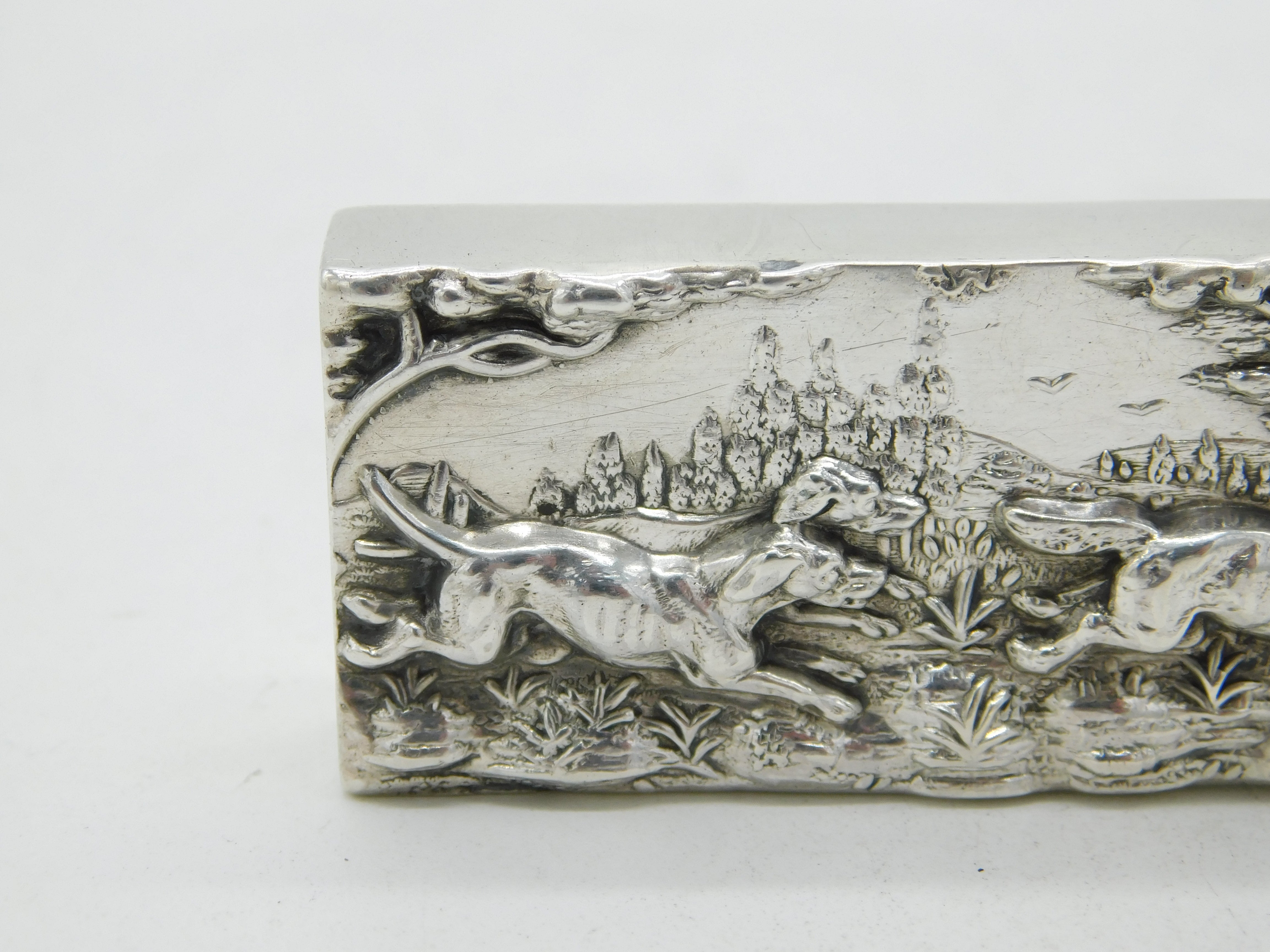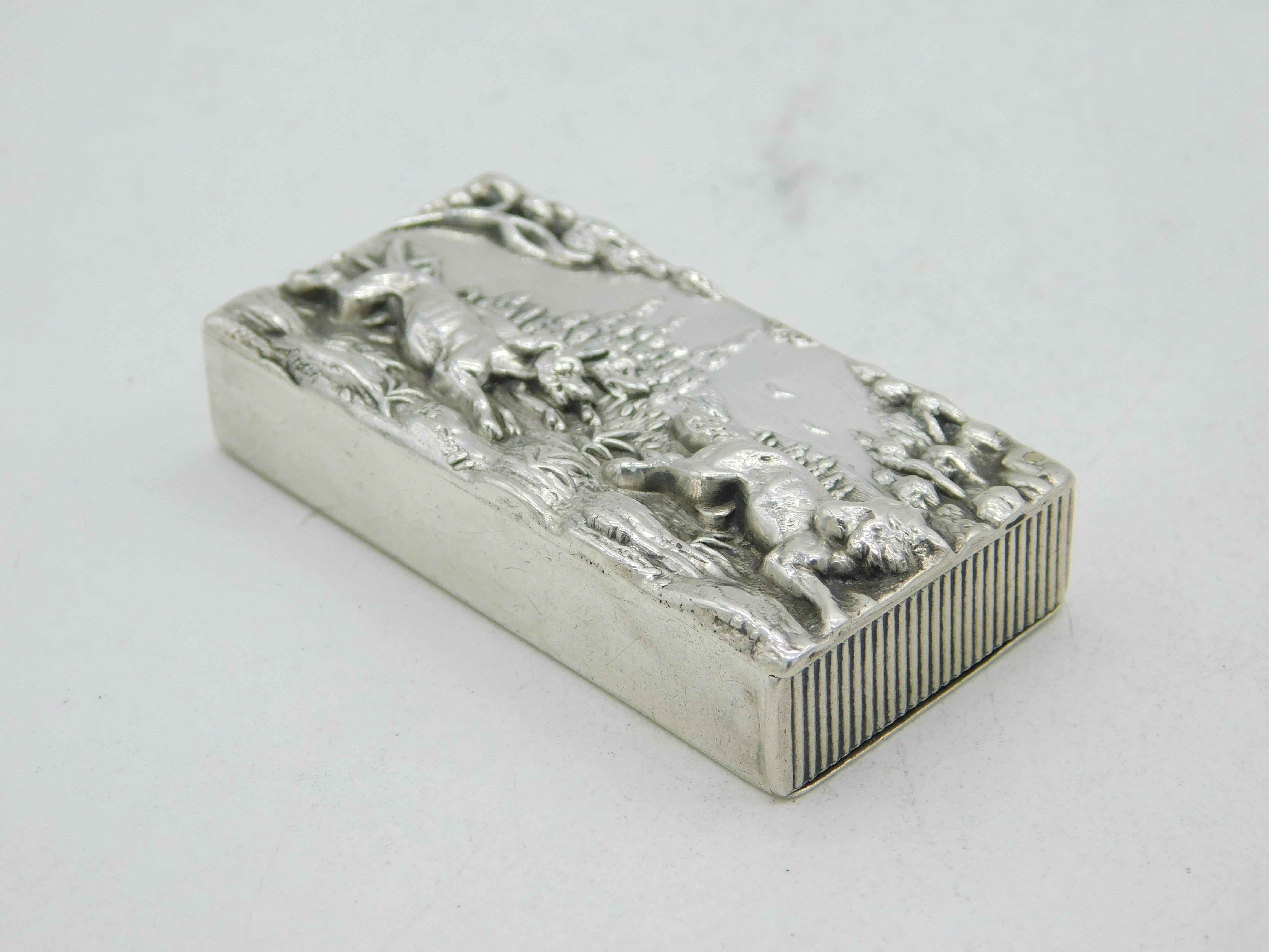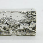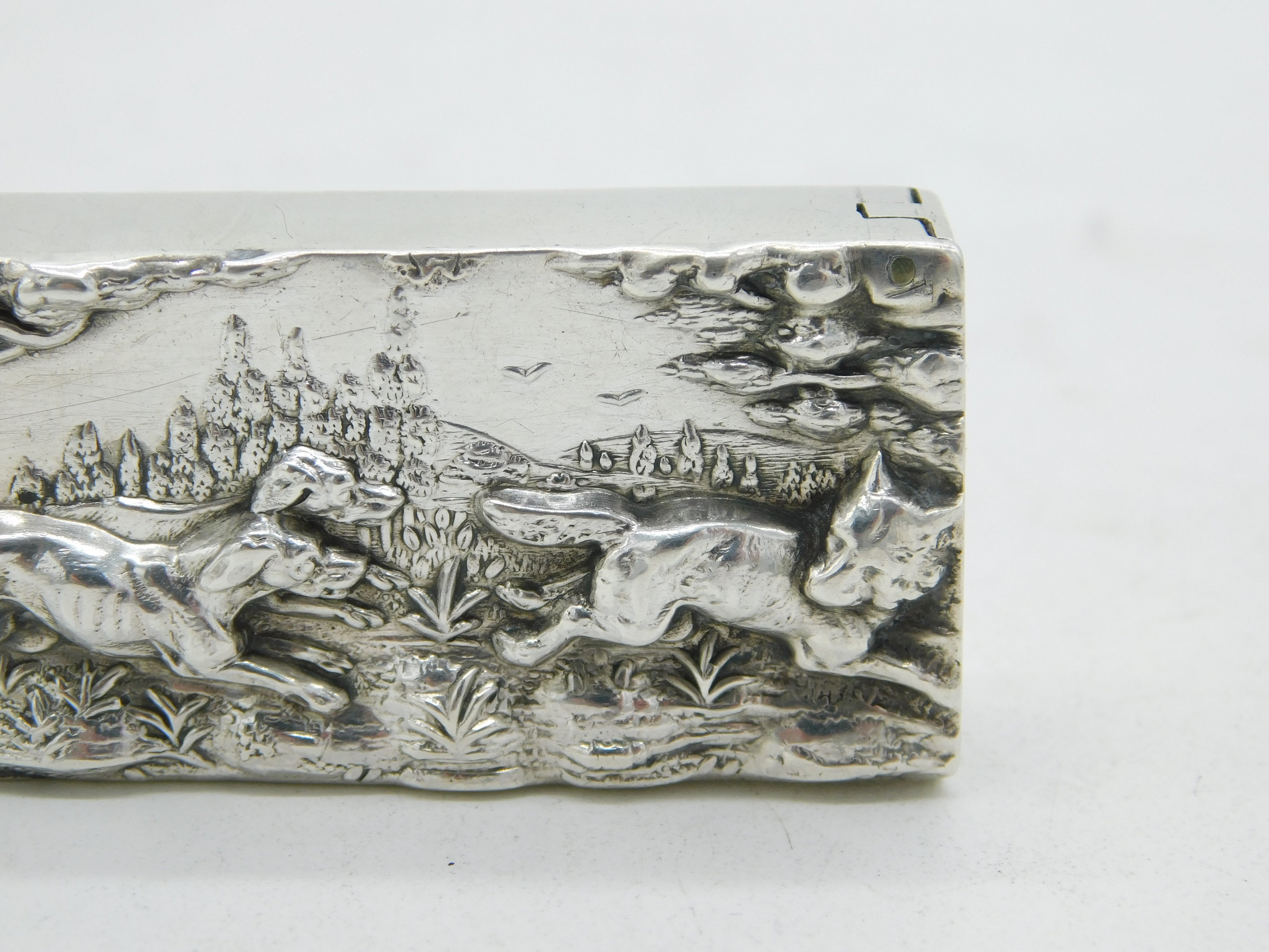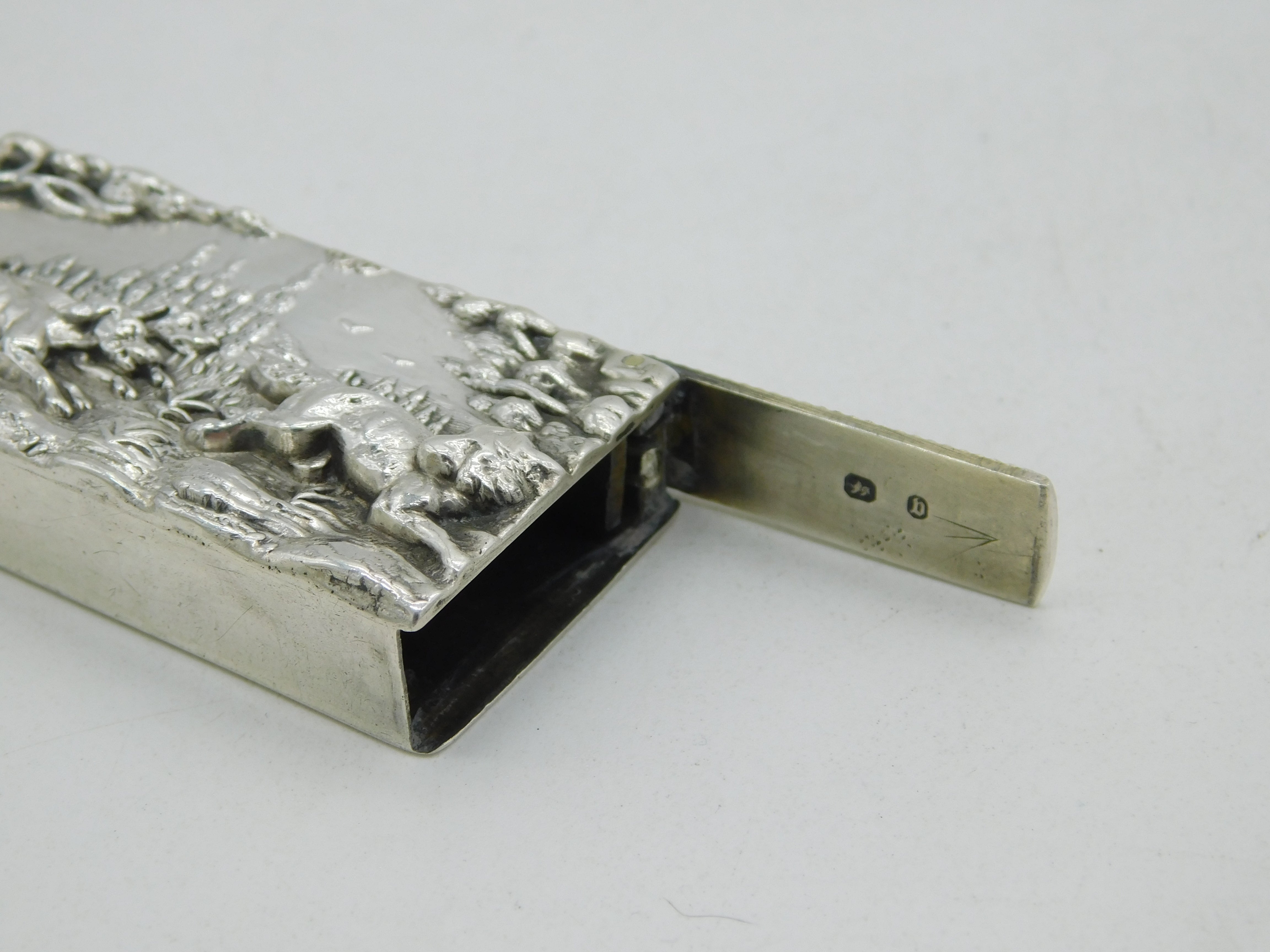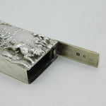 Details: A fantastic and wonderfully designed antique Victorian sterling silver heavily embossed vesta case with an ornate vignette depicting a fox hunting chase scene witeh excellent figural detailing hallmarked Birmingham 1876 to the interior. The vesta is in excellent condition with good striker and mechanism. This is a wonderful item that would make a perfect gift or addition to any collection. We are more than happy to provide XRF reports for items upon request.