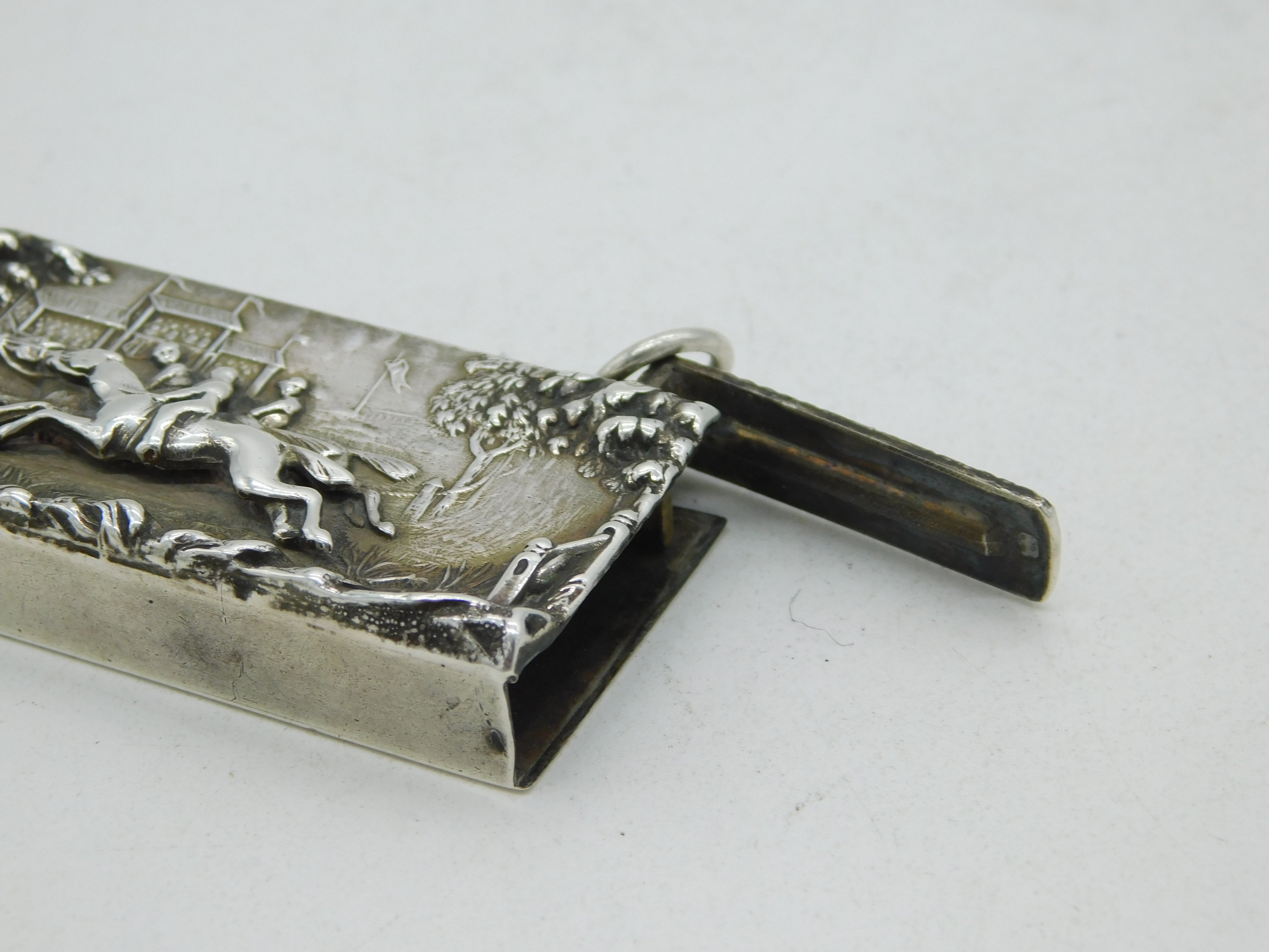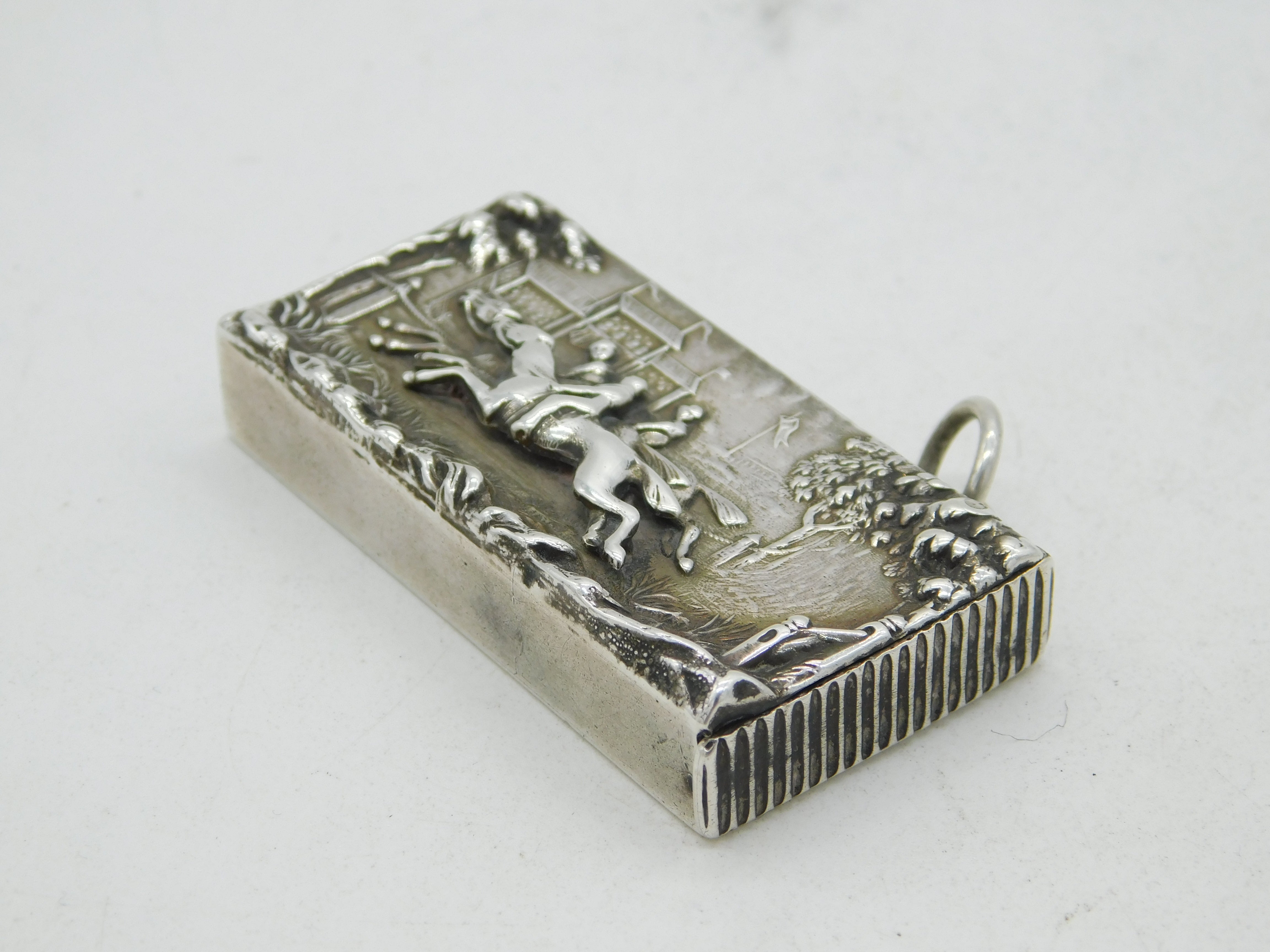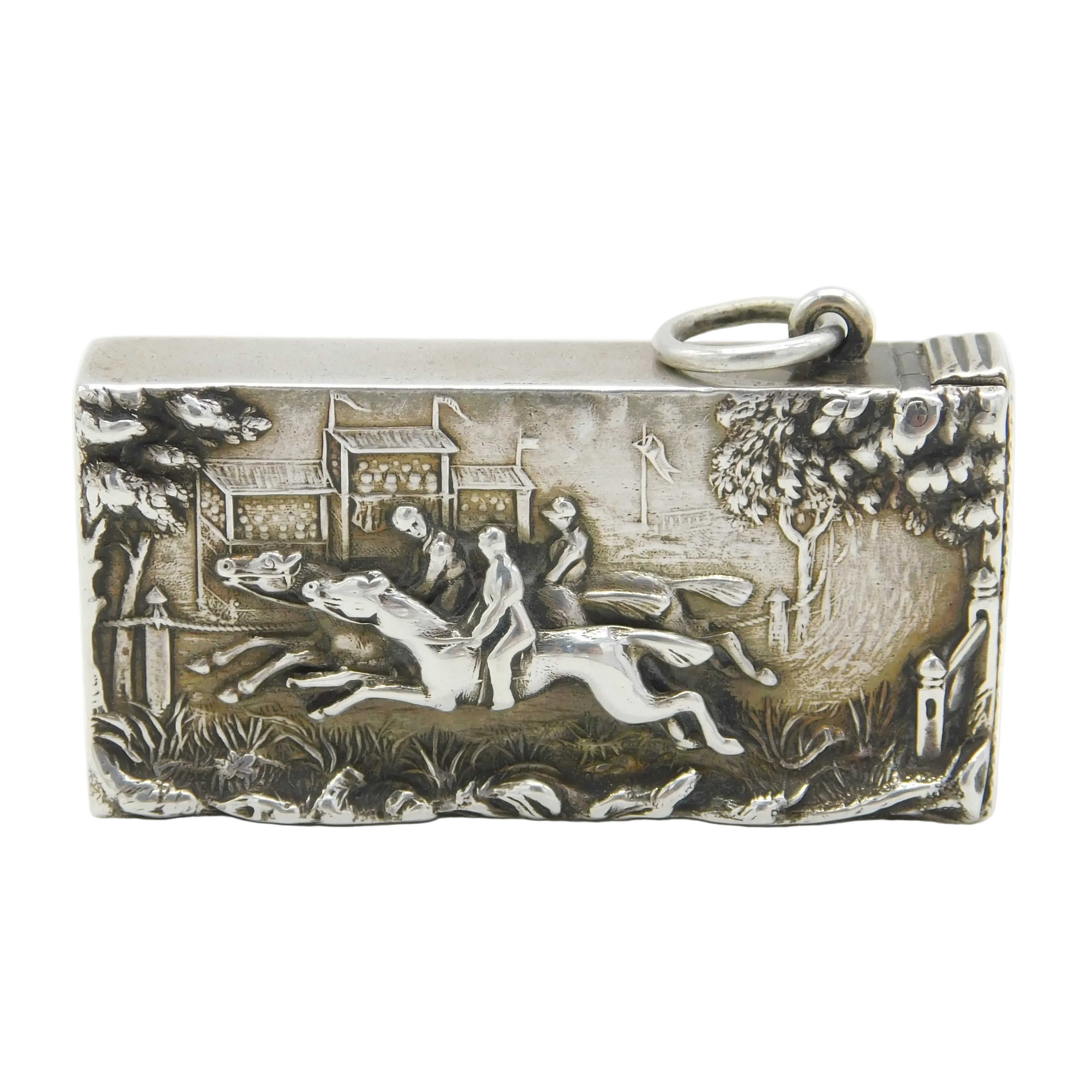 Details: A fantastic and wonderfully designed antique late-Victorian sterling silver vesta cased with embossed vignette depicting the finishing post of a horse race, possibly the Grand National, hallmarked Birmingham 1892 to the reverse with rubbed makers marks. The vesta is in lovely condition with good striker and spring. This is a wonderful item that would make a perfect gift or addition to any collection. We are more than happy to provide XRF reports for items upon request.