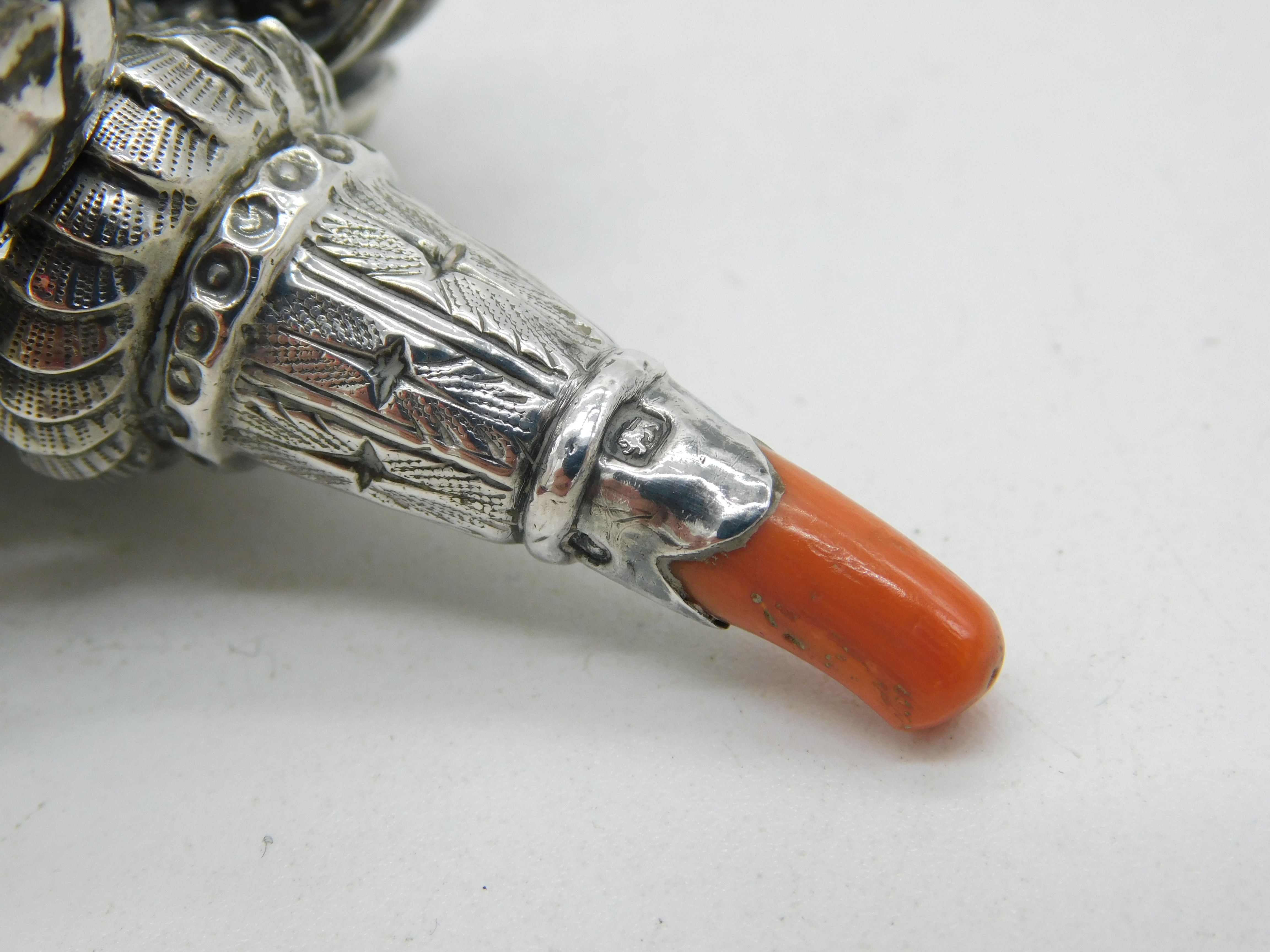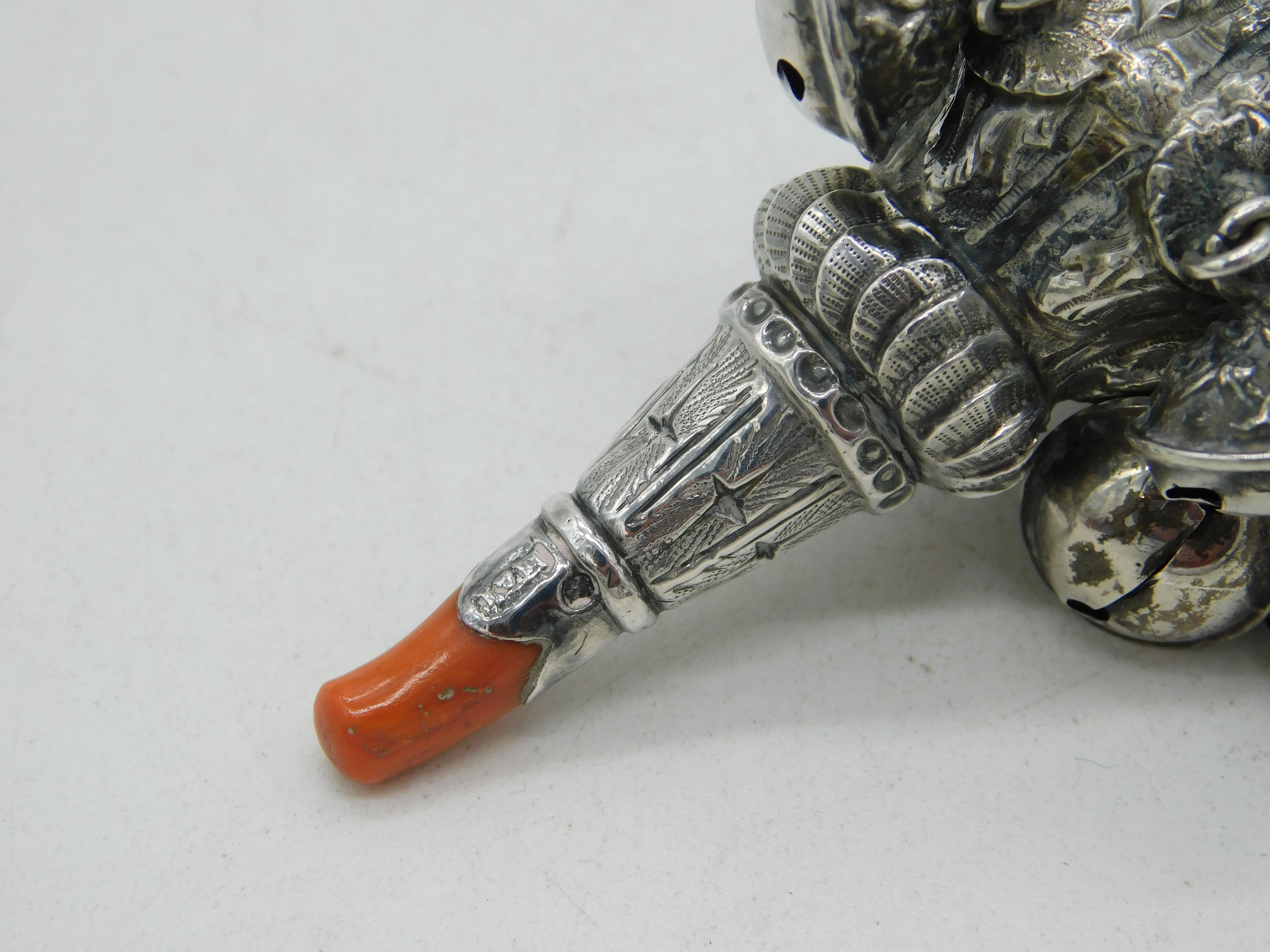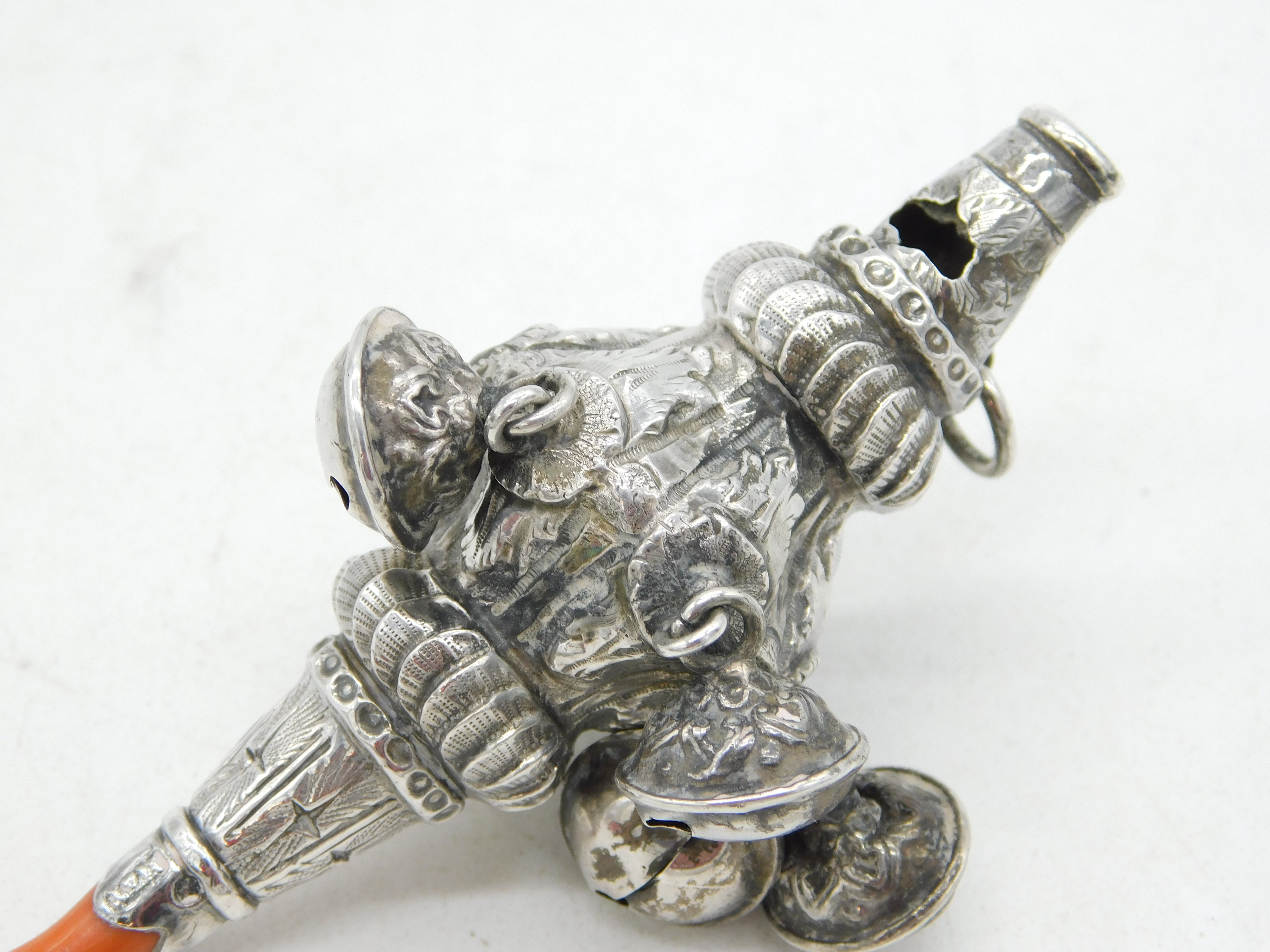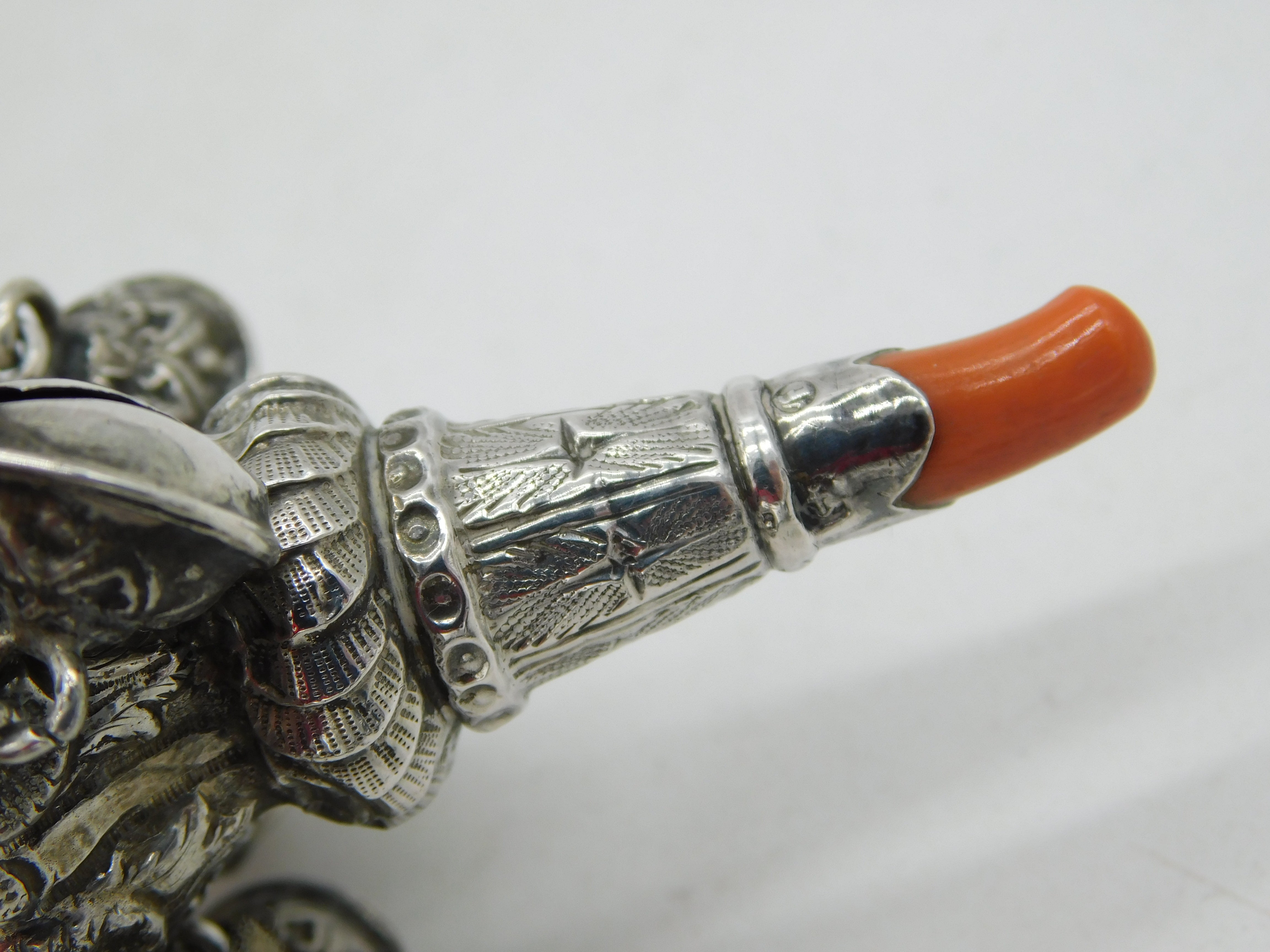 Details: A fantastic and wonderfully designed antique Victorian sterling silver baby rattle, whistle & red coral teether with super detailing to include bells to the central body hallmarked Birmingham 1880 by Hilliard & Thomason, missing one bell please note. This is a wonderful item that would make a perfect gift or addition to any collection.