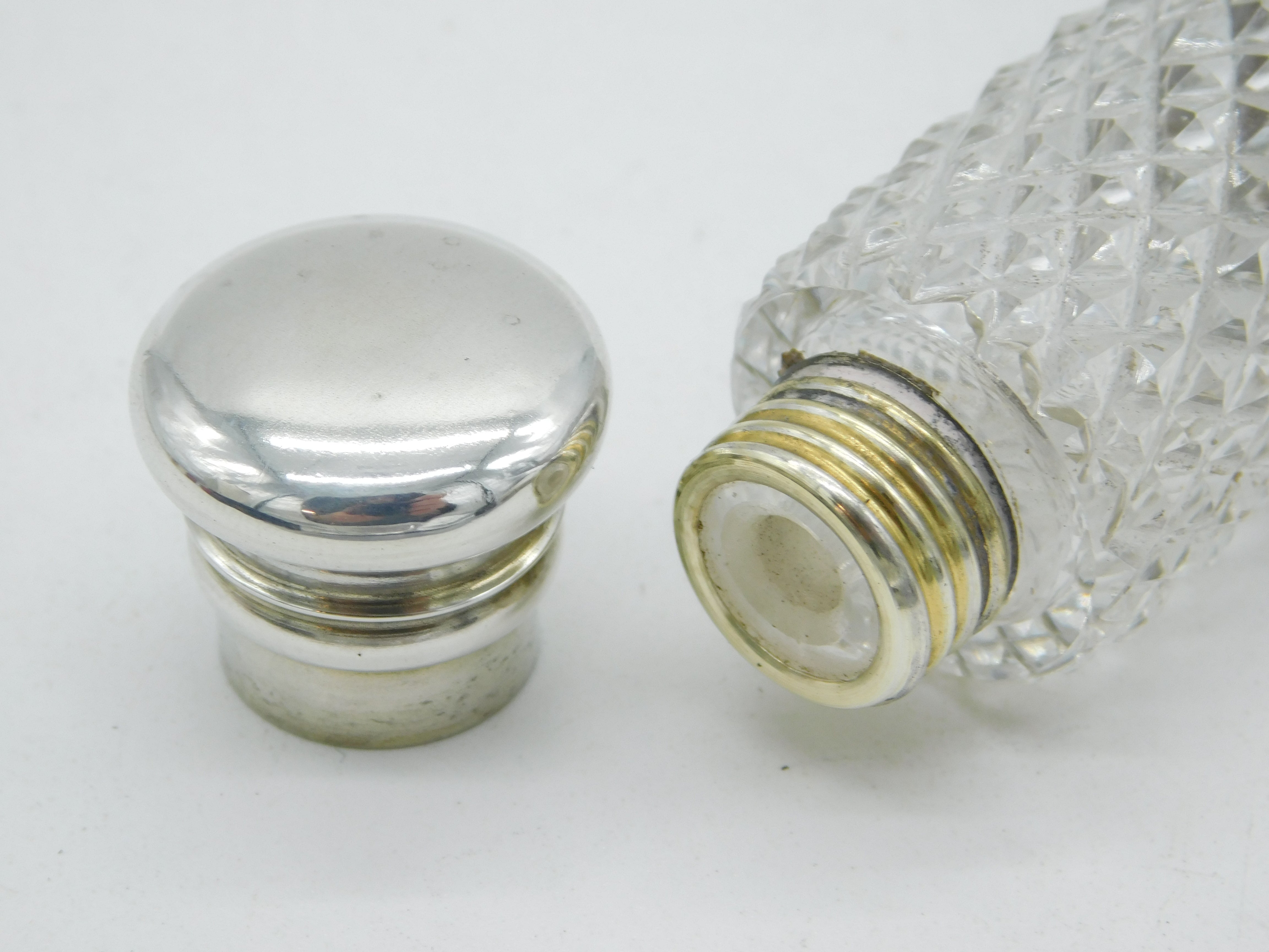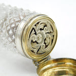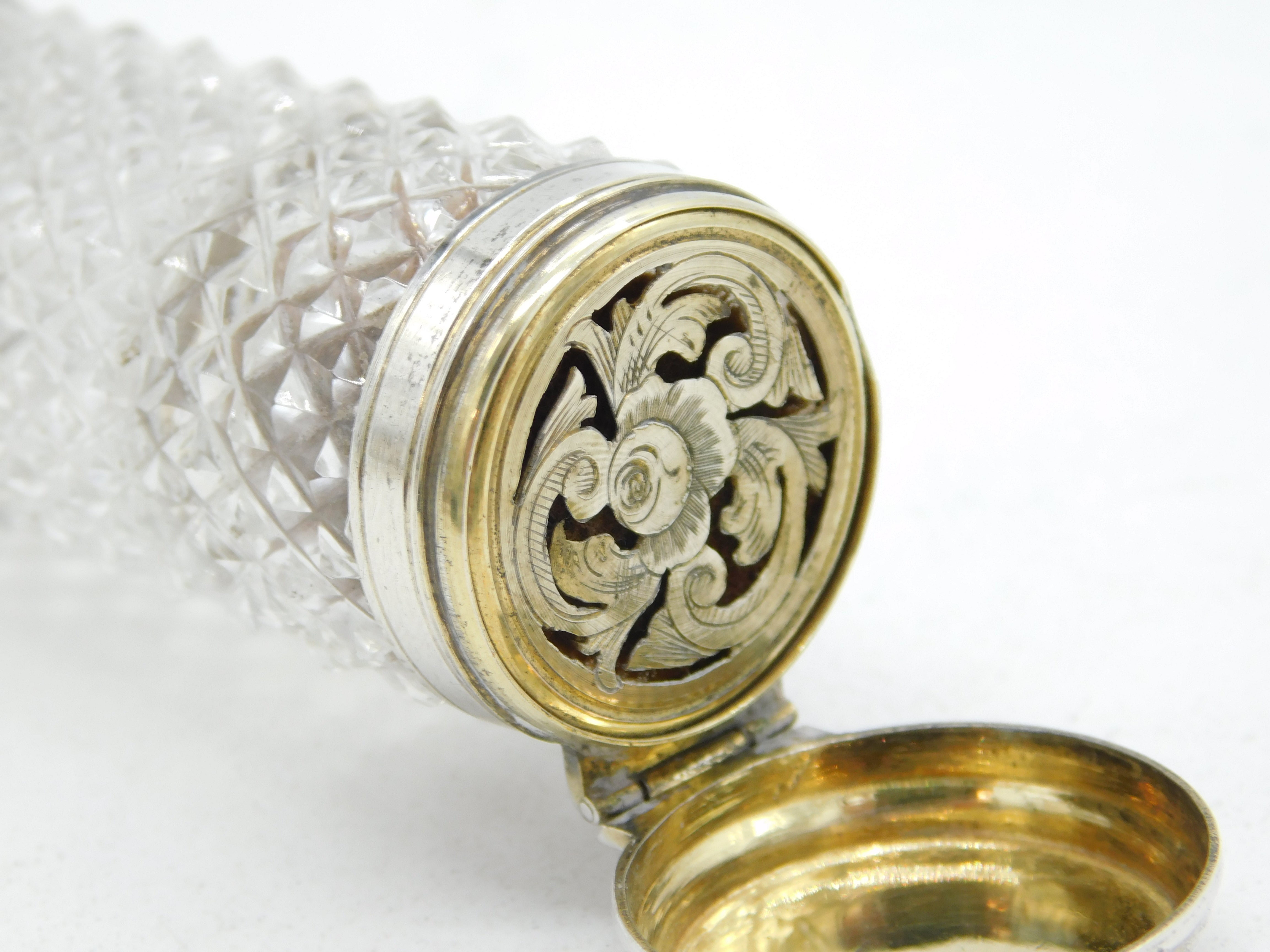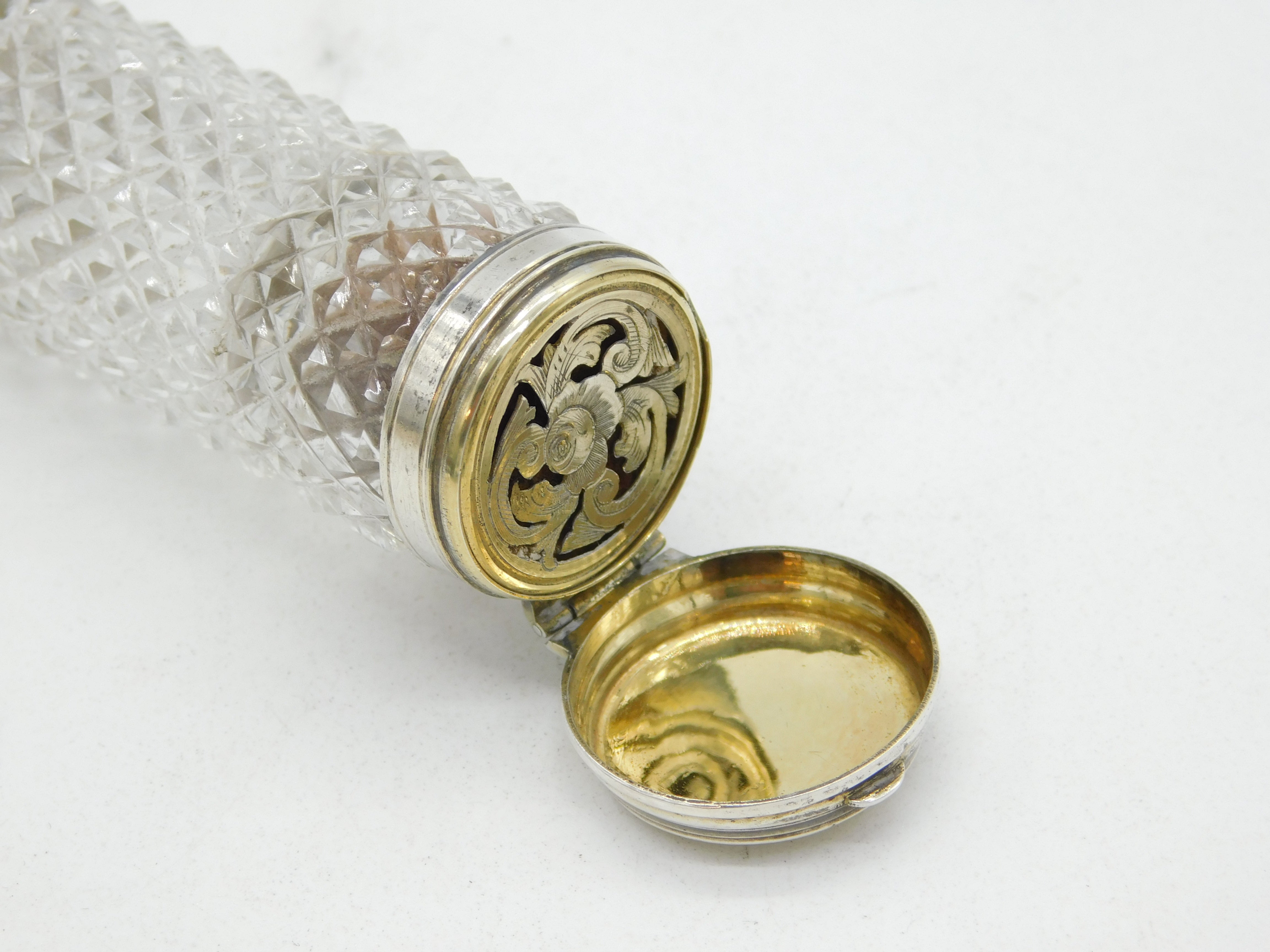 Details: A fantastic and wonderfully designed antique mid-Victorian sterling silver mounted double ended cut glass scent bottle with screw-top end and integrated vinaigrette to the bottom edge, beautifully gilded, the silver has been XRF tested as it is unmarked c1860. This is a wonderful item that would make a perfect gift or addition to any collection.