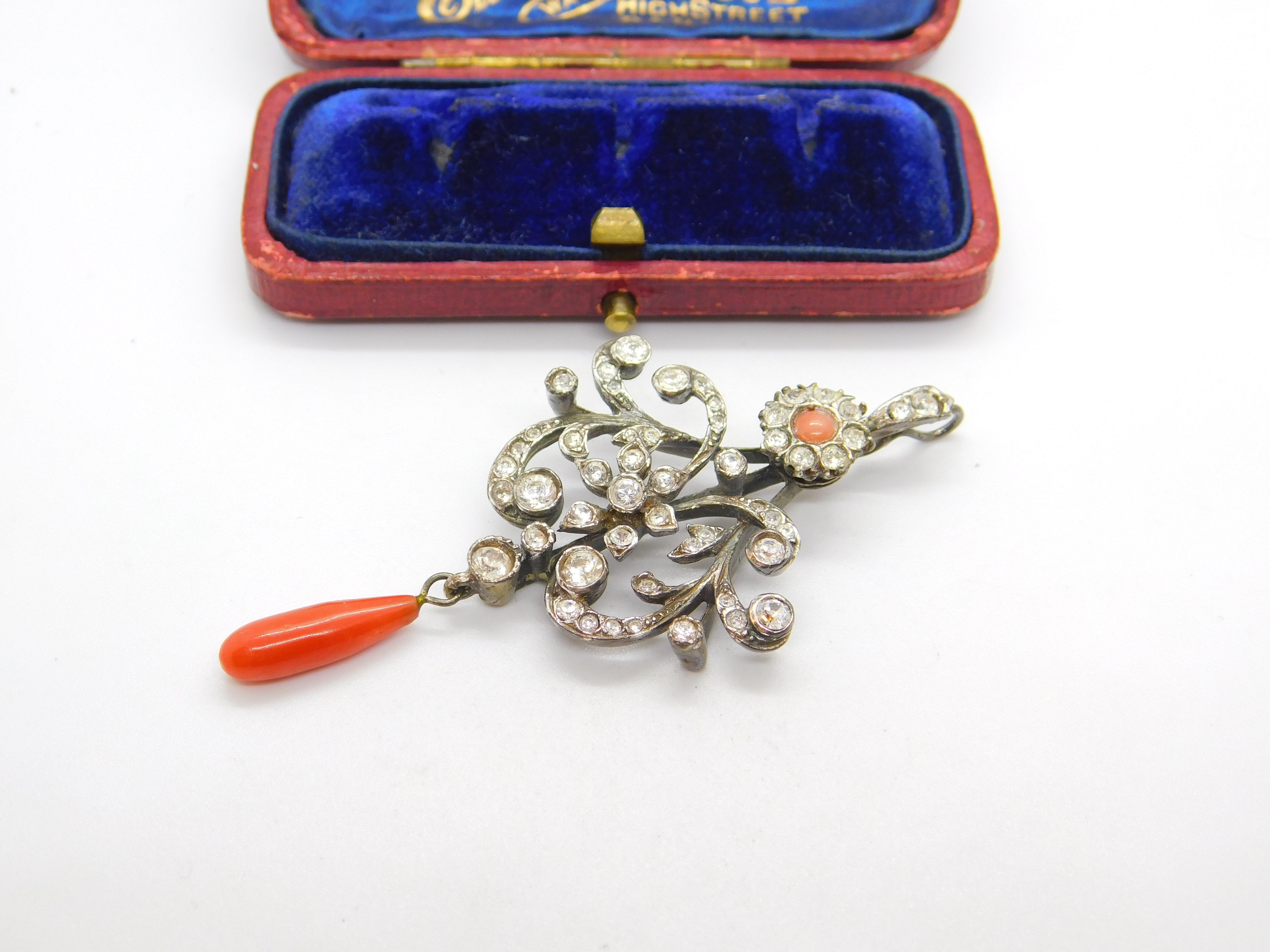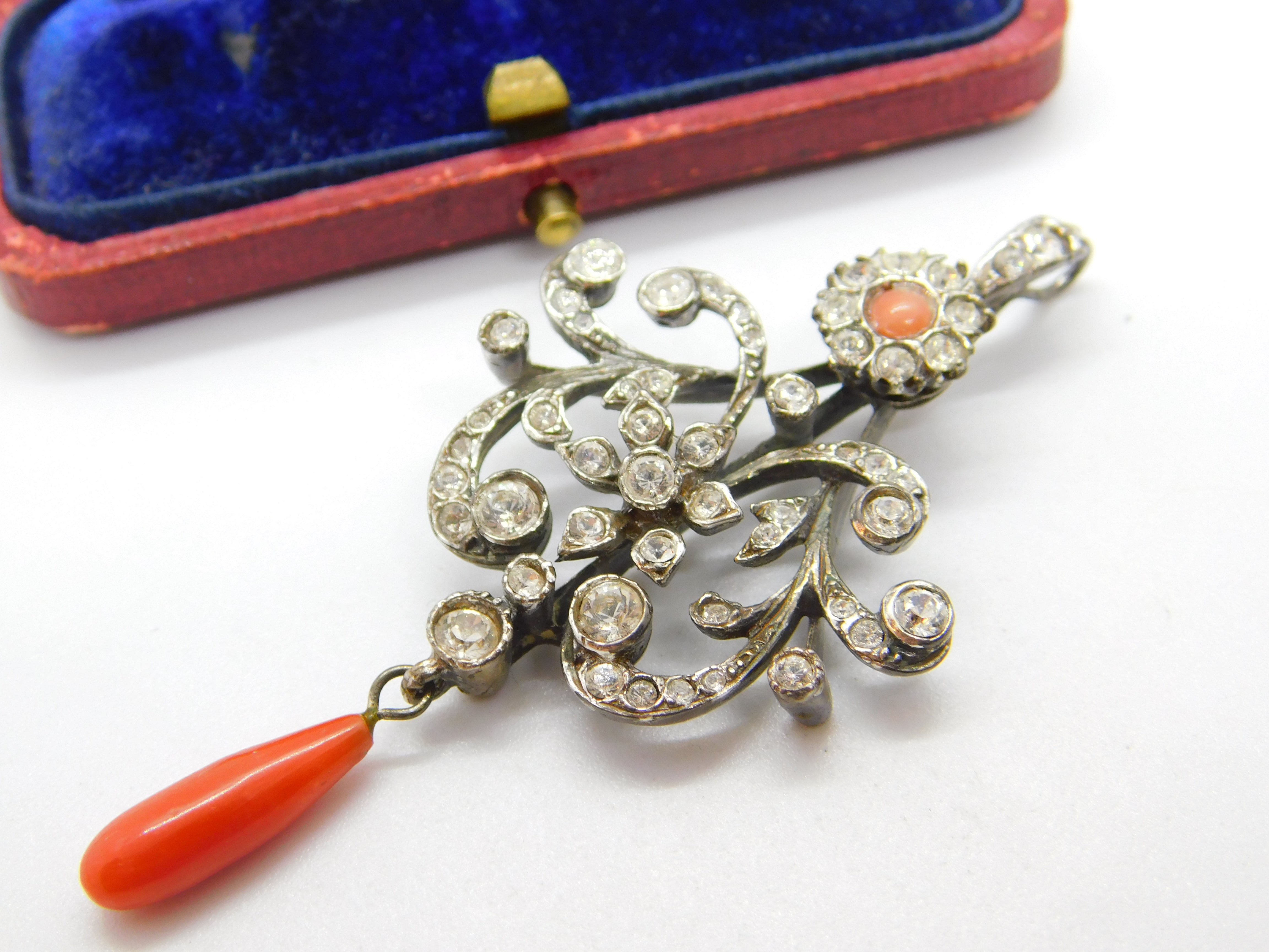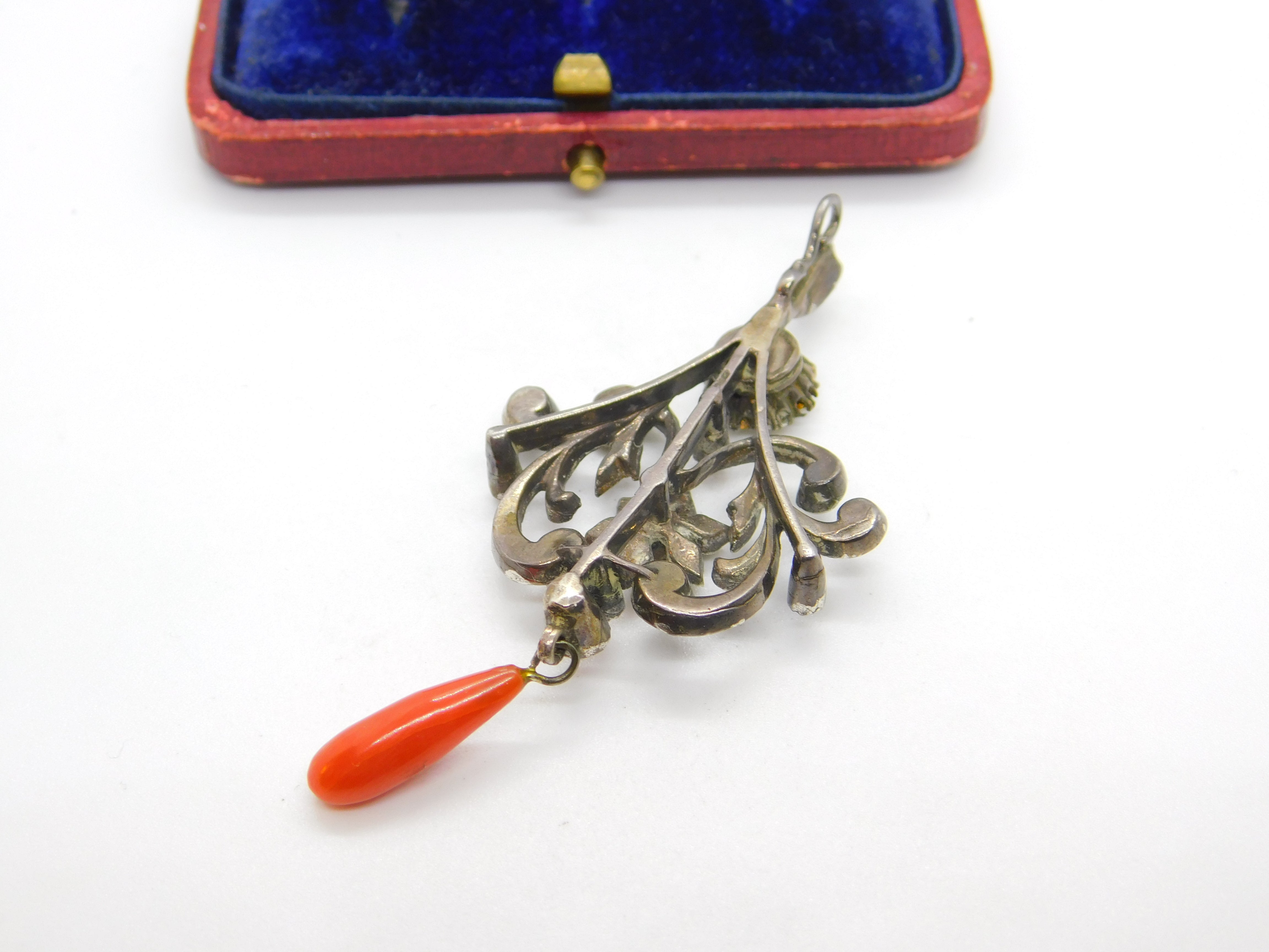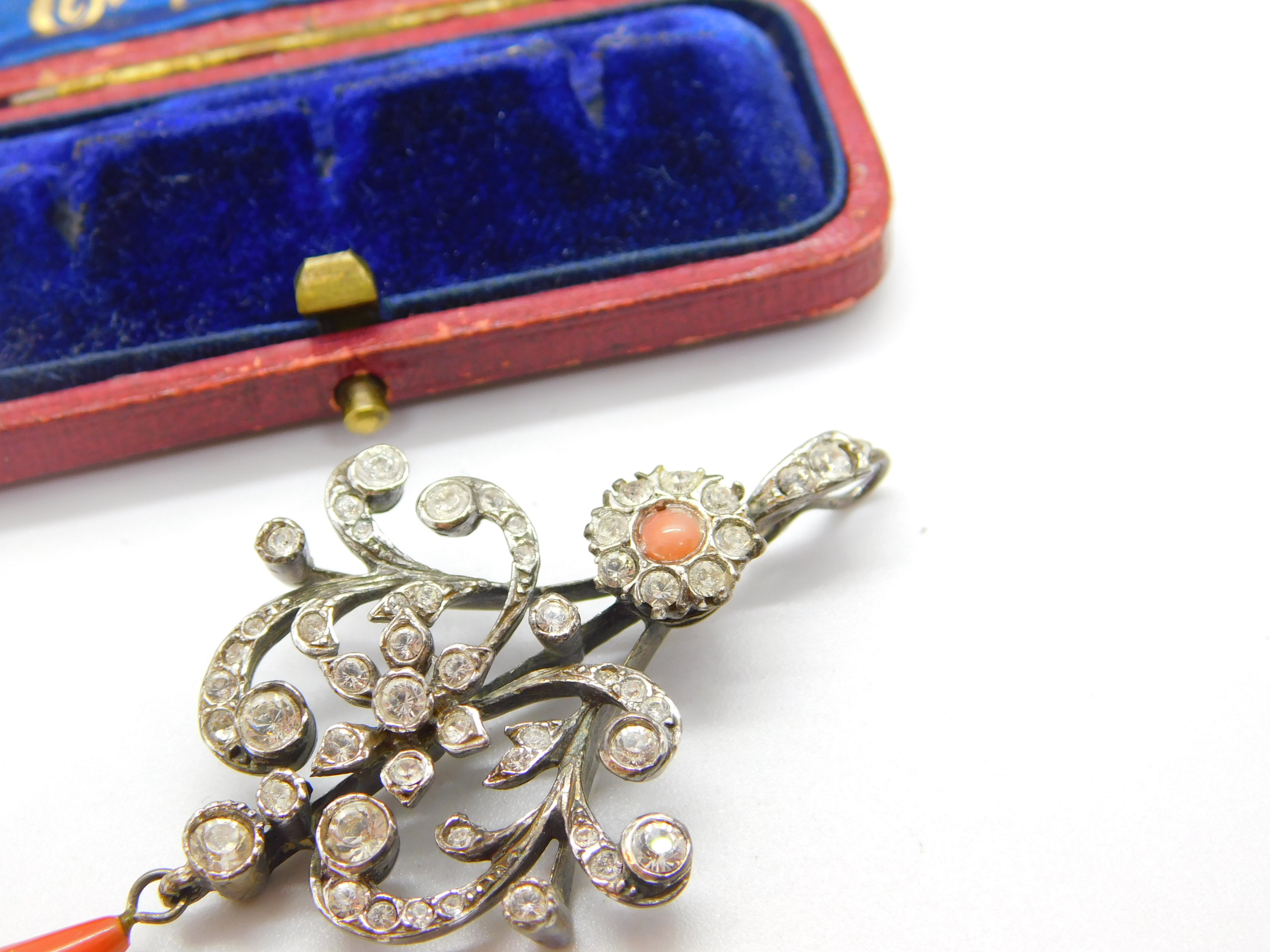 Victorian Sterling Silver, Diamond Paste & Coral Floral Drop Pendant Antique c1900