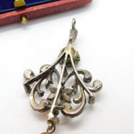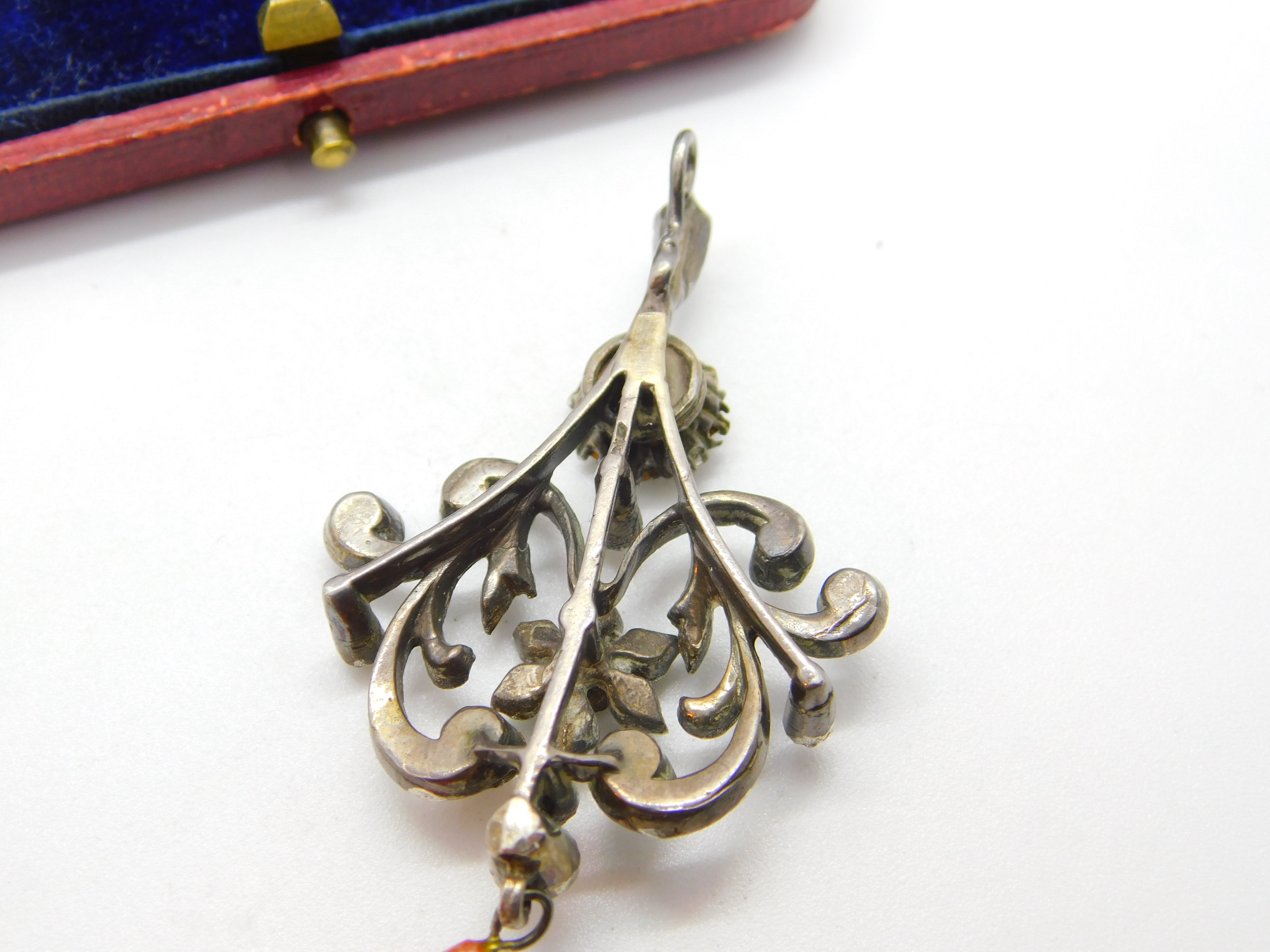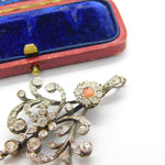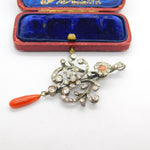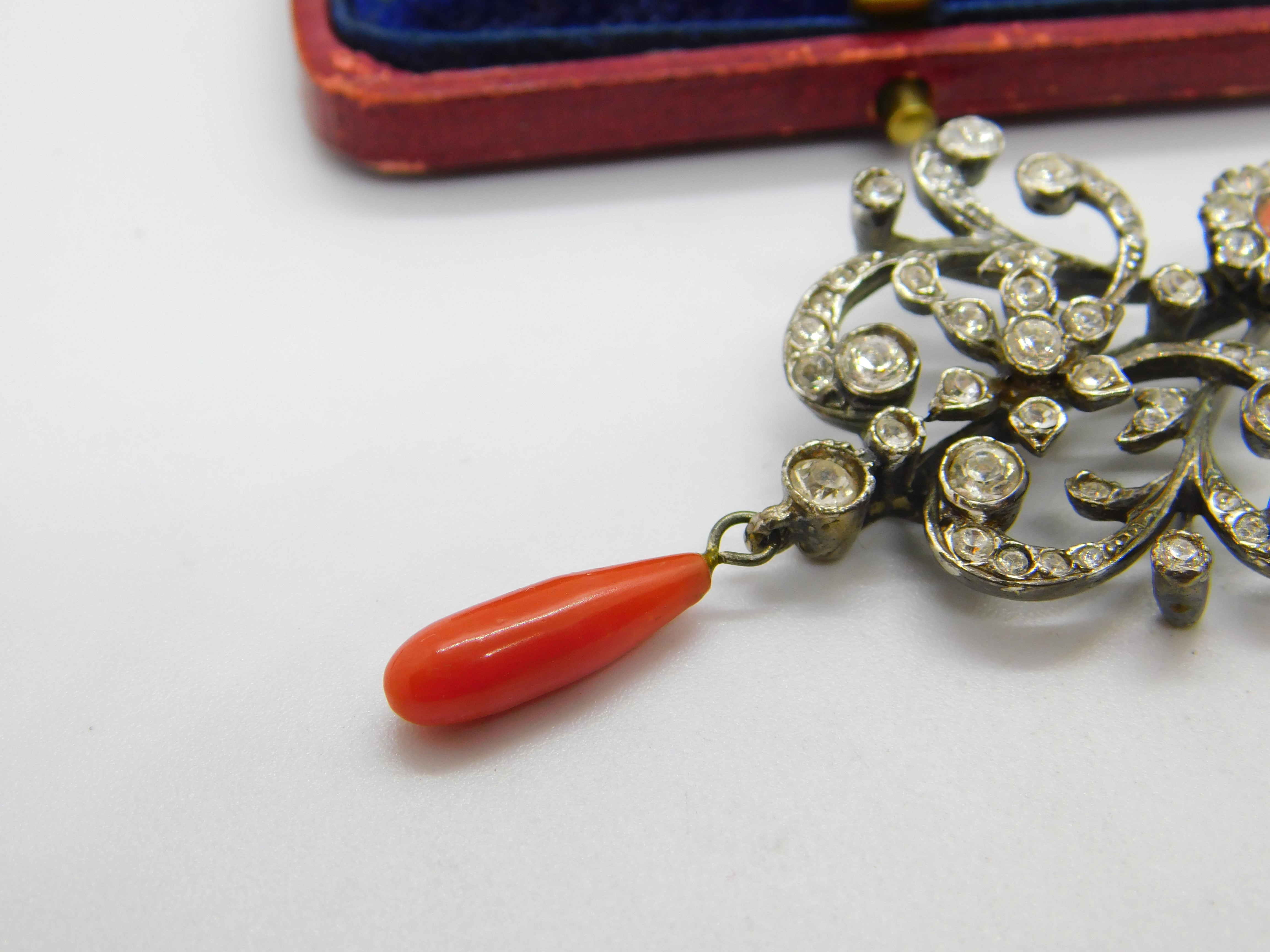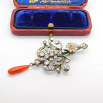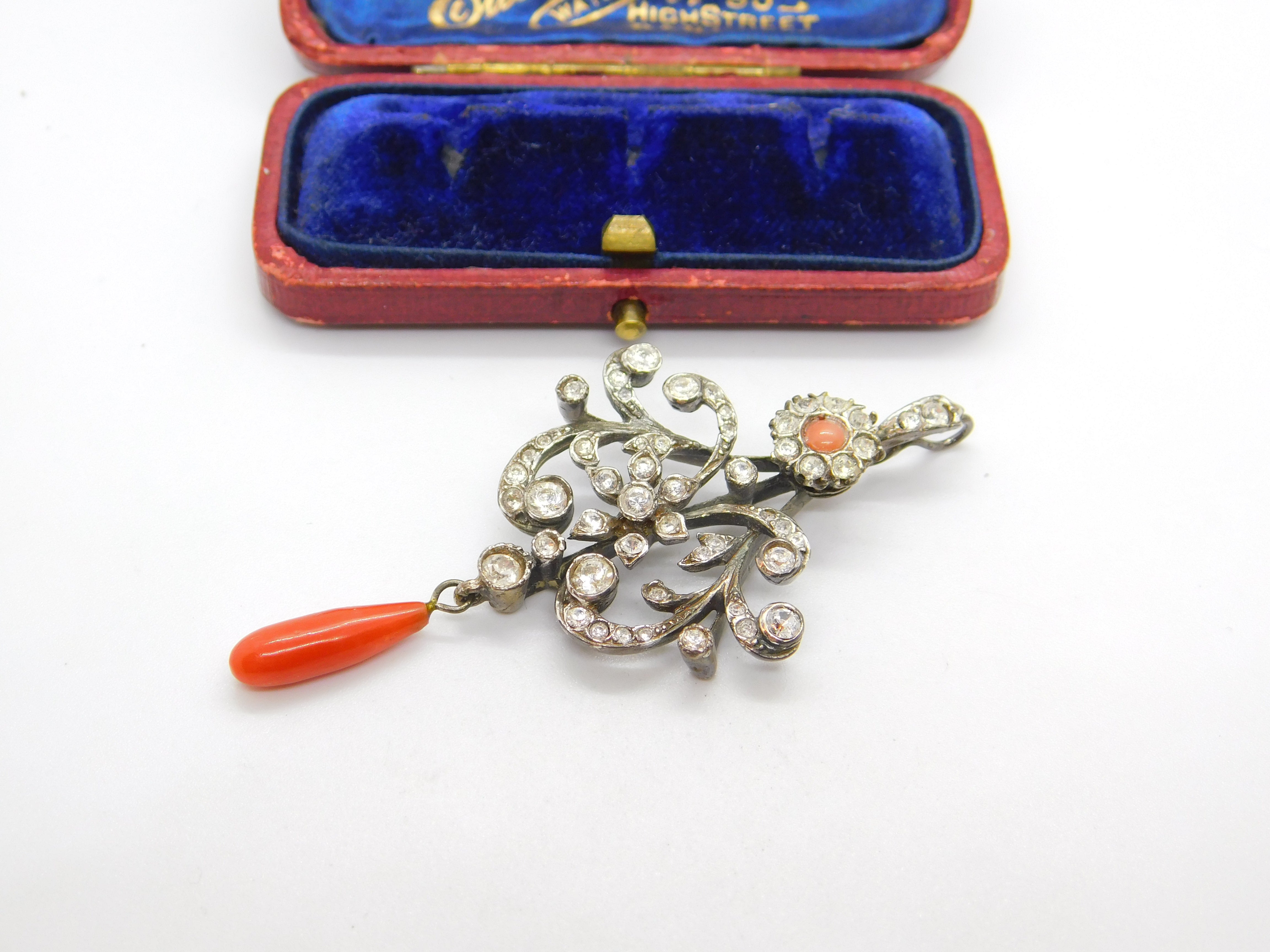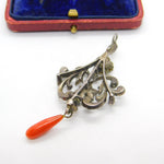Victorian Sterling Silver, Diamond Paste & Coral Floral Drop Pendant Antique c1900