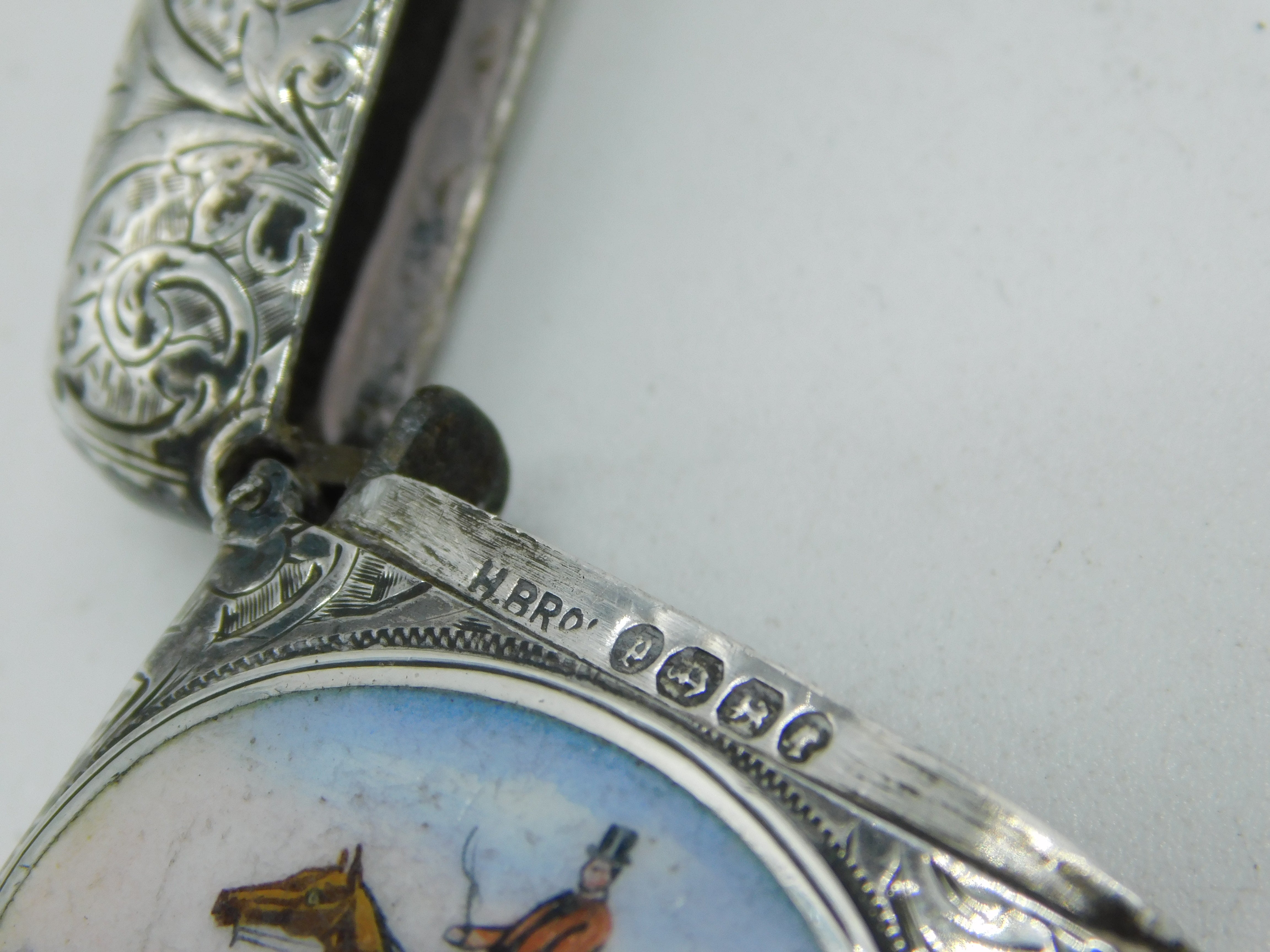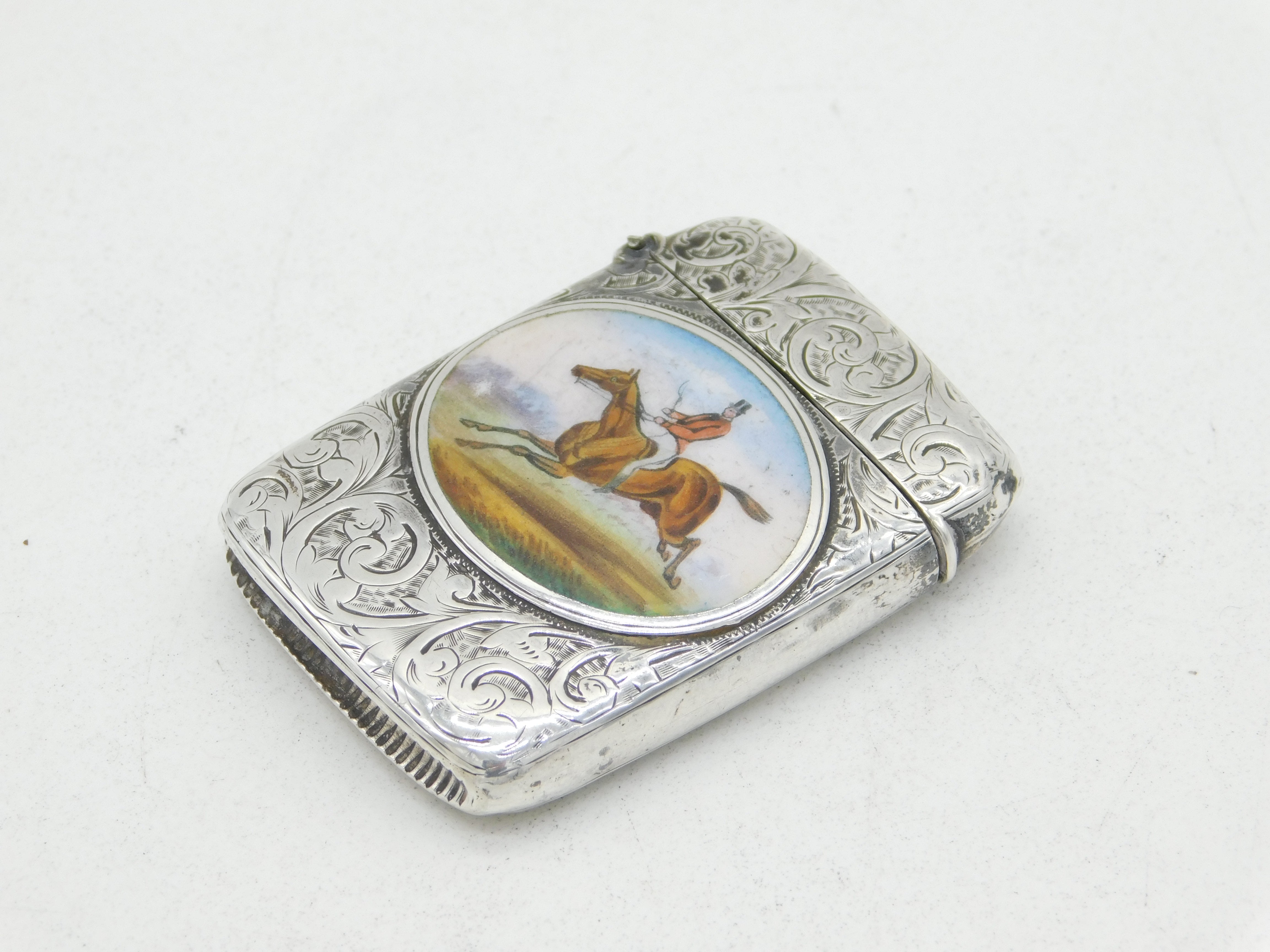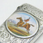 Victorian Sterling Silver & Enamel Galloping Huntsman Vesta Case Antique
