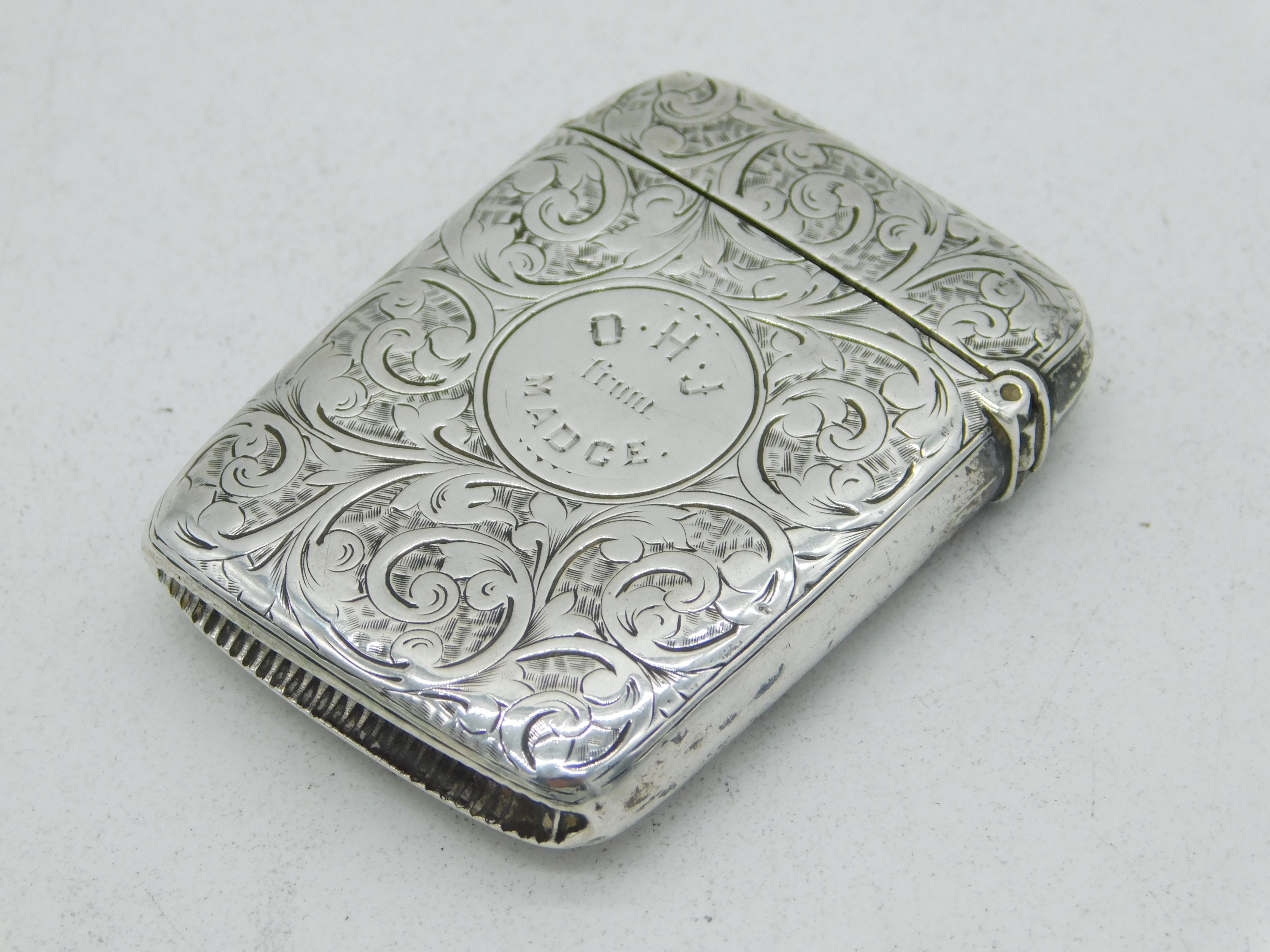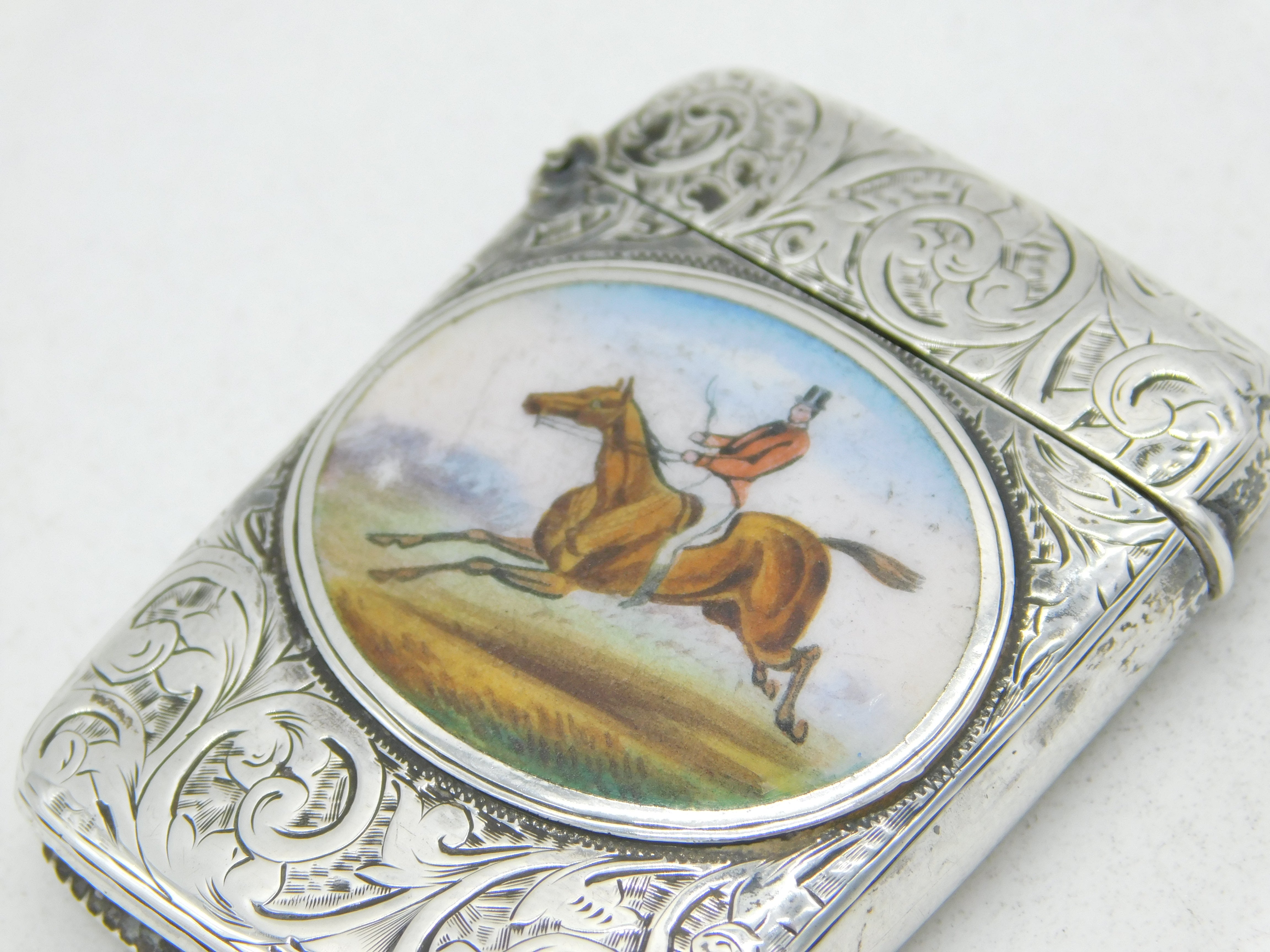 Details: A fantastic and wonderfully designed antique Victorian sterling silver floral decorated vesta case with charming enamel vignette of a huntsman galloping, hallmarked Birmingham 1889 This is a wonderful item that would make a perfect gift or addition to any collection. We are more than happy to provide XRF reports for items upon request.