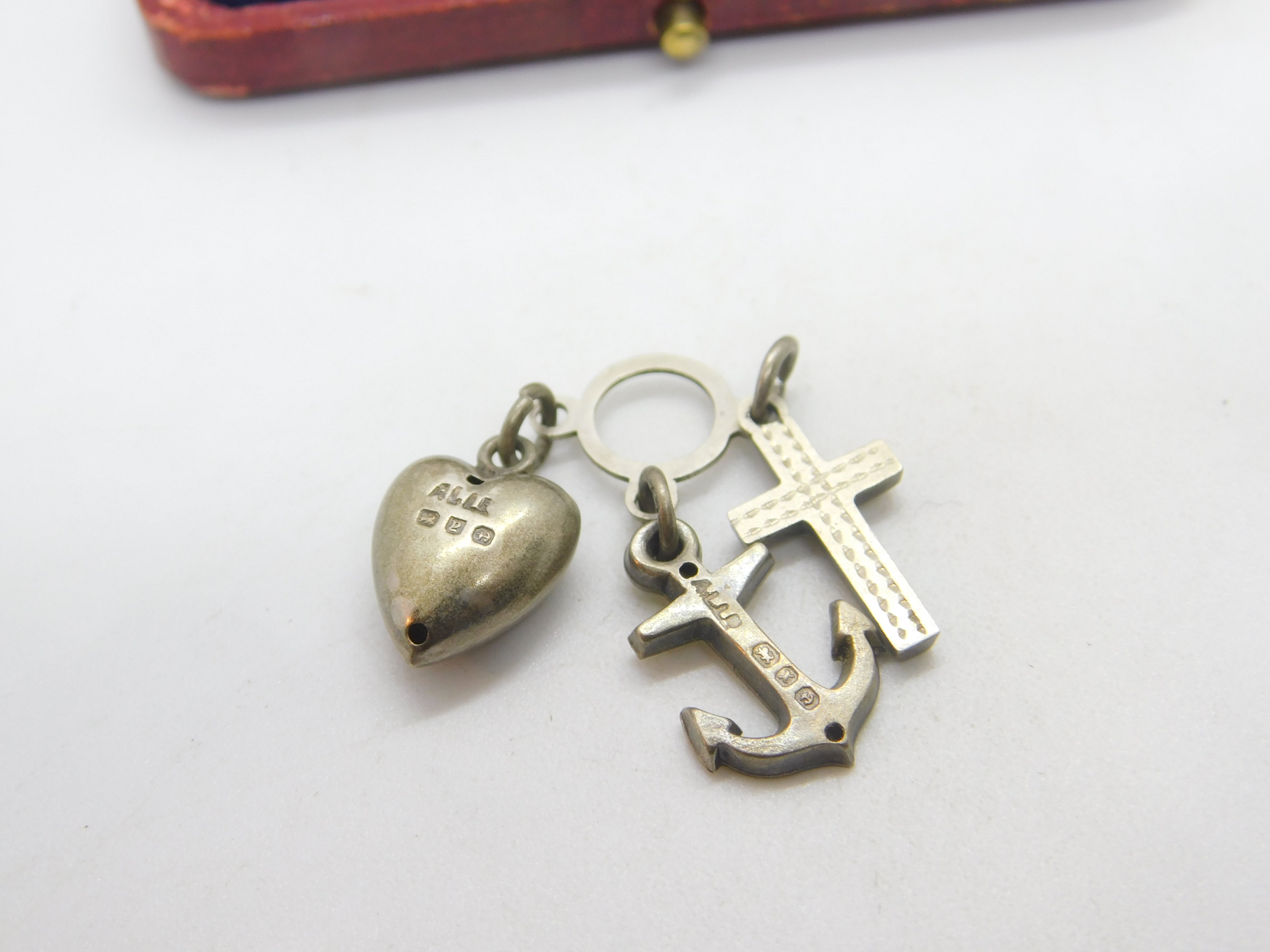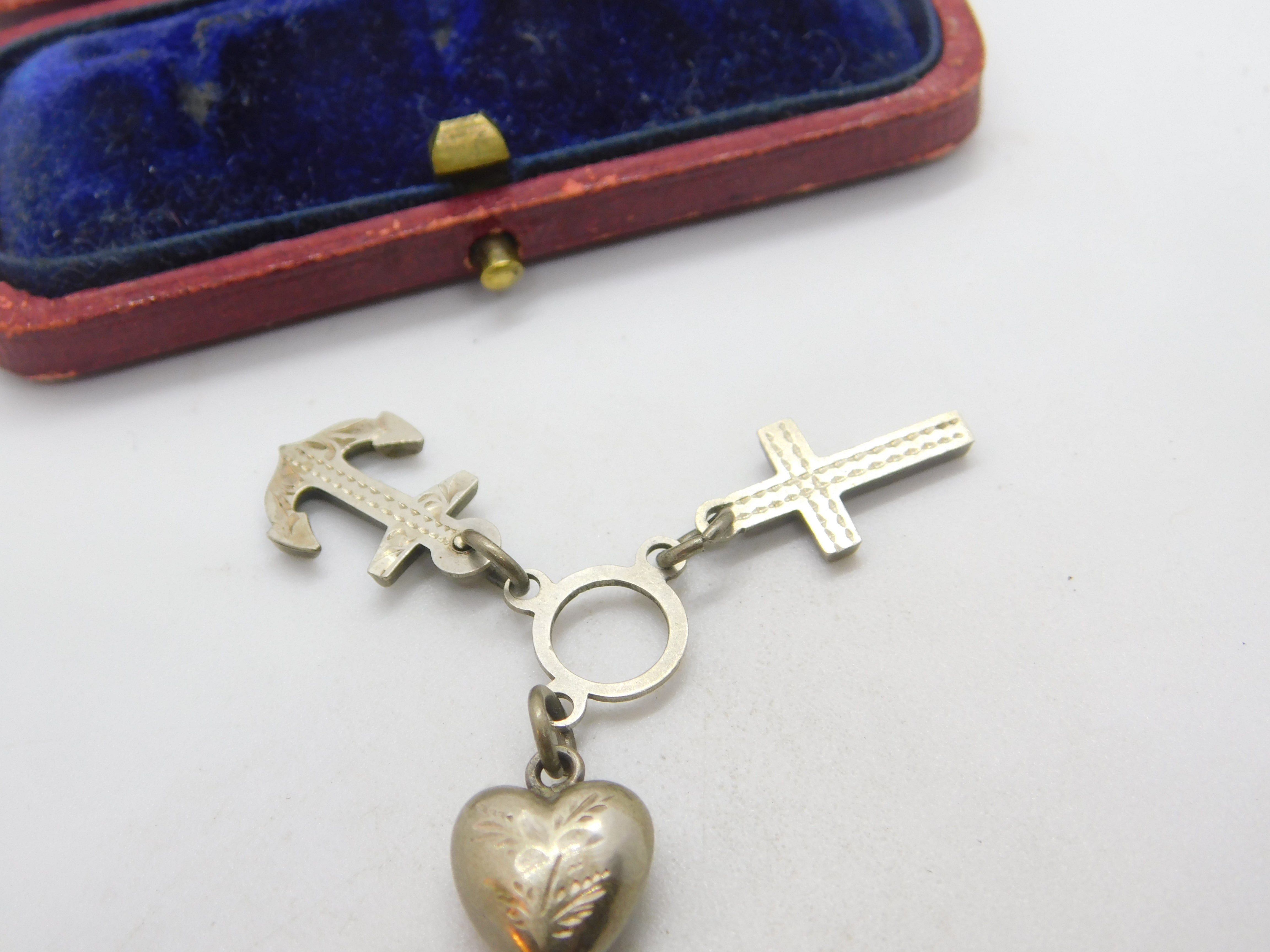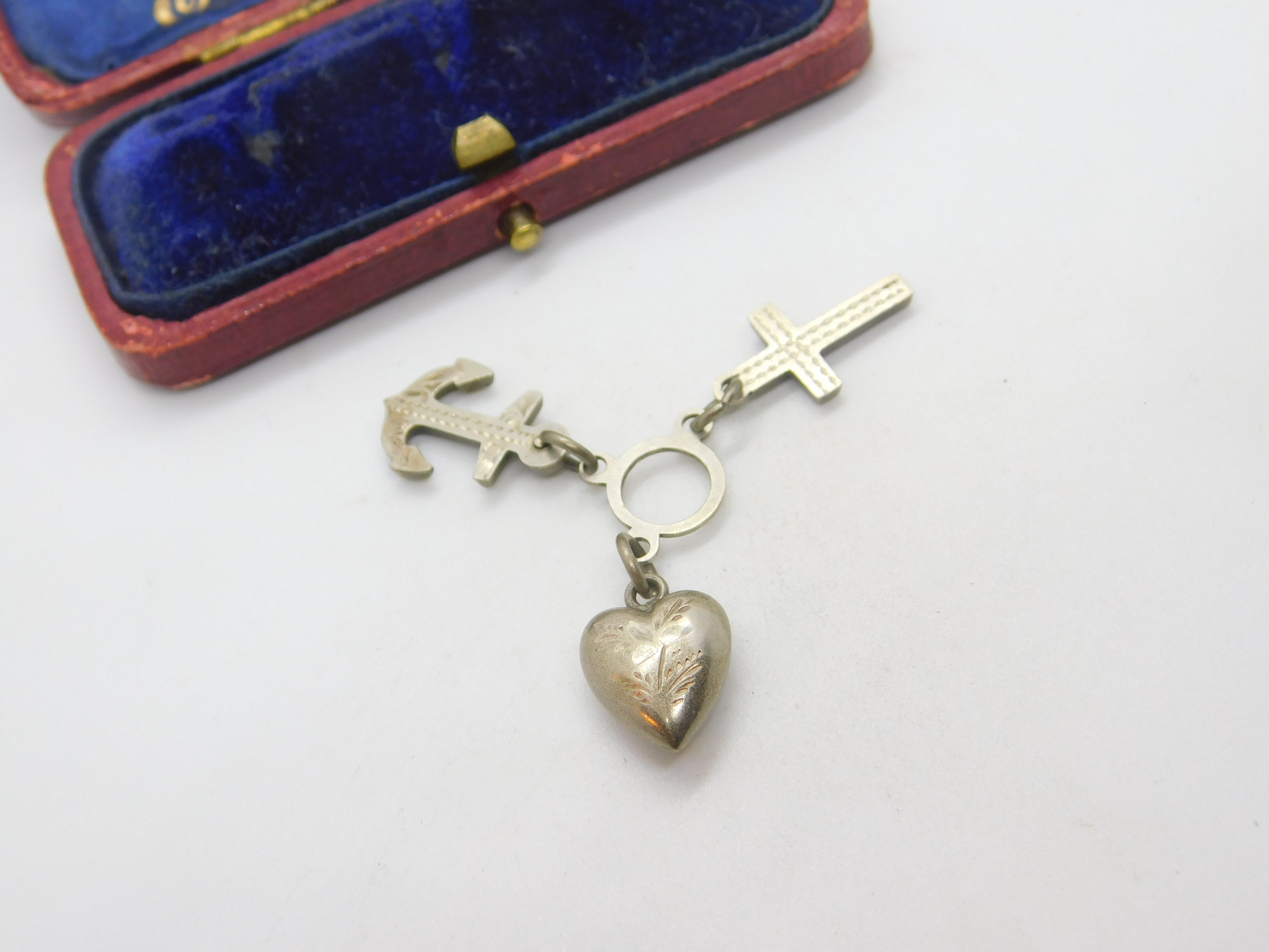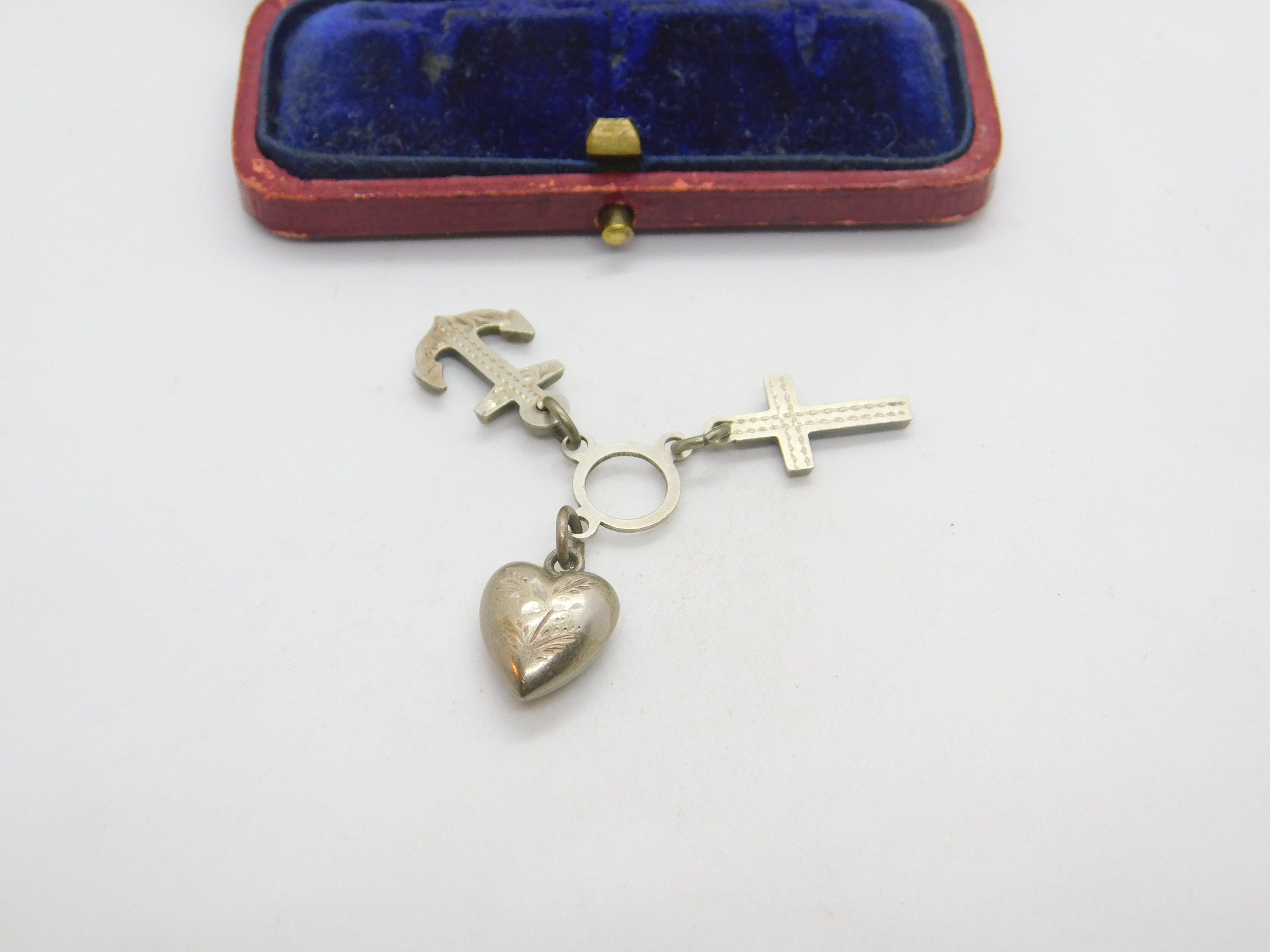 Details: A fantastic and wonderfully designed antique Victorian sterling silver anchor of hope, cross of faith and heart of charity charm or pendant each piece hallmarked Birmingham 1898 by Adie & Lovekin. This is a wonderful item that would make a perfect gift or addition to any collection. The BOX pictured is for PRESENTATION ONLY and is NOT included in the listings but used to frame the pictures unless specifically stated otherwise.