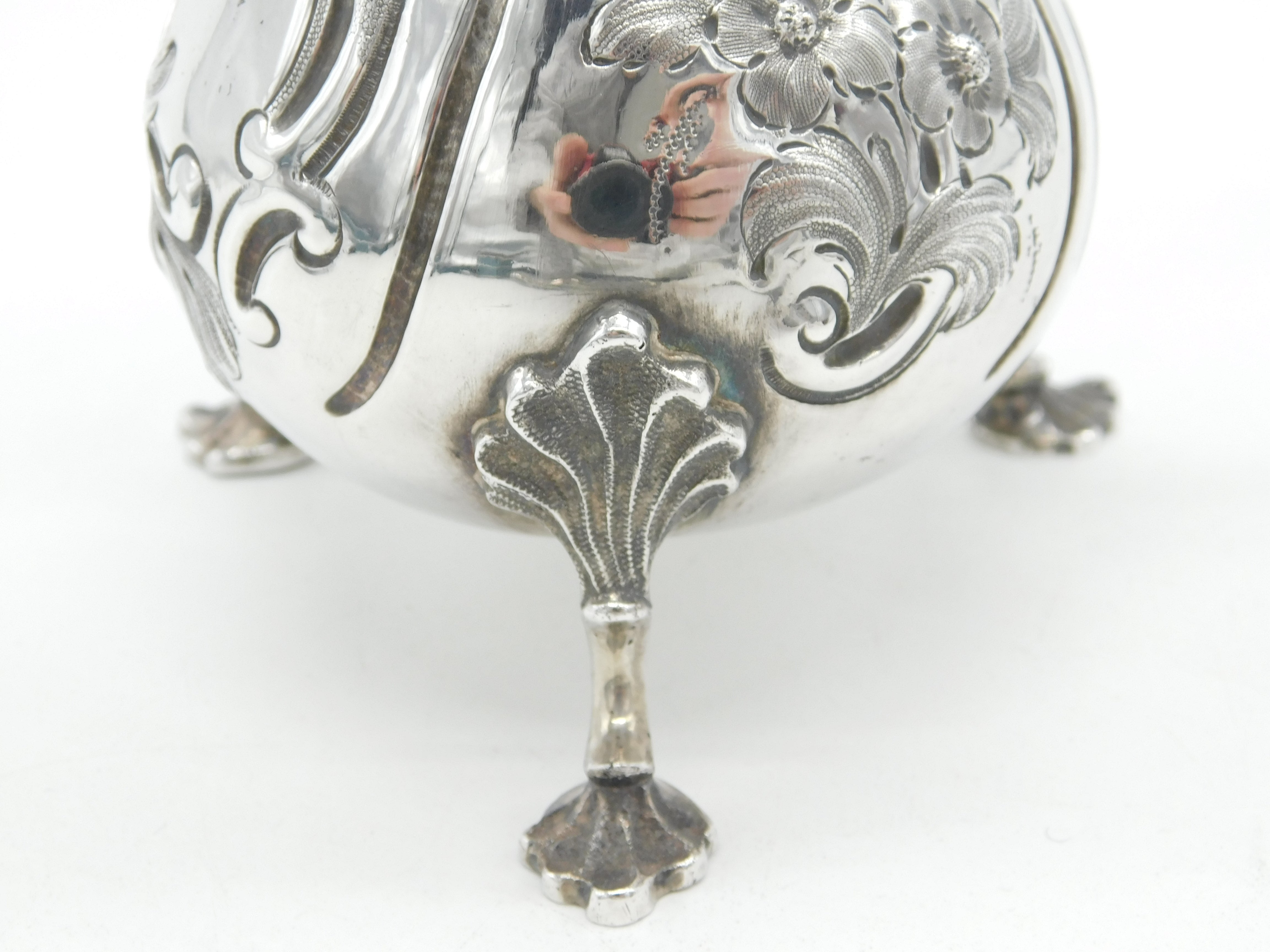 Details: A fantastic and wonderfully designed antique Victorian sterling silver floral chased cream jug with charming shell form feet hallmarked London 1854 by William Robert Smily. This is a wonderful item that would make a perfect gift or addition to any collection. The BOX pictured is for PRESENTATION ONLY and is NOT included in the listings but used to frame the pictures unless specifically stated otherwise.