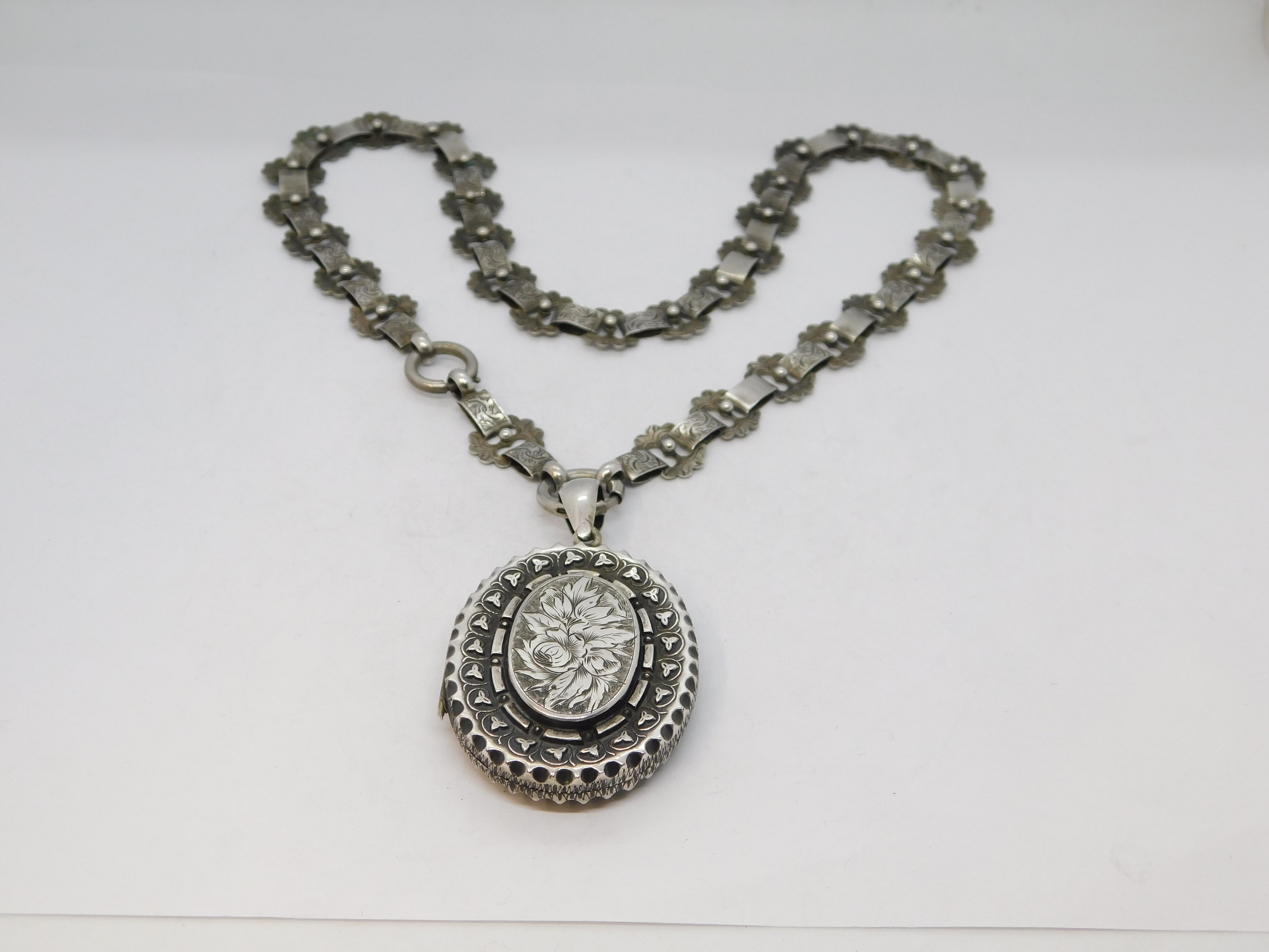Details: A fantastic and wonderfully designed antique Victorian sterling silver floral pattern sweetheart locket with superb detailing set of a wonderful floral chased collar necklace c1860, the silver has been XRF tested. This is a wonderful item that would make a perfect gift or addition to any collection. The BOX pictured is for PRESENTATION ONLY and is NOT included in the listings but used to frame the pictures unless specifically stated otherwise.