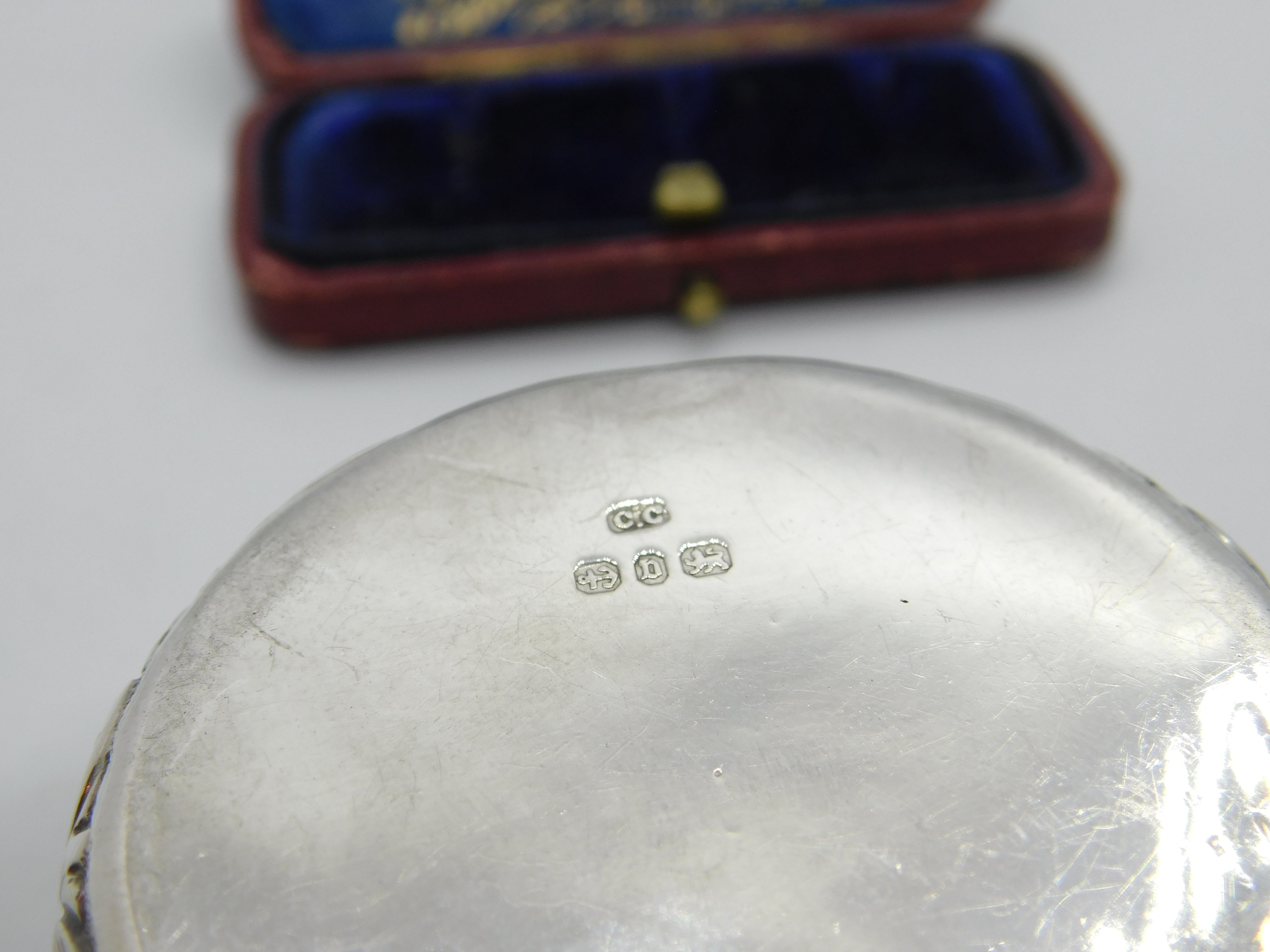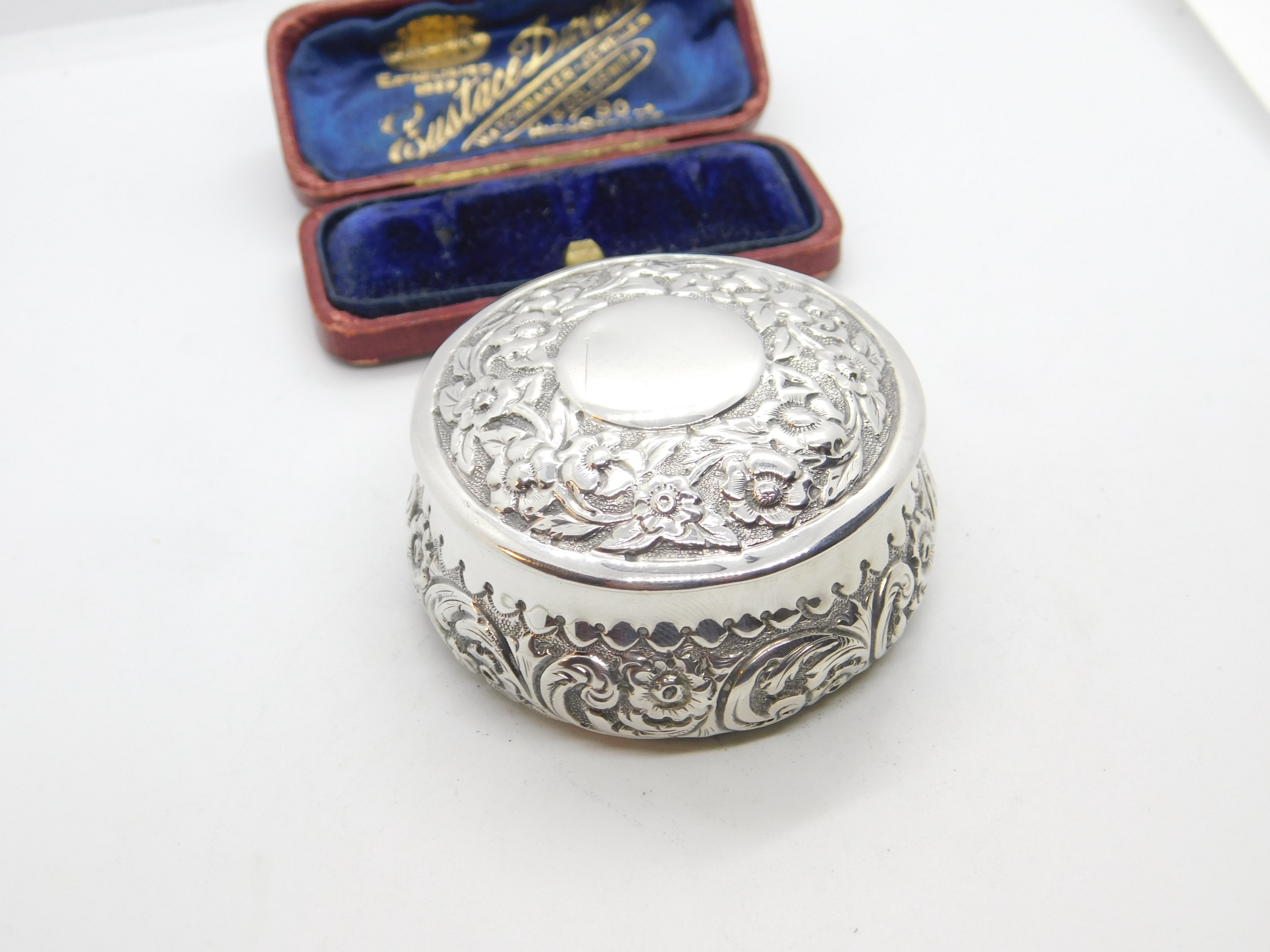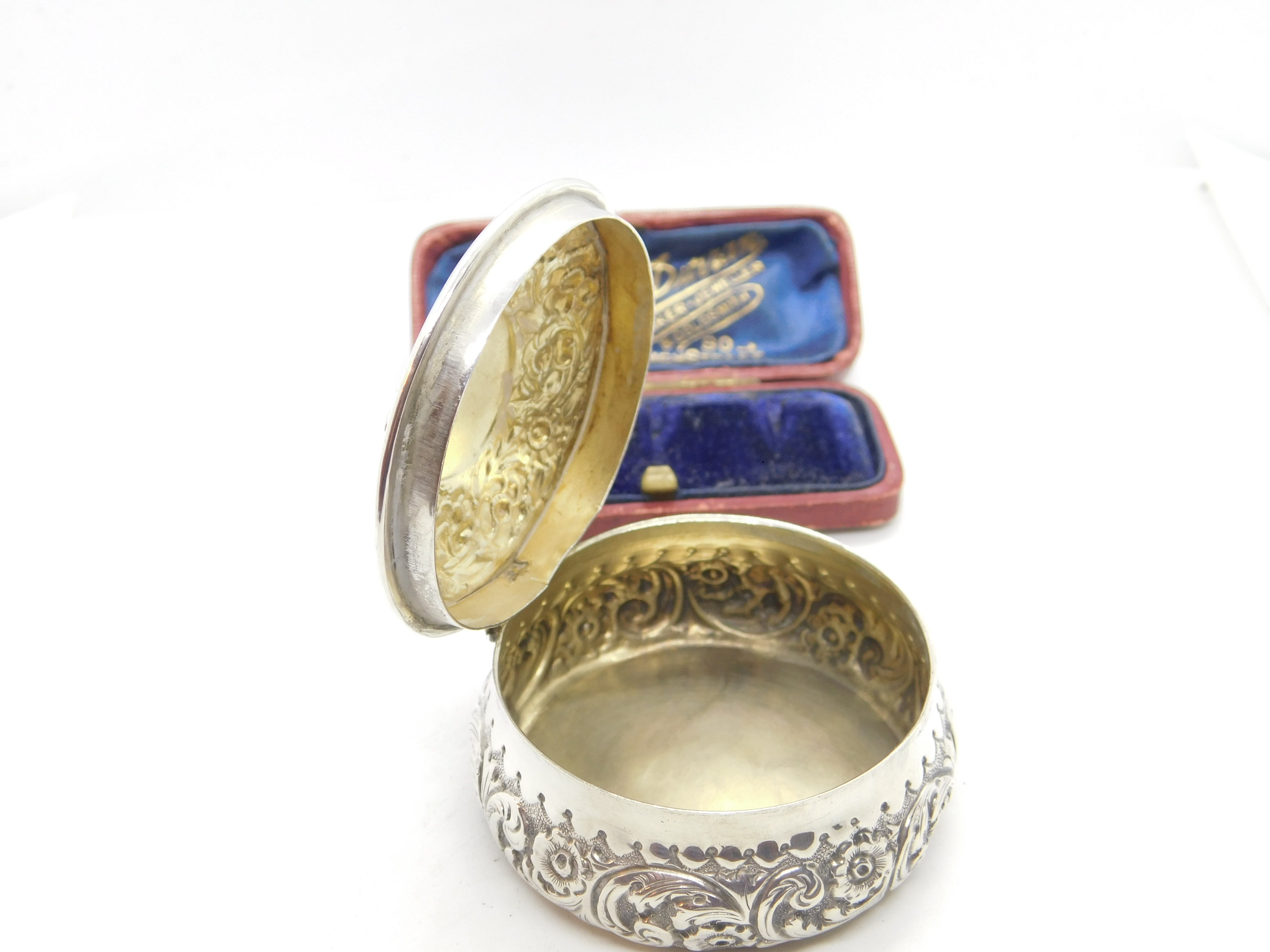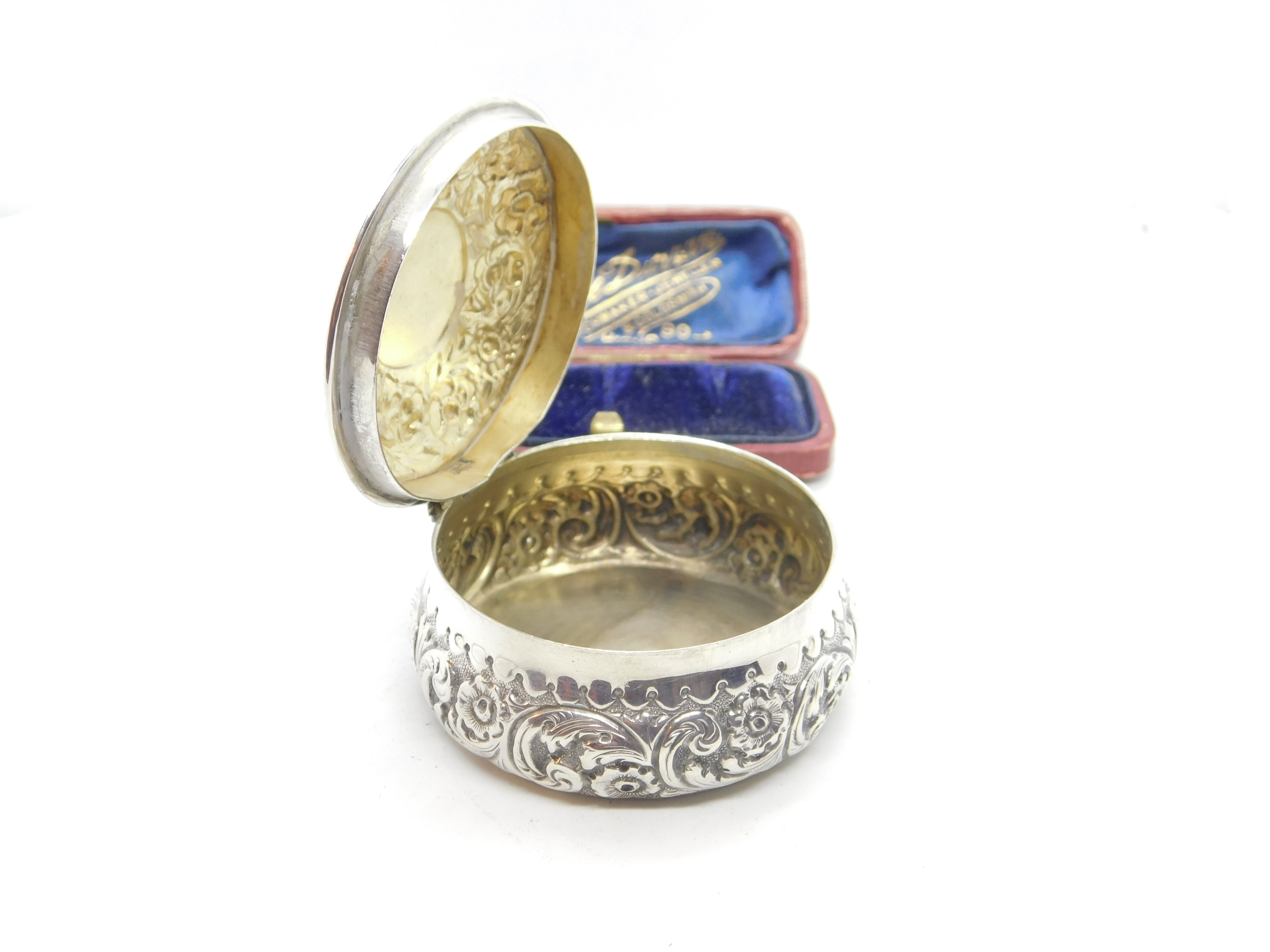 Details: A fantastic and wonderfully designed antique Victorian sterling silver circular snuff box with charming floral patterns throughout hallmarked Birmingham 1876 by Colen Hewer Cheshire. This is a wonderful item that would make a perfect gift or addition to any collection. The BOX pictured is for PRESENTATION ONLY and is NOT included in the listings but used to frame the pictures unless specifically stated otherwise.