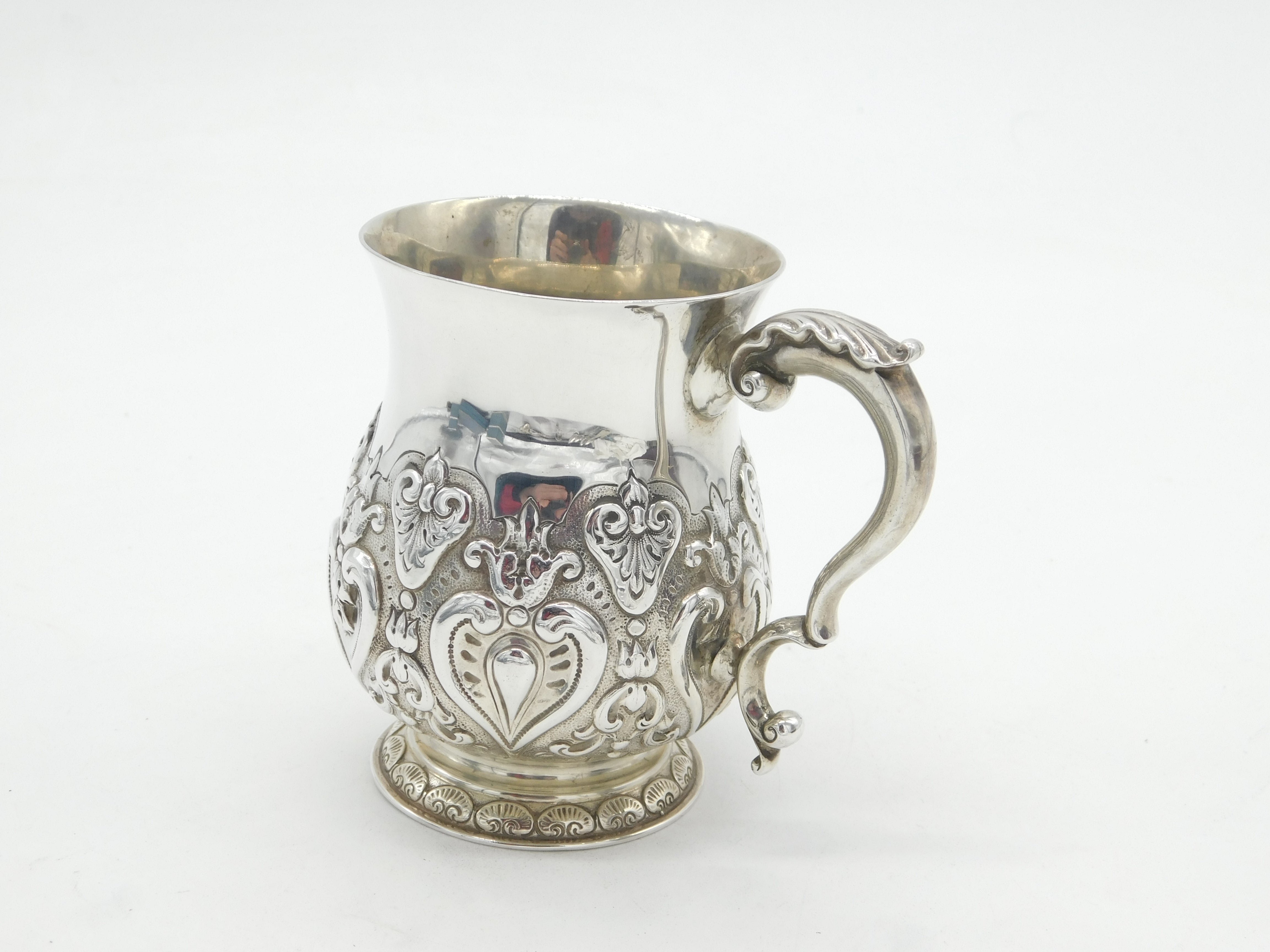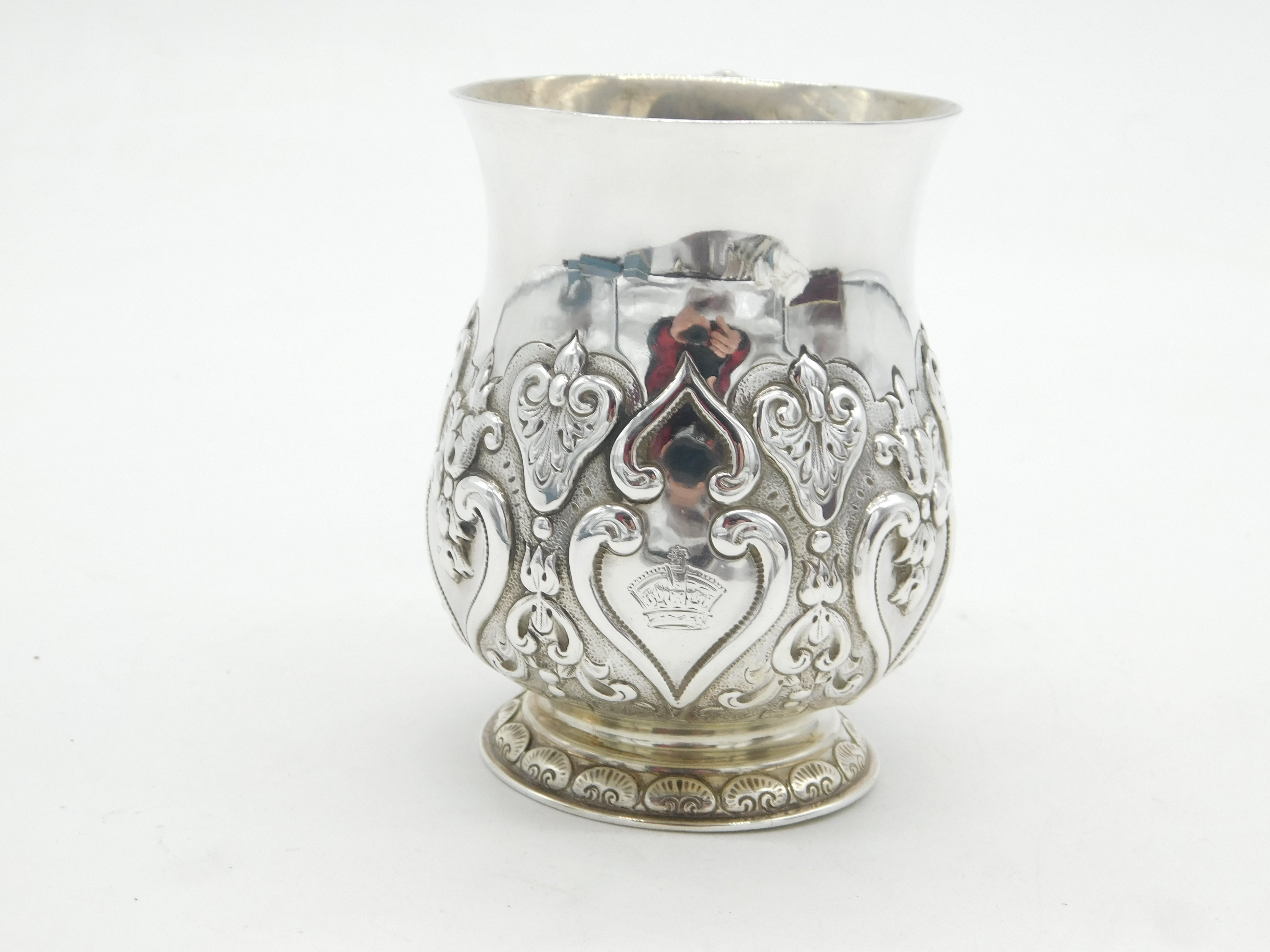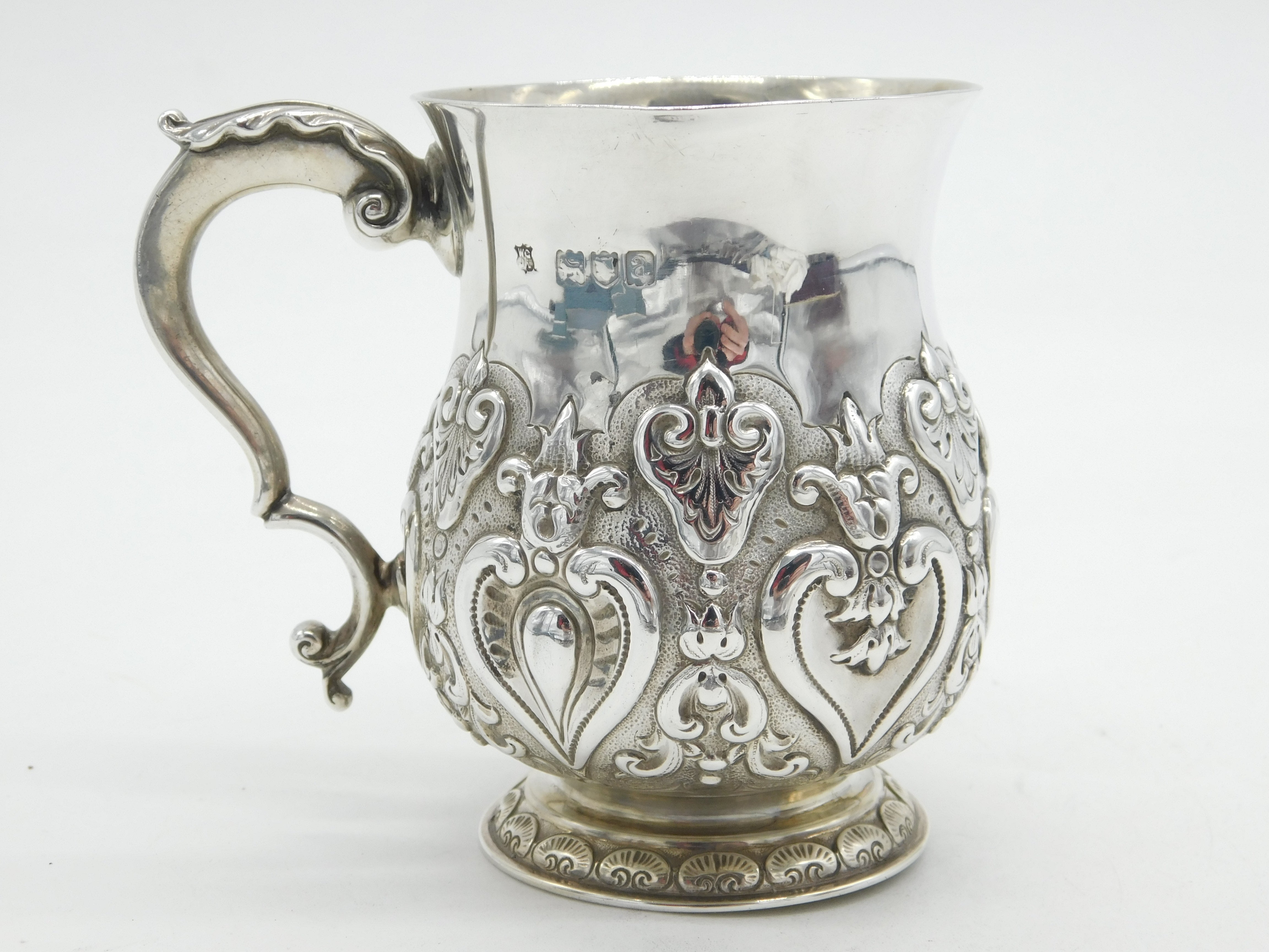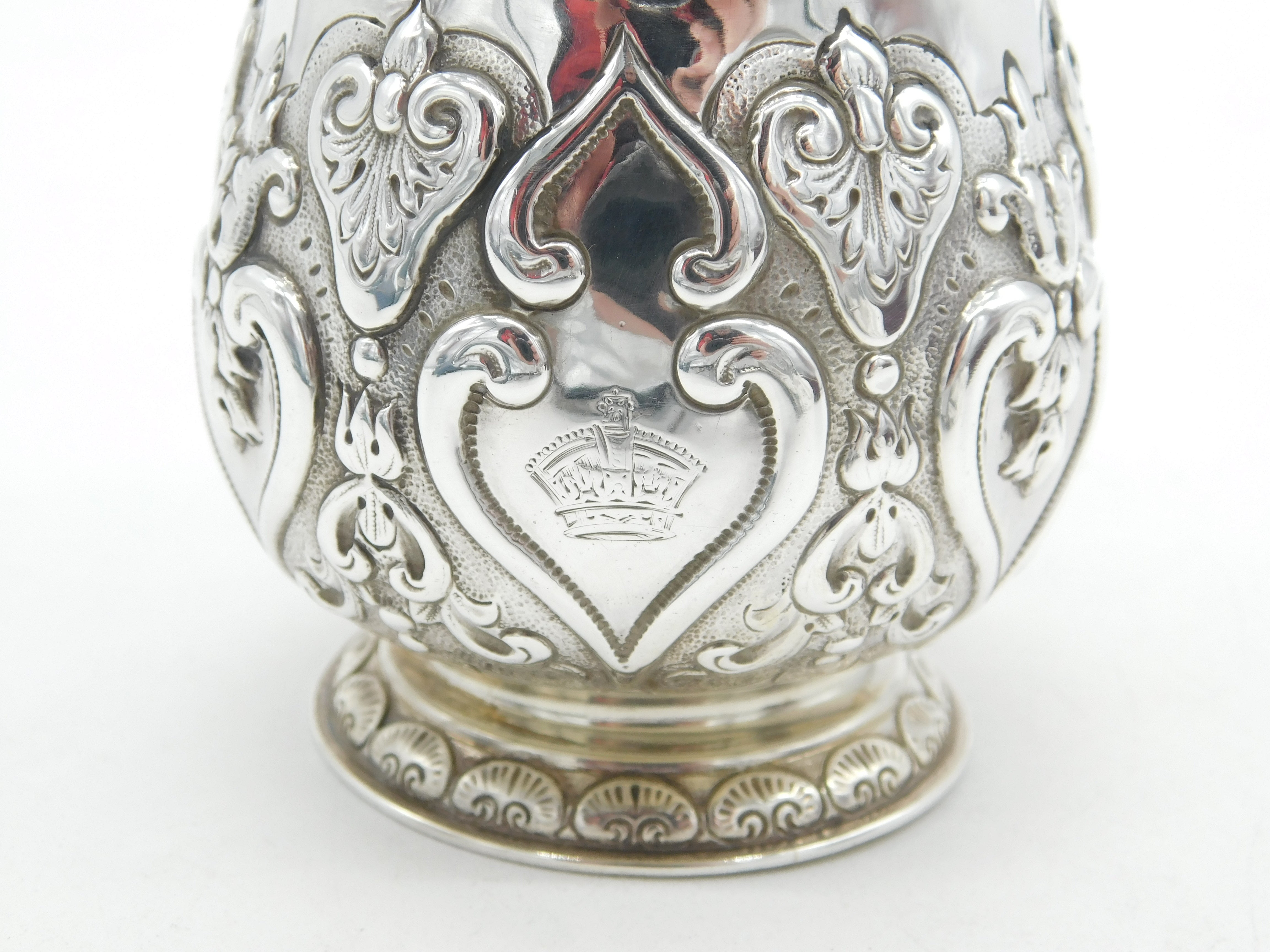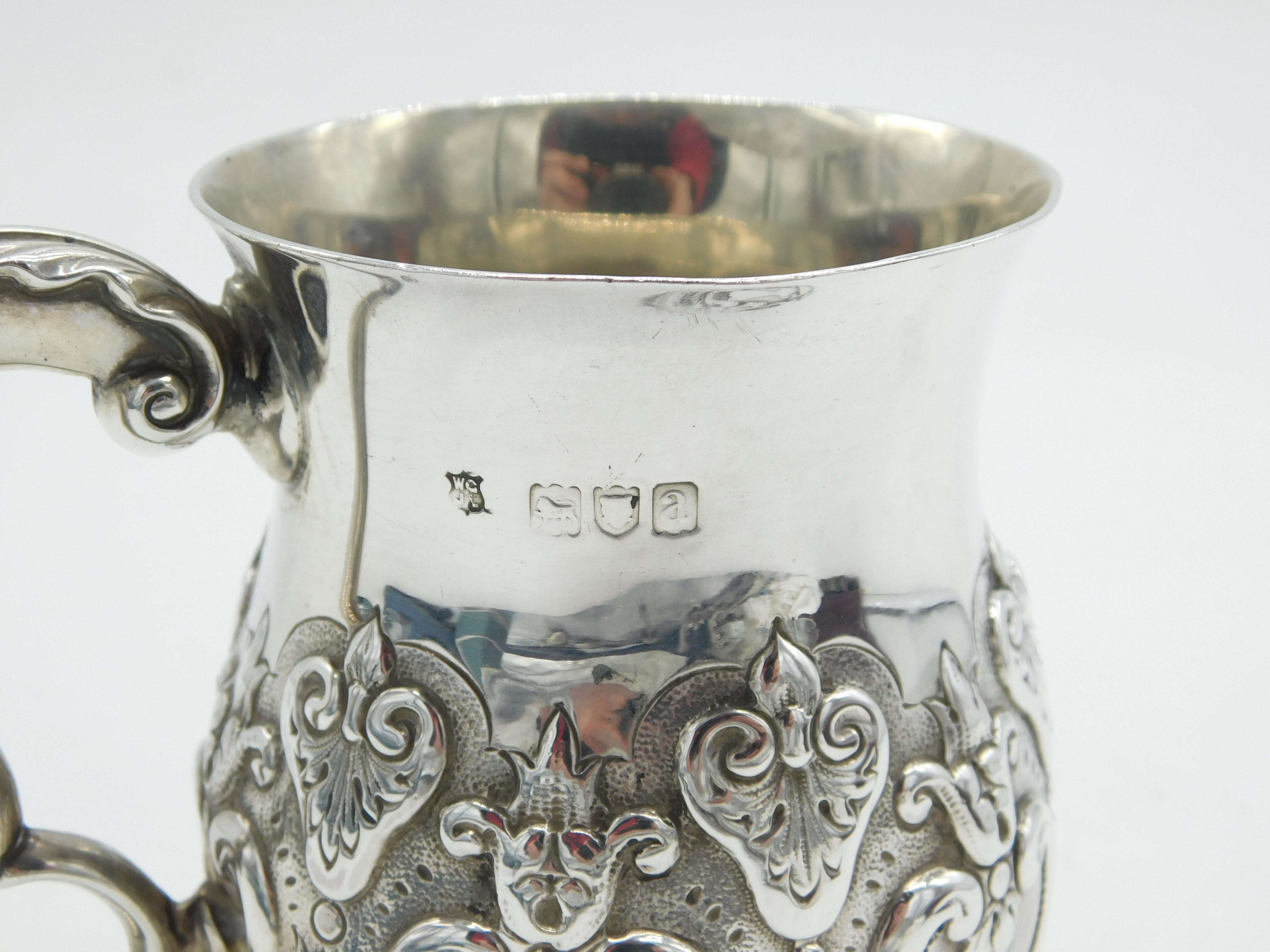 Details: A fantastic and wonderfully designed antique Victorian sterling silver floral repousse christening mug tankard with superb detailing hallmarked London 1896 by Goldsmiths & Silversmiths Co. Ltd. Charming regal crown crest to the central cartouche. This is a wonderful item that would make a perfect gift or addition to any collection. The BOX pictured is for PRESENTATION ONLY and is NOT included in the listings but used to frame the pictures unless specifically stated otherwise.