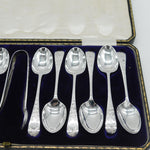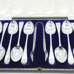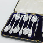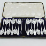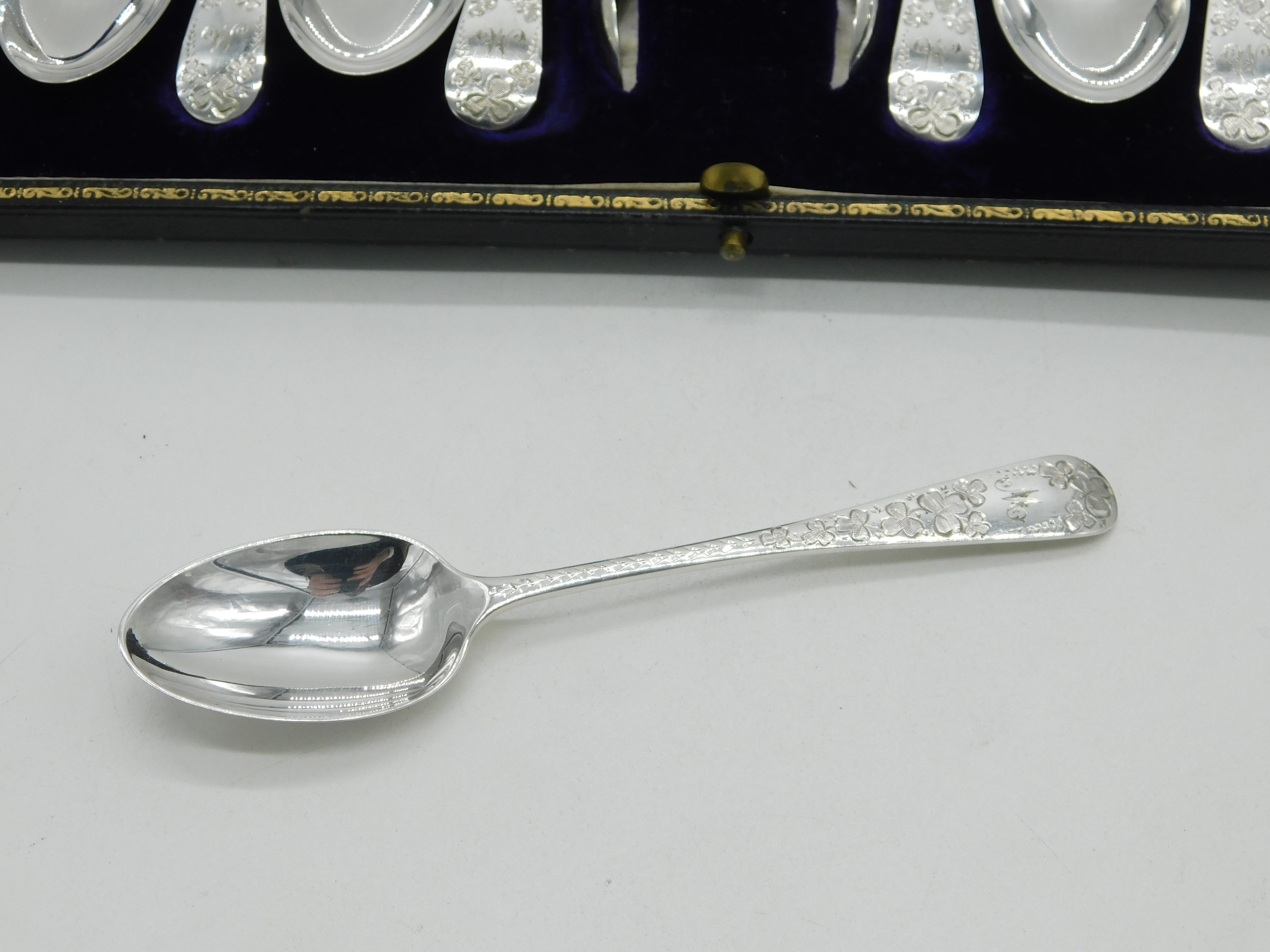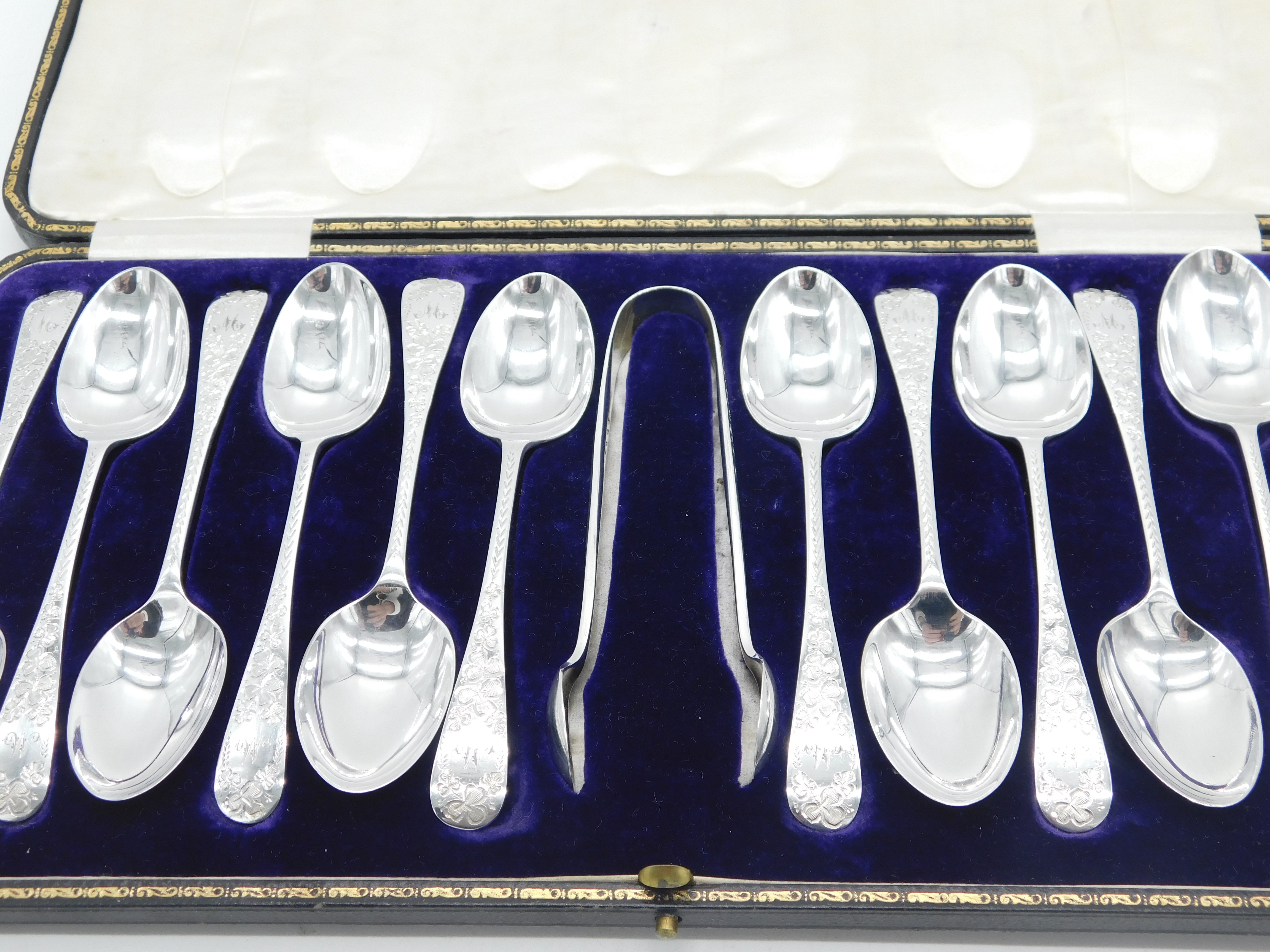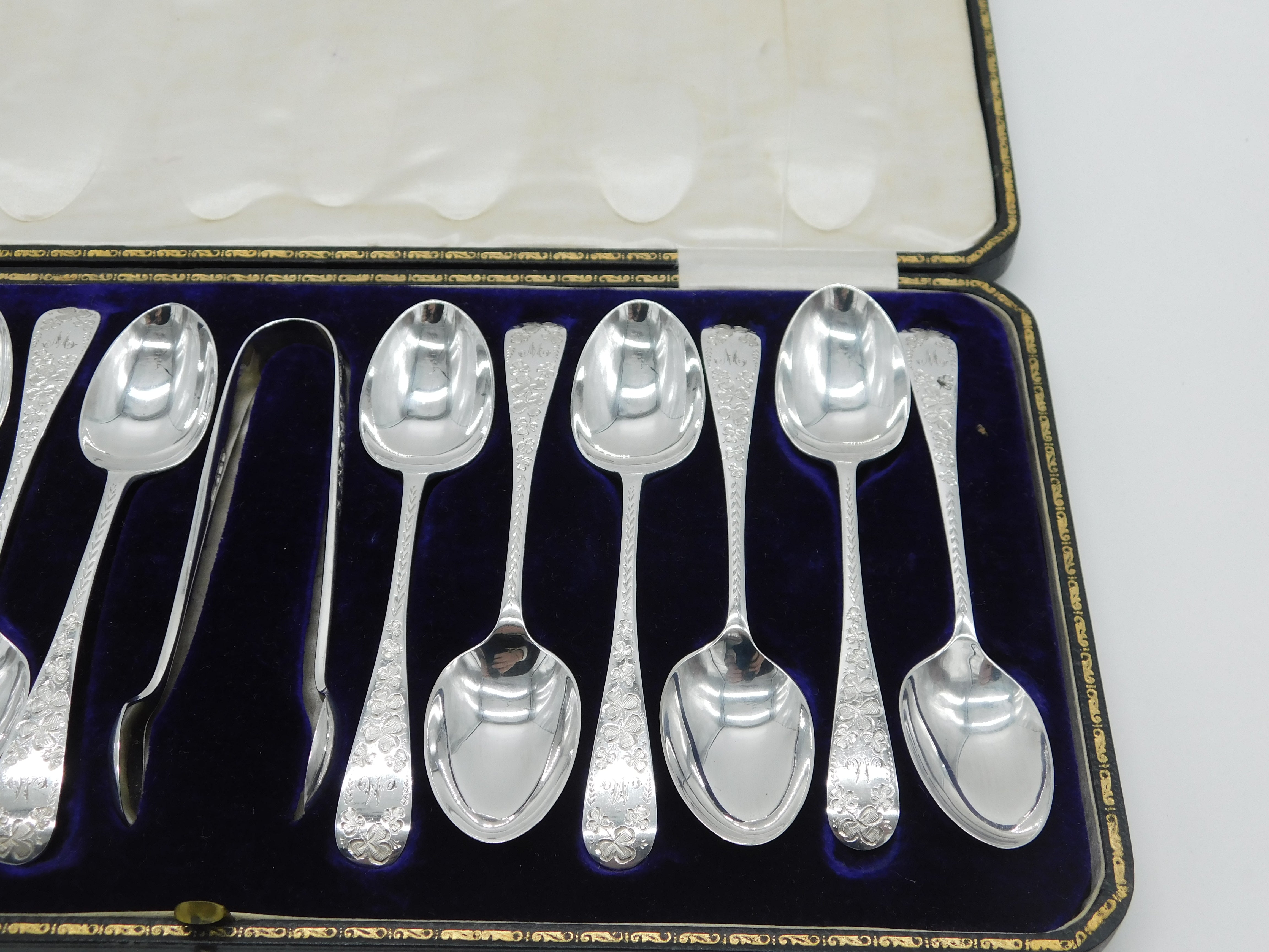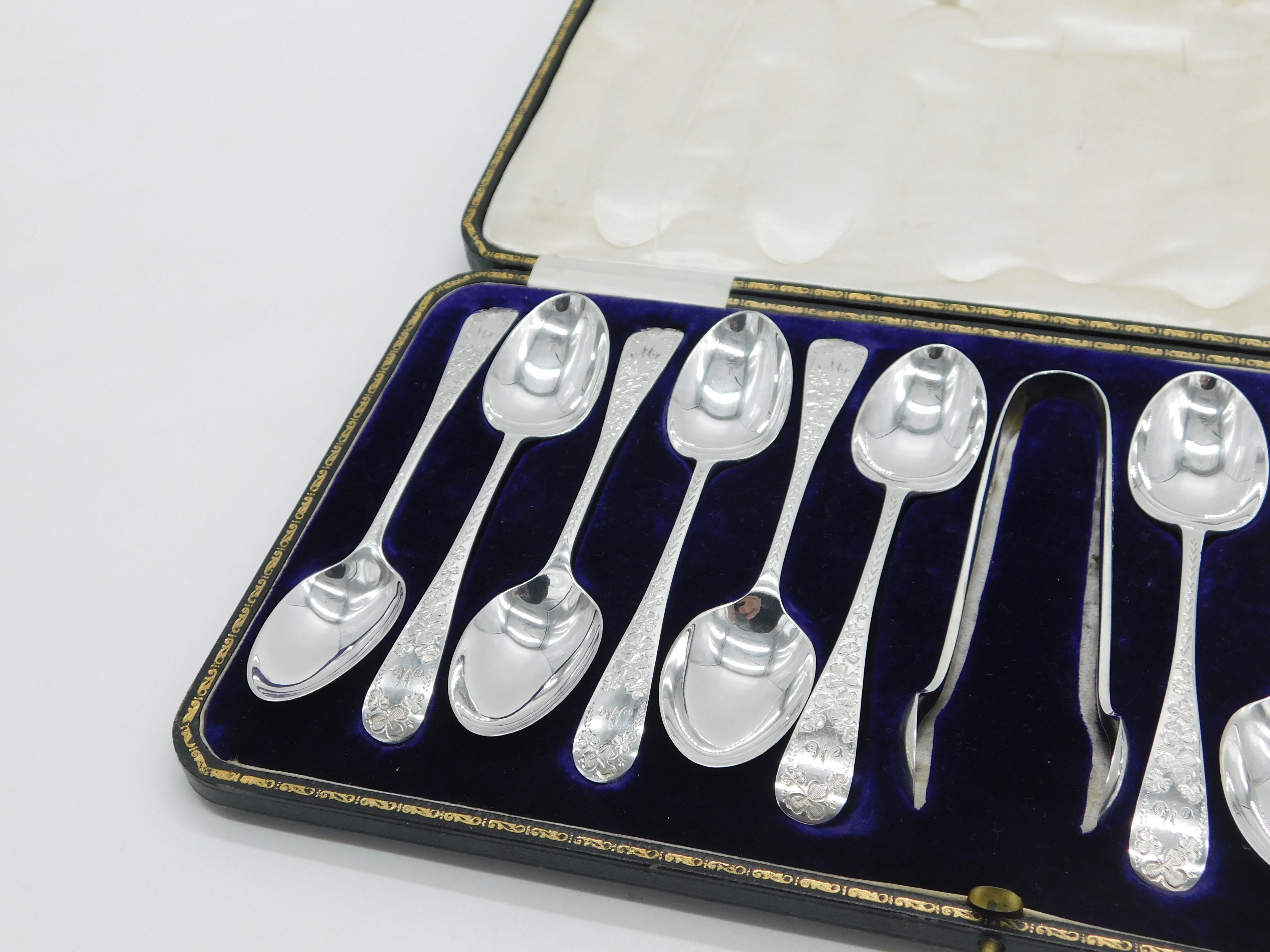 Details: A fantastic and wonderfully designed antique Victorian sterling silver floral pattern twelve piece teaspoon & tongs set with M initials to the terminal hallmarked Sheffield 1898 by Allen & Darwin. This is a wonderful item that would make a perfect gift or addition to any collection.