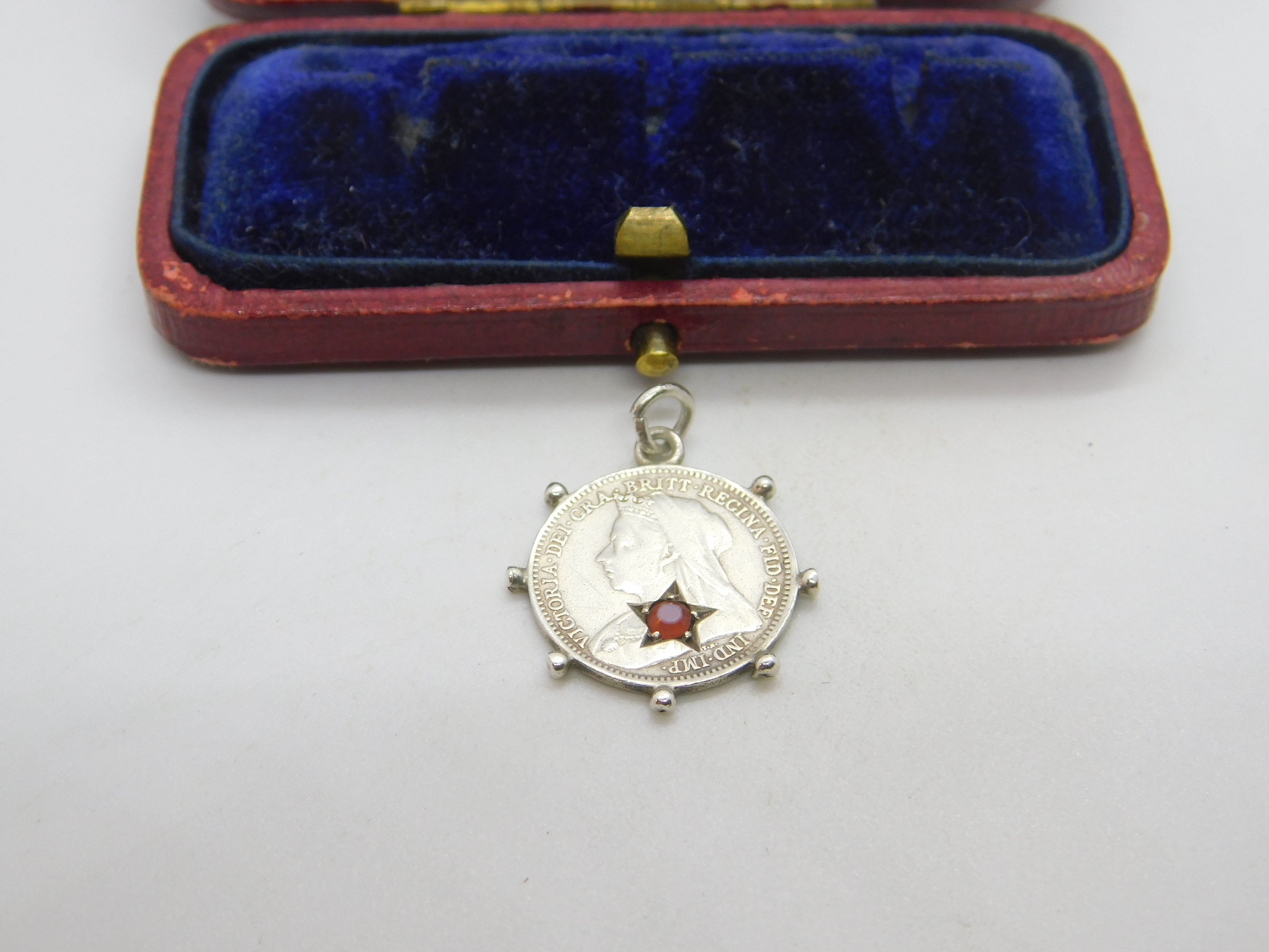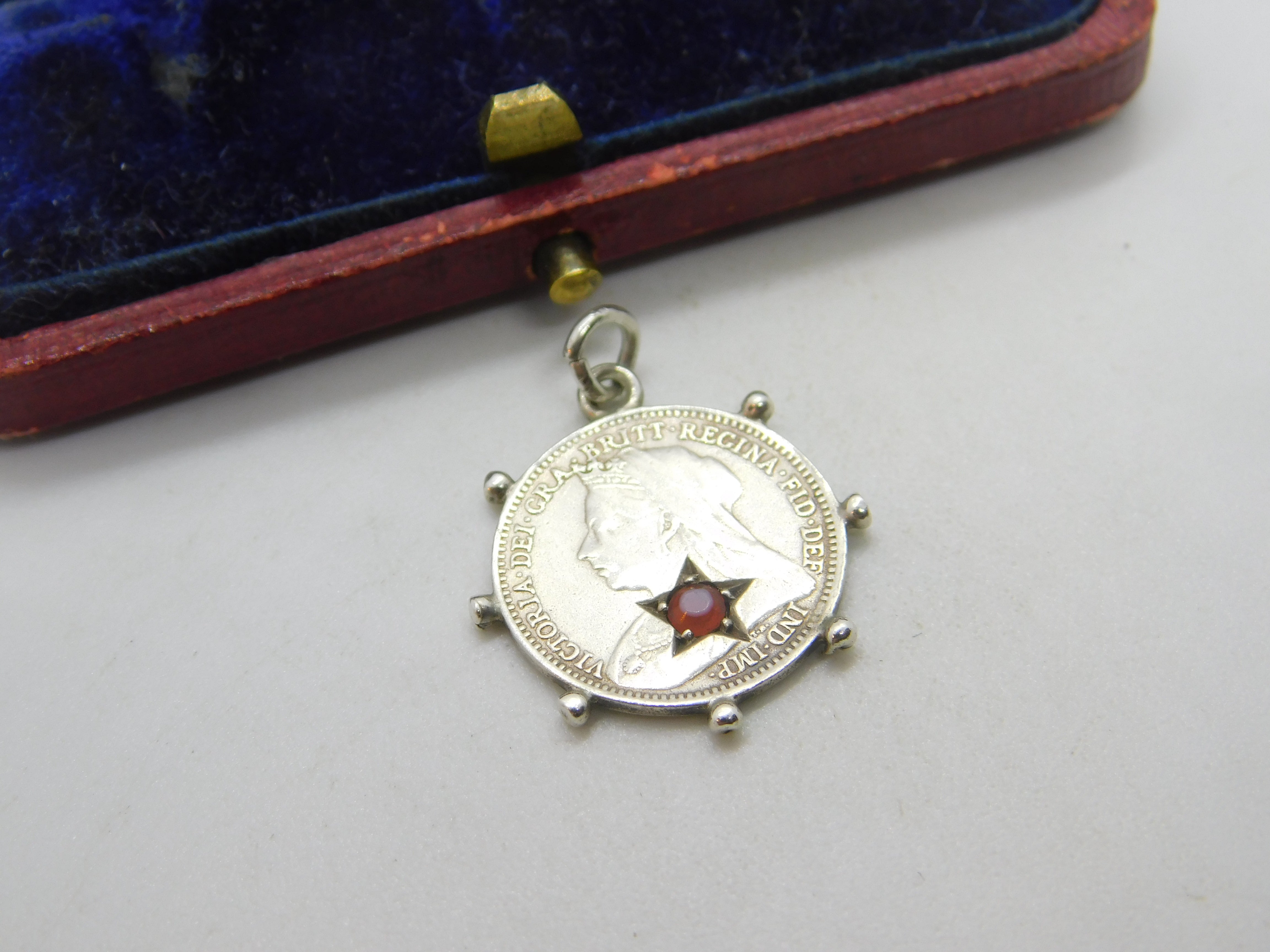 Details: A fantastic and wonderfully designed antique Victorian sterling silver threepence coin fob or charm set with a garnet stone dated 1901. This is a wonderful item that would make a perfect gift or addition to any collection. The BOX pictured is for PRESENTATION ONLY and is NOT included in the listings but used to frame the pictures unless specifically stated otherwise.