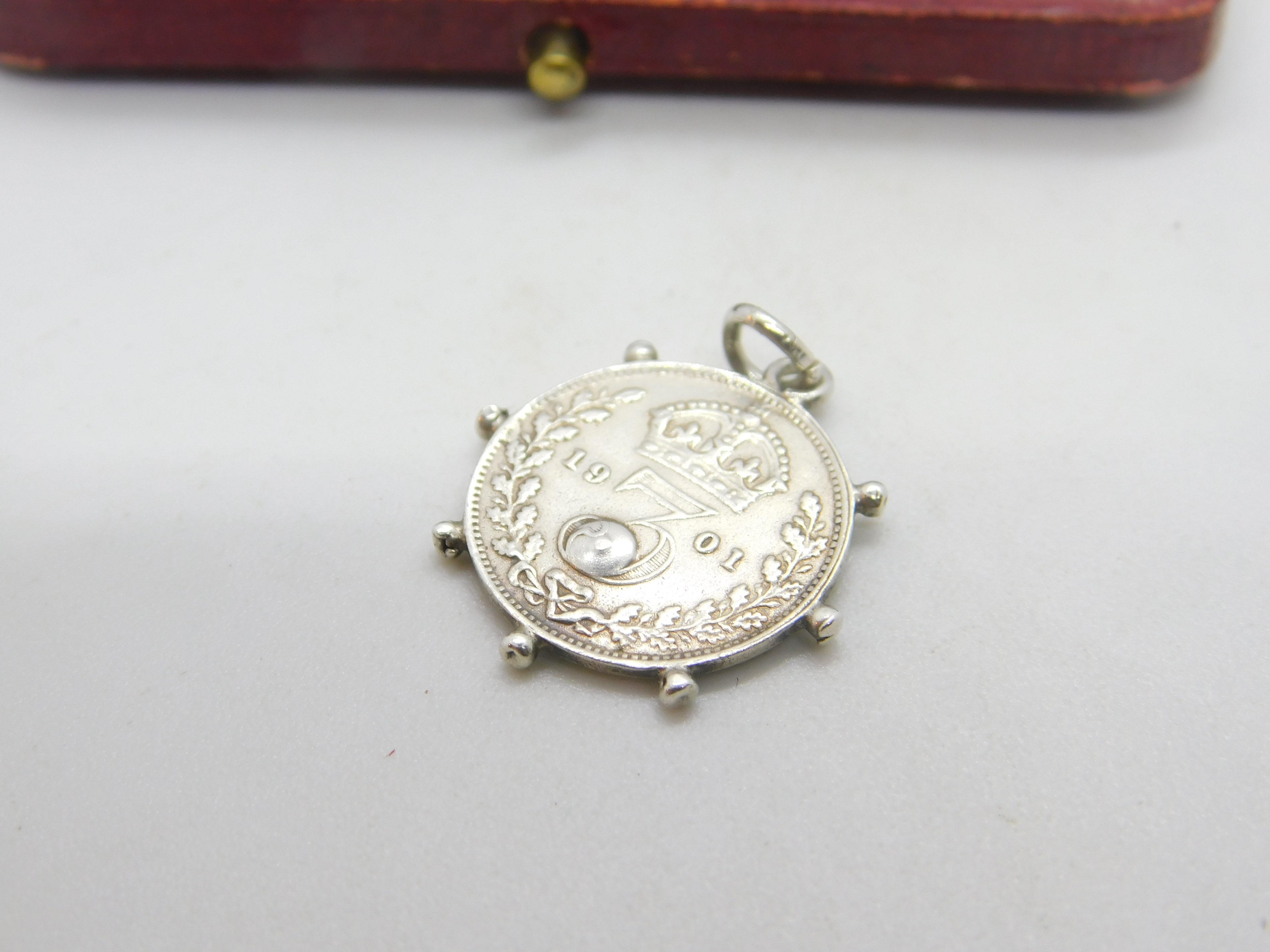 Victorian Sterling Silver Garnet Set Threepence Coin Charm 1901 Antique