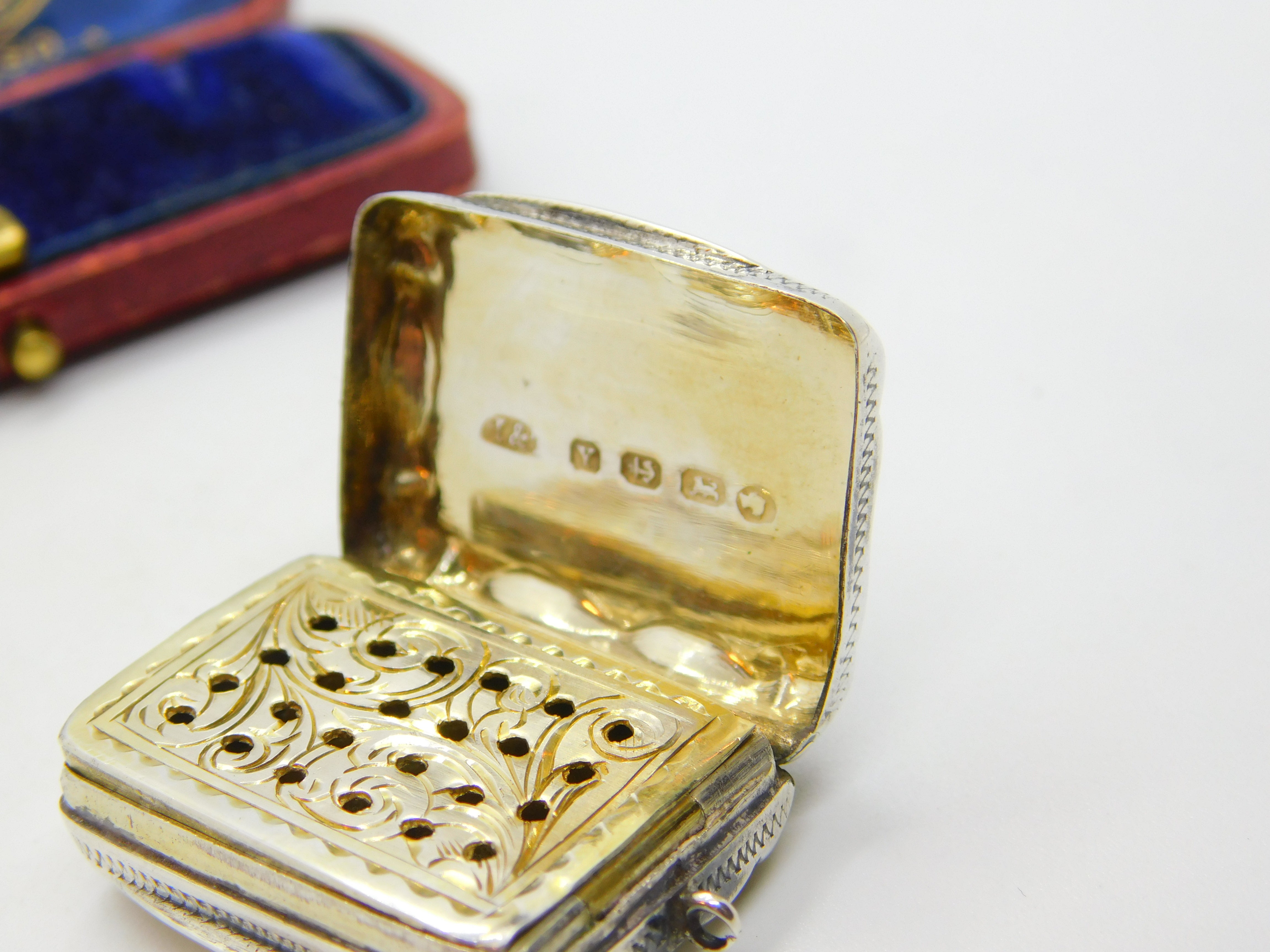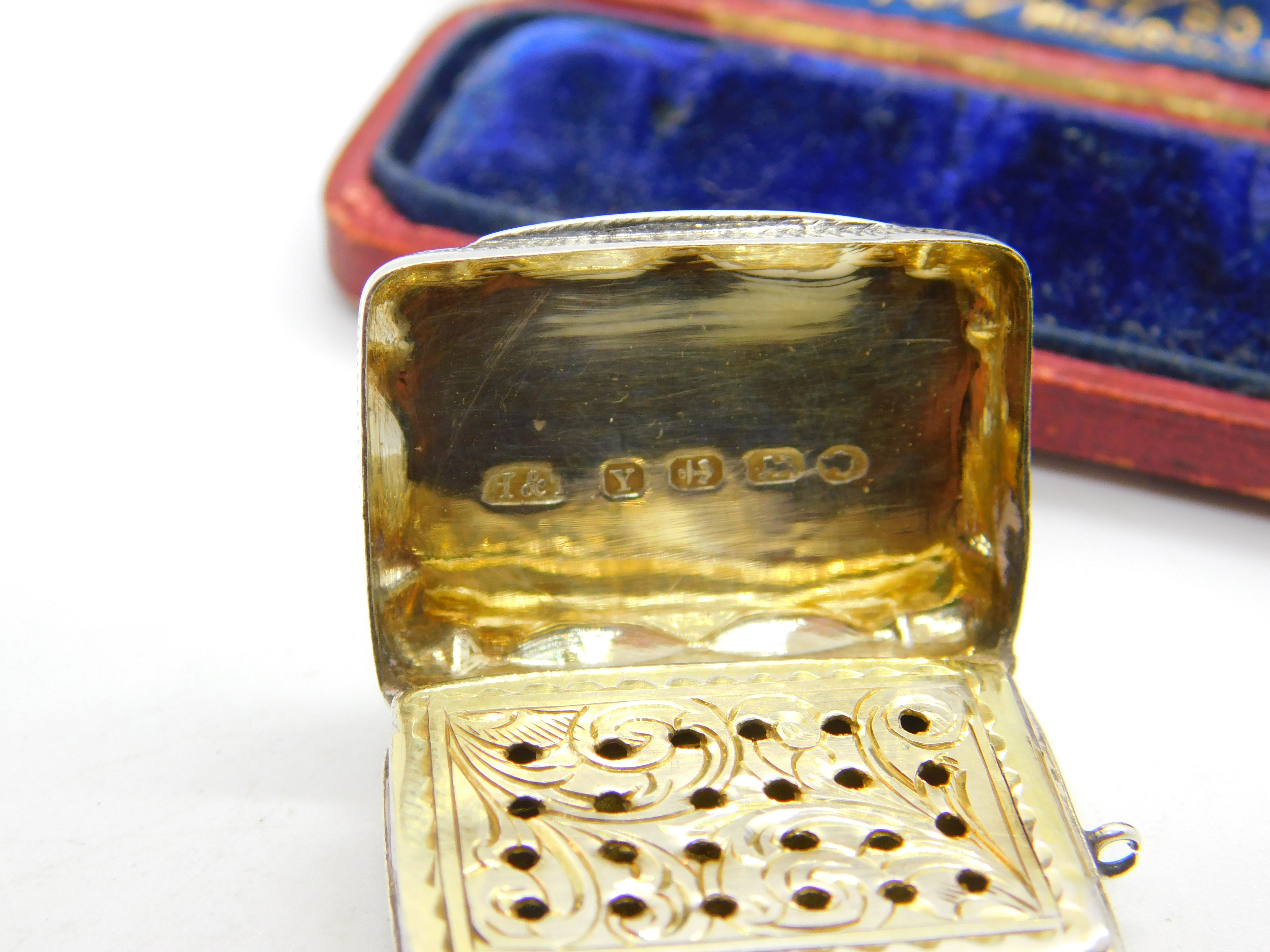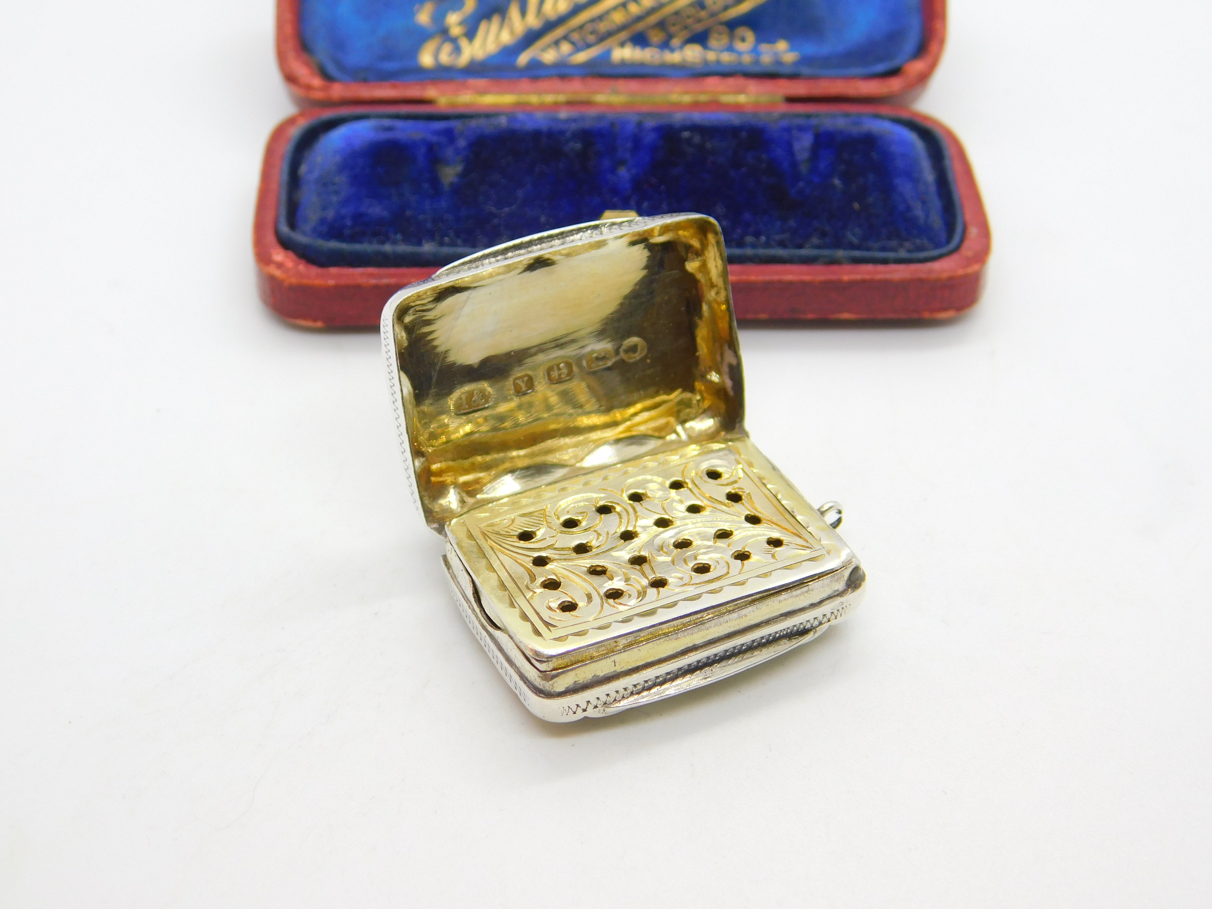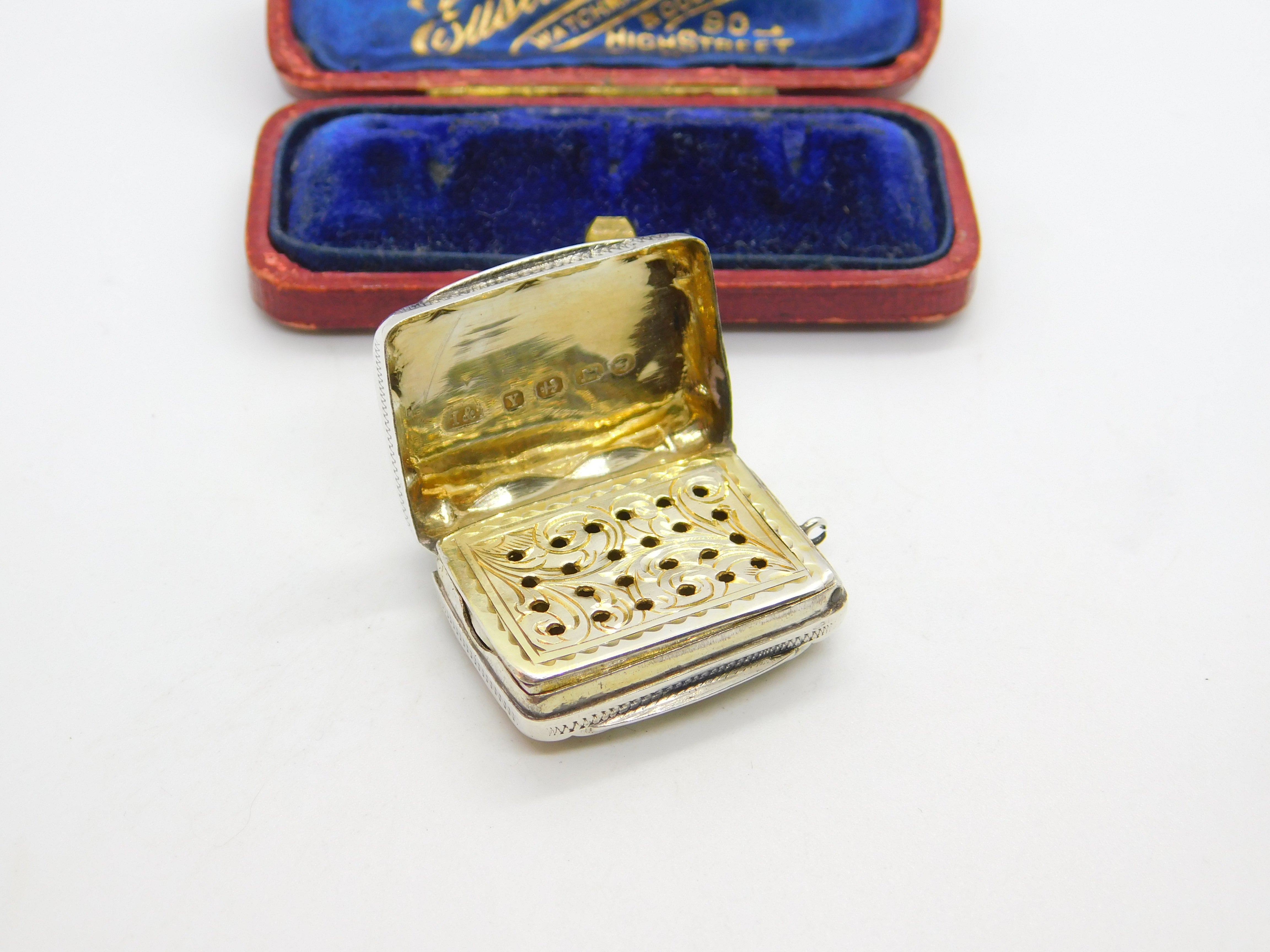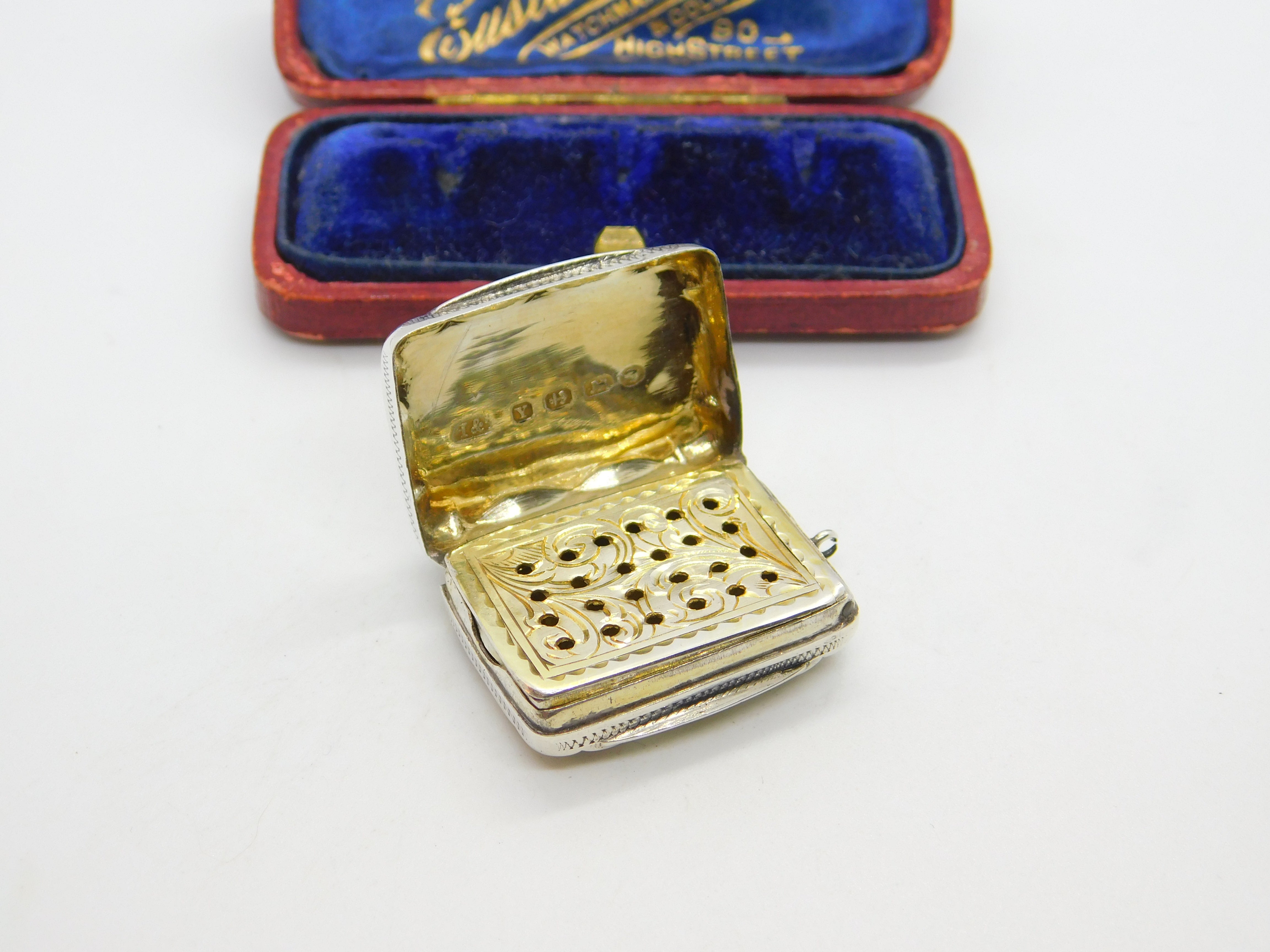Details: A fantastic and wonderfully designed antique Victorian sterling silver vinaigrette fob with lovely gilded detailing to the interior hallmarked Birmingham 1873 by Hilliard & Thomason. Engraved to the top lid. This is a wonderful item that would make a perfect gift or addition to any collection. The BOX pictured is for PRESENTATION ONLY and is NOT included in the listings but used to frame the pictures unless specifically stated otherwise.