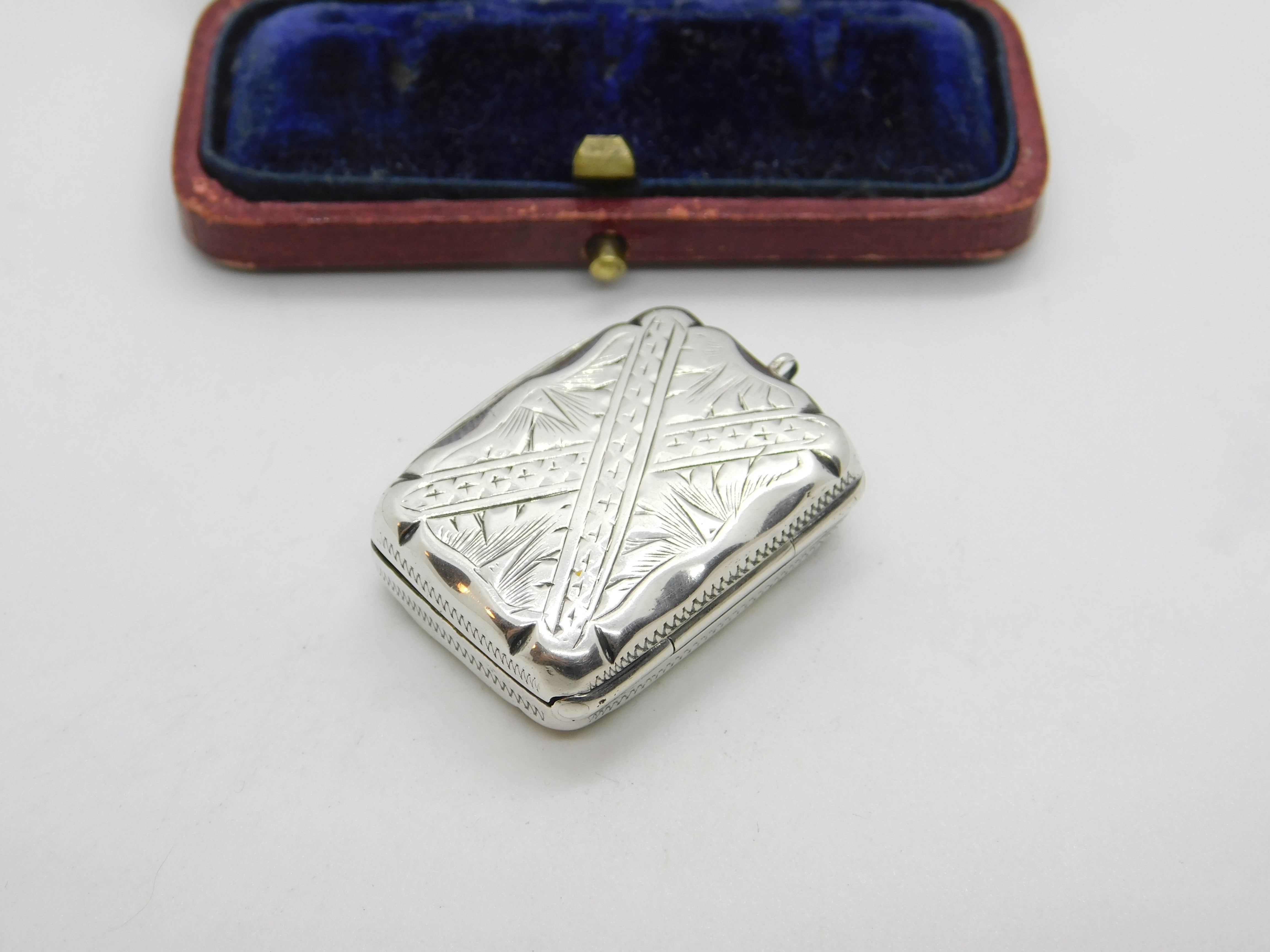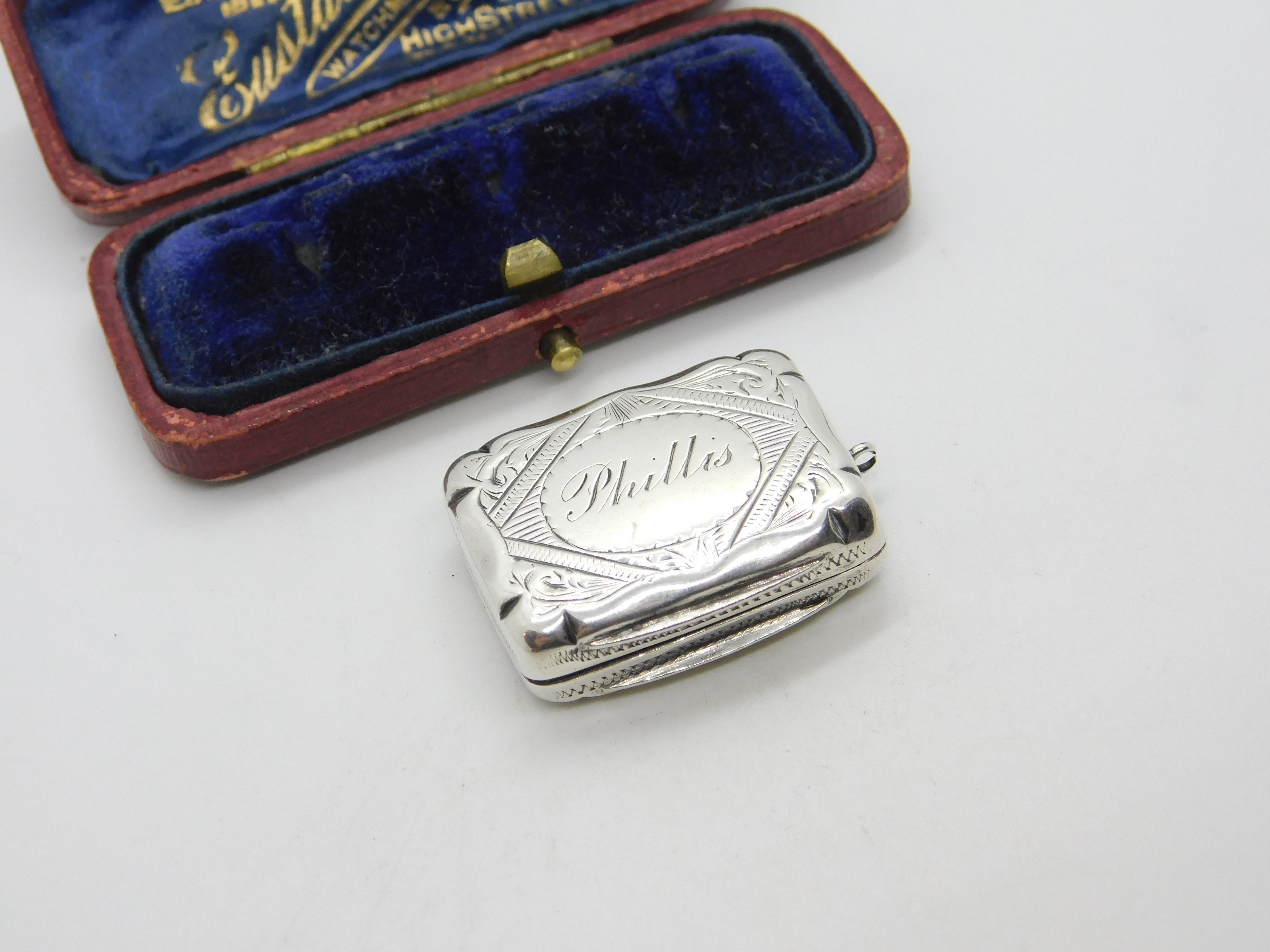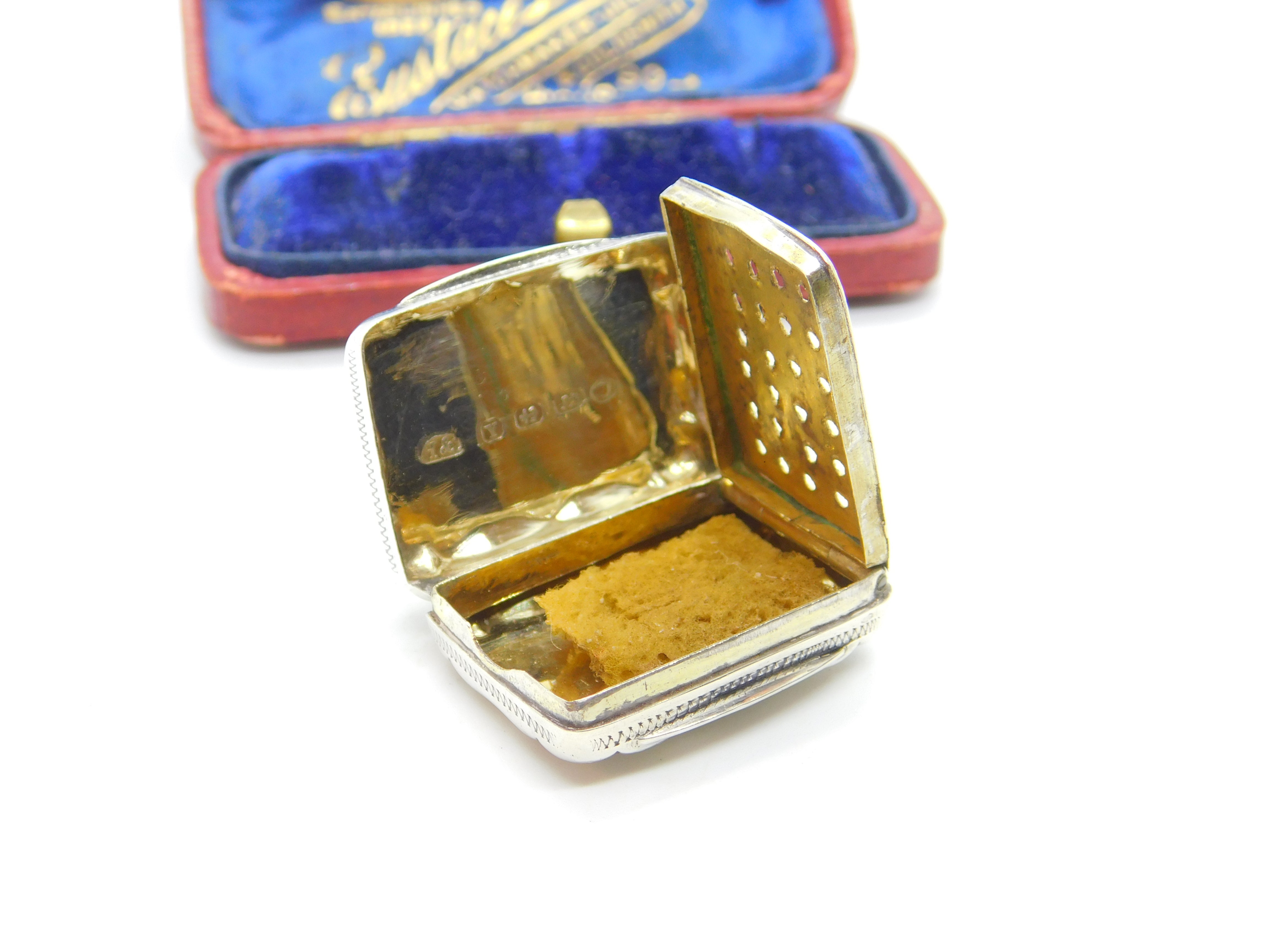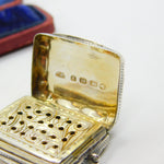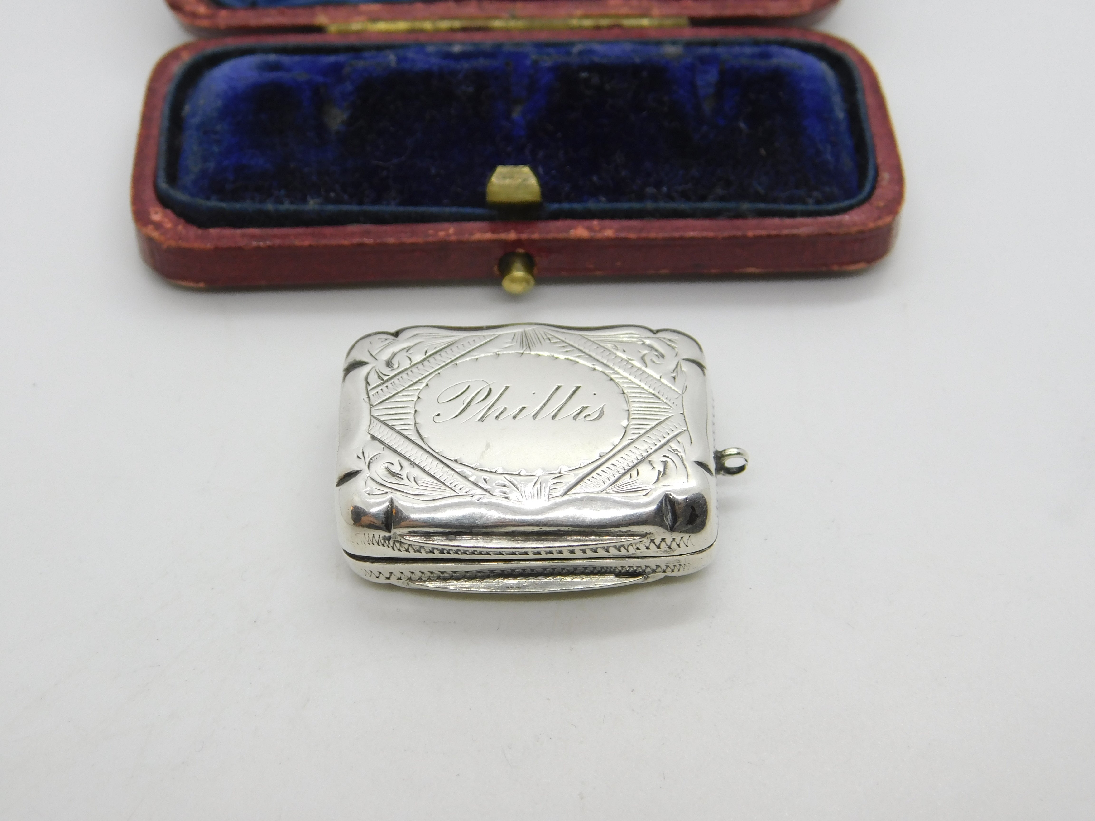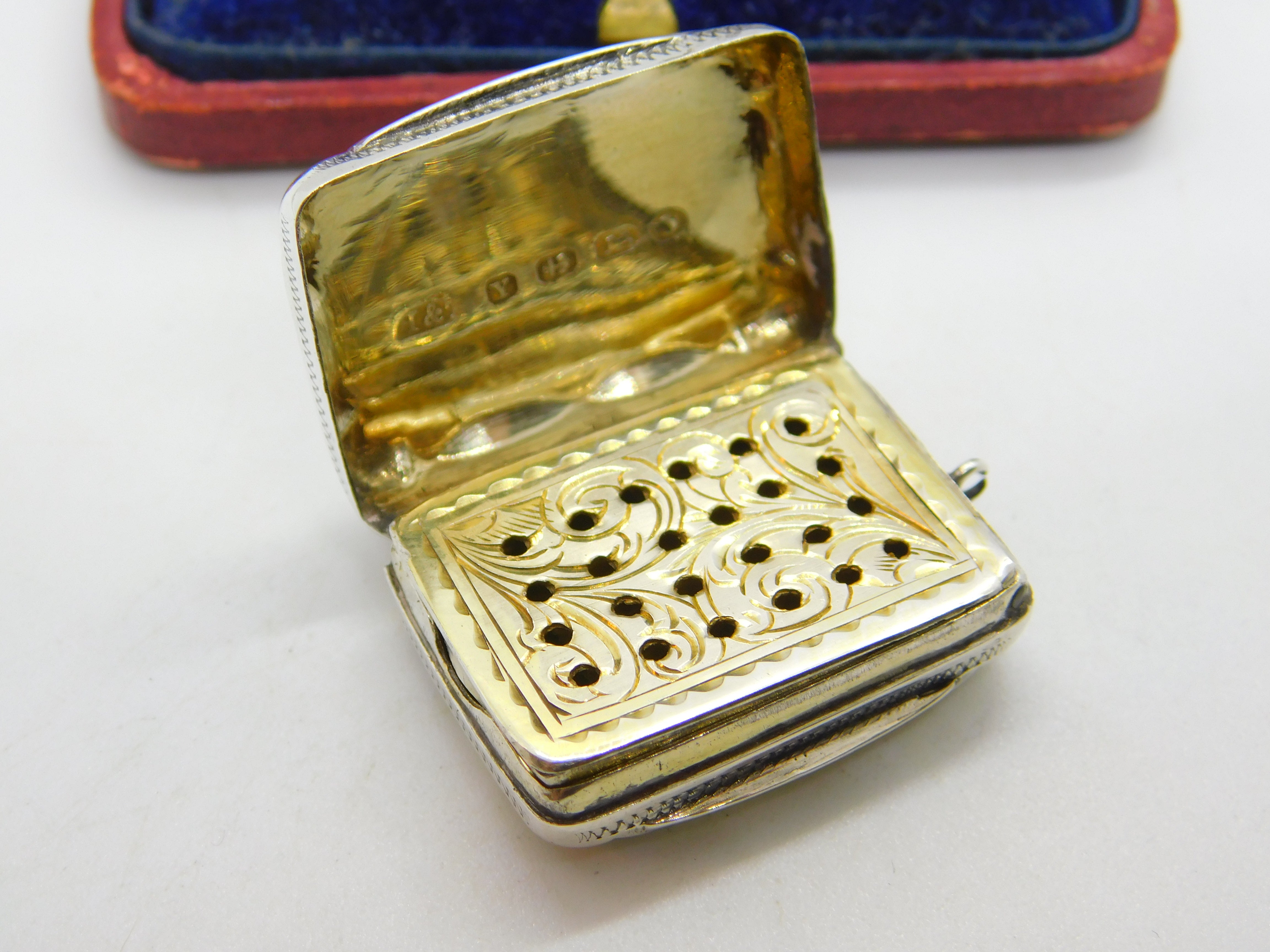 Details: A fantastic and wonderfully designed antique Victorian sterling silver vinaigrette fob with lovely gilded detailing to the interior hallmarked Birmingham 1873 by Hilliard & Thomason. Engraved to the top lid. This is a wonderful item that would make a perfect gift or addition to any collection. The BOX pictured is for PRESENTATION ONLY and is NOT included in the listings but used to frame the pictures unless specifically stated otherwise.