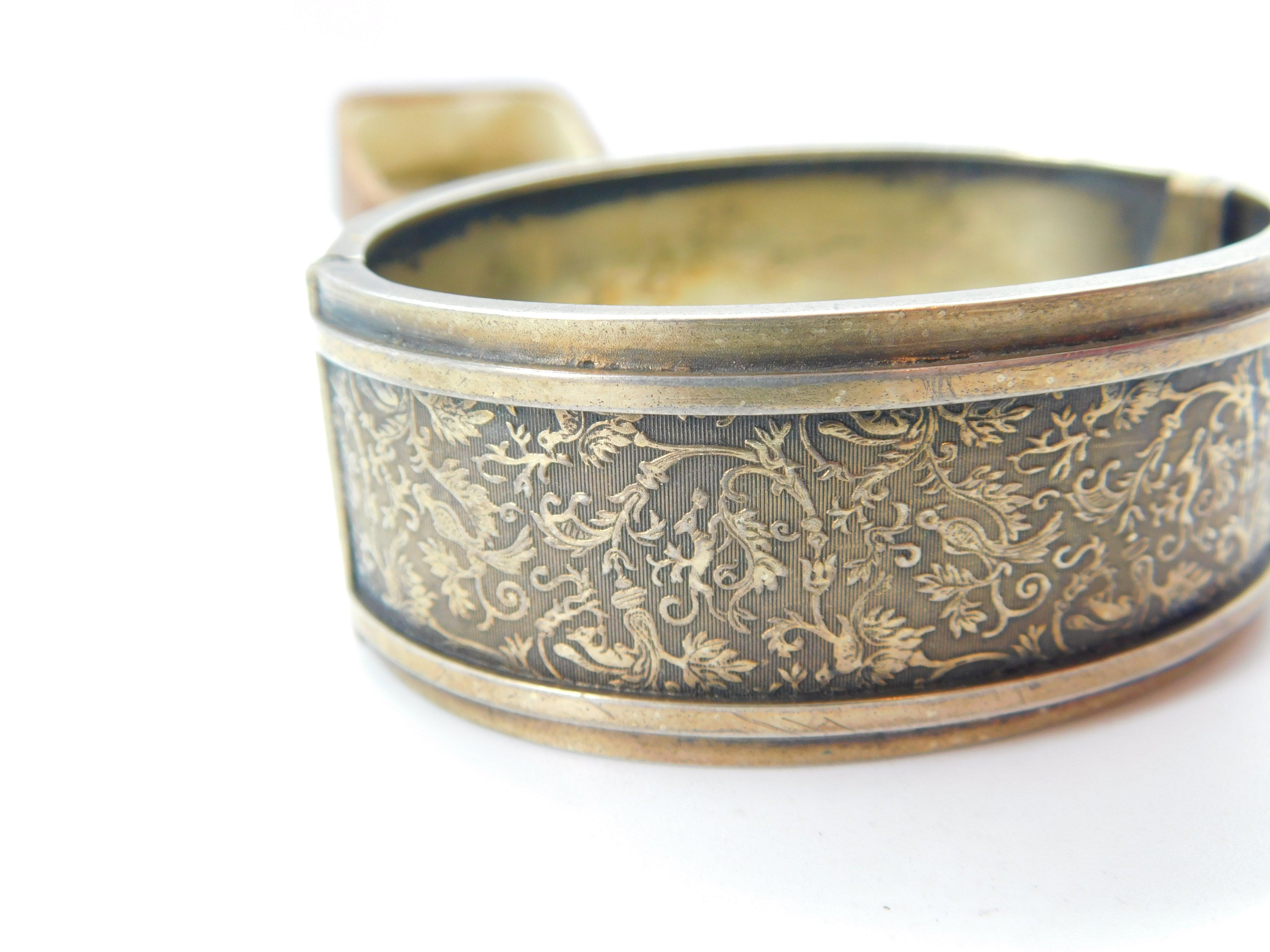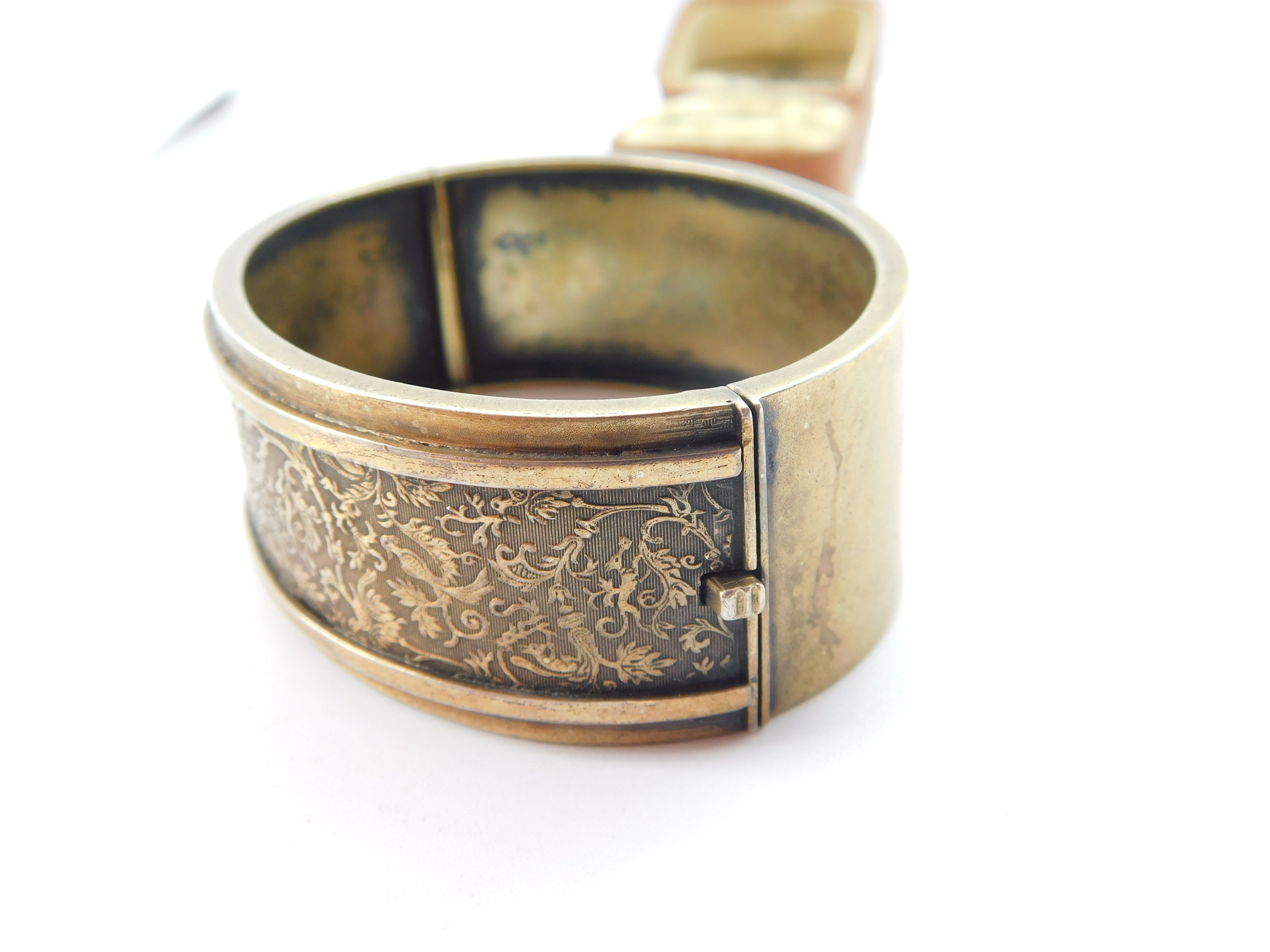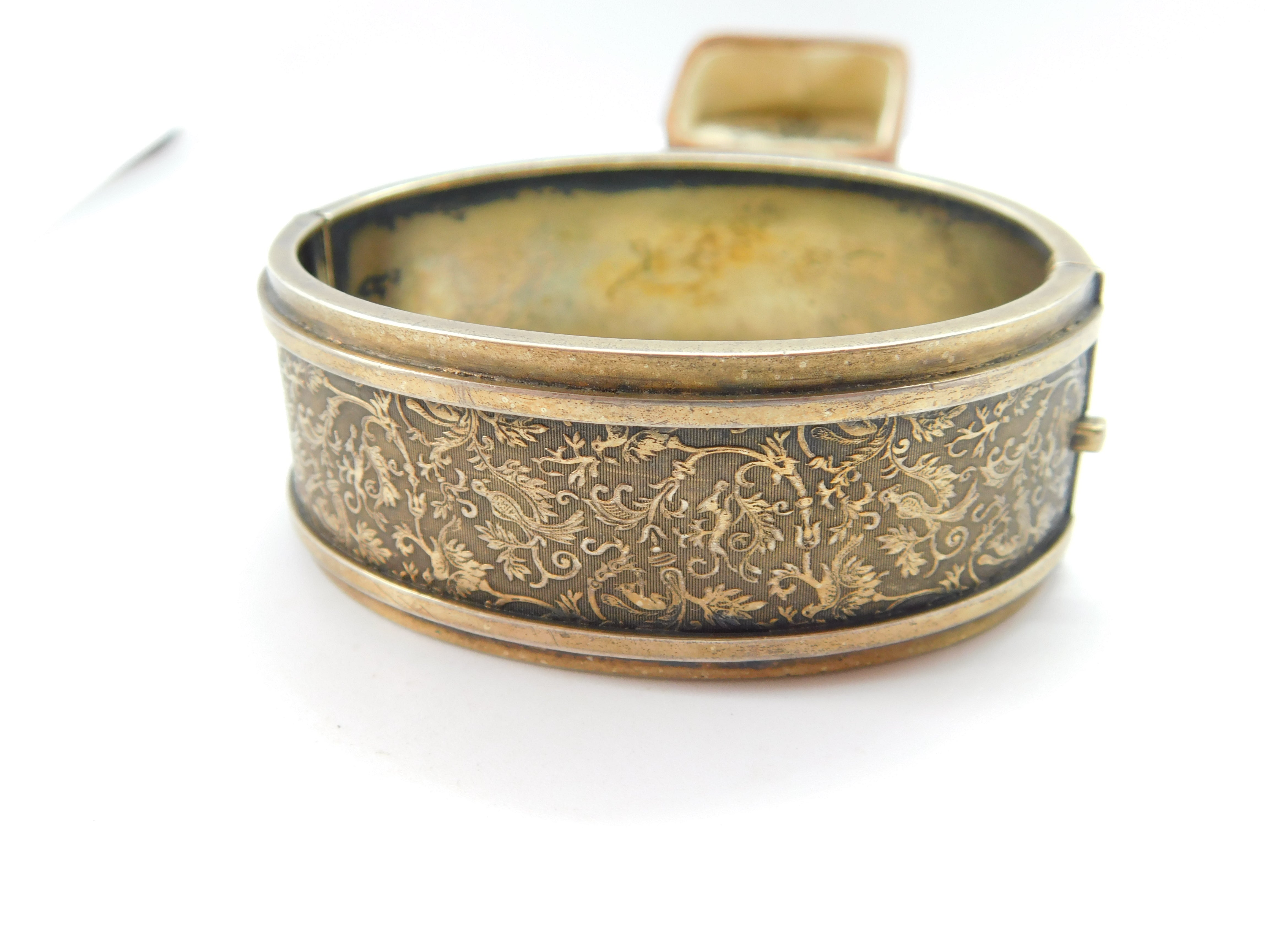Victorian Sterling Silver Gilt Aesthetic Movement Bird Pattern Cuff Bangle c1880