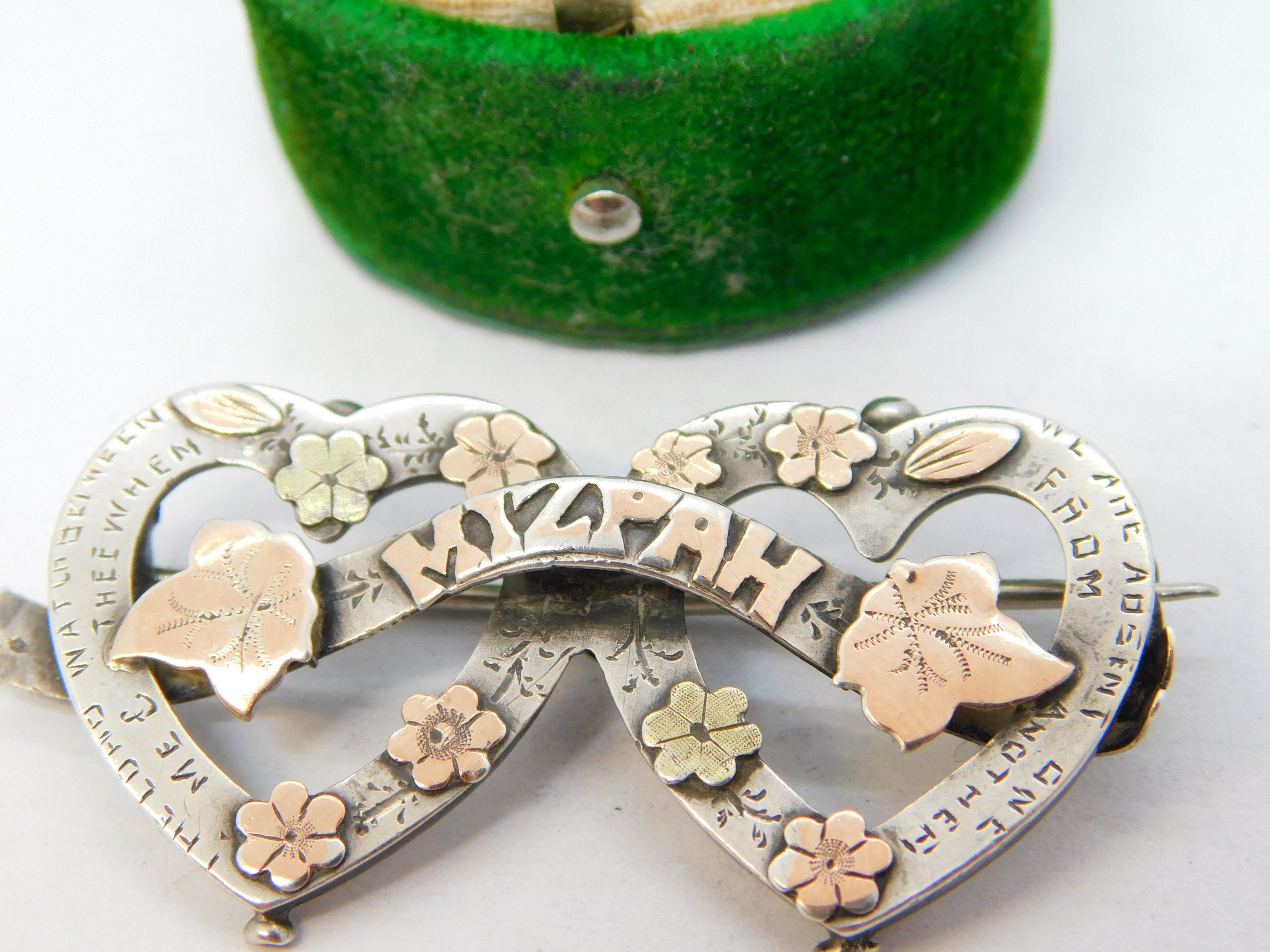 Details: A fantastic and wonderfully designed antique Victorian sterling silver & two-tone gold Mizpah sweetheart brooch hallmarked Birmingham 1898 to the reverse. This is a wonderful item that would make a perfect gift or addition to any collection. The BOX pictured is for PRESENTATION ONLY and is NOT included in the listings but used to frame the pictures unless specifically stated otherwise.