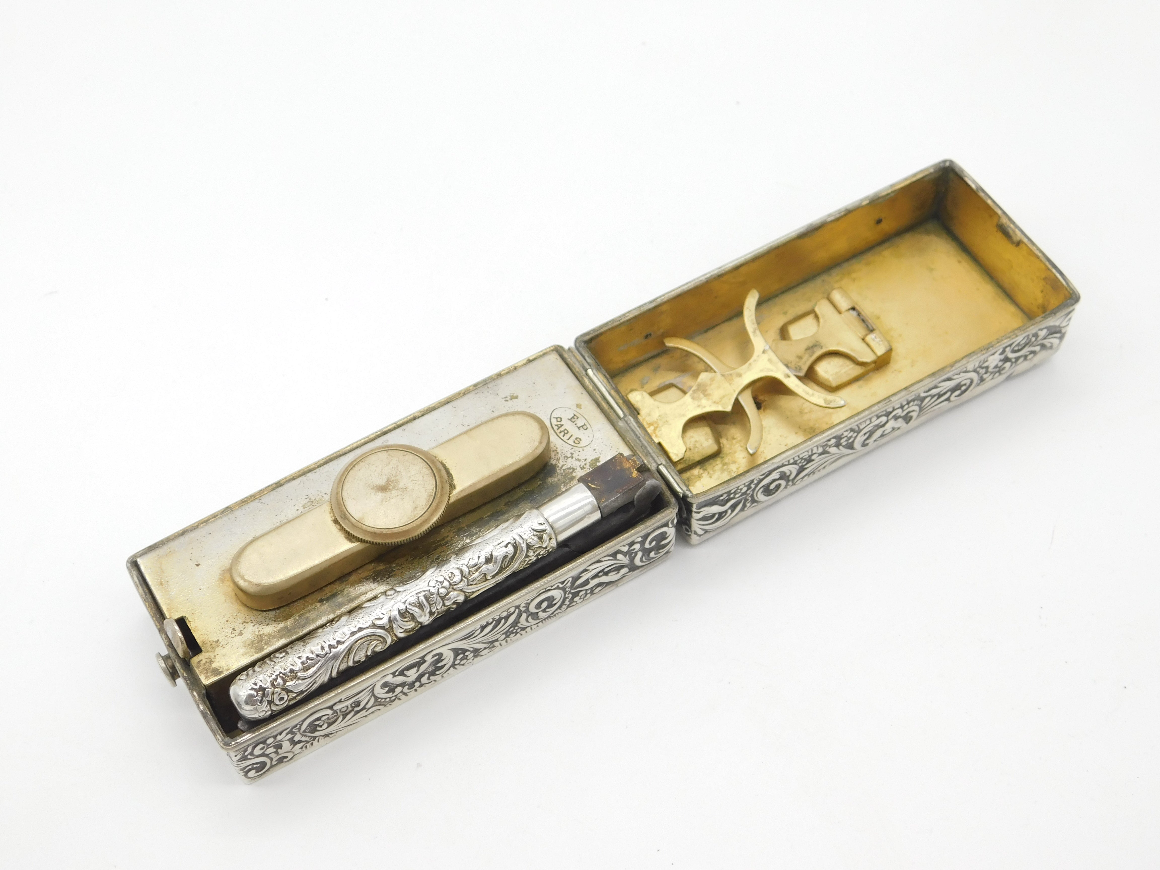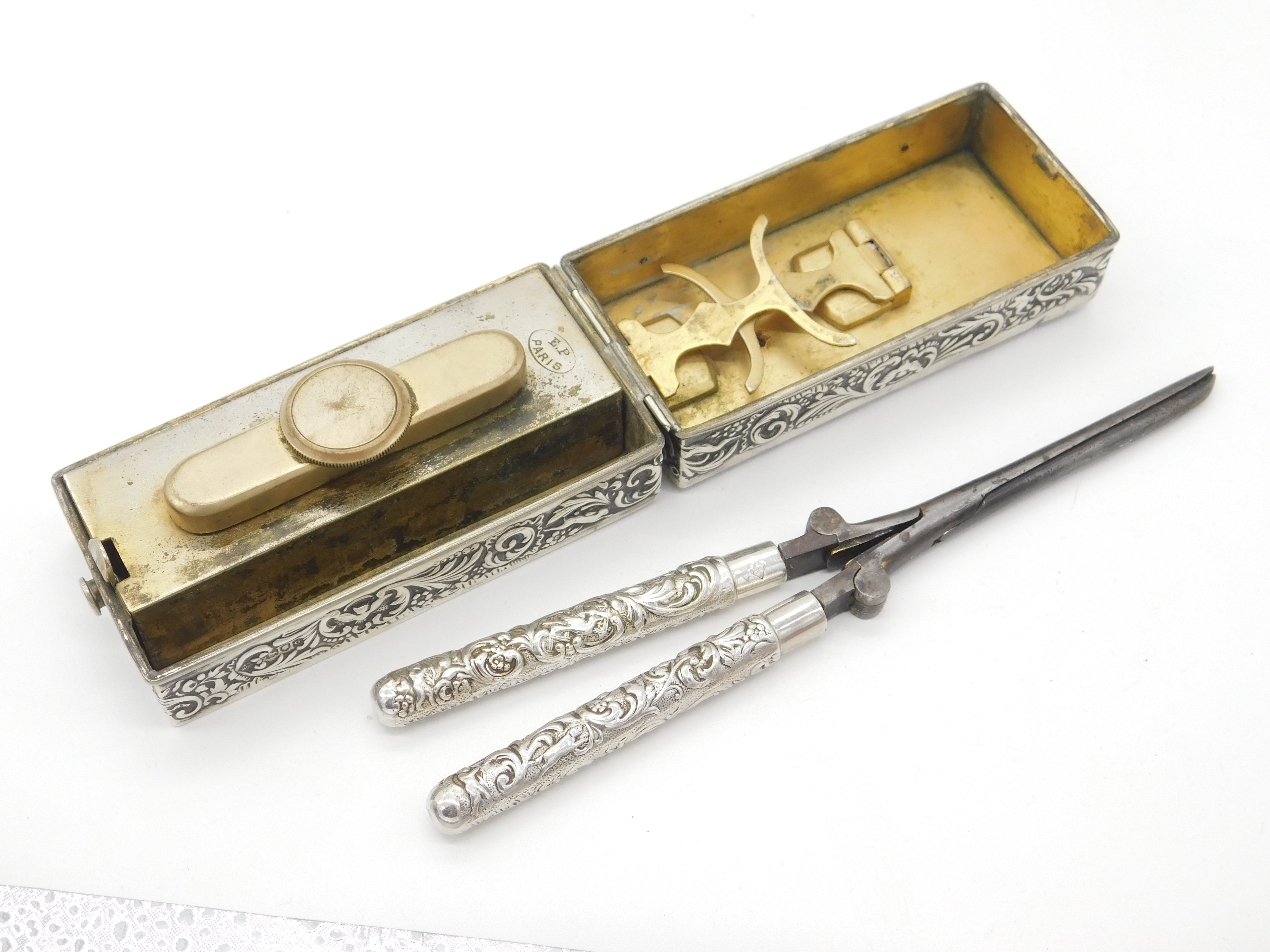 Details: A fantastic and wonderfully designed antique Victorian sterling silver Mappin Bros. repousse work hair curling set with stunning design hallmarked to the edge London 1899. The tools are fairly worn but still usable. This is a wonderful item that would make a perfect gift or addition to any collection. The BOX pictured is for PRESENTATION ONLY and is NOT included in the listings but used to frame the pictures unless specifically stated otherwise.
