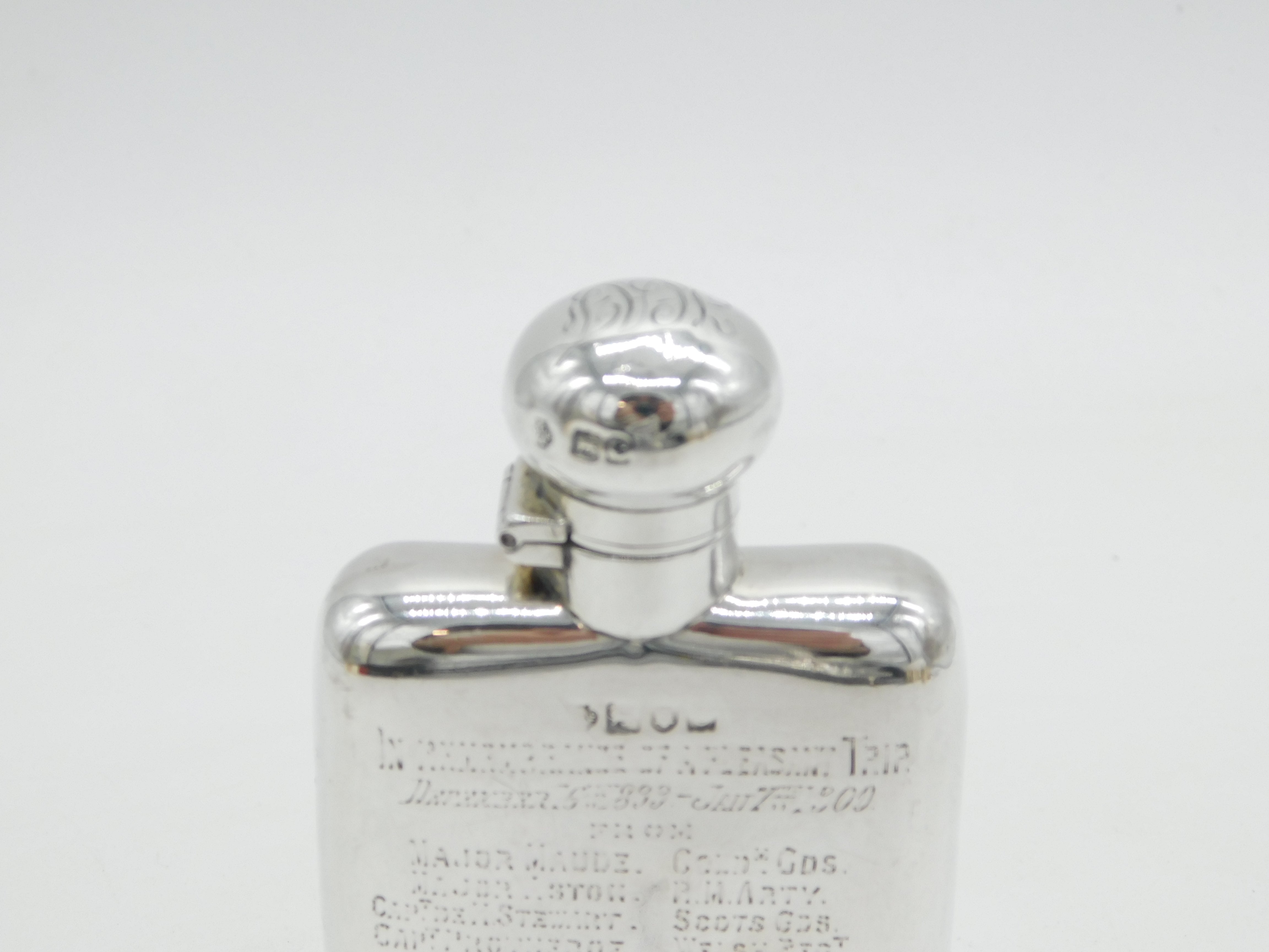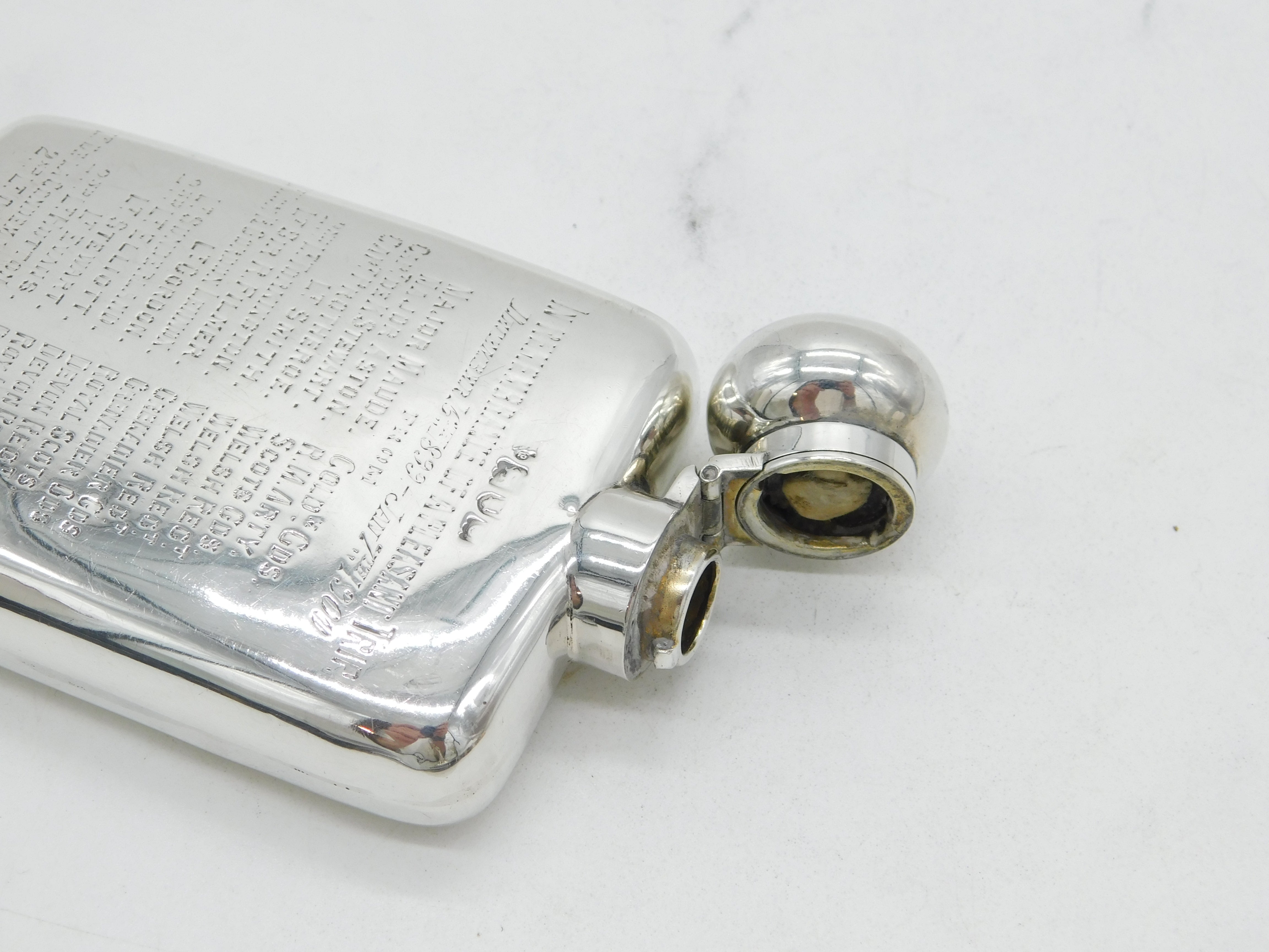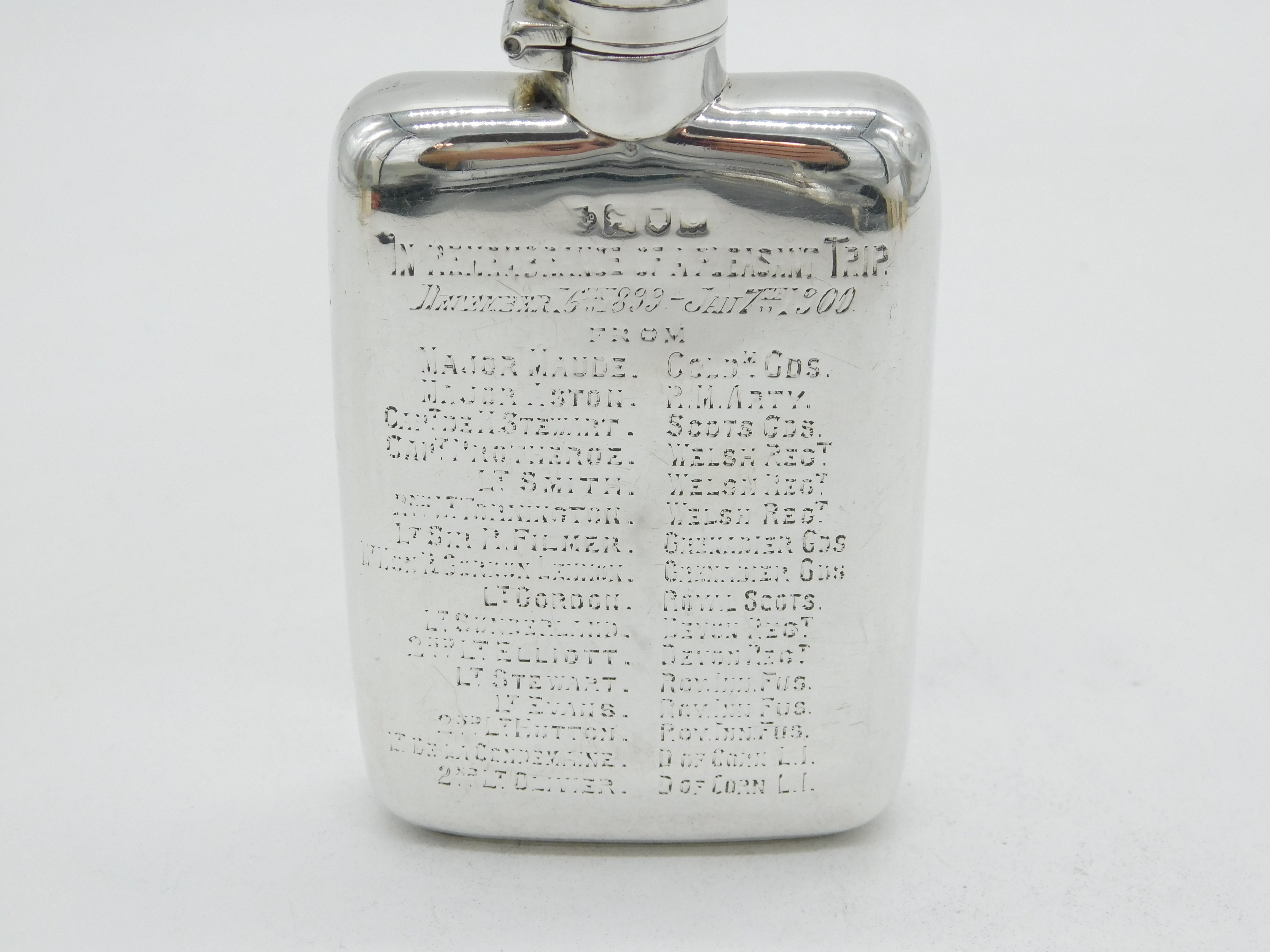 Details: A fantastic and wonderfully designed antique Victorian sterling silver hip flask engraved with the names and regiments of multiple military figures 'In Remembrance of a Pleasant Trip', believed to be a Boer War flask, hallmarked London 1898 to the edge. This is a wonderful item that would make a perfect gift or addition to any collection.