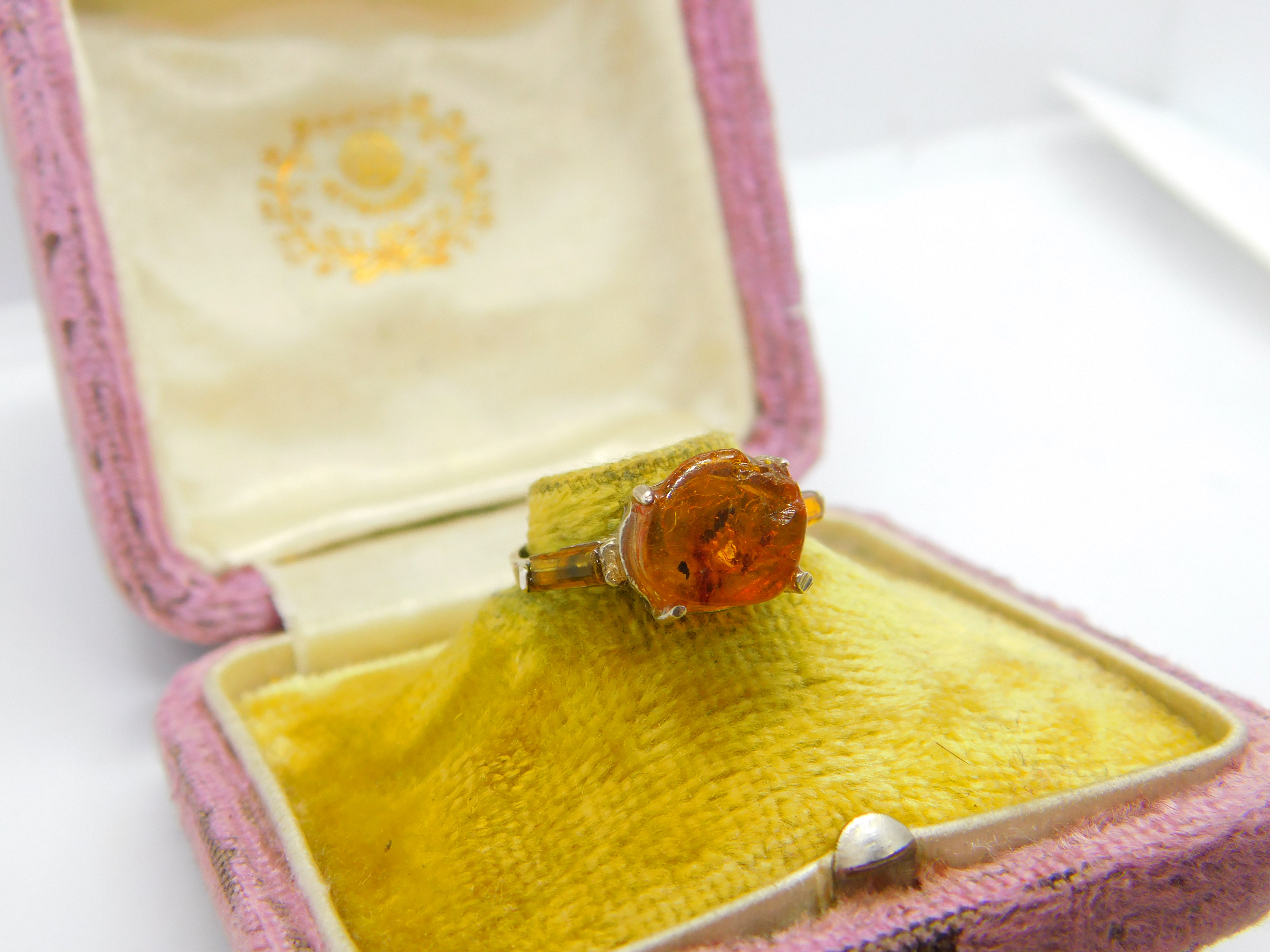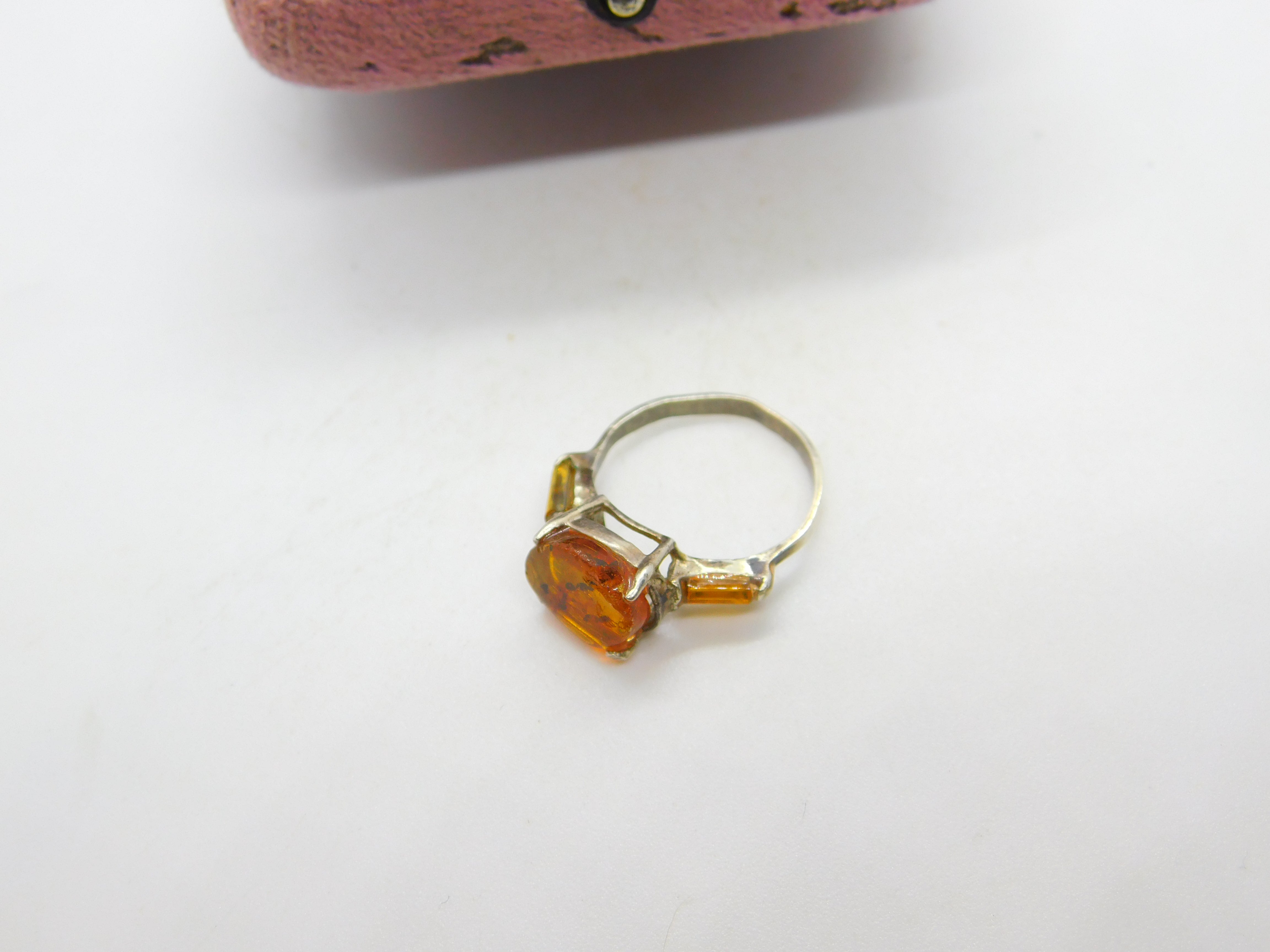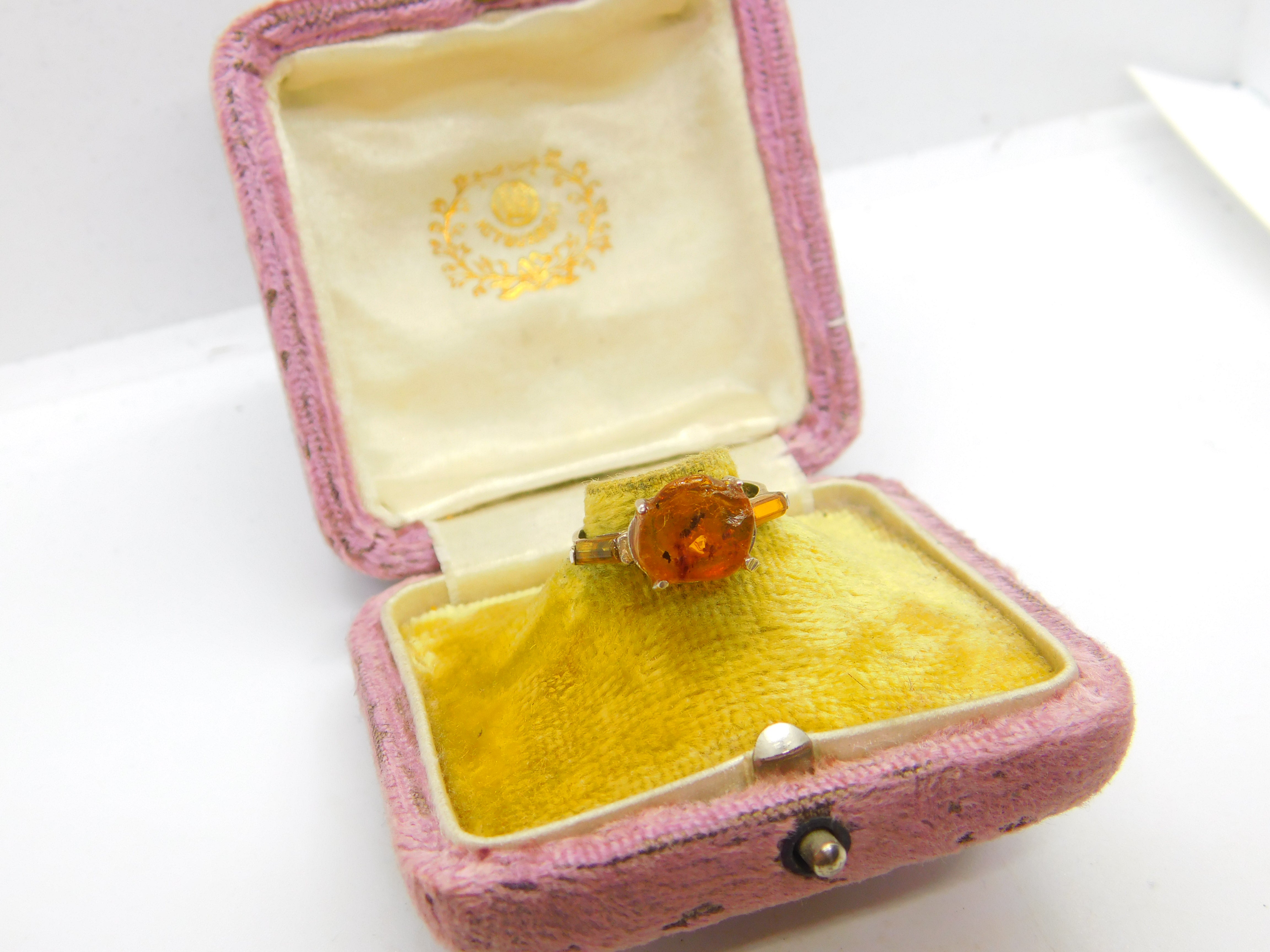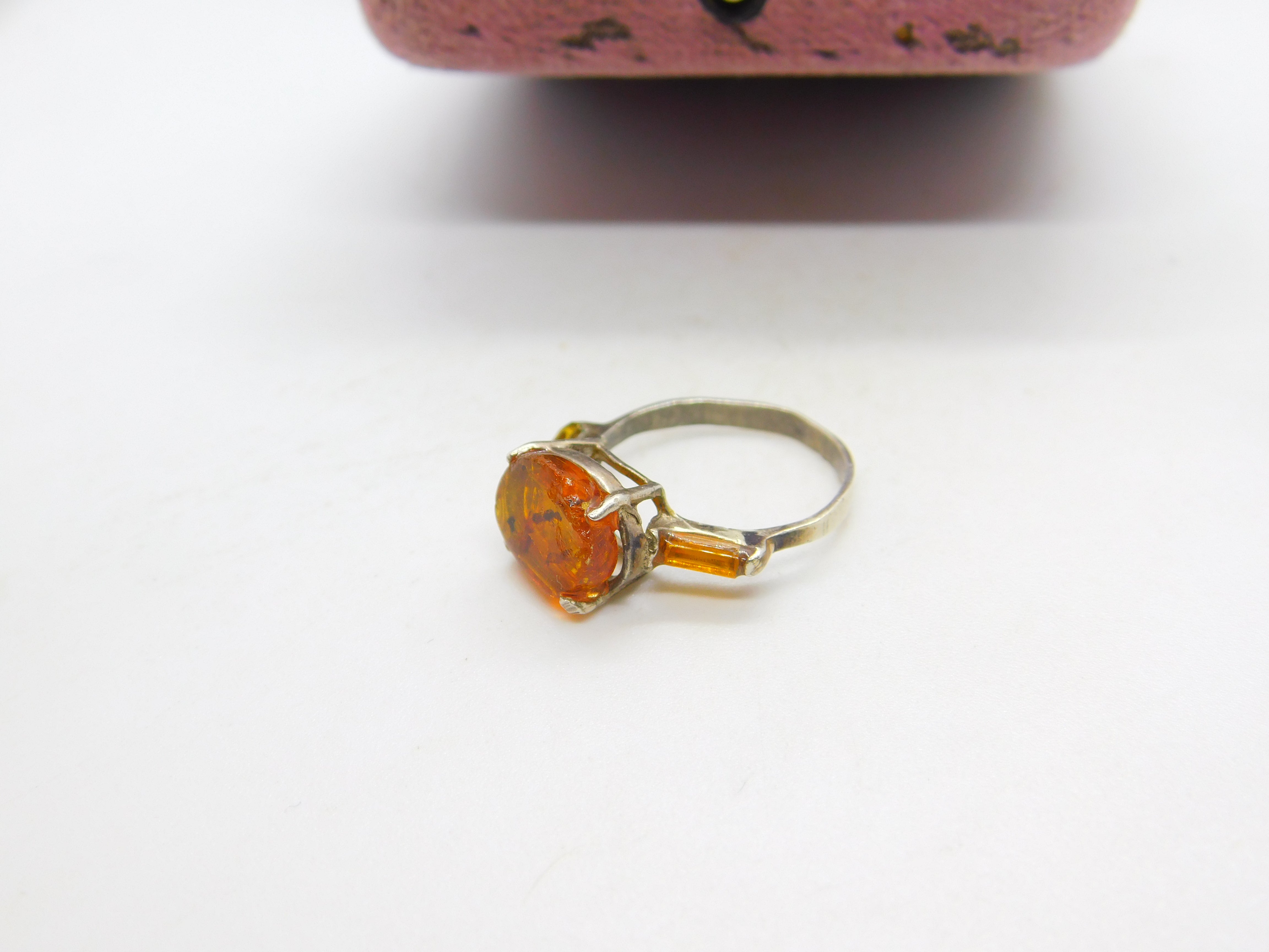 Details: A fantastic and wonderfully designed antique Victorian sterling silver ring set with superb natural amber with little bugs fossilised inside c1860. Very unique baguette set aber to the shoulders. Slightly bent band but a lovely example we have never come across one before. This is a wonderful item that would make a perfect gift or addition to any collection. The BOX pictured is for PRESENTATION ONLY and is NOT included in the listings but used to frame the pictures unless specifically stated otherwise.