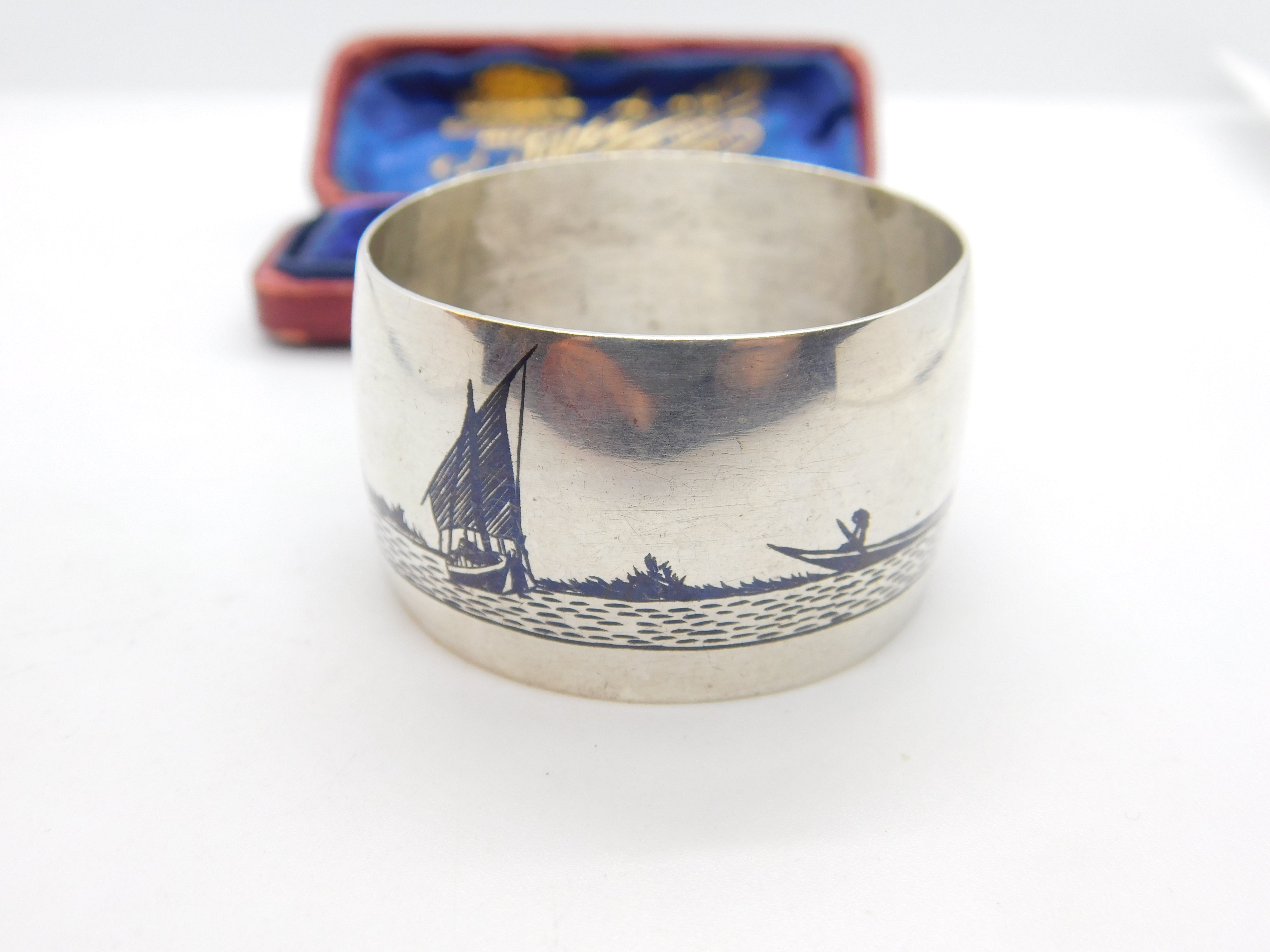Details: A fantastic and wonderfully designed antique Victorian sterling silver & niello enamel napkin ring depicting a scene on the nile with lovely design c1890. The silver has been XRF tested. This is a wonderful item that would make a perfect gift or addition to any collection. The BOX pictured is for PRESENTATION ONLY and is NOT included in the listings but used to frame the pictures unless specifically stated otherwise.