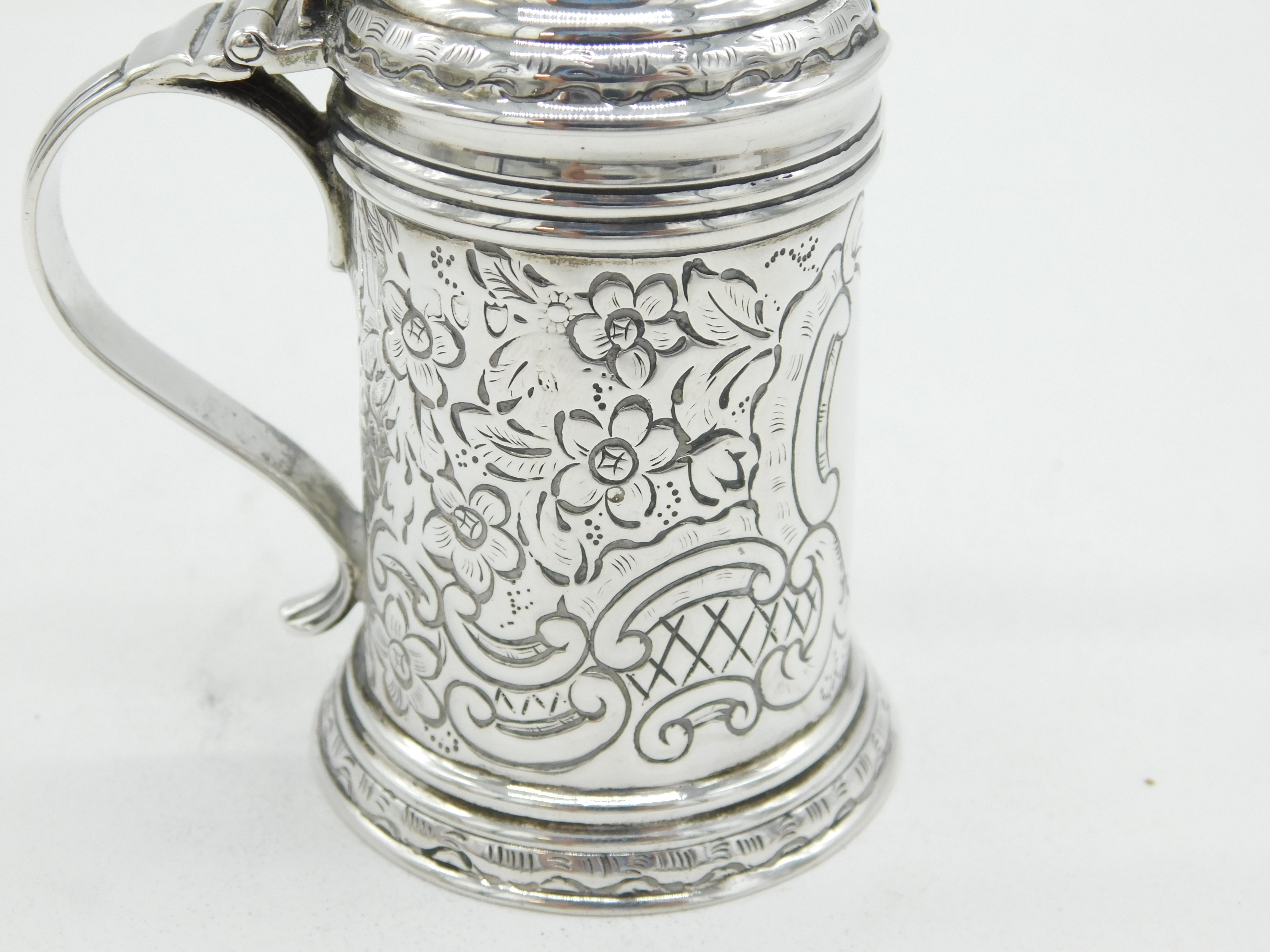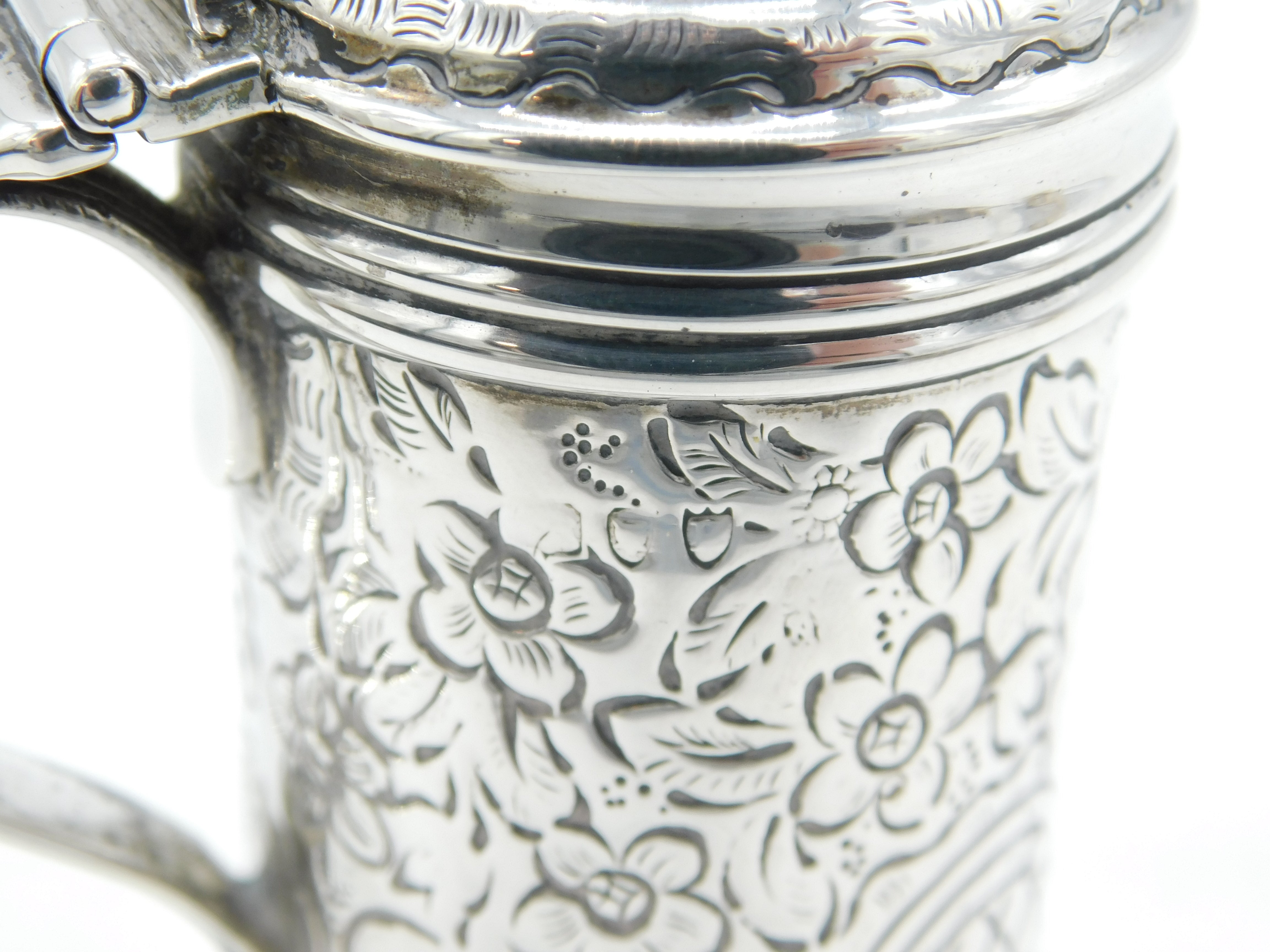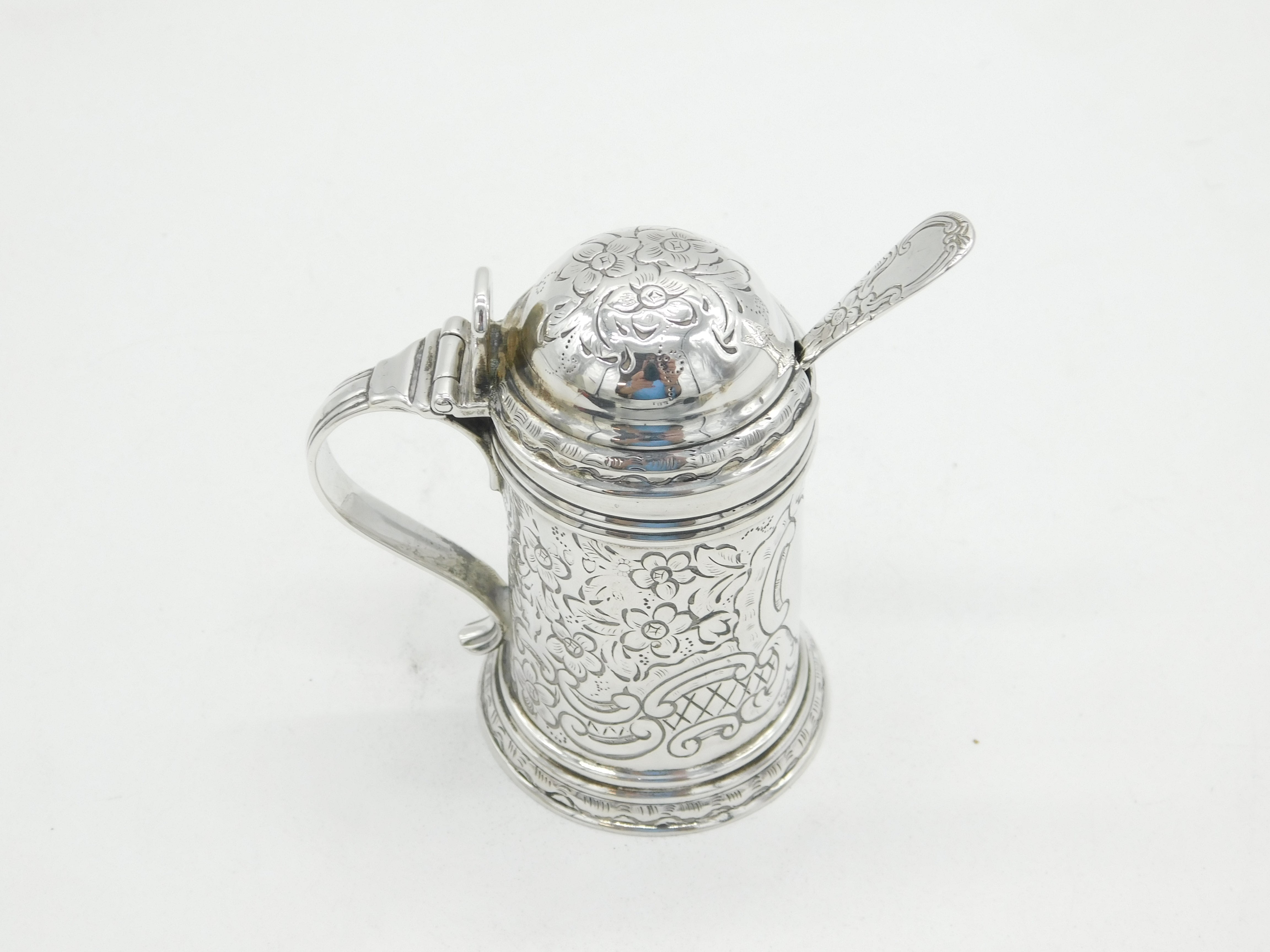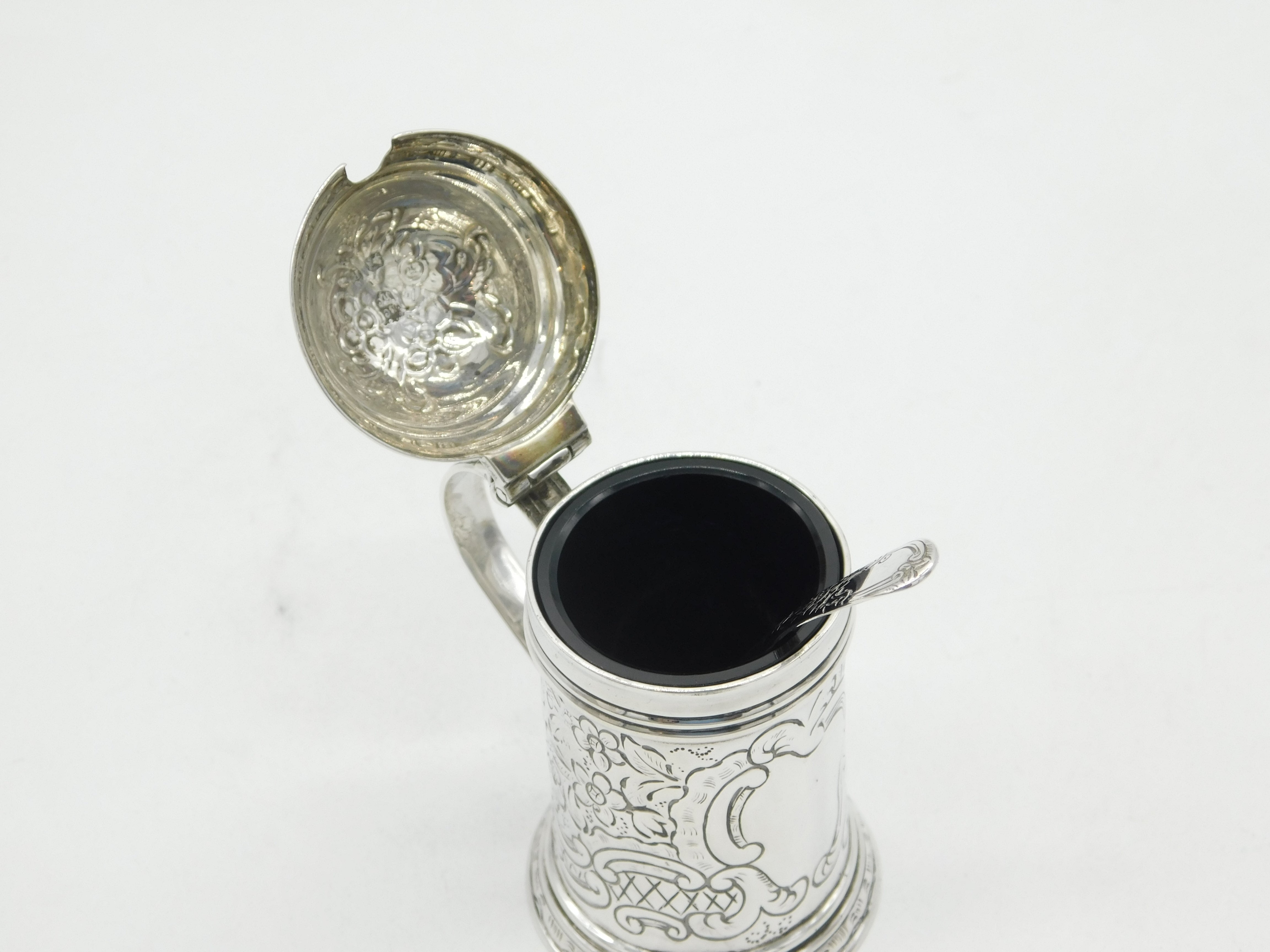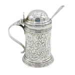 Details: A fantastic and wonderfully designed antique Victorian sterling silver floral pattern novelty lidded stein tankard mustard pot with blue glass liner and matched spoon hallmarked London 1890 by Child & Child. This is a wonderful item that would make a perfect gift or addition to any collection.
