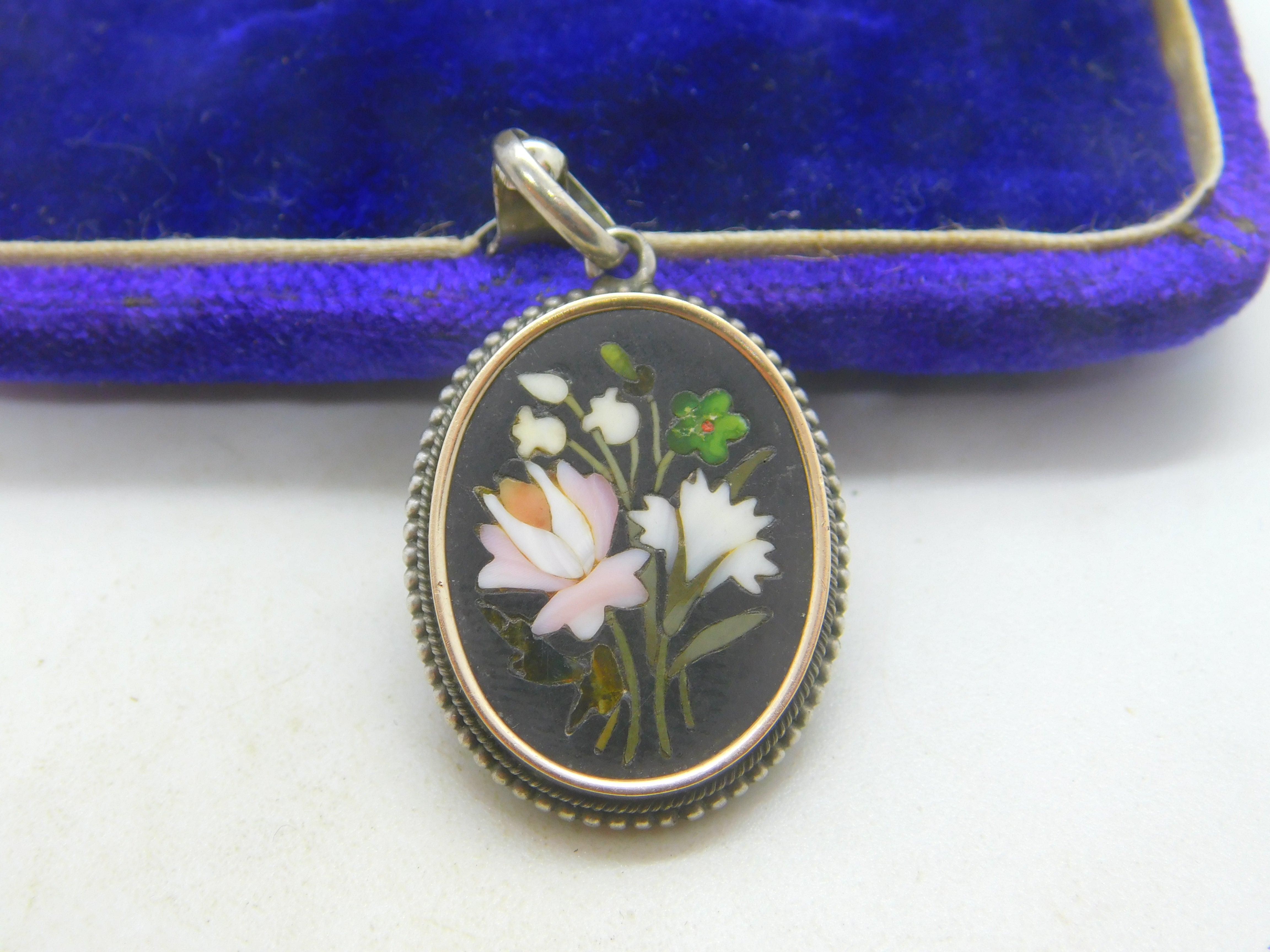 Details: A fantastic and wonderfully designed antique Victorian sterling silver mounted pietra dura mosaic colourful floral drop pendant c1860, the silver has been XRF tested as it is unmarked. This is a wonderful item that would make a perfect gift or addition to any collection. The BOX pictured is for PRESENTATION ONLY and is NOT included in the listings but used to frame the pictures unless specifically stated otherwise.