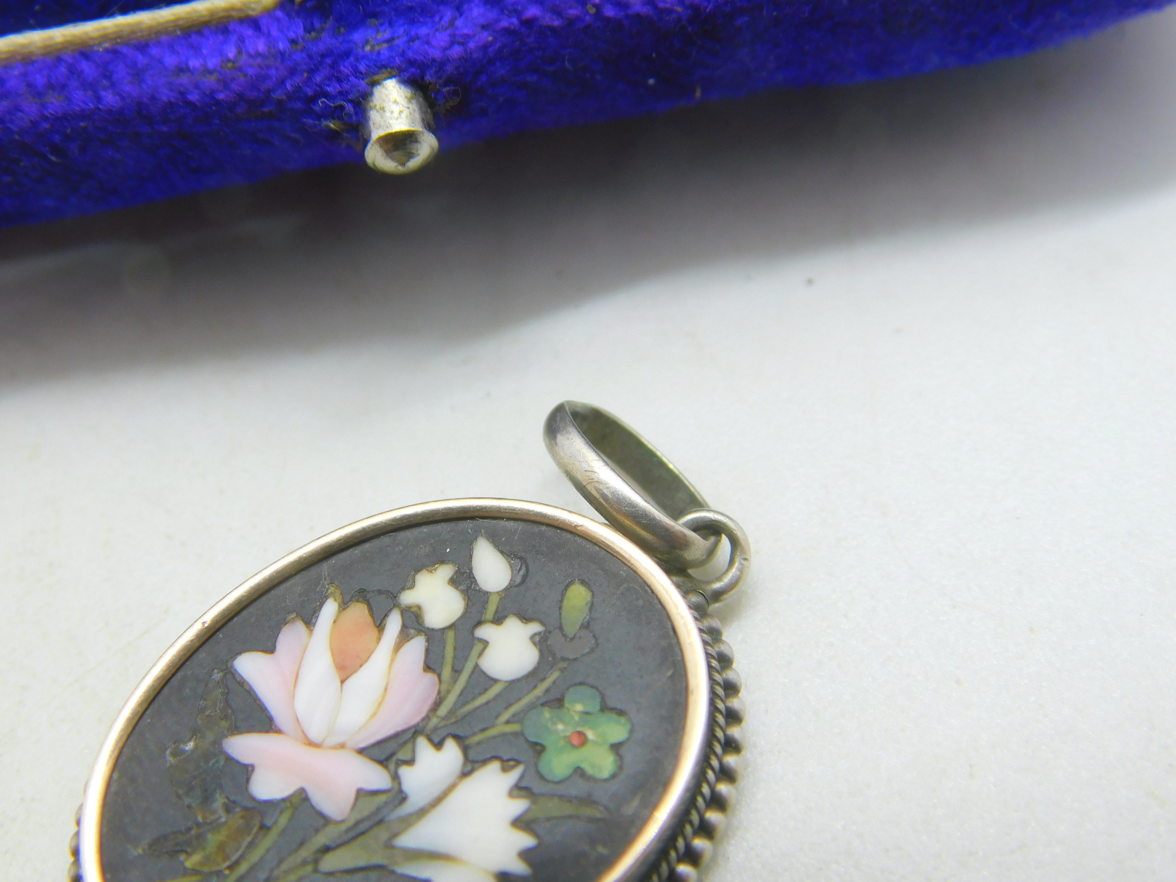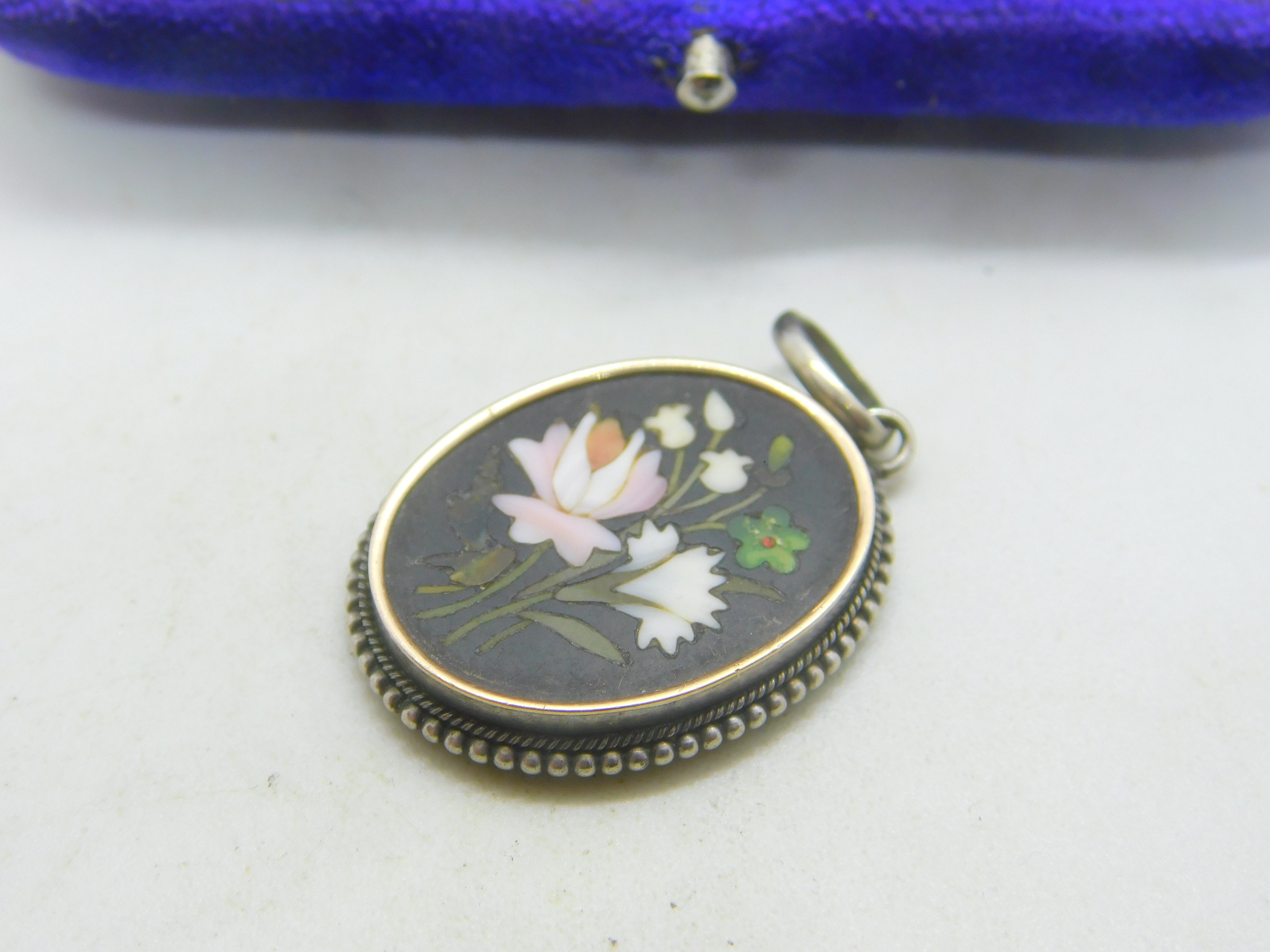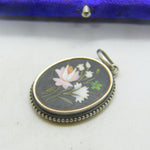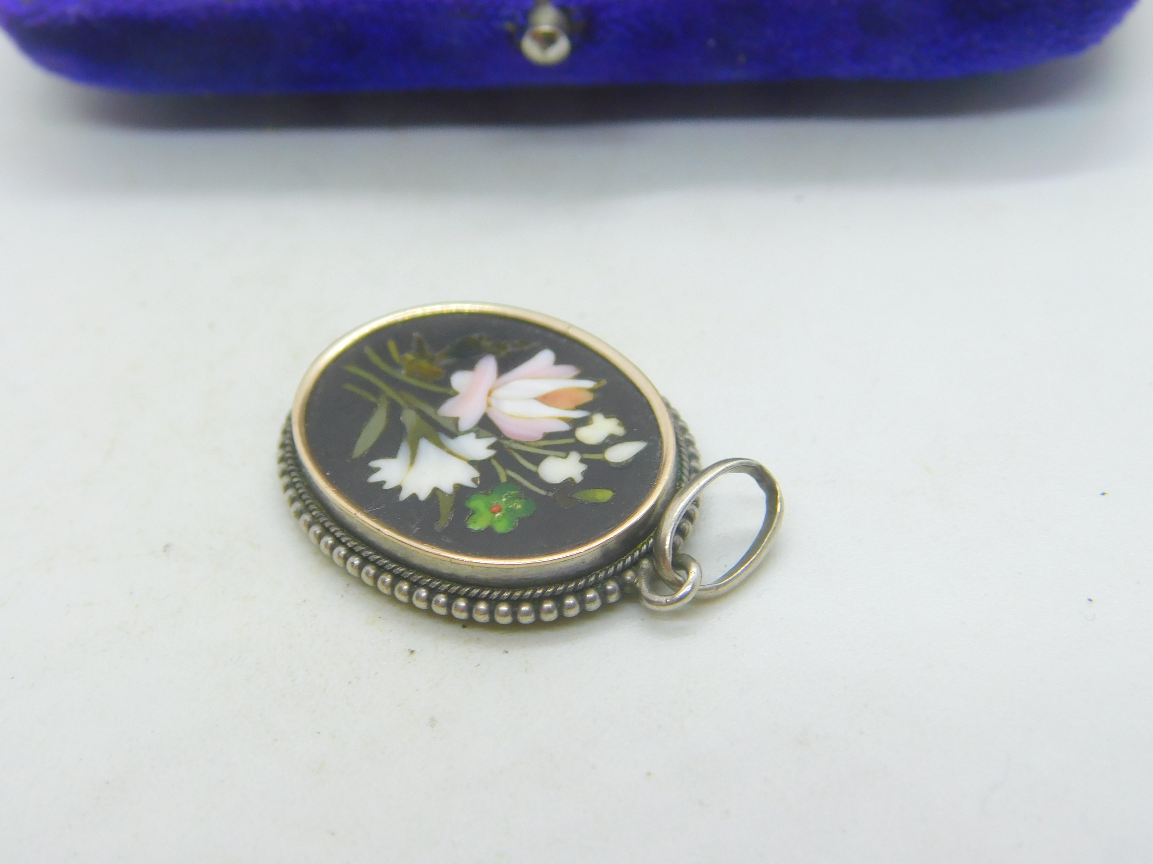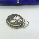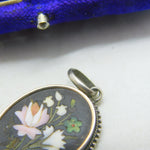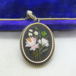 Victorian Sterling Silver Pietra Dura Mosaic Floral Drop Pendant Antique c1860