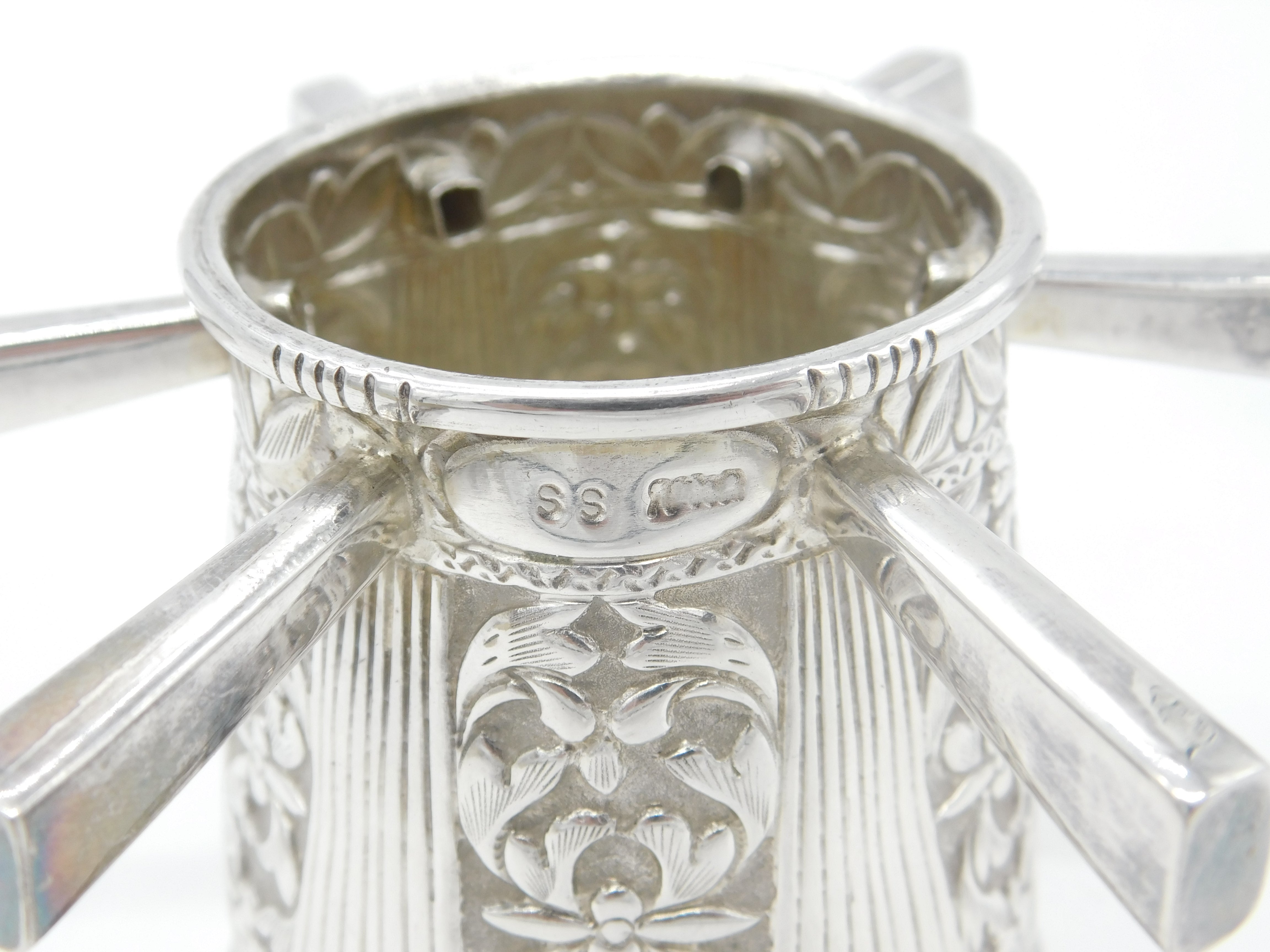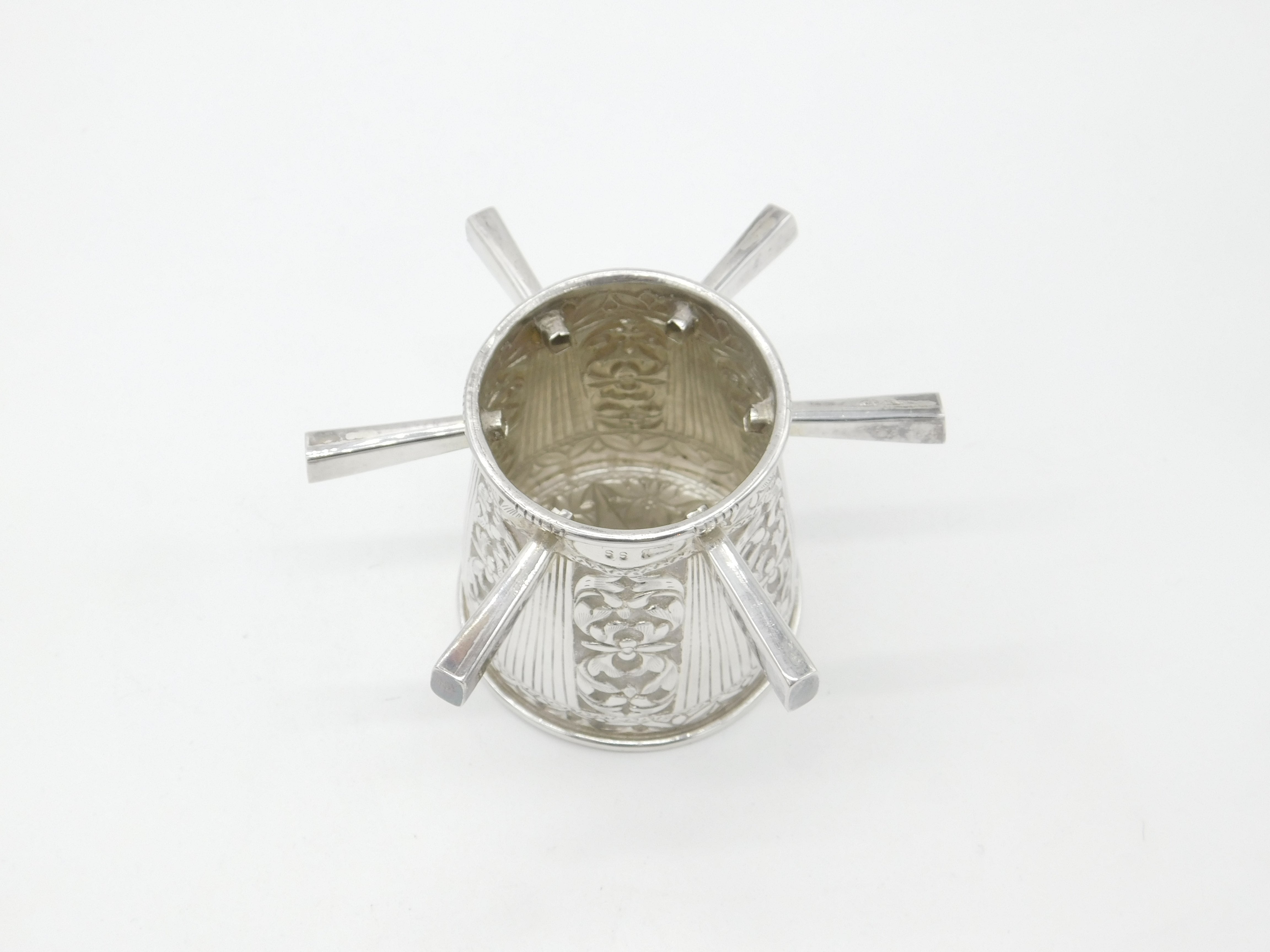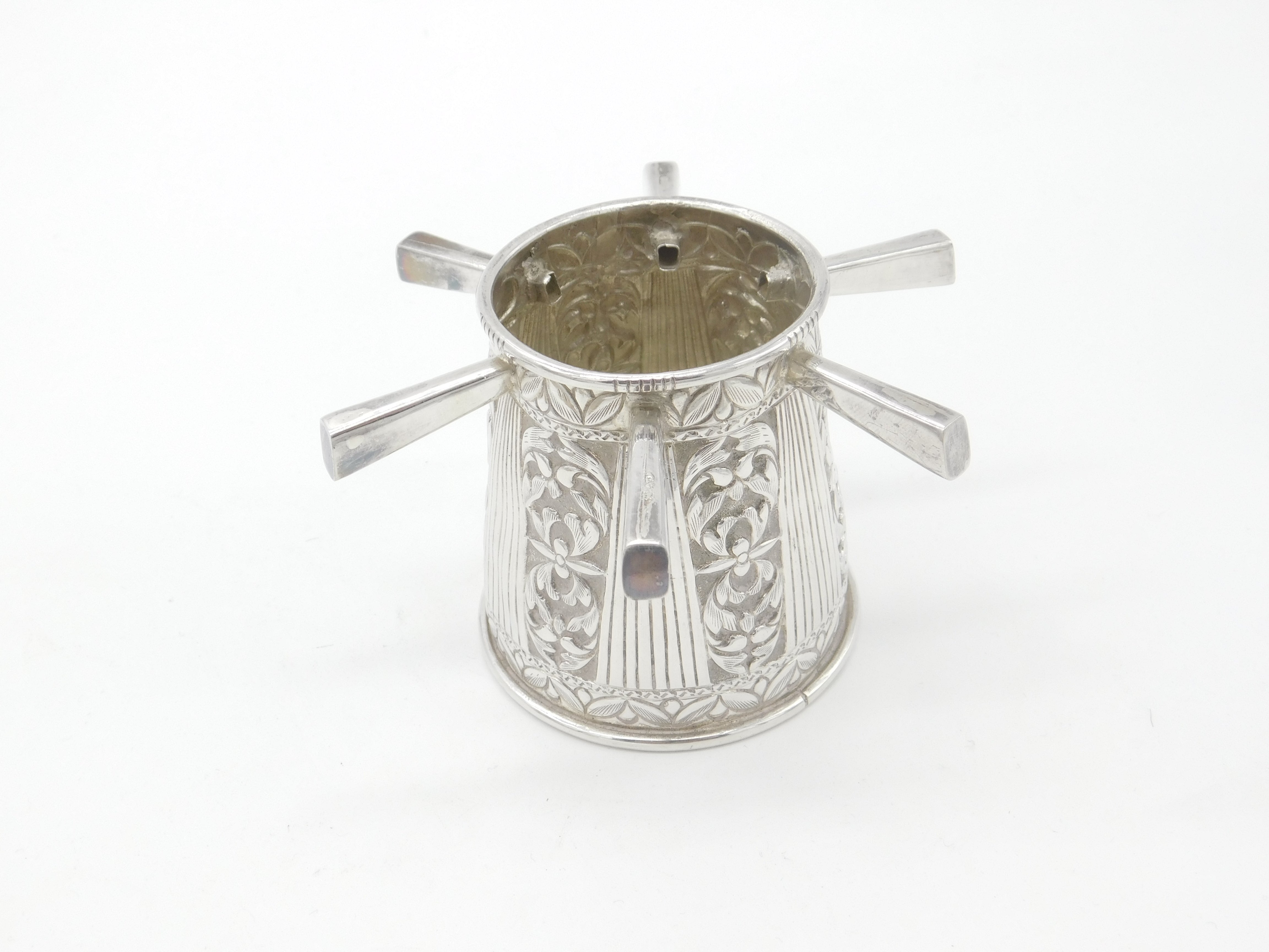 Victorian Sterling Silver Puzzle Mug Floral Pattern Six Handles Antique c1900