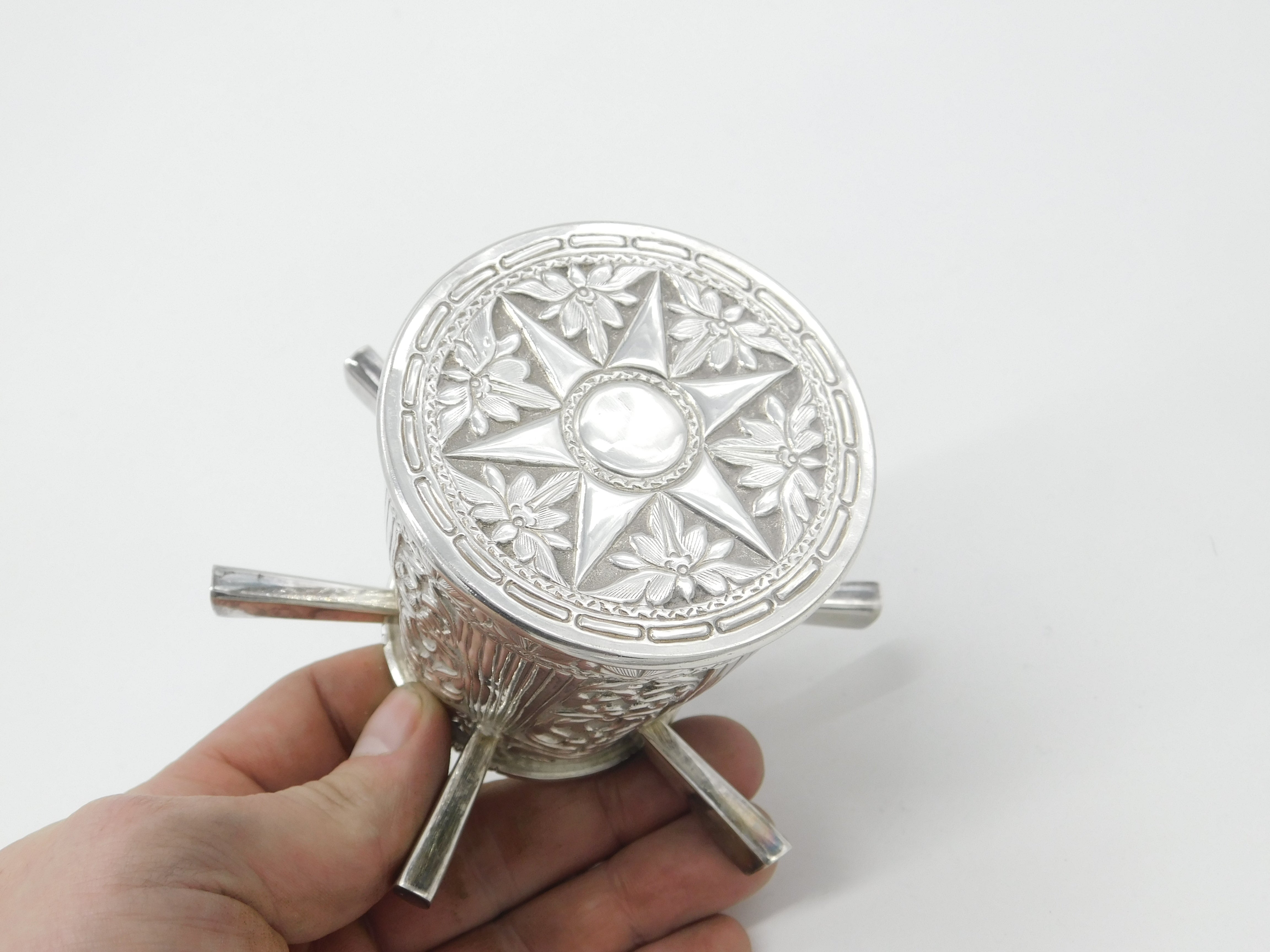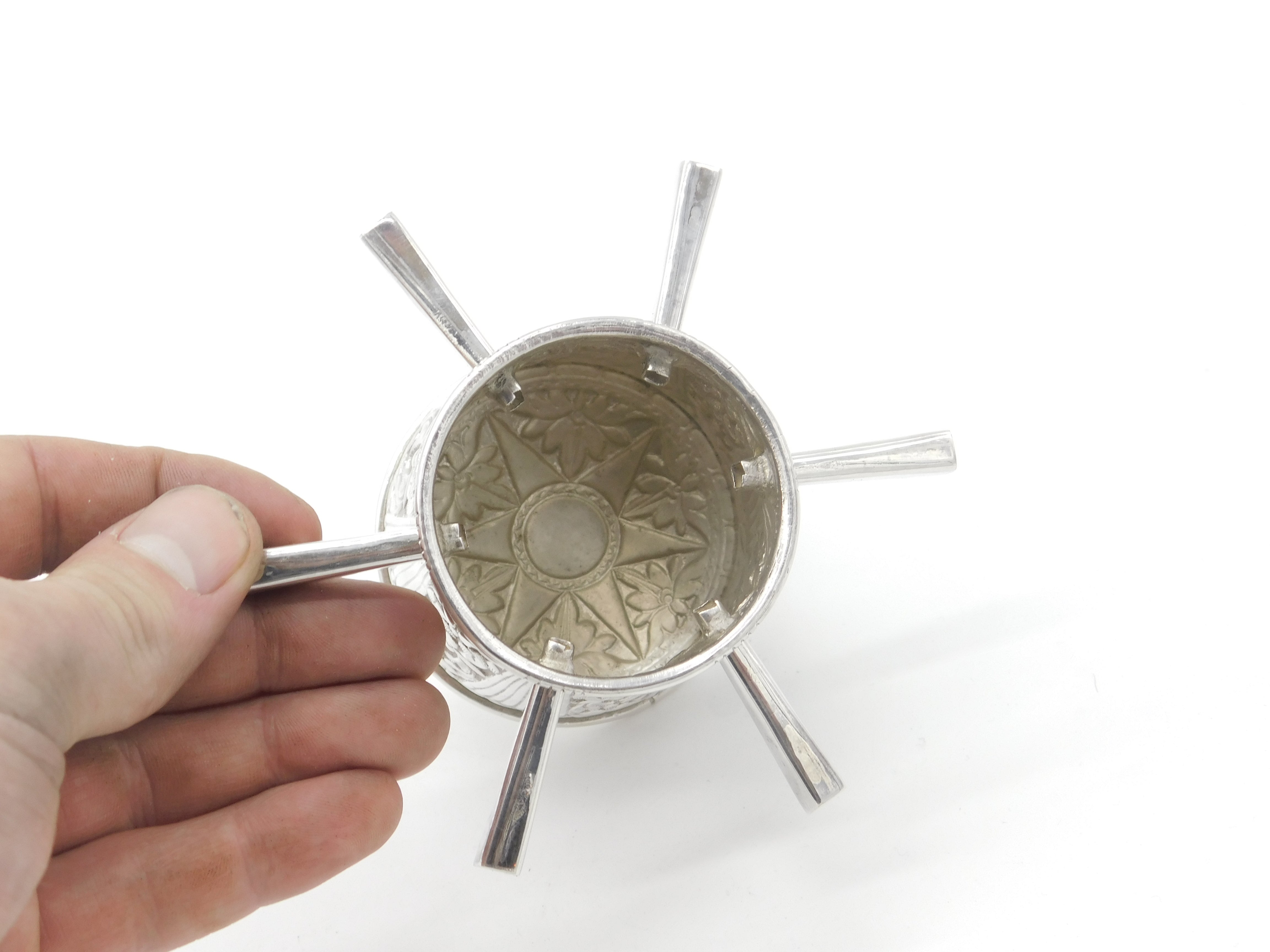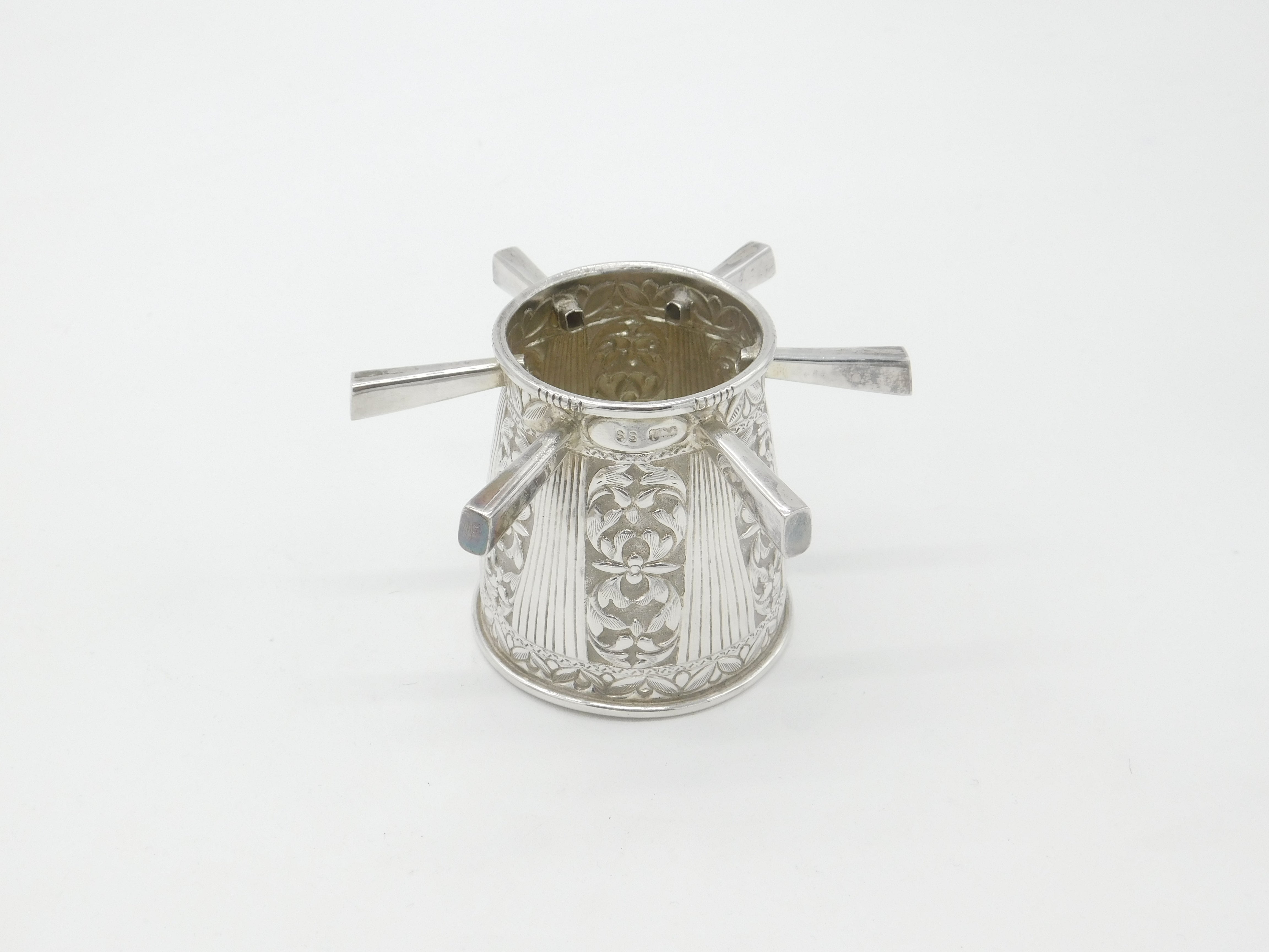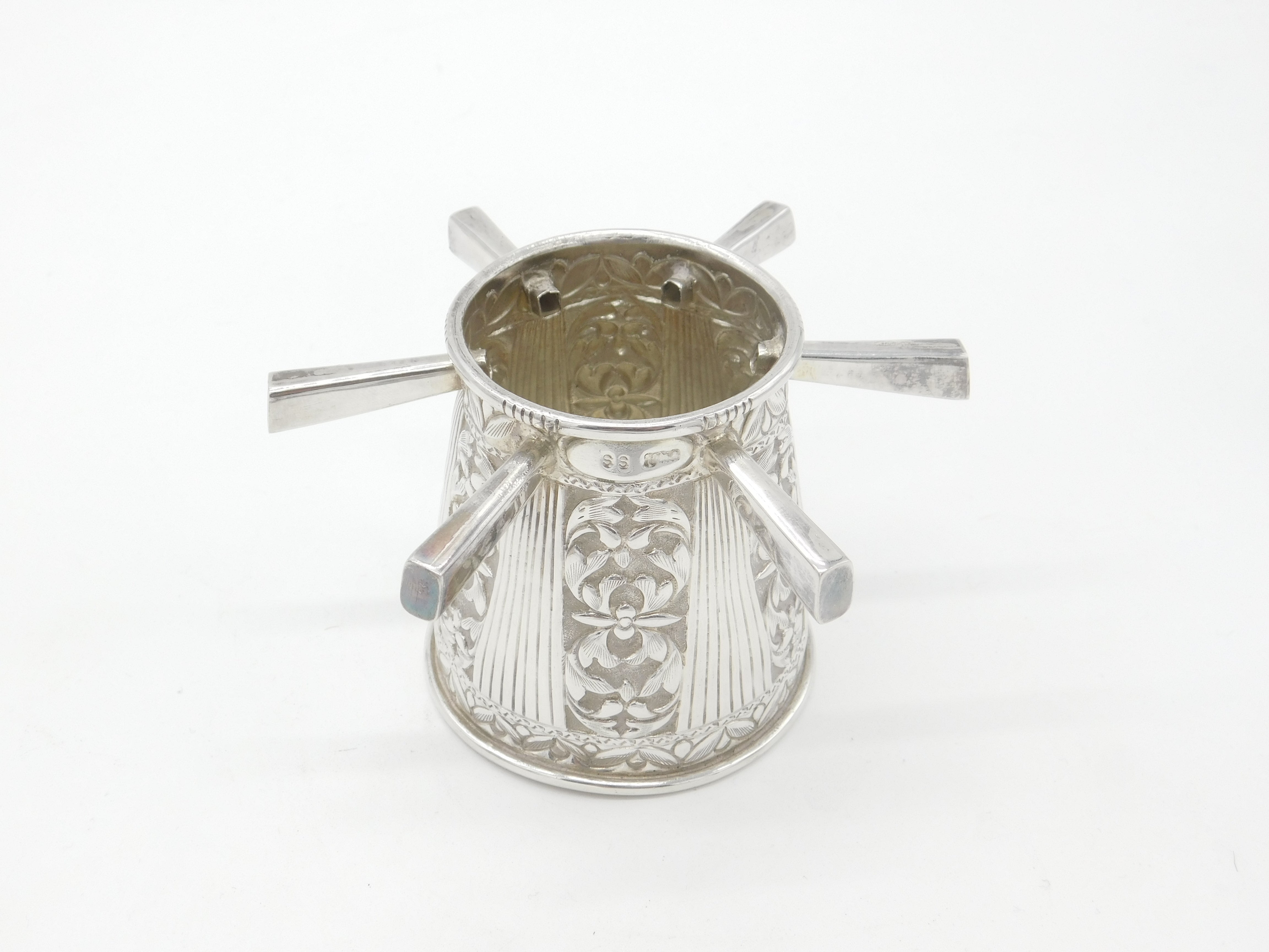 Victorian Sterling Silver Puzzle Mug Floral Pattern Six Handles Antique c1900
