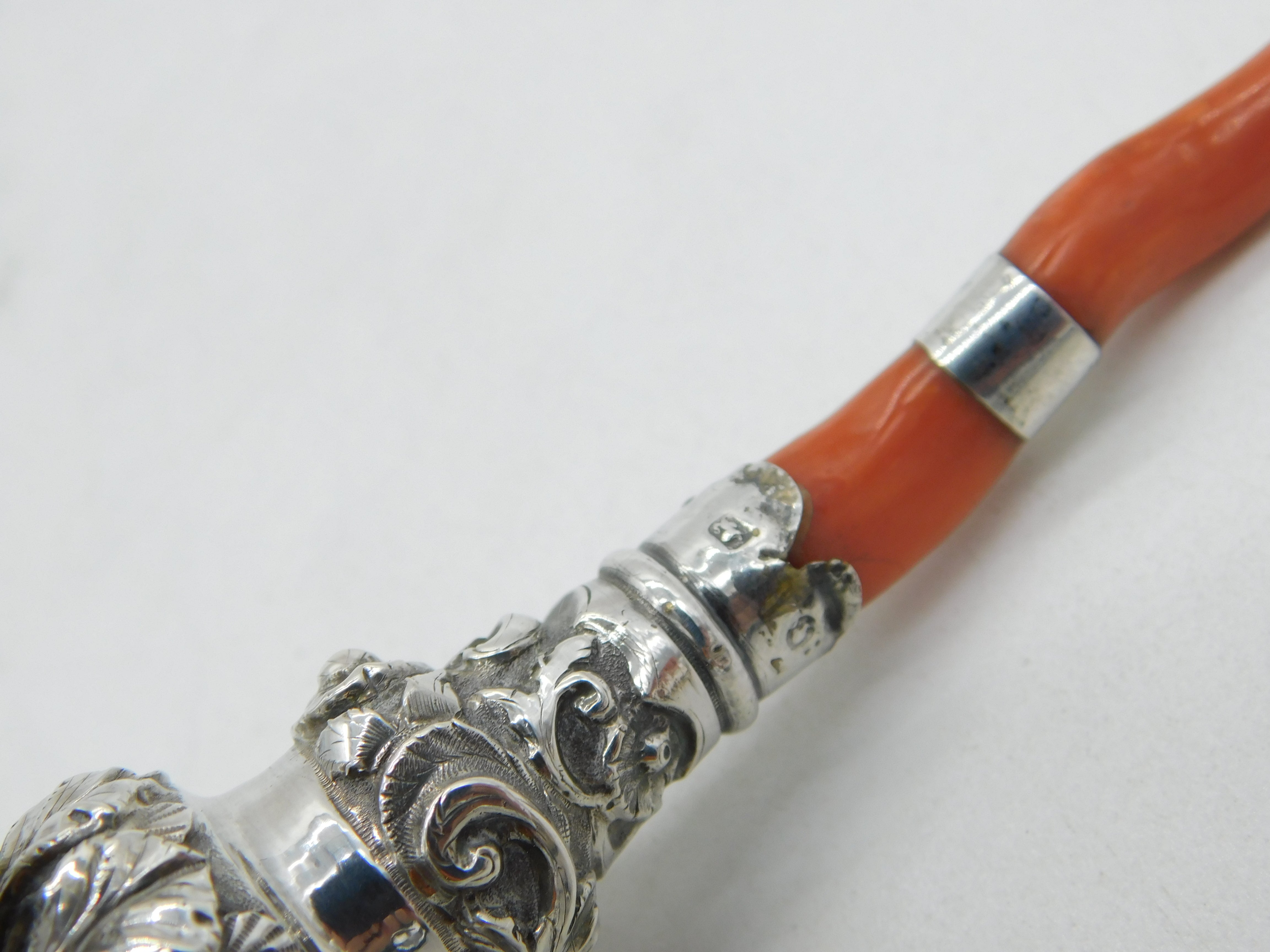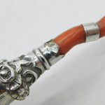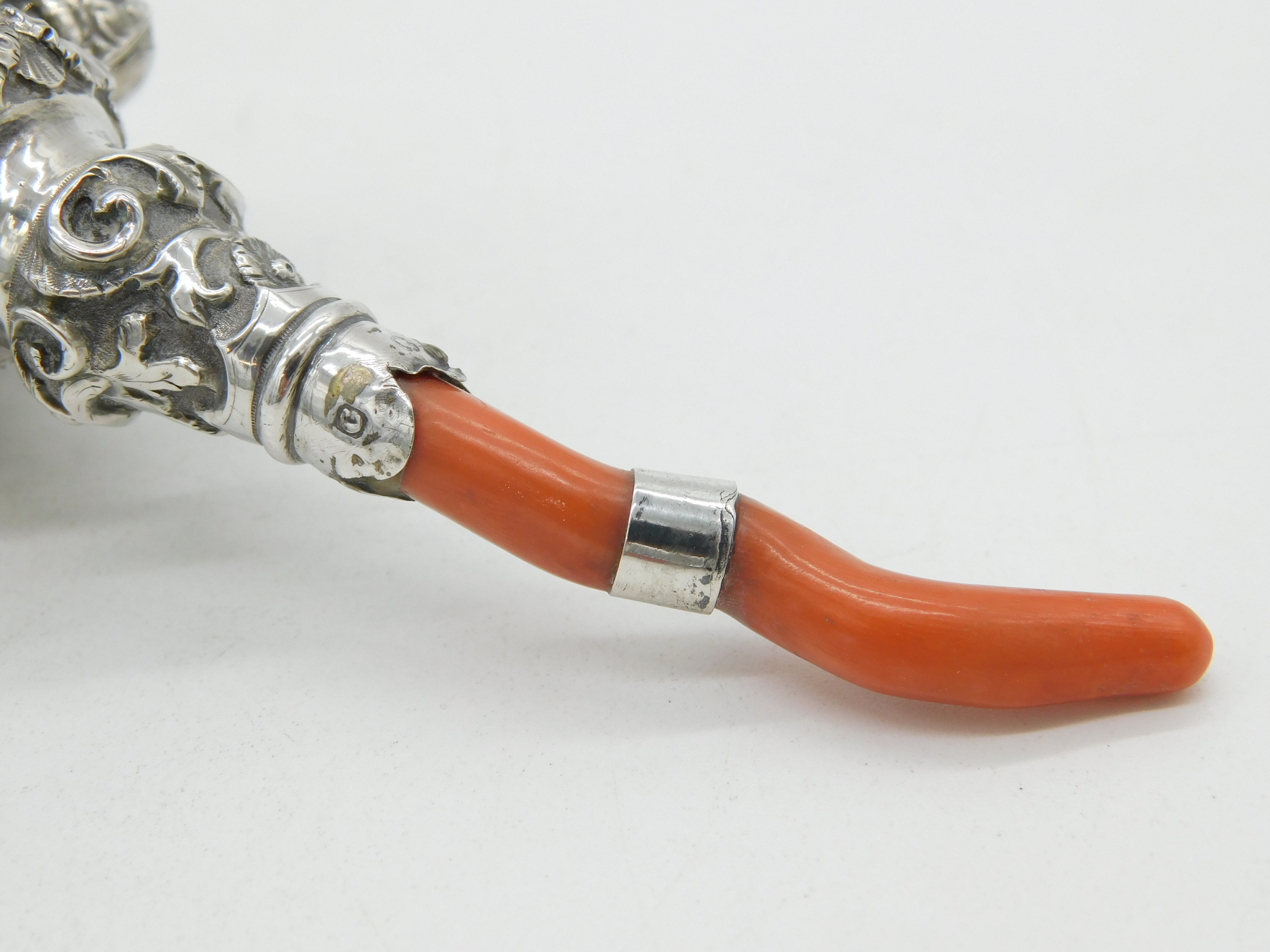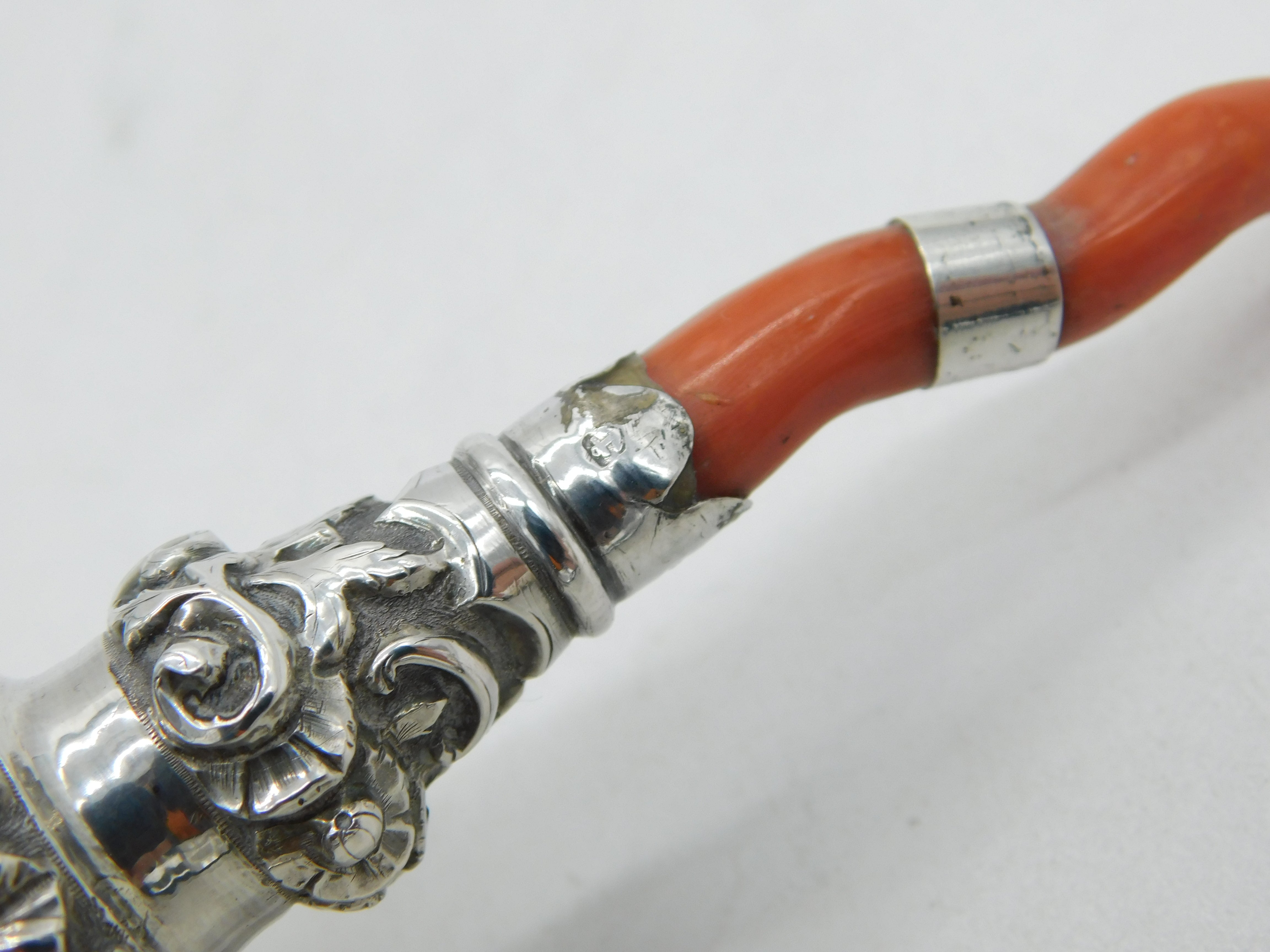 Victorian Sterling Silver & Red Coral Baby Rattle & Teether Antique 1851 Birmingham