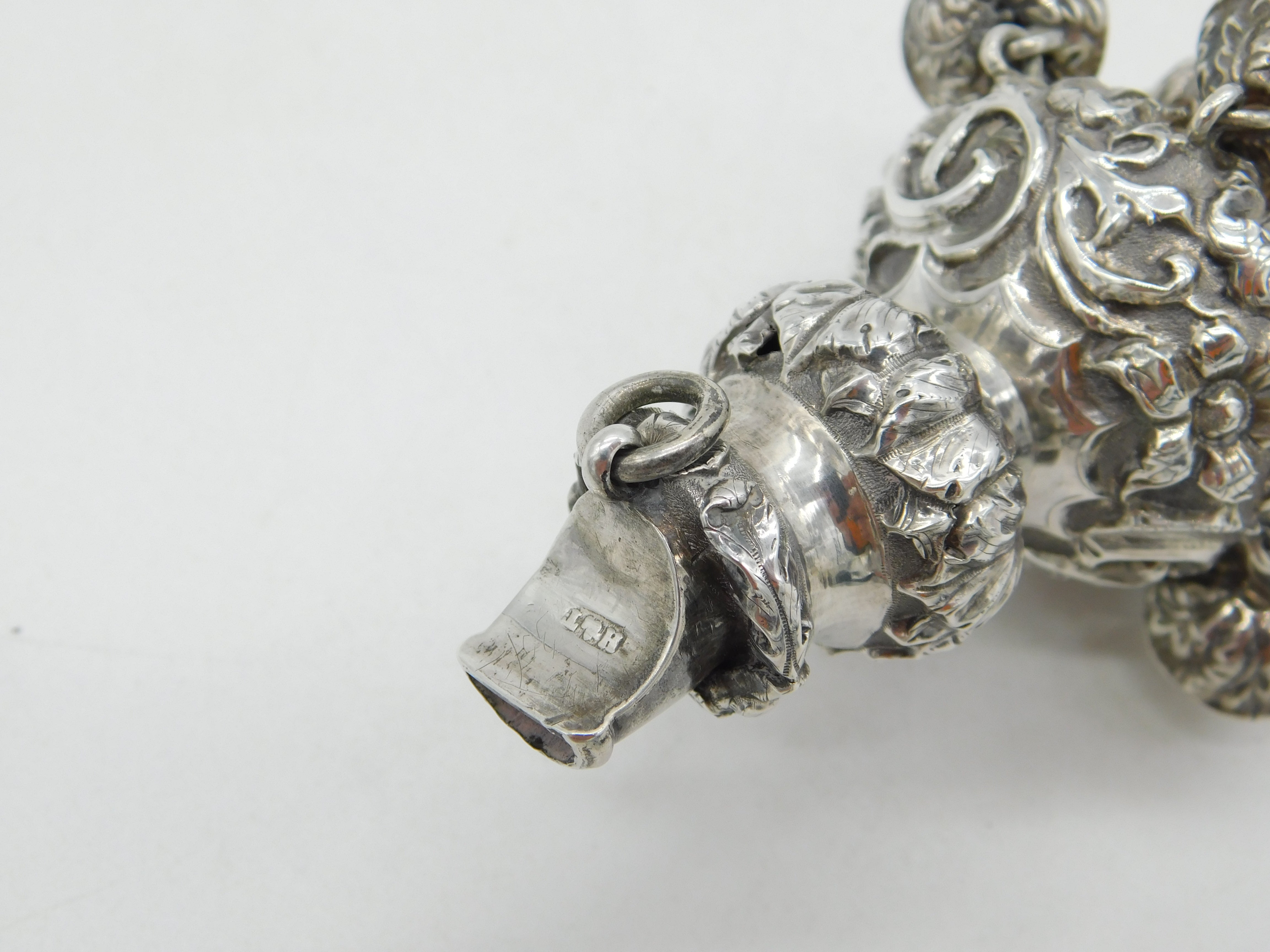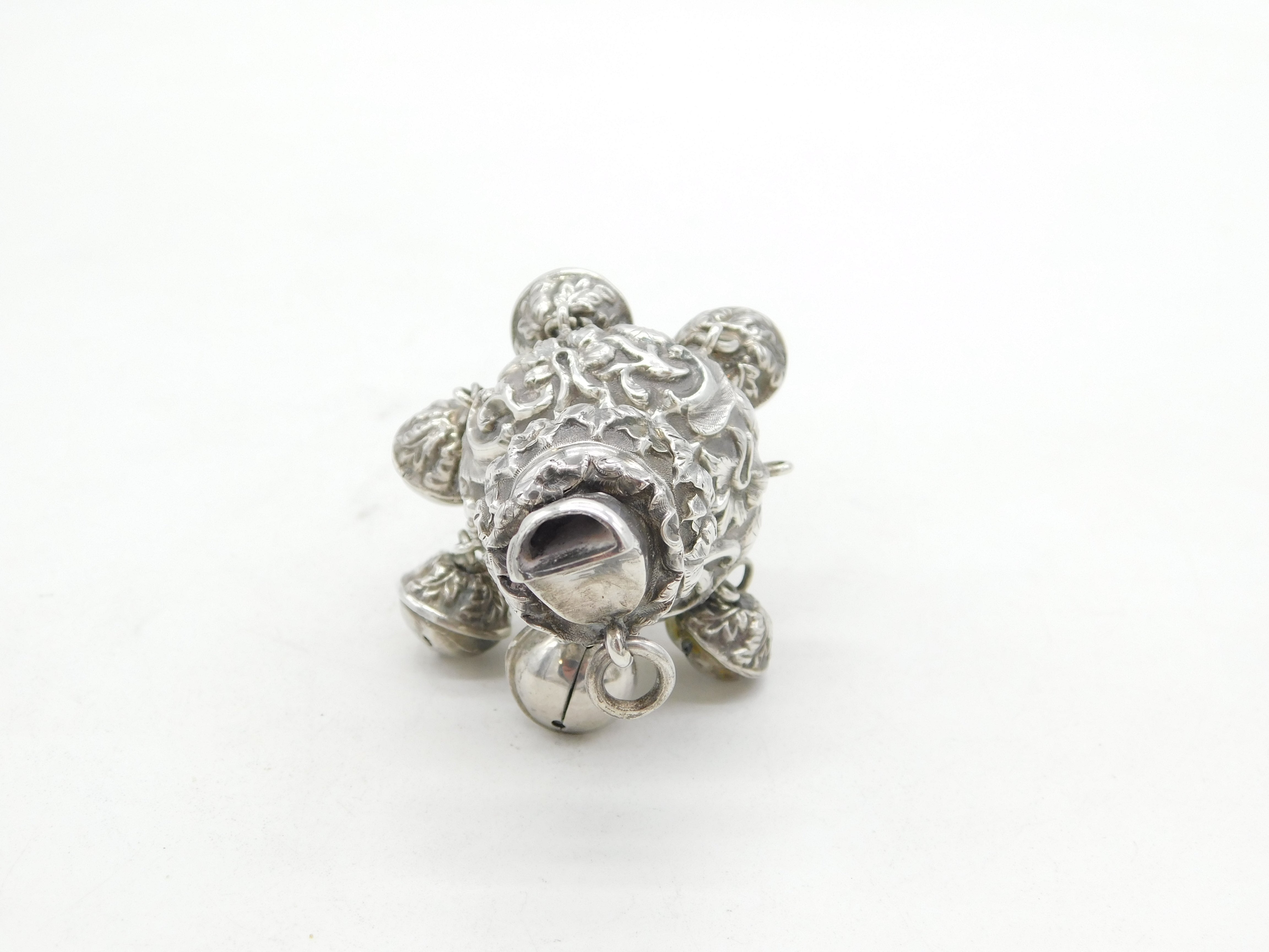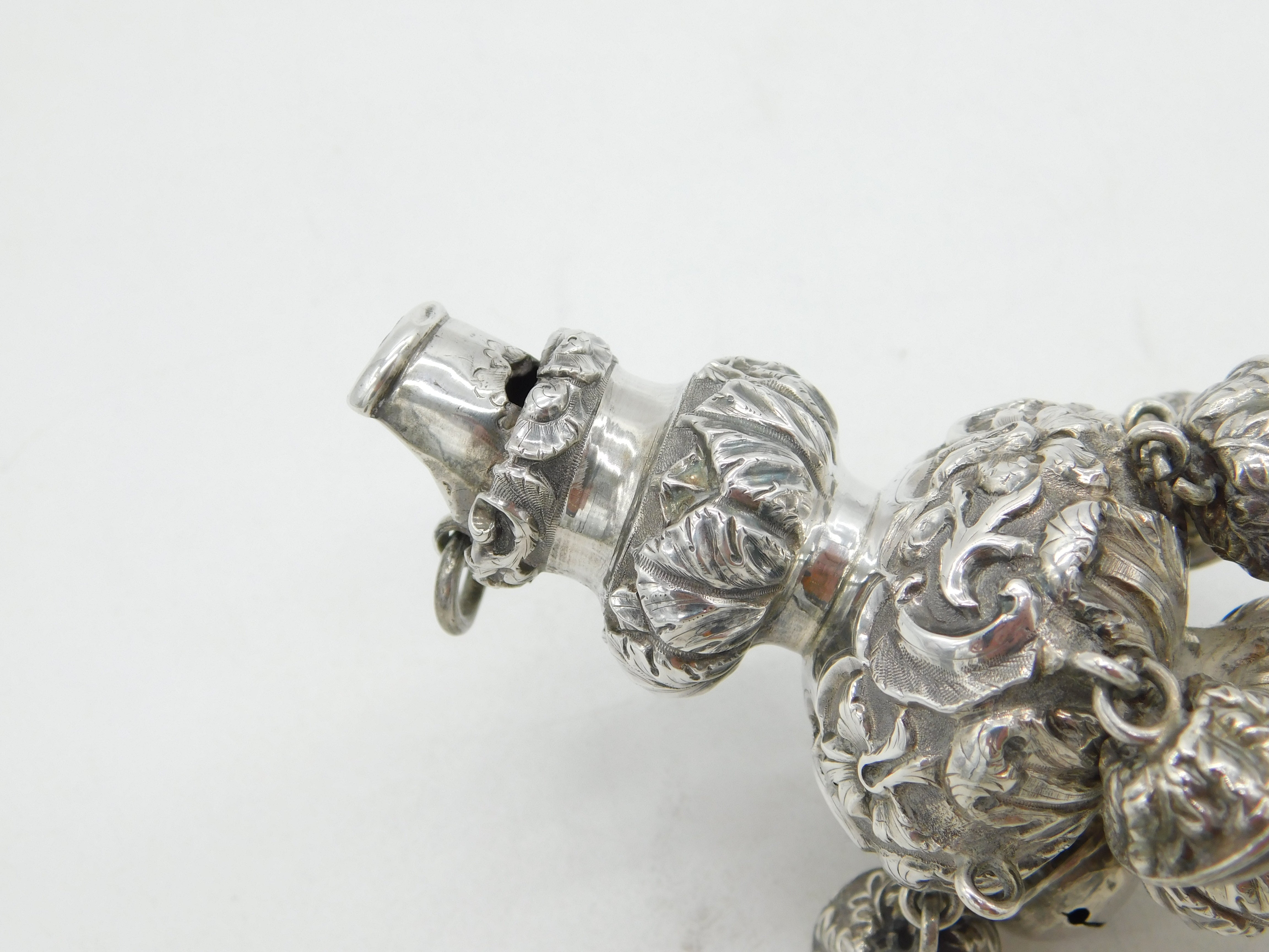 Details: A fantastic and wonderfully designed antique mid-Victorian sterling silver baby rattle with whistle to the top and multiple bells decorated with floral patterns throughout, red coral teether to the end hallmarked Birmingham 1851 by Hilliard & Thomason. This is a wonderful item that would make a perfect gift or addition to any collection. The BOX pictured is for PRESENTATION ONLY and is NOT included in the listings but used to frame the pictures unless specifically stated otherwise.
