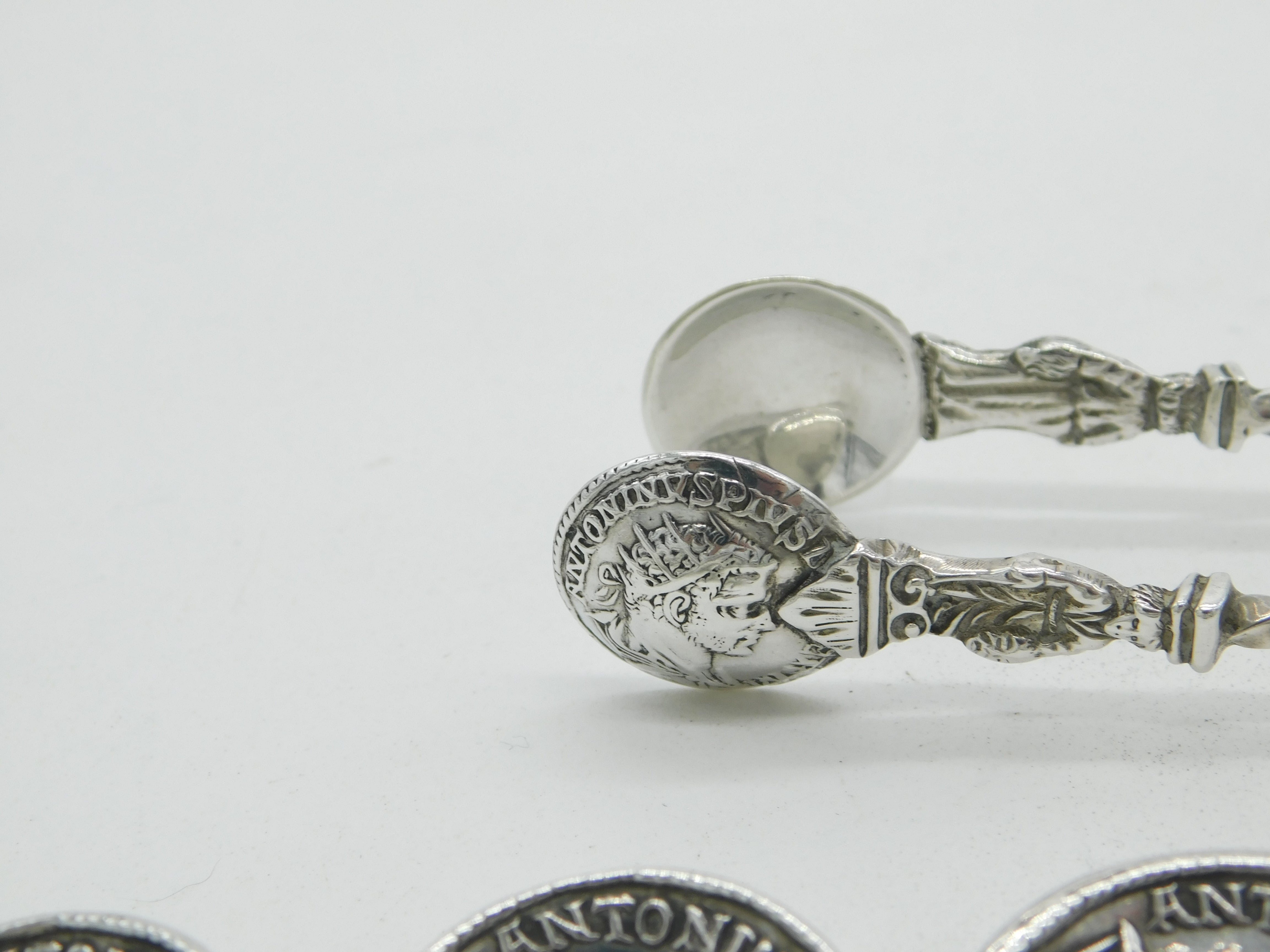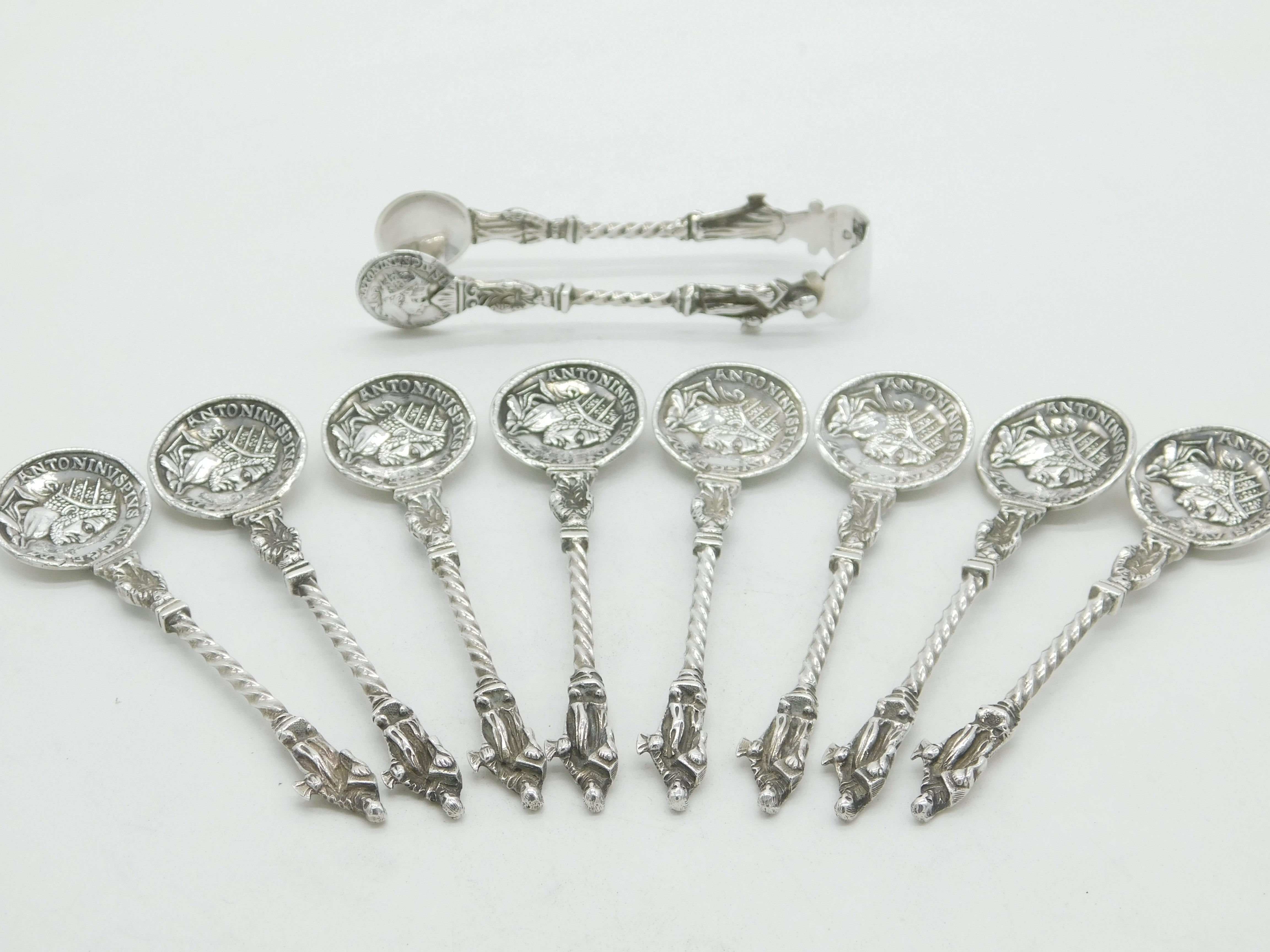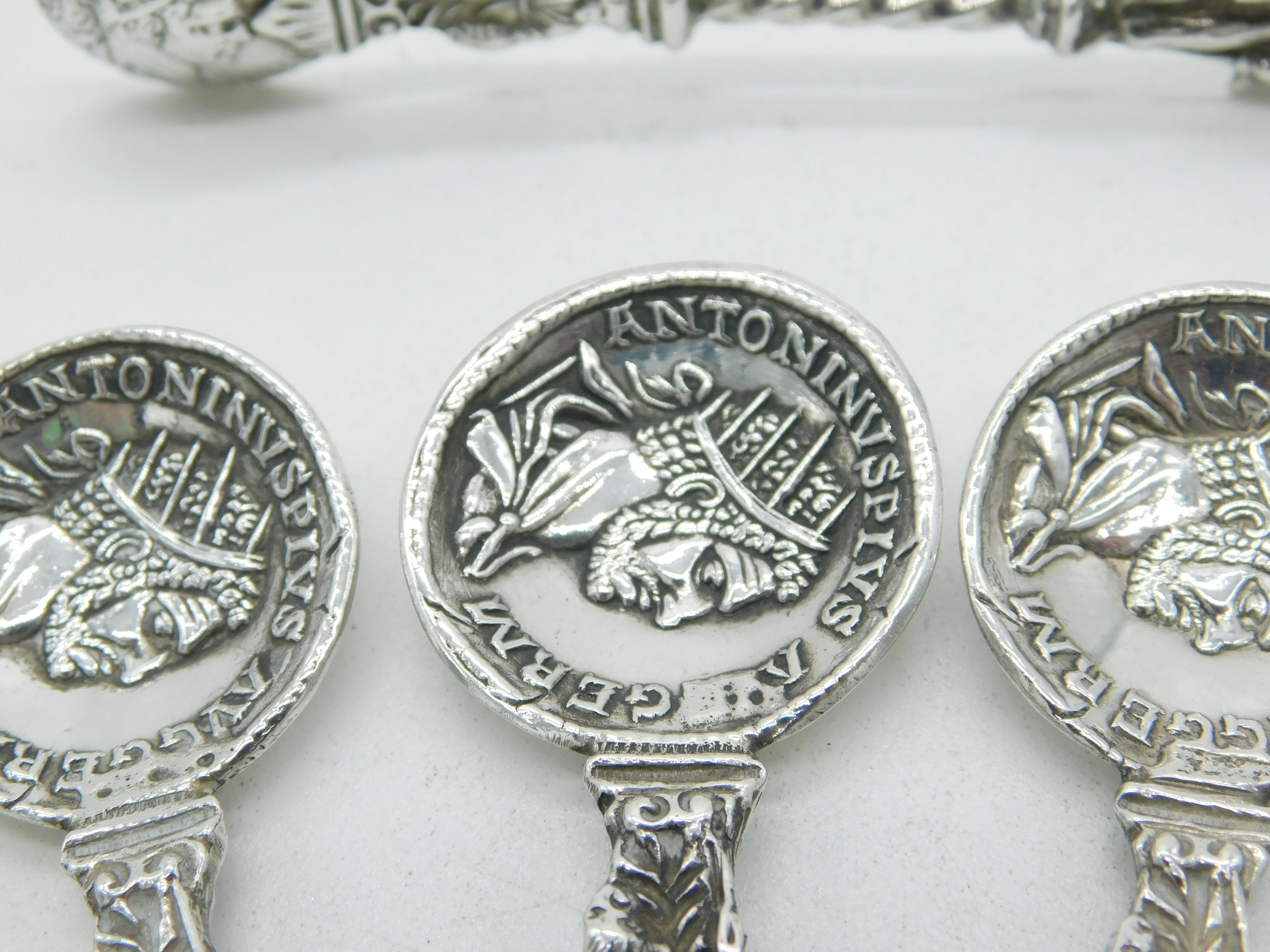 Details: A fantastic and wonderfully designed antique Victorian set of eight sterling silver teaspoons with coin bowls in the style of Roman Emperor Antoninus Pius (138-161 AD) with apostles to the terminals each hallmarked London 1888 by Charles Boyton. The set also features a pair of sugar tongs or nips equally with Roman Coin bowls and apostles to the edges. This is a wonderful item that would make a perfect gift or addition to any collection. The BOX pictured is for PRESENTATION ONLY and is NOT included in the listings but used to frame the pictures unless specifically stated otherwise.