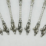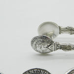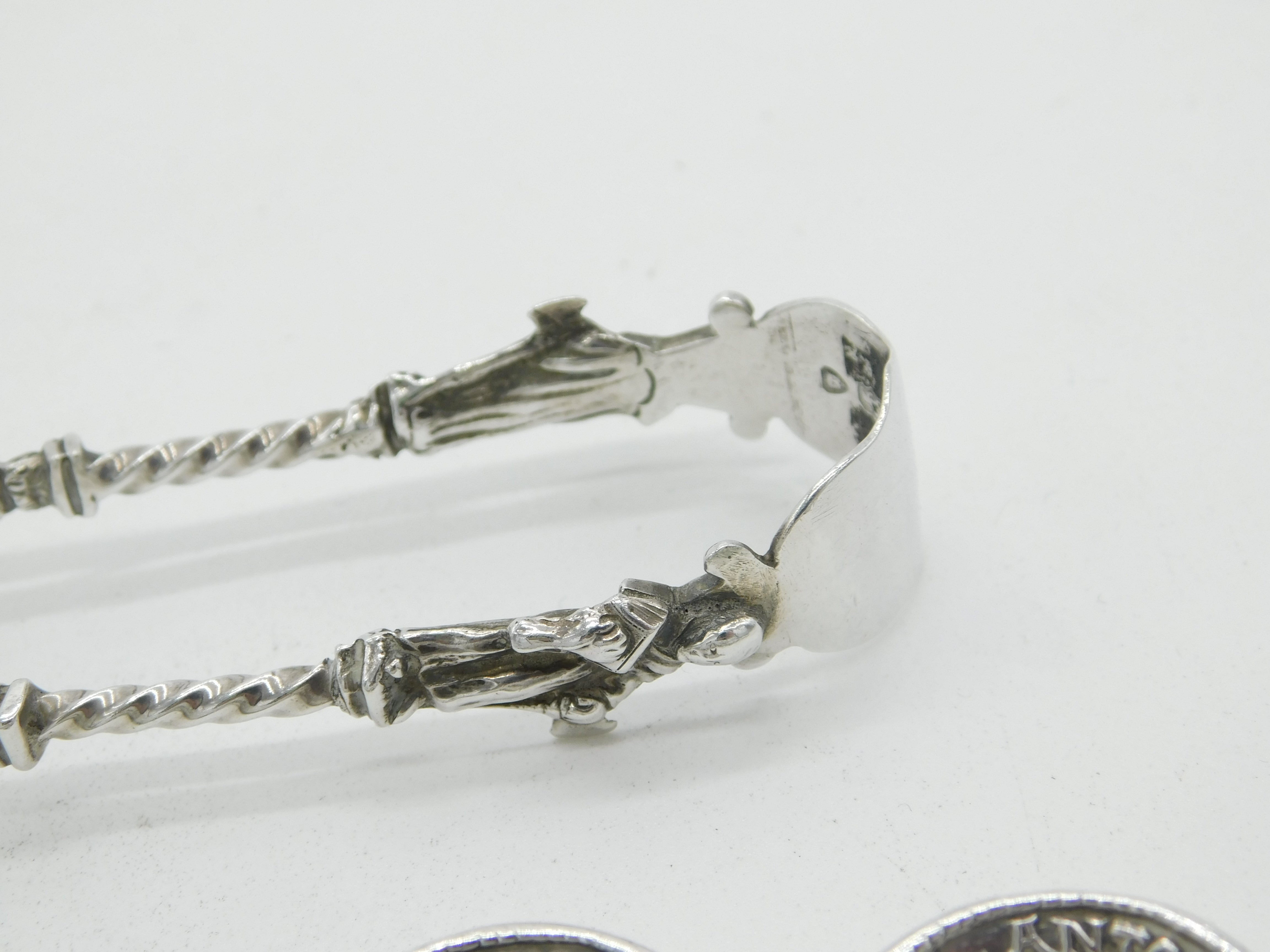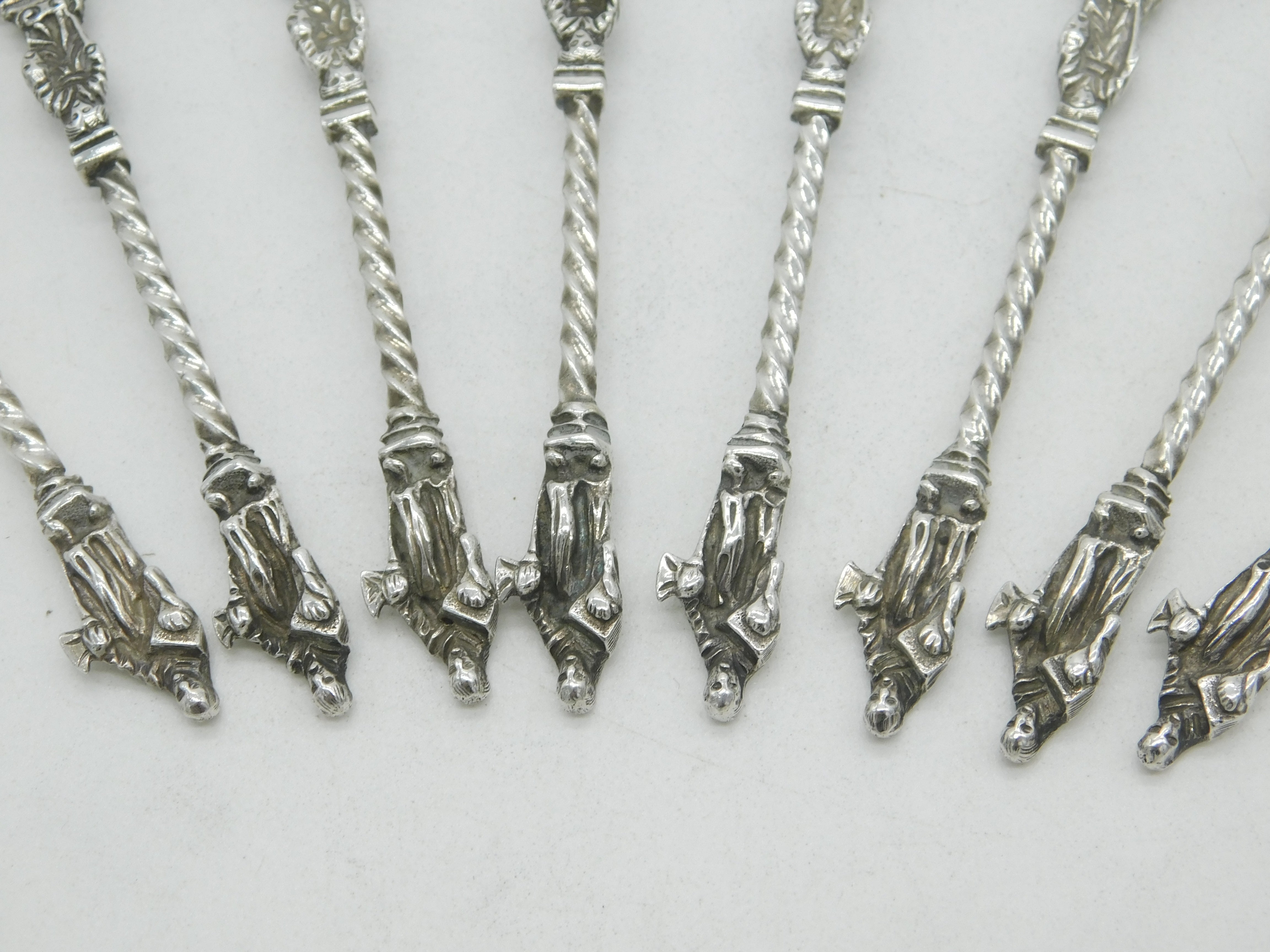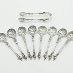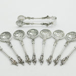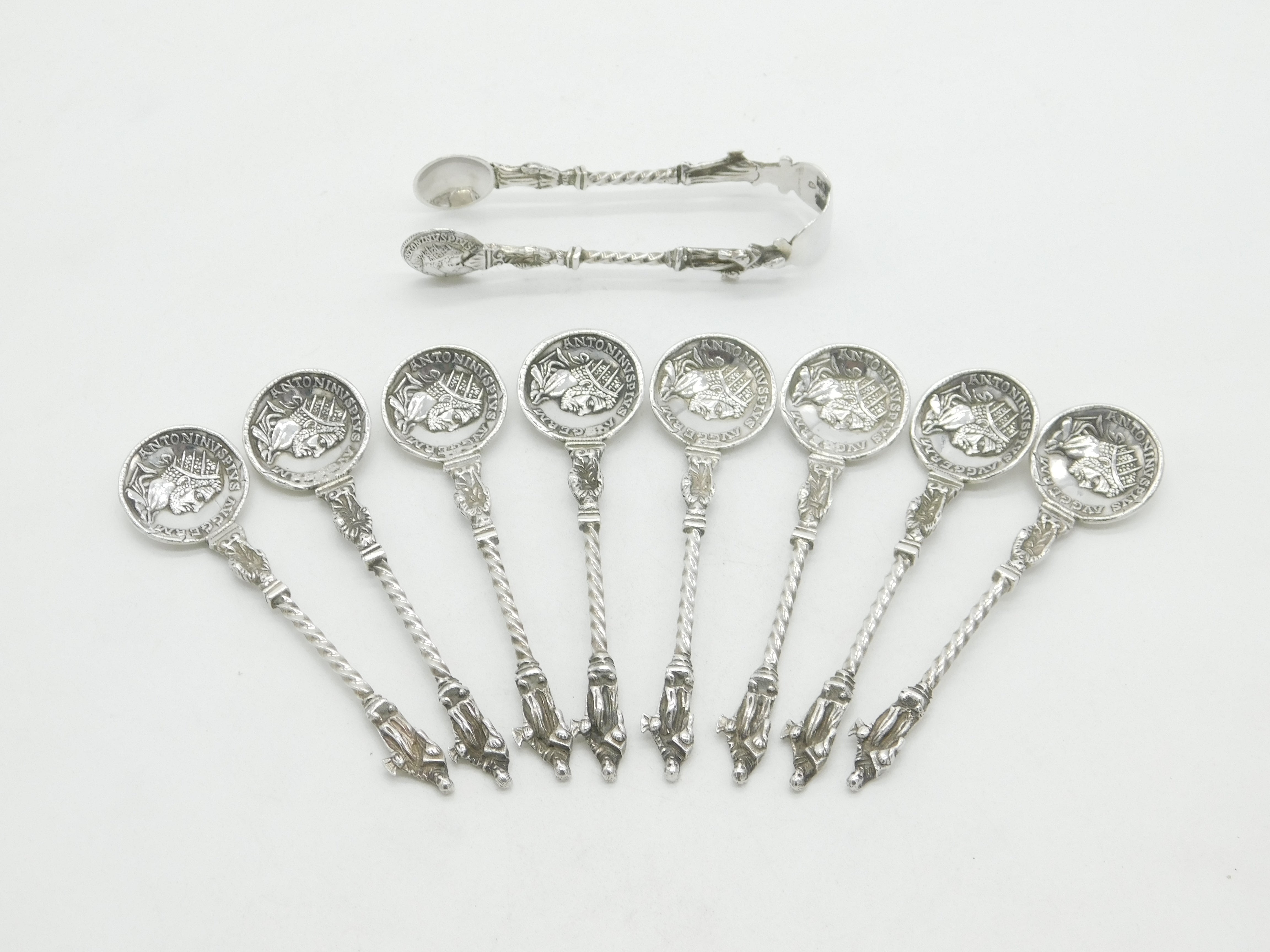 Details: A fantastic and wonderfully designed antique Victorian set of eight sterling silver teaspoons with coin bowls in the style of Roman Emperor Antoninus Pius (138-161 AD) with apostles to the terminals each hallmarked London 1888 by Charles Boyton. The set also features a pair of sugar tongs or nips equally with Roman Coin bowls and apostles to the edges. This is a wonderful item that would make a perfect gift or addition to any collection. The BOX pictured is for PRESENTATION ONLY and is NOT included in the listings but used to frame the pictures unless specifically stated otherwise.
