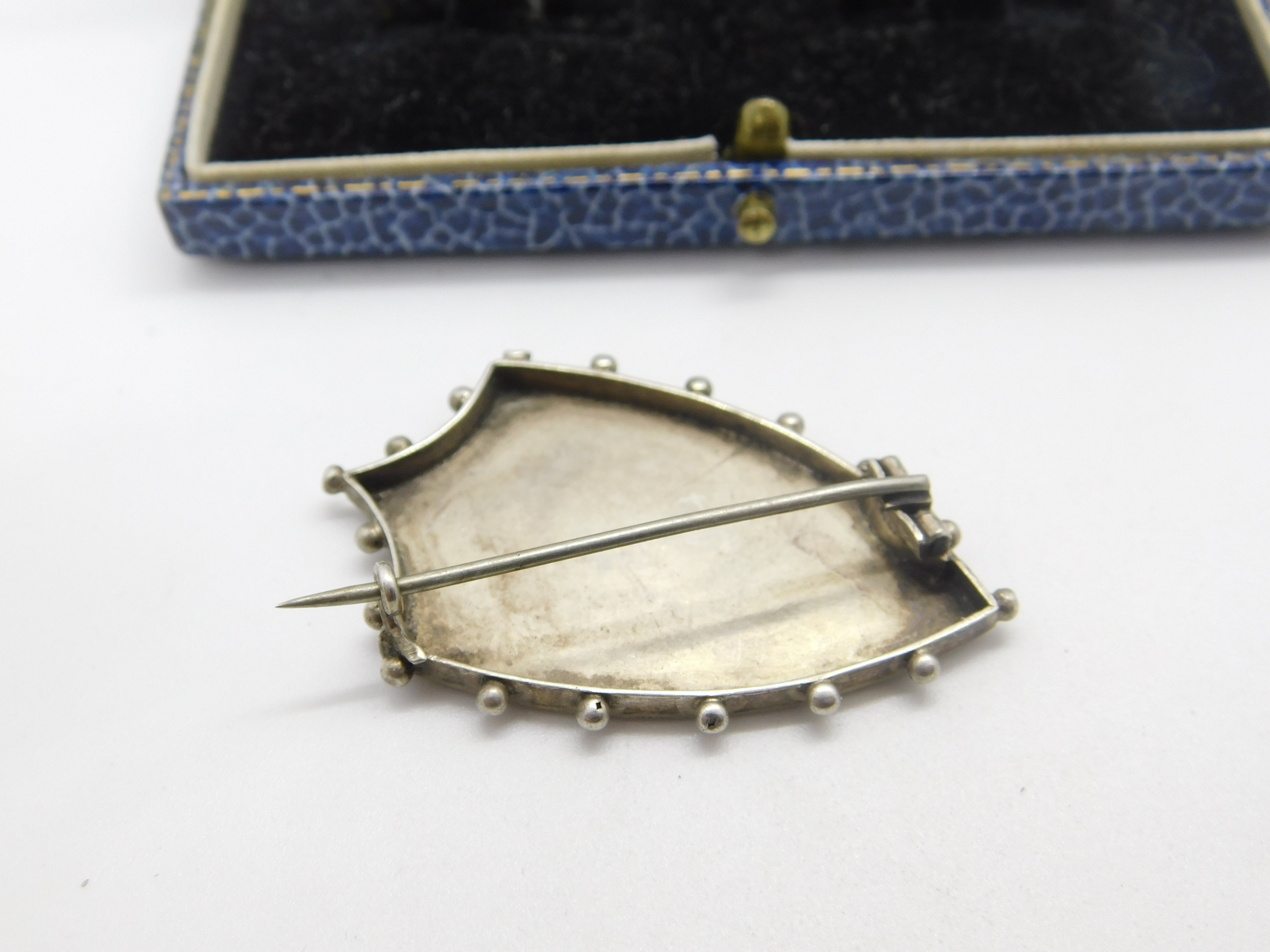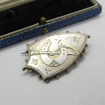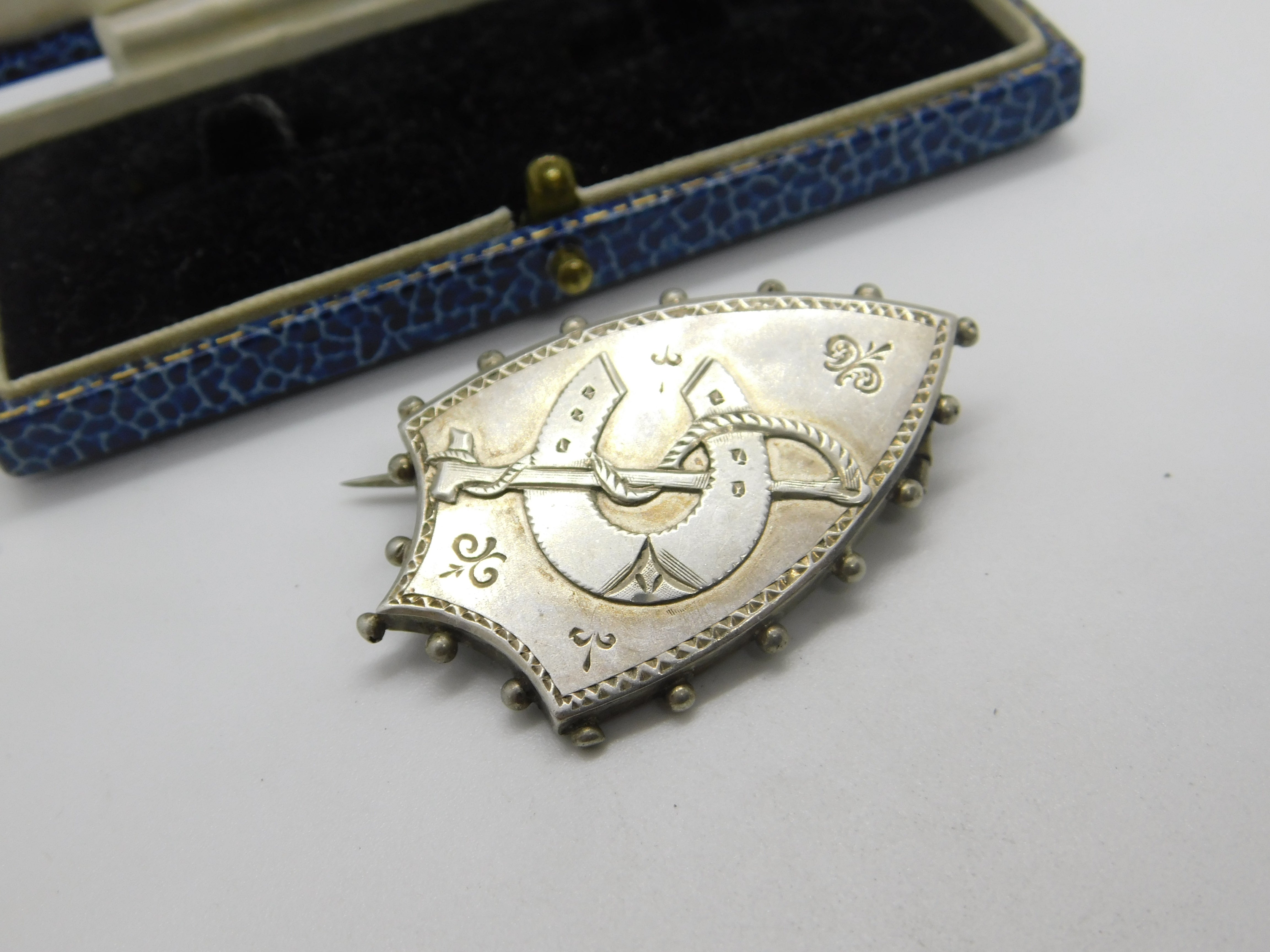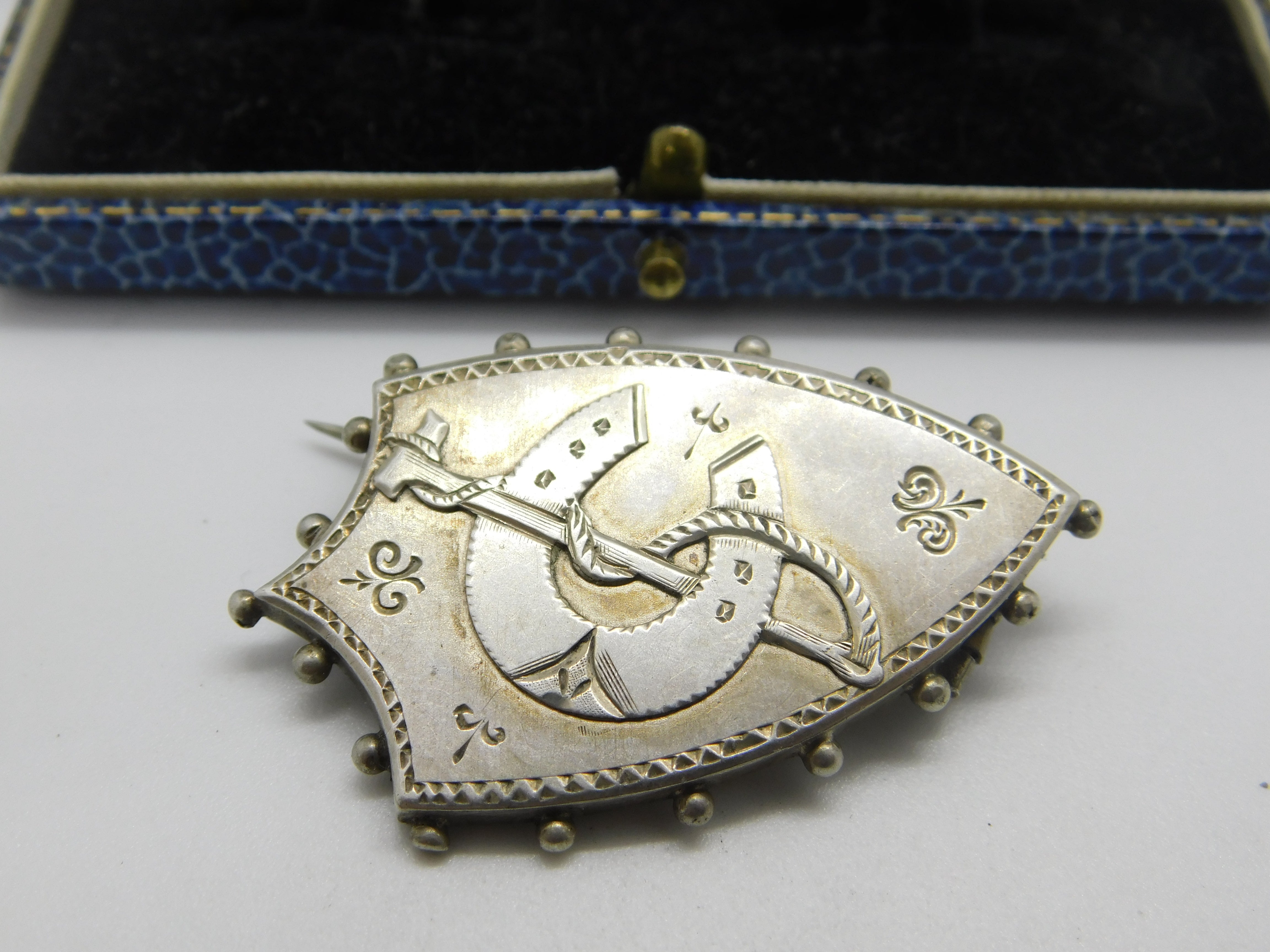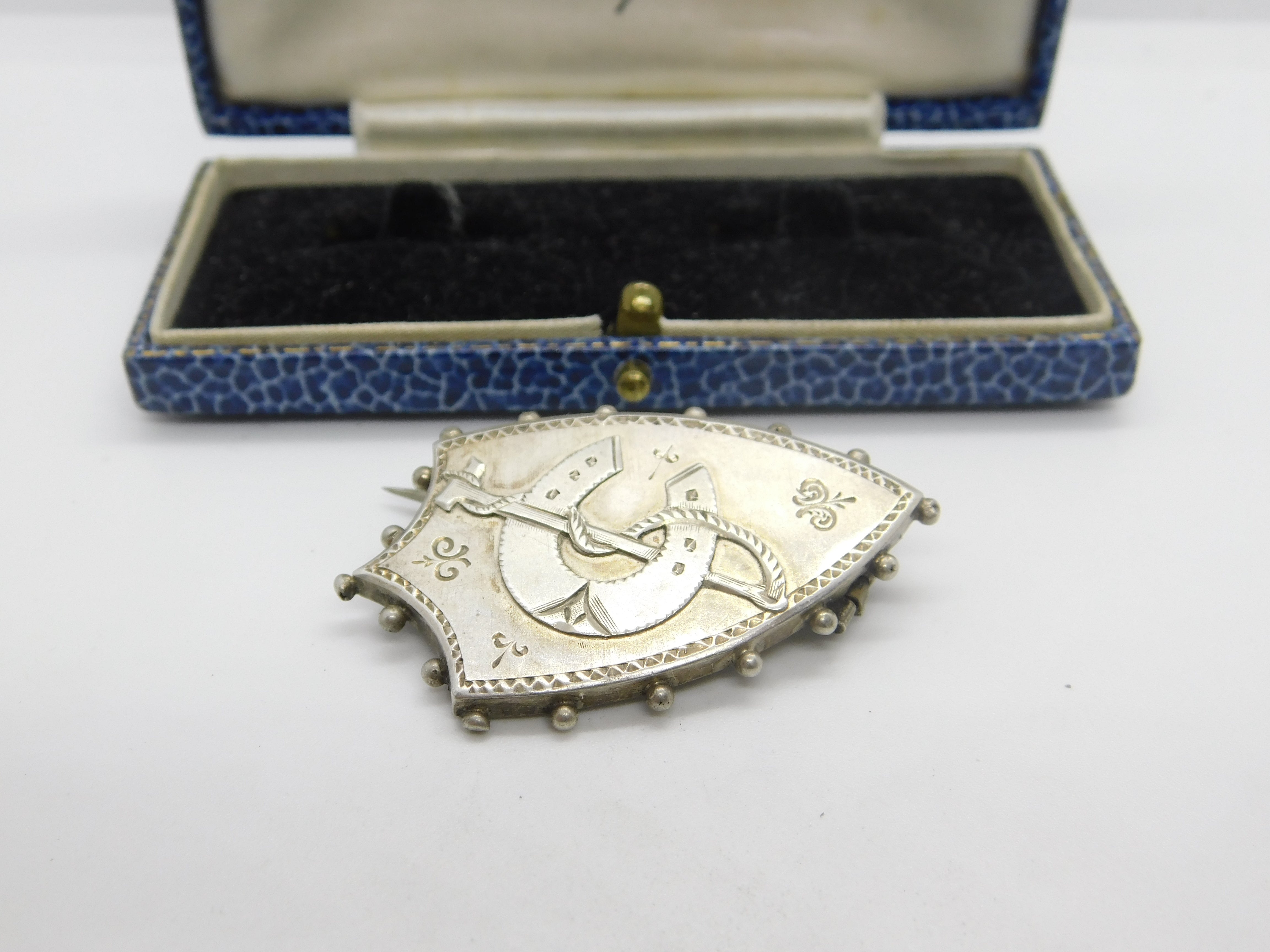 Details: A fantastic and wonderfully designed antique Victorian sterling silver shield form sweetheart brooch with horseshoe and crop detail c1880 - the silver has been XRF tested. This is a wonderful item that would make a perfect gift or addition to any collection. The BOX pictured is for PRESENTATION ONLY and is NOT included in the listings but used to frame the pictures unless specifically stated otherwise.