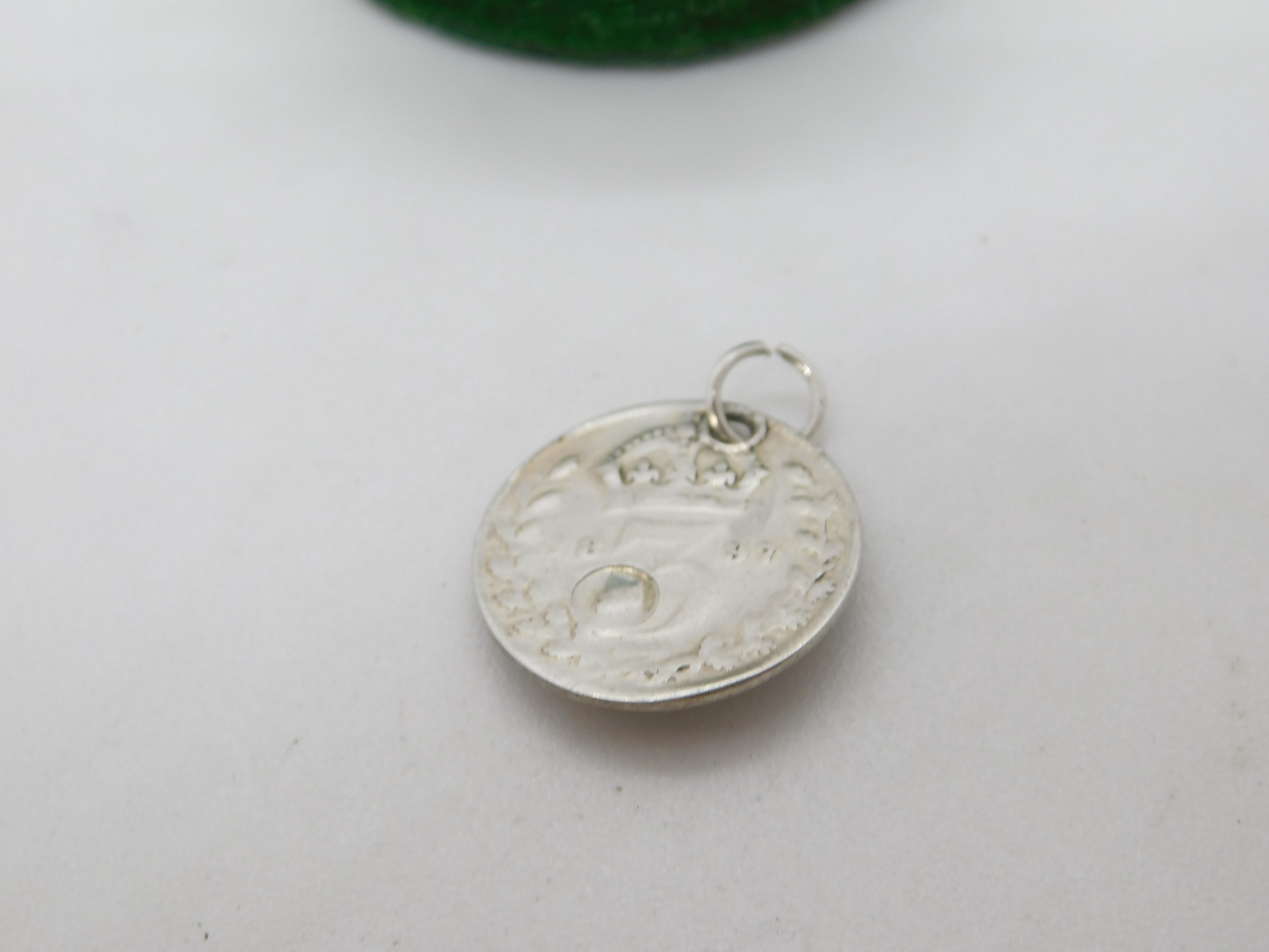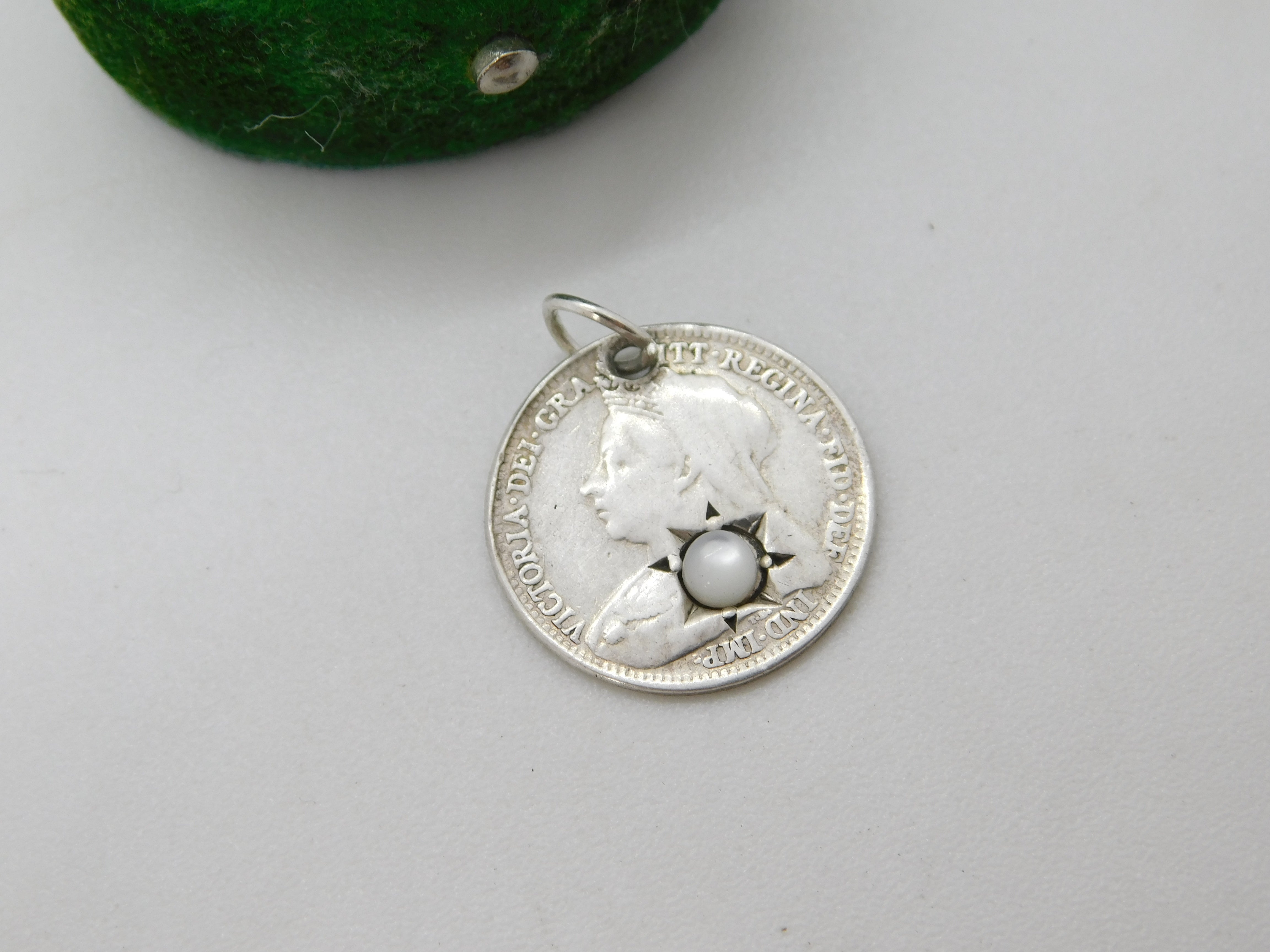 Victorian Sterling Silver Threepence Coin Moonstone Lucky Charm Antique 1897