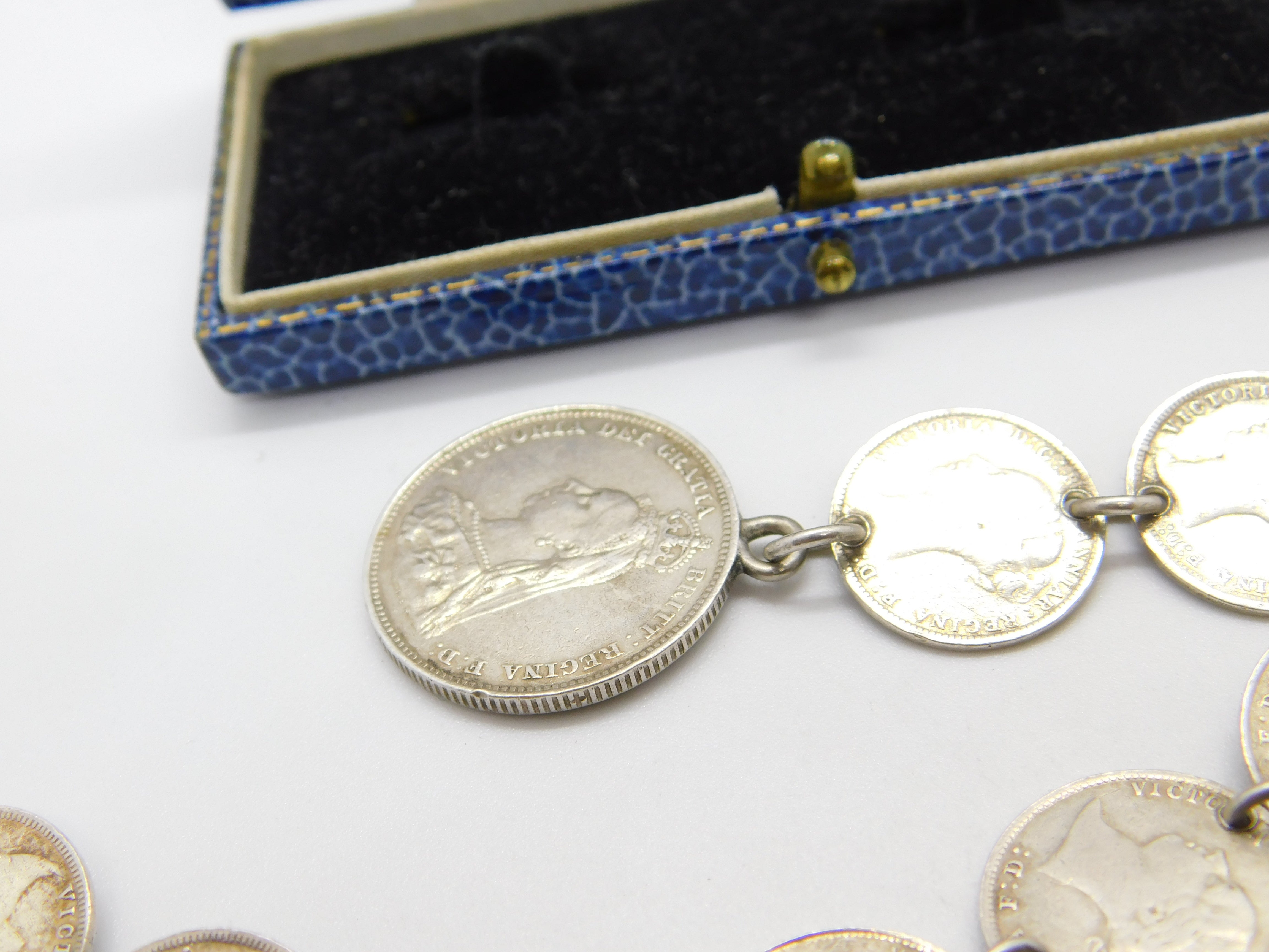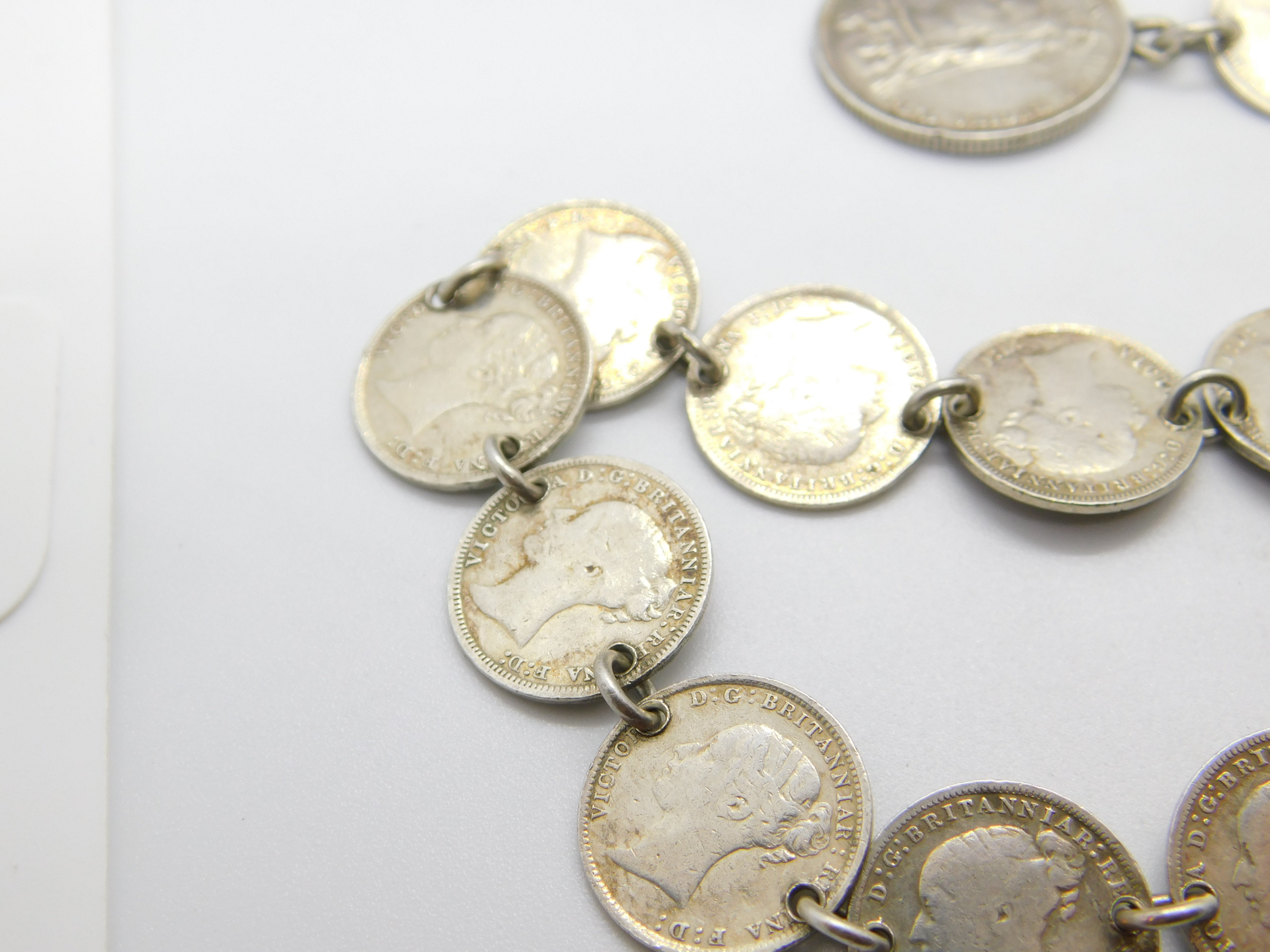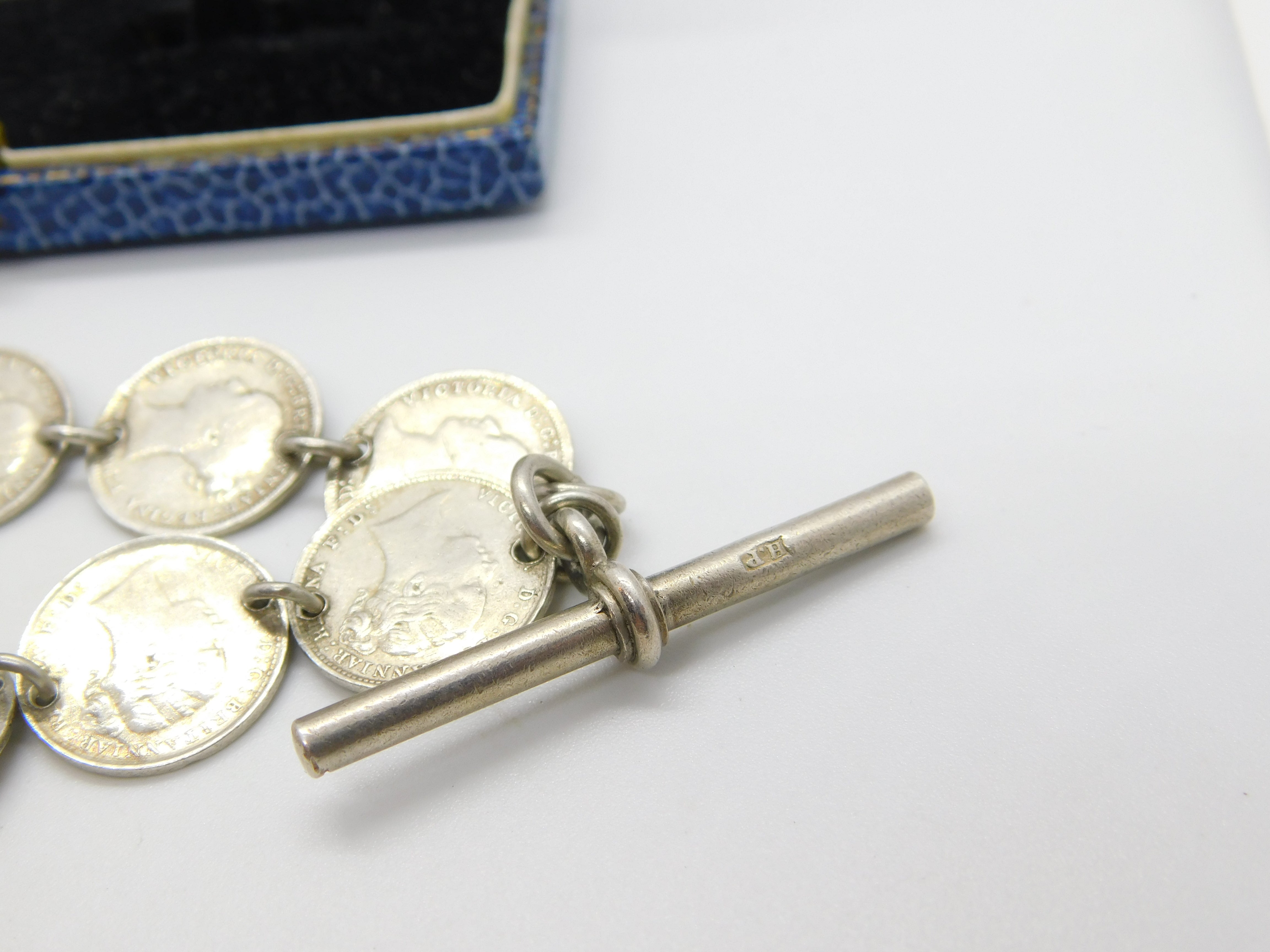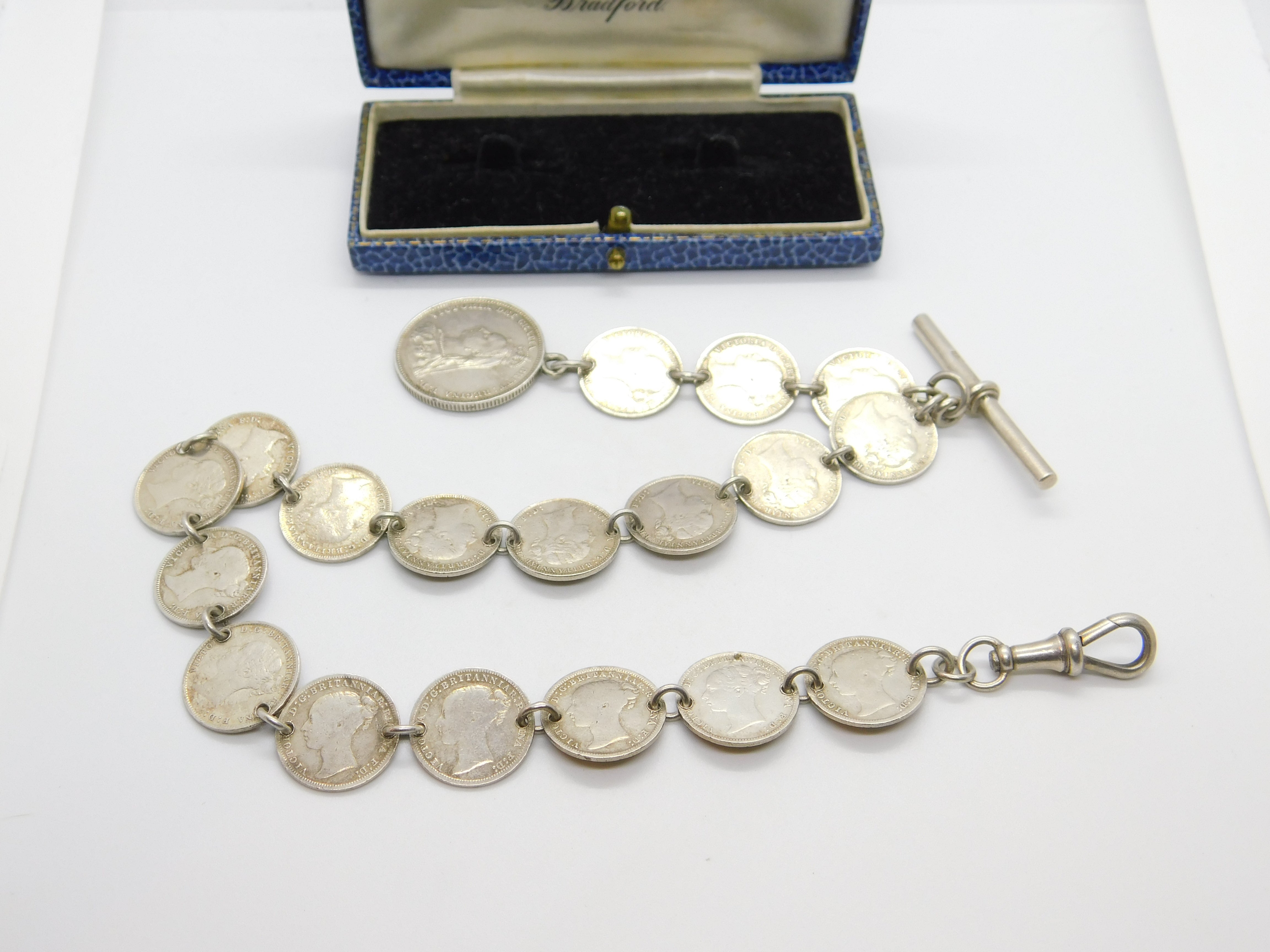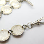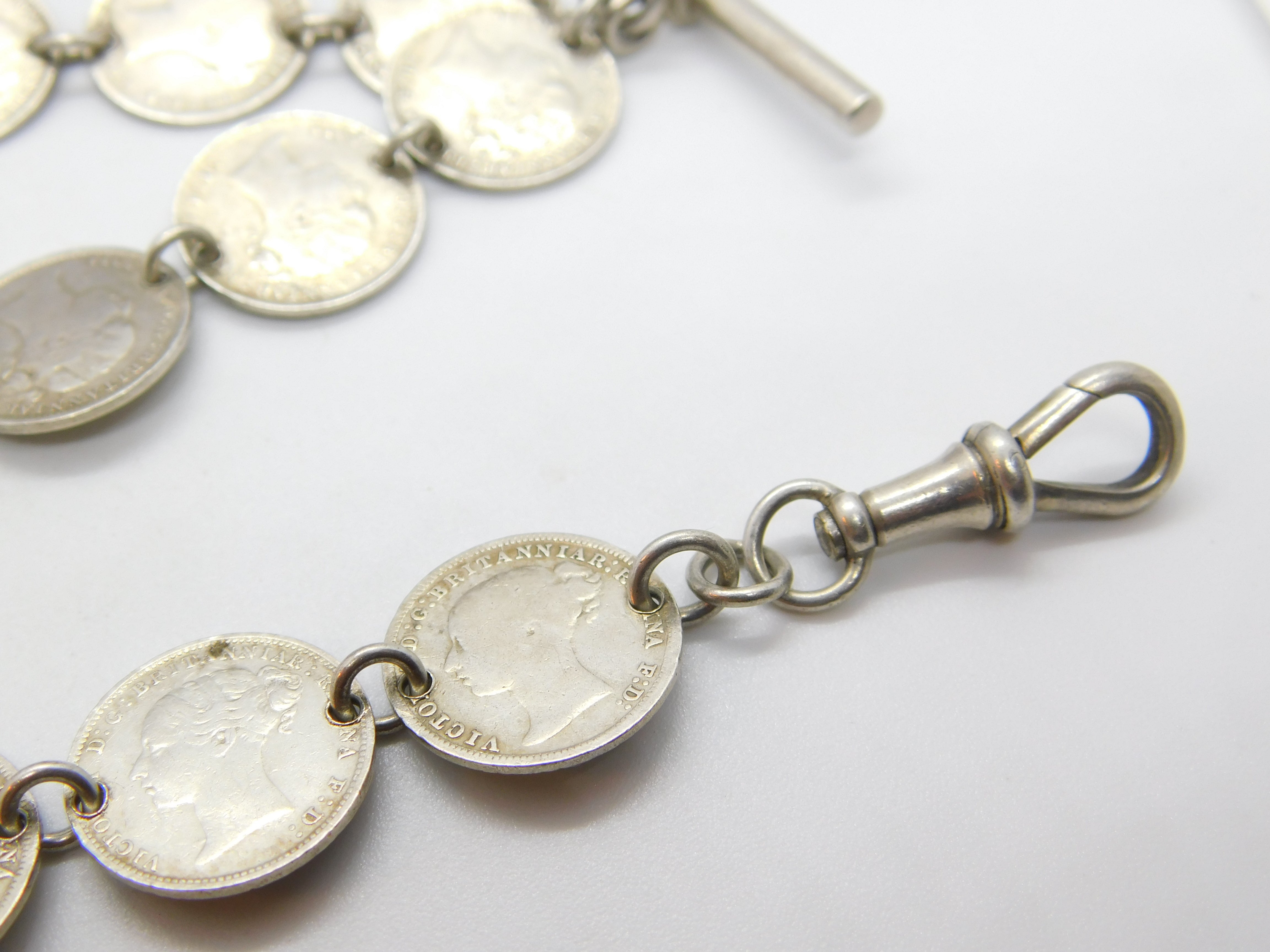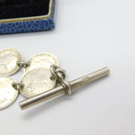 Victorian Sterling Silver Threepence Coin Watch Chain Antique c1880 with Shilling Fob