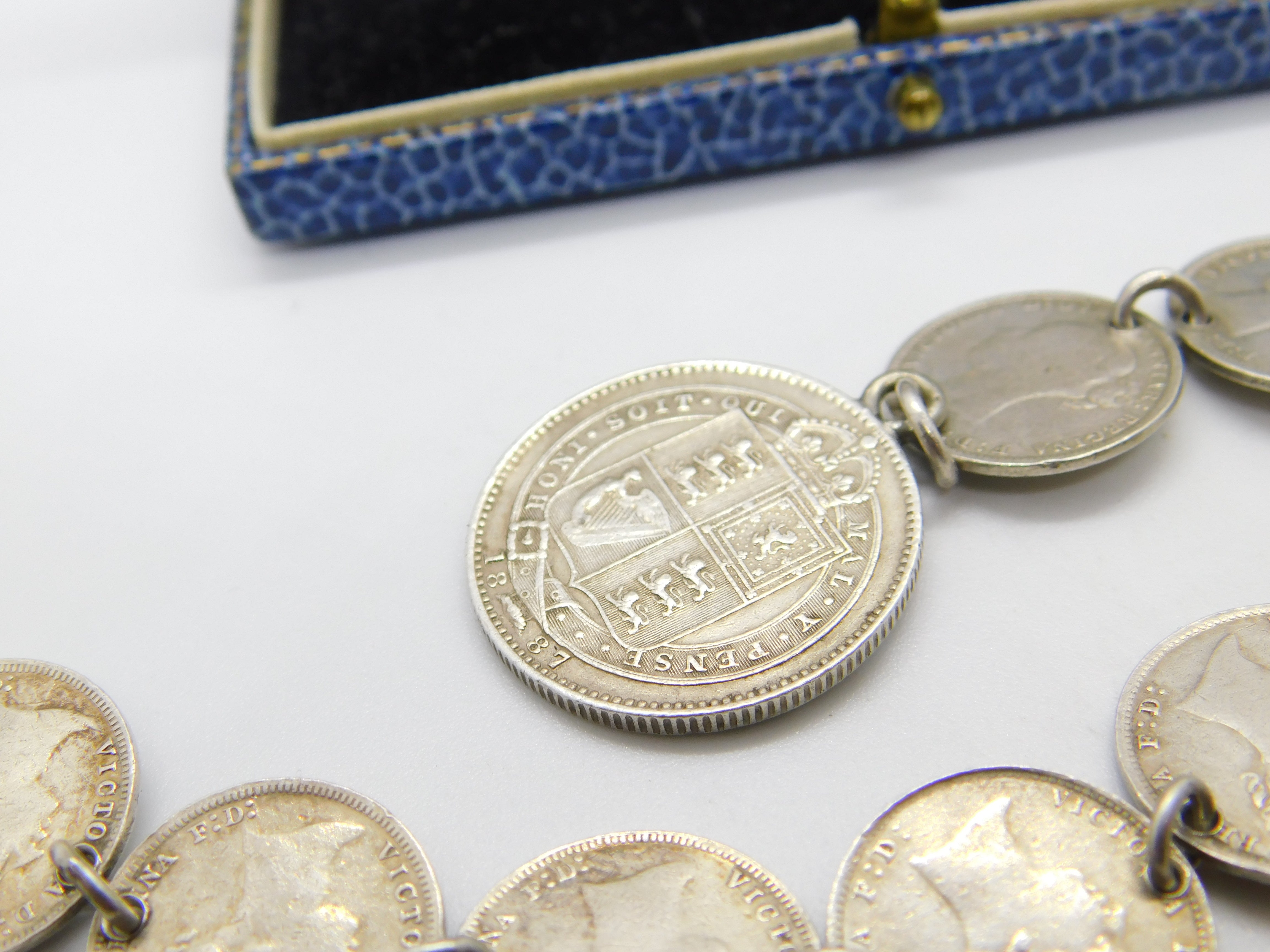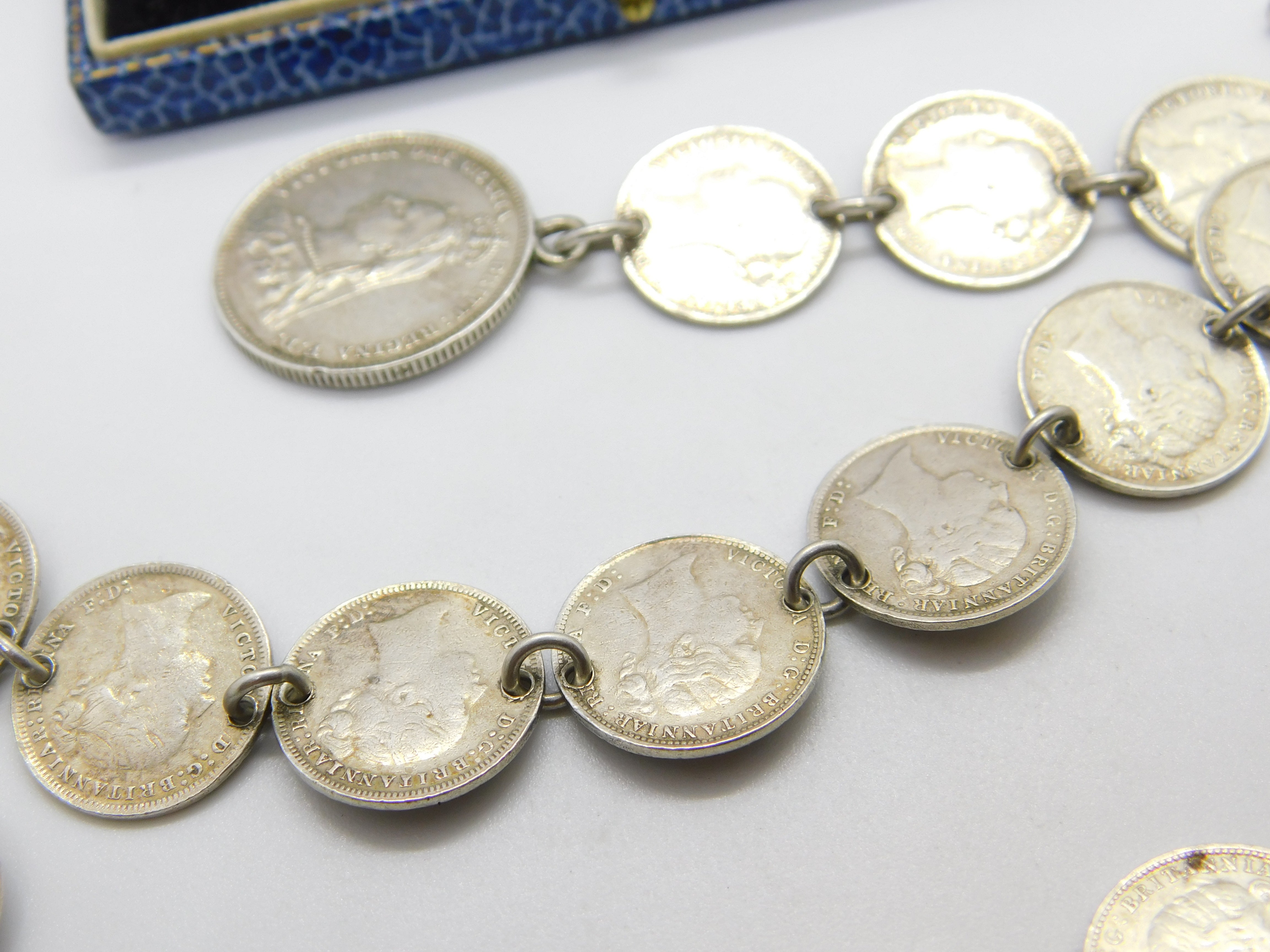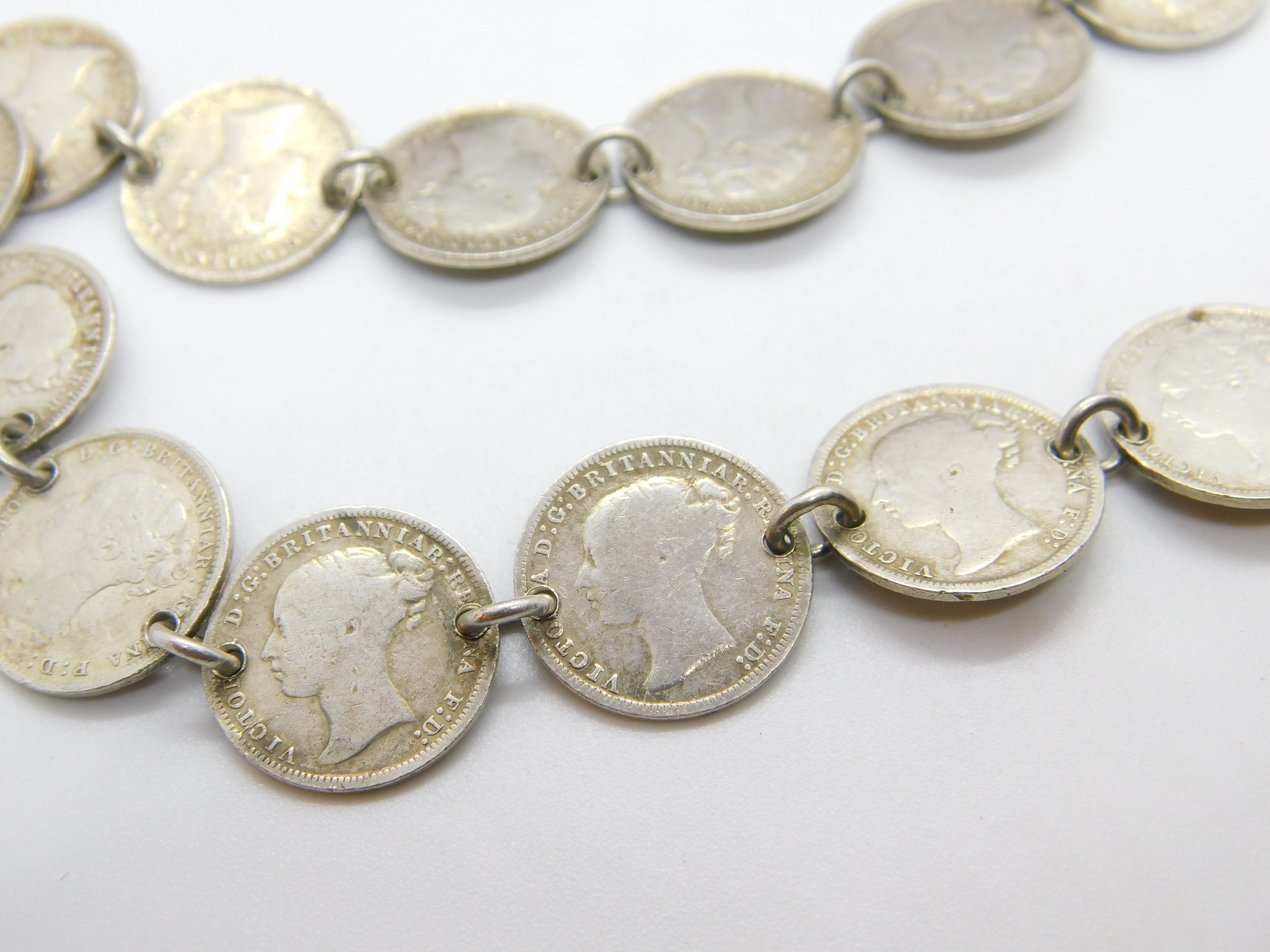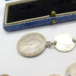 Details: A fantastic and wonderfully designed antique Victorian sterling silver watch chain formed of multiple Victorian threepence coins with a range of dates mainly early 1880s with an 1887 shilling fob attached. A super example! This is a wonderful item that would make a perfect gift or addition to any collection. The BOX pictured is for PRESENTATION ONLY and is NOT included in the listings but used to frame the pictures unless specifically stated otherwise.