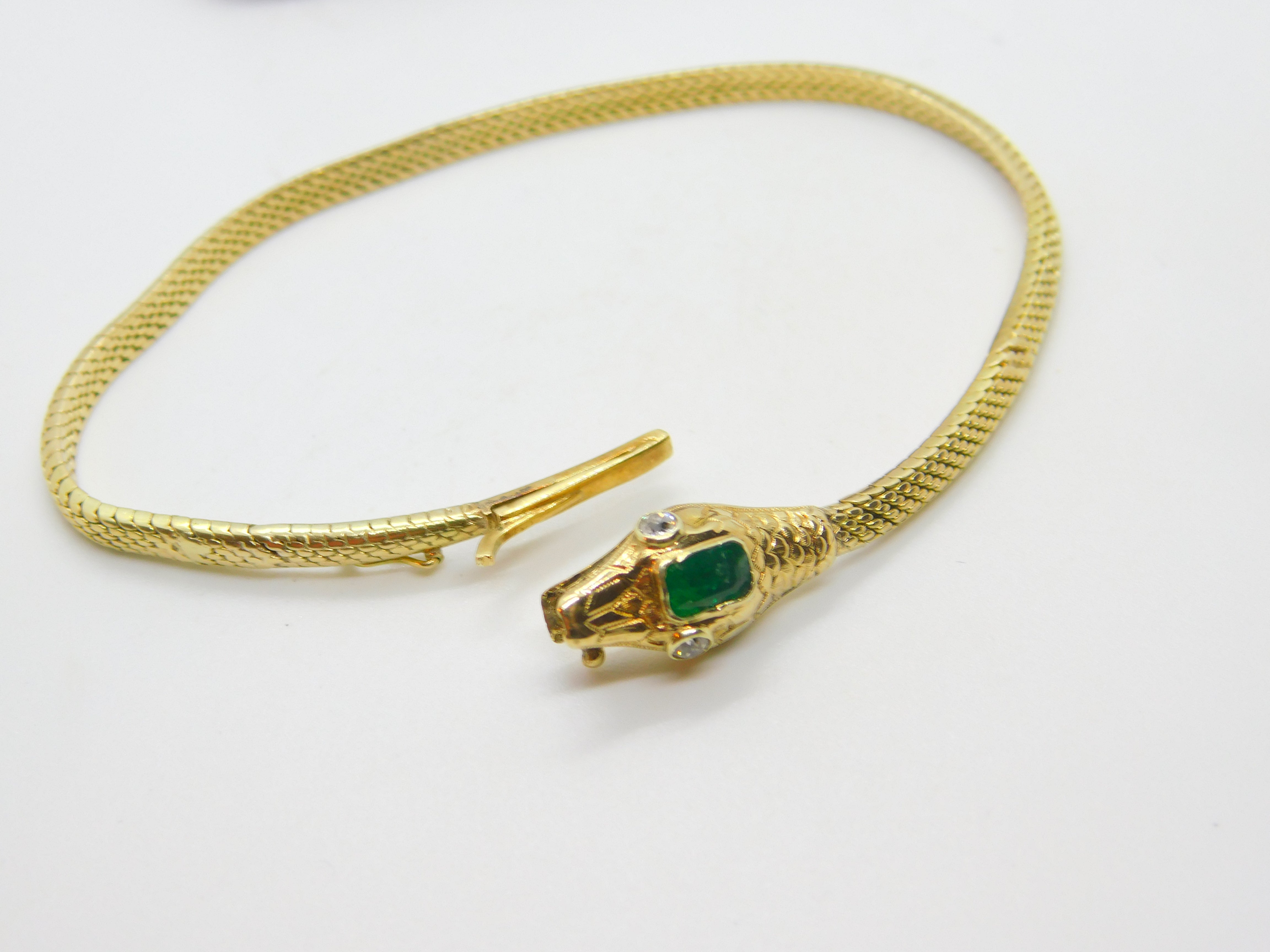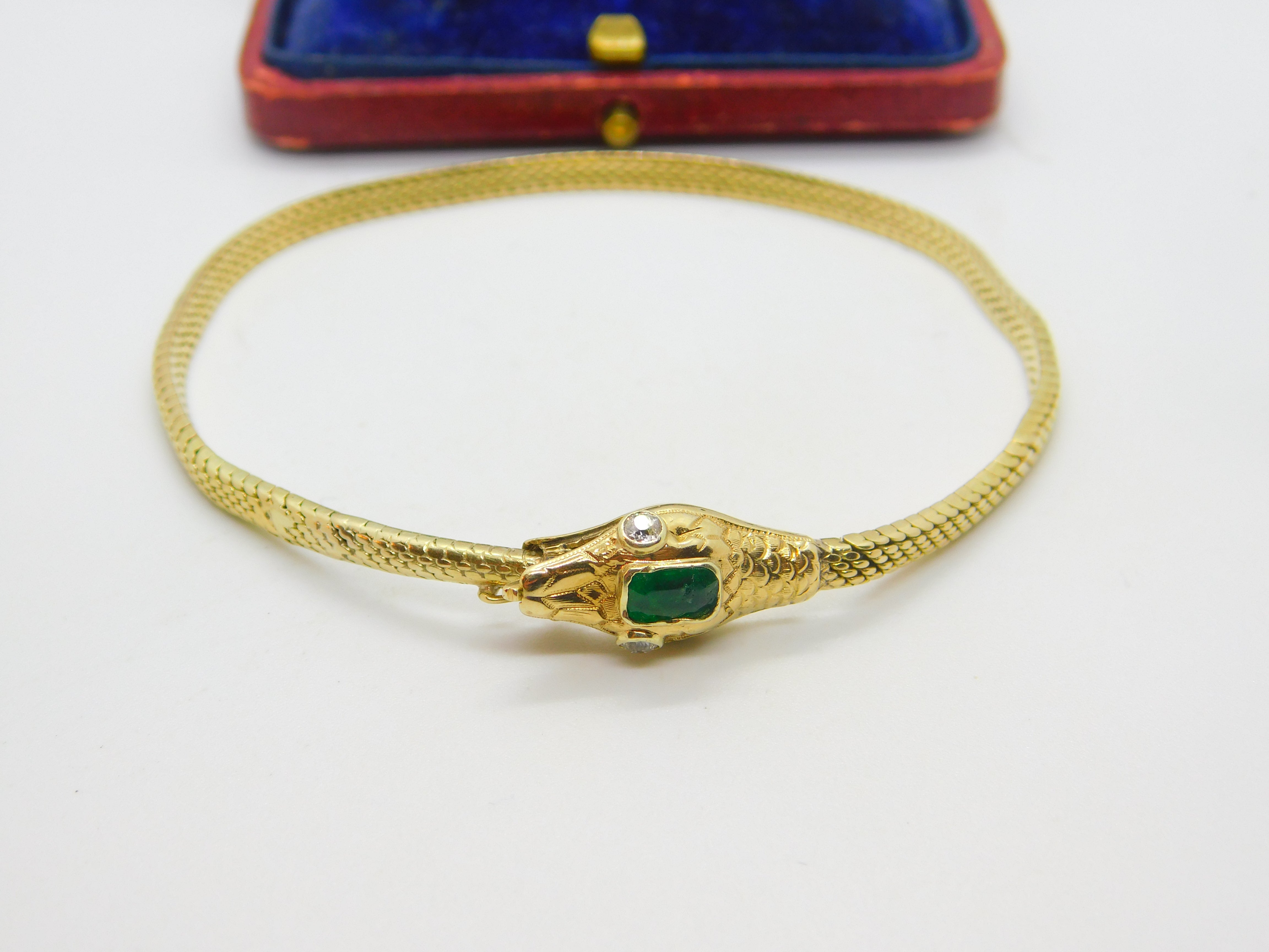 Details: A fantastic and wonderfully designed antique Victorian gold snake or serpent bracelet with stunning clasp to include a large columbian emerald and two 0.1ct diamonds for the eyes. The gold has been XRF tested as 14ct purity as it has no marks. The stones have all been tested. Two very minor repairs to the chain one near the tail. One of the best we have ever had! This is a wonderful item that would make a perfect gift or addition to any collection. The BOX pictured is for PRESENTATION ONLY and is NOT included in the listings but used to frame the pictures unless specifically stated otherwise.