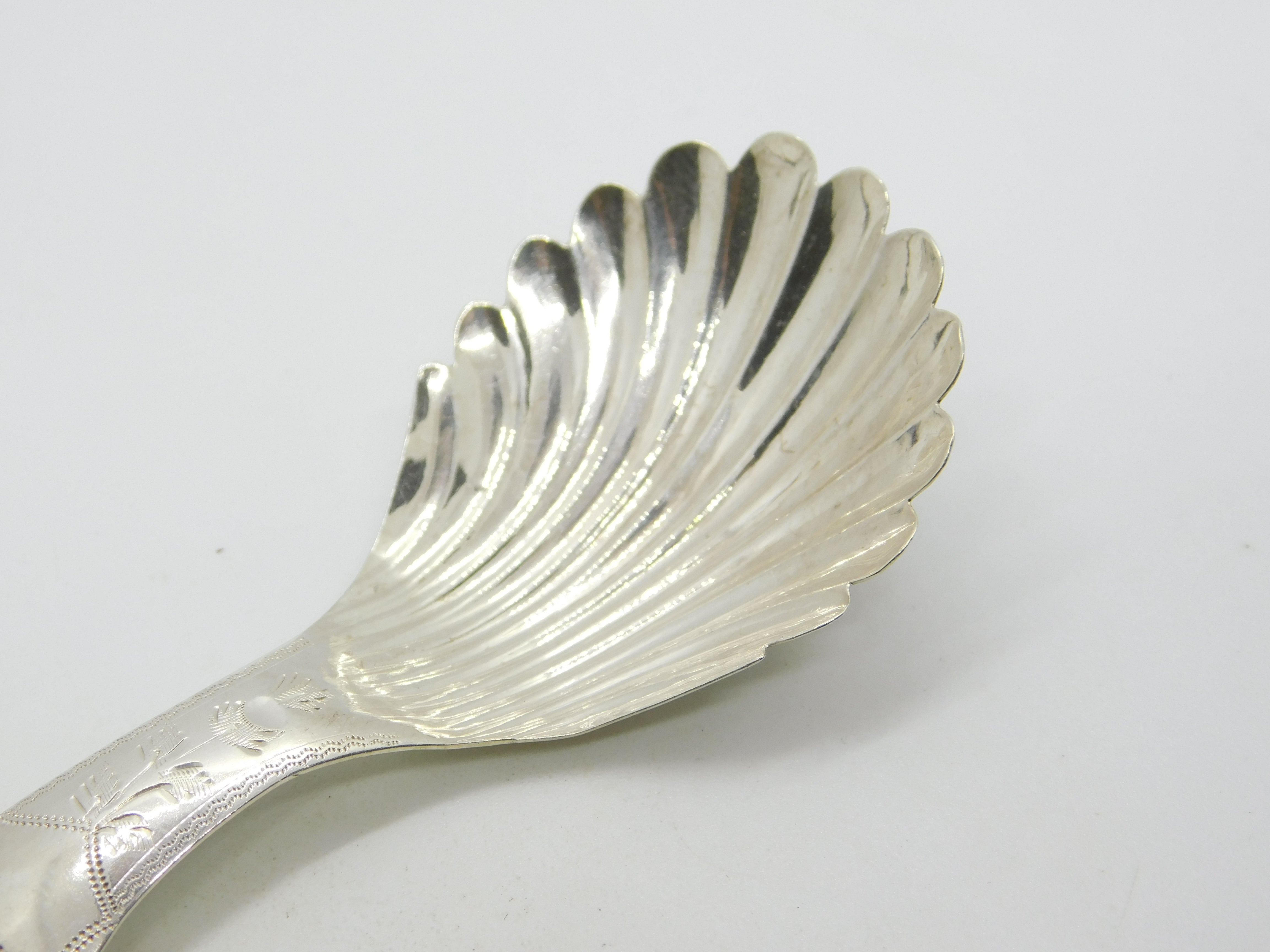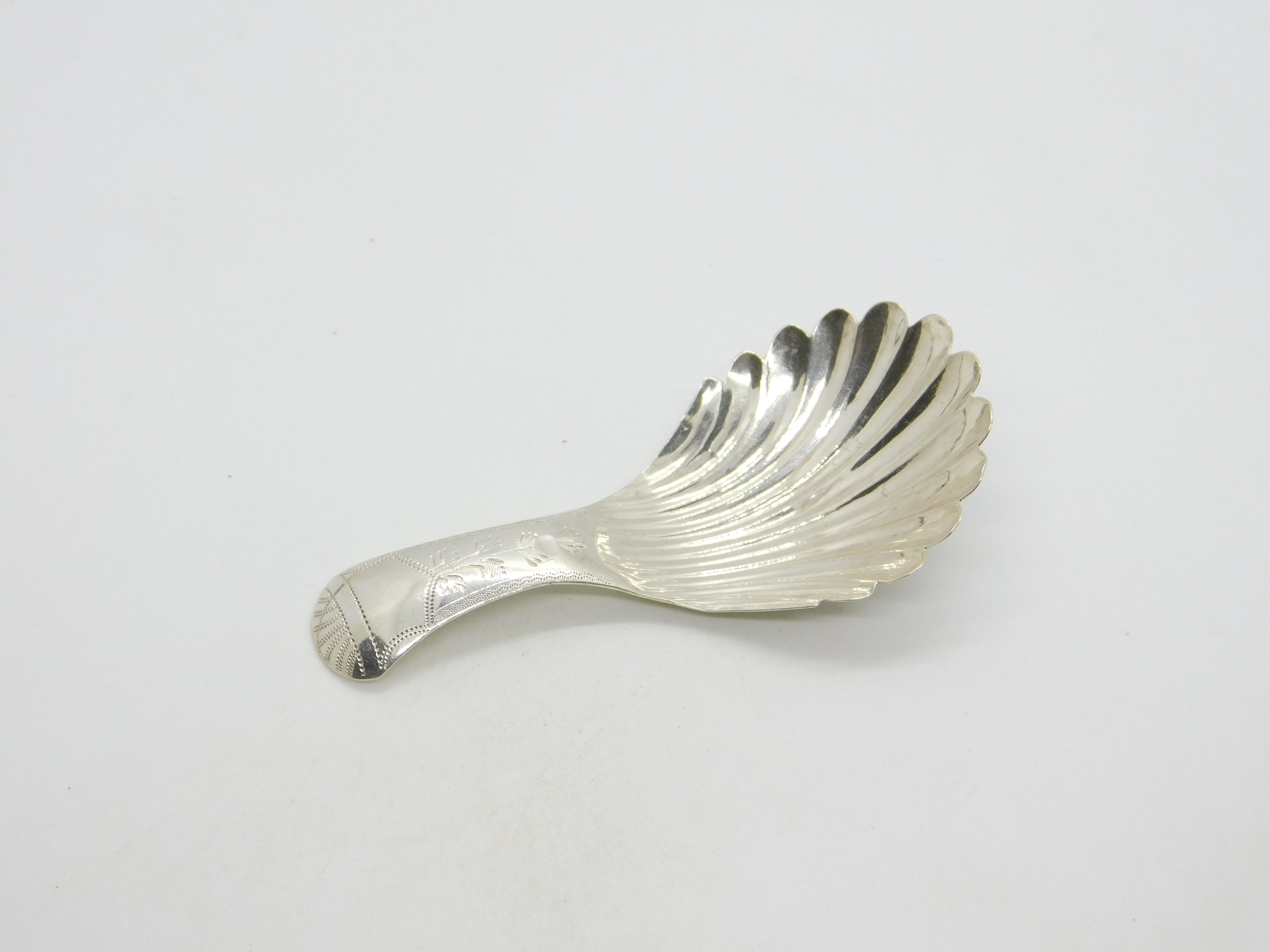 Details: A fantastic and wonderfully designed antique georgian sterling silver shell bowl tea caddy spoon with charming bright cut decoration hallmarked Birmingham 1832 by Taylor & Perry. This is a wonderful item that would make a perfect gift or addition to any collection.