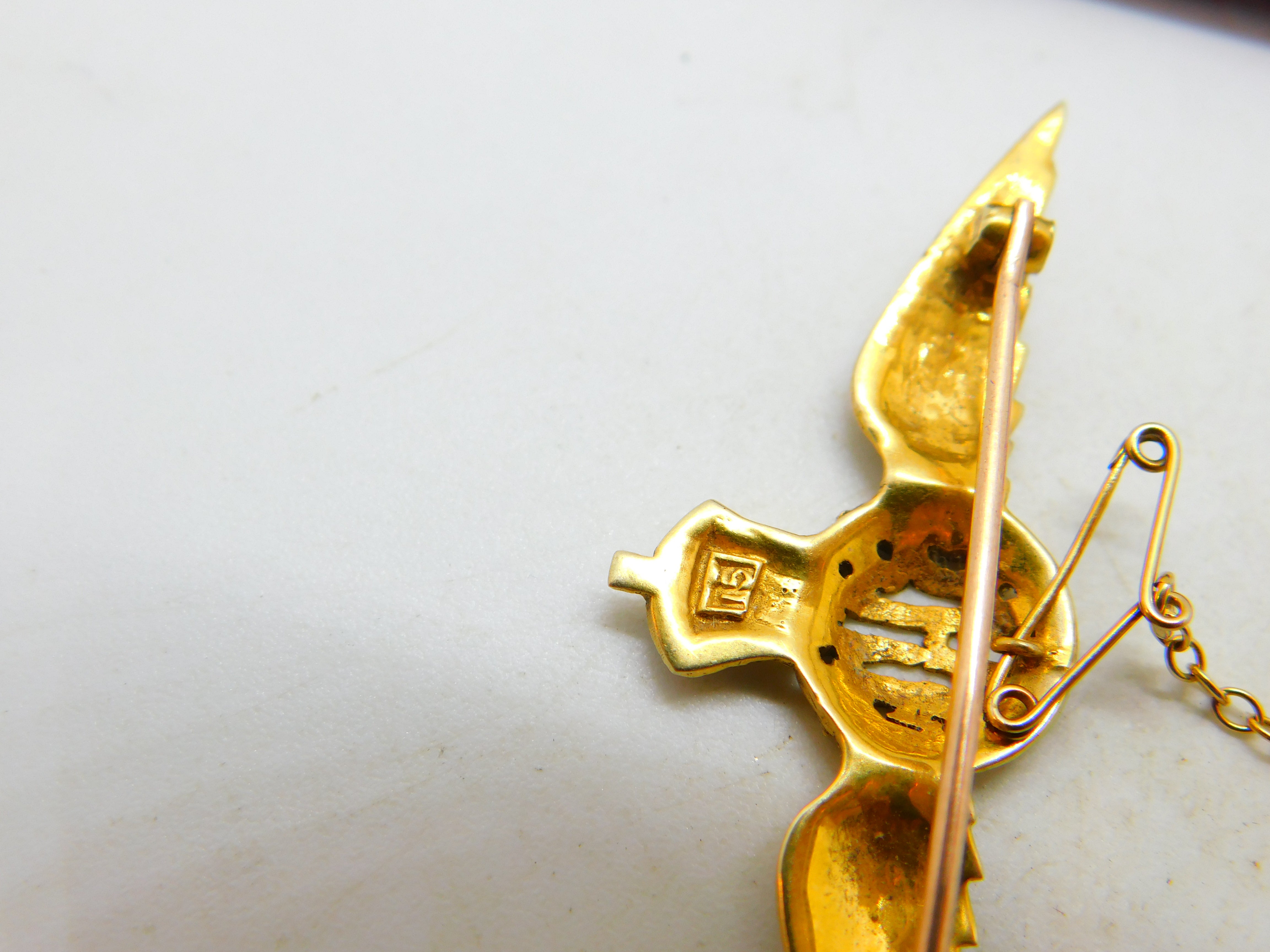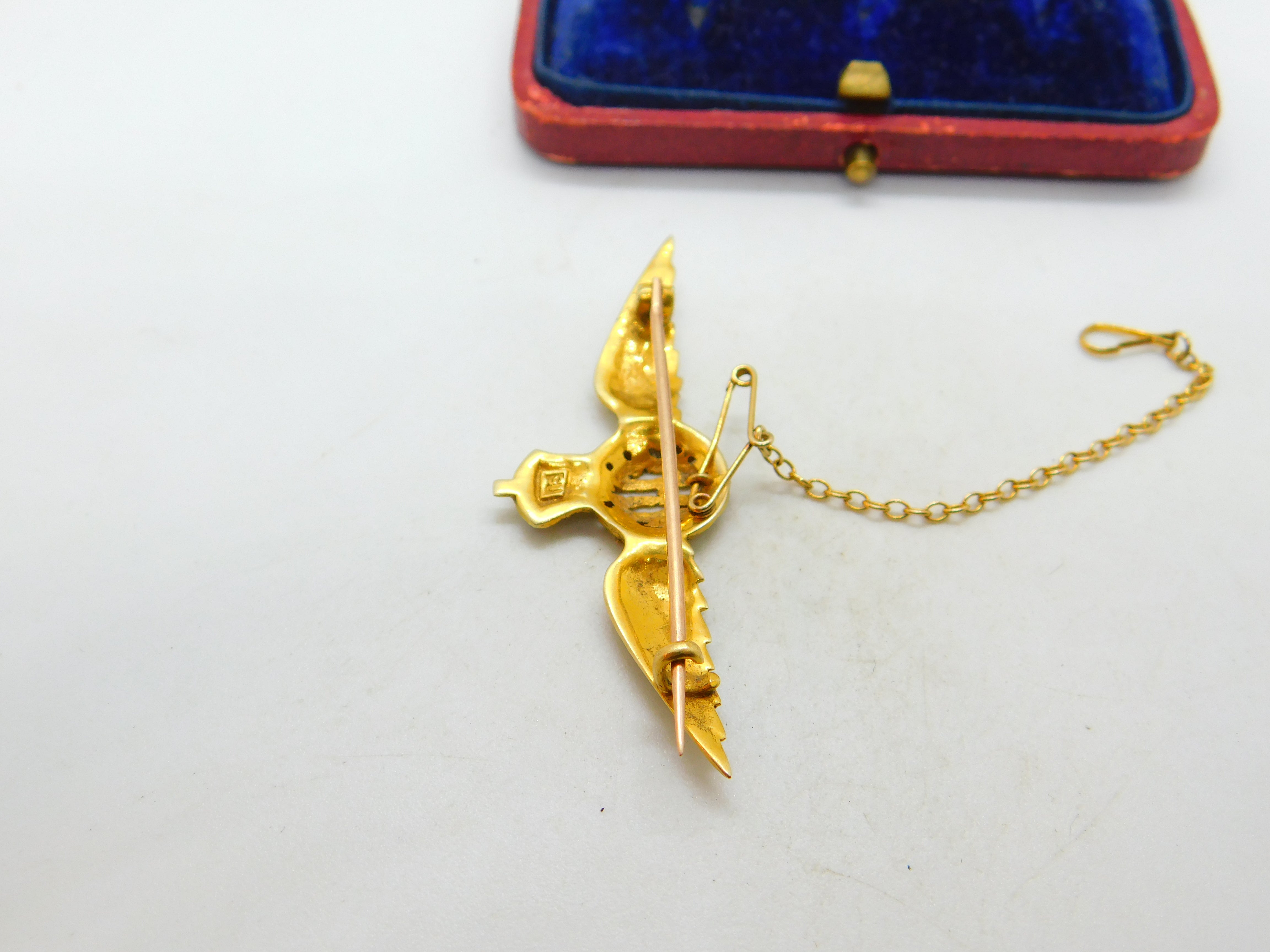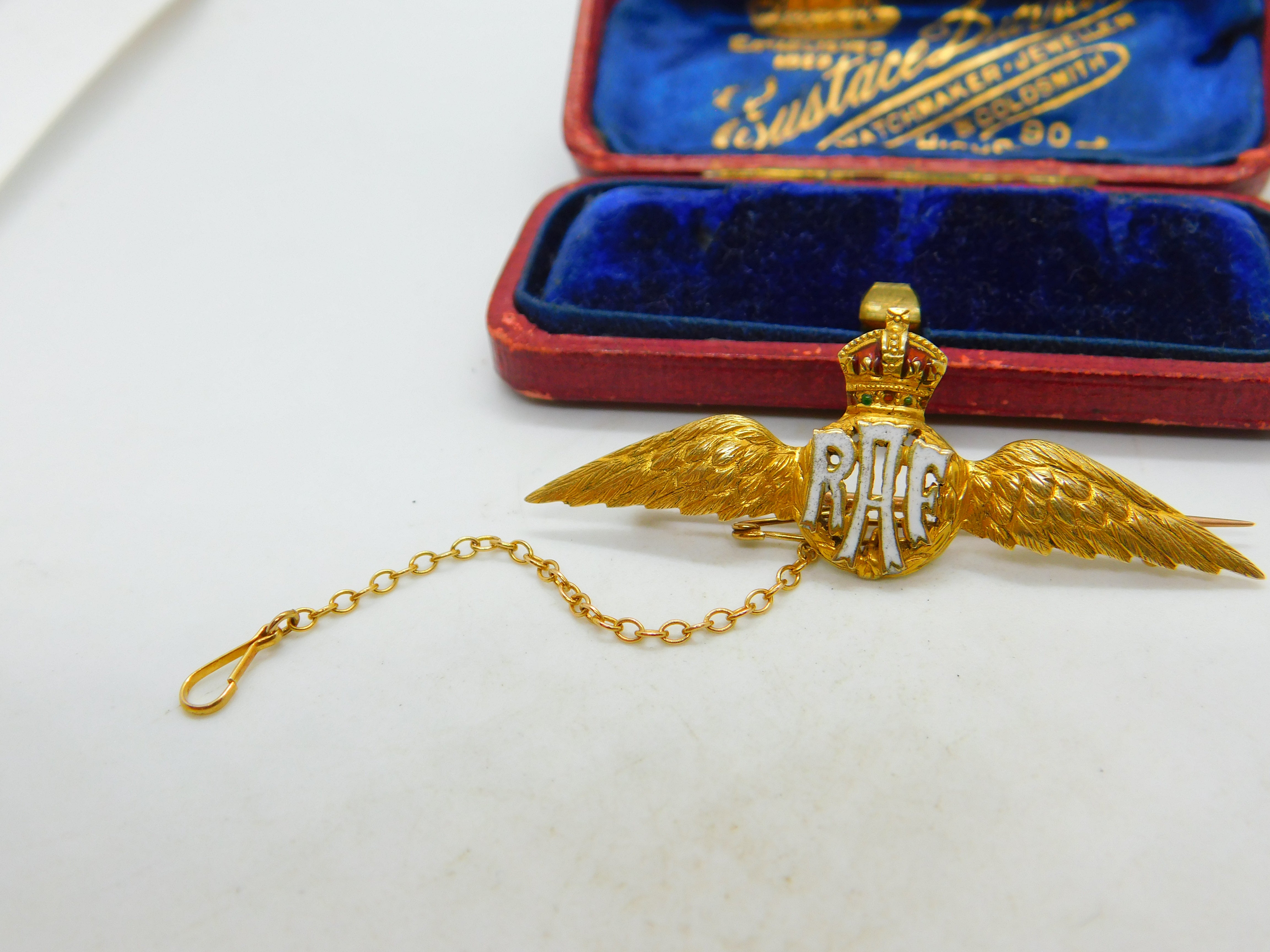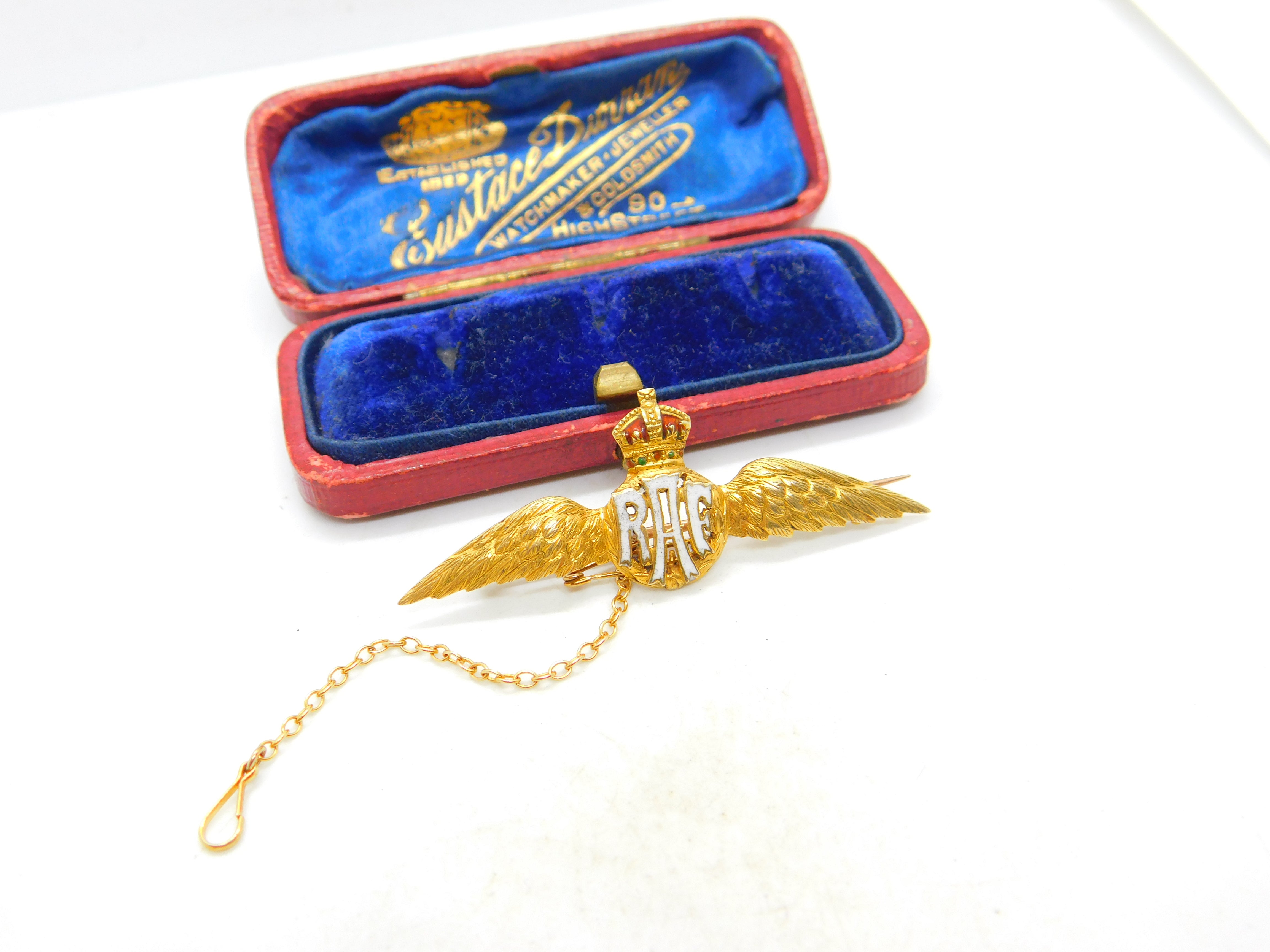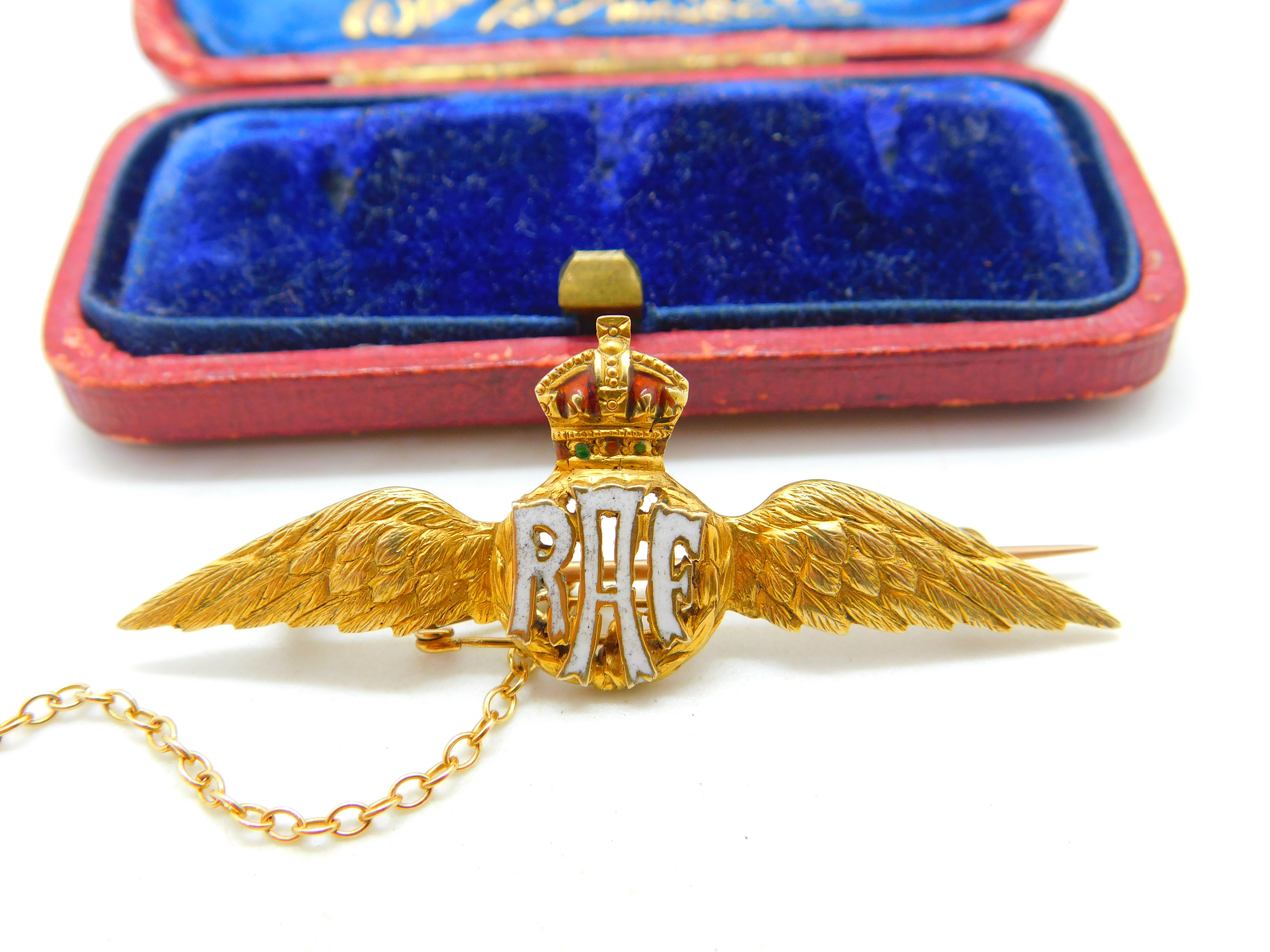 Details: A fantastic and wonderfully designed antique WWII era 15ct yellow gold RAF wings sweetheart brooch adorned with lovely colourful enamel marked 15 to the reverse and XRF tested c1940. This is a wonderful item that would make a perfect gift or addition to any collection. The BOX pictured is for PRESENTATION ONLY and is NOT included in the listings but used to frame the pictures unless specifically stated otherwise.