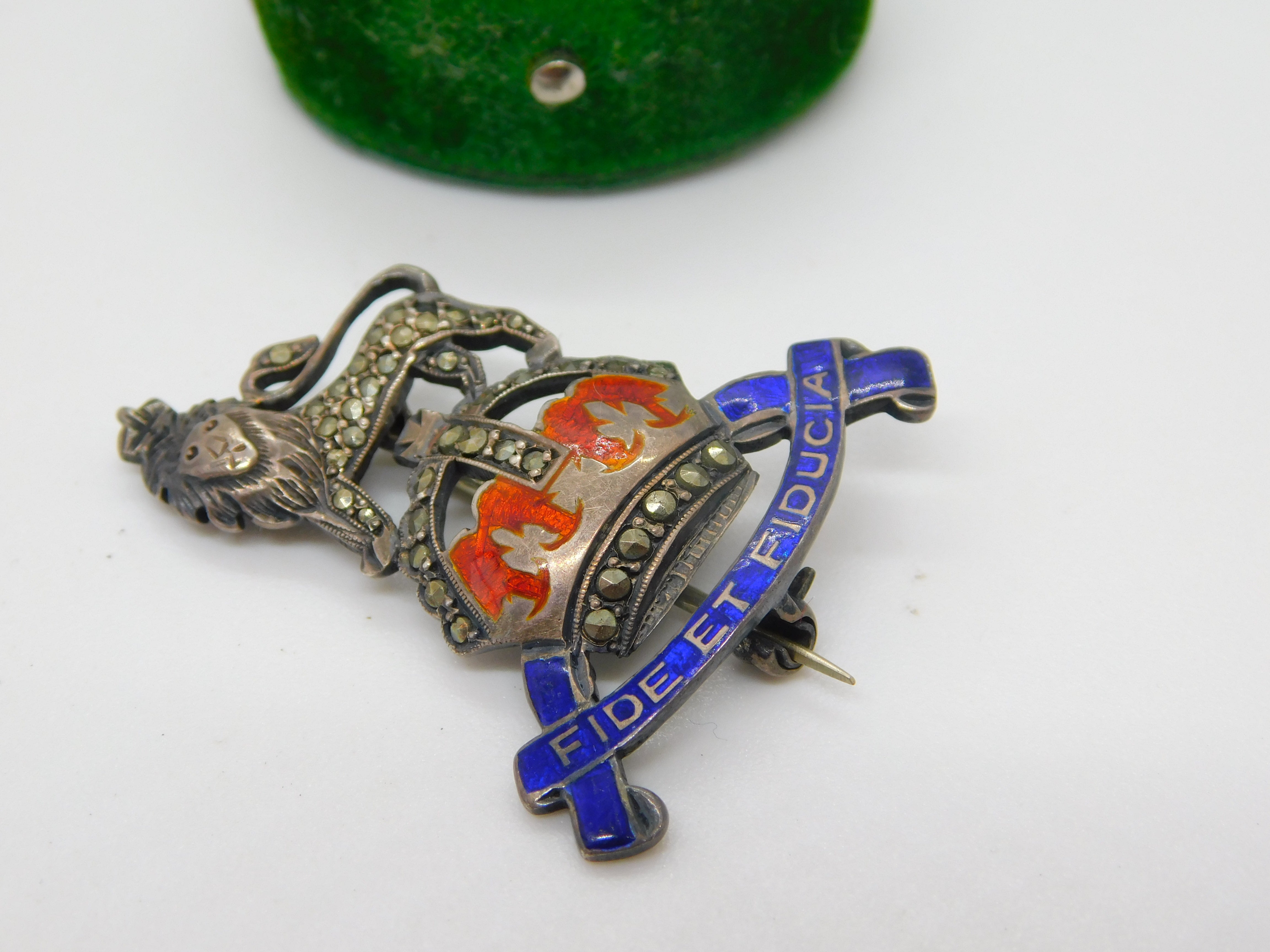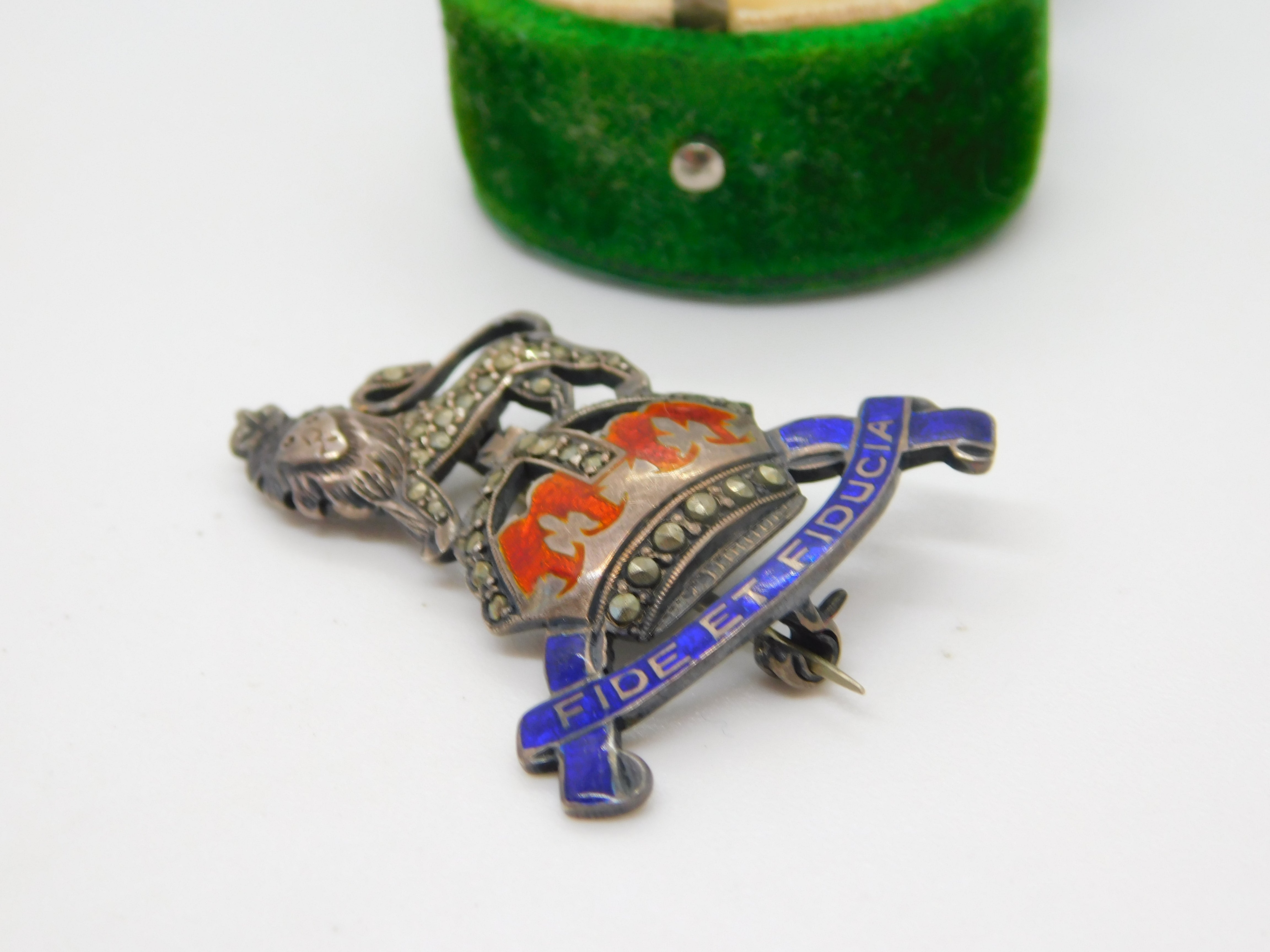 Details: A fantastic and wonderfully designed antique WWII-era sterling silver, enamel & marcasite Royal Army Pay Corps sweetheart brooch with lovely detailing c1940. This is a wonderful item that would make a perfect gift or addition to any collection. The BOX pictured is for PRESENTATION ONLY and is NOT included in the listings but used to frame the pictures unless specifically stated otherwise.