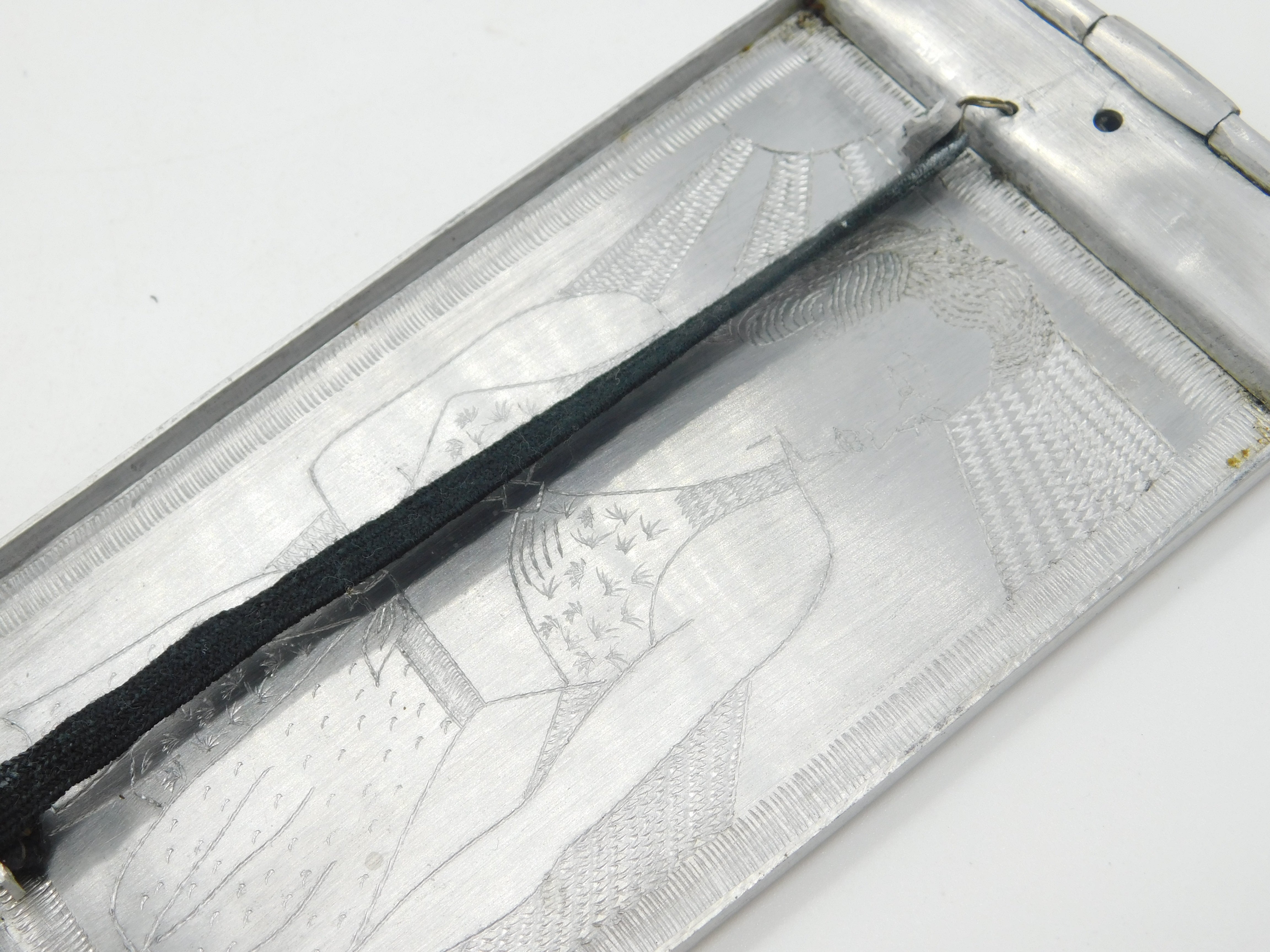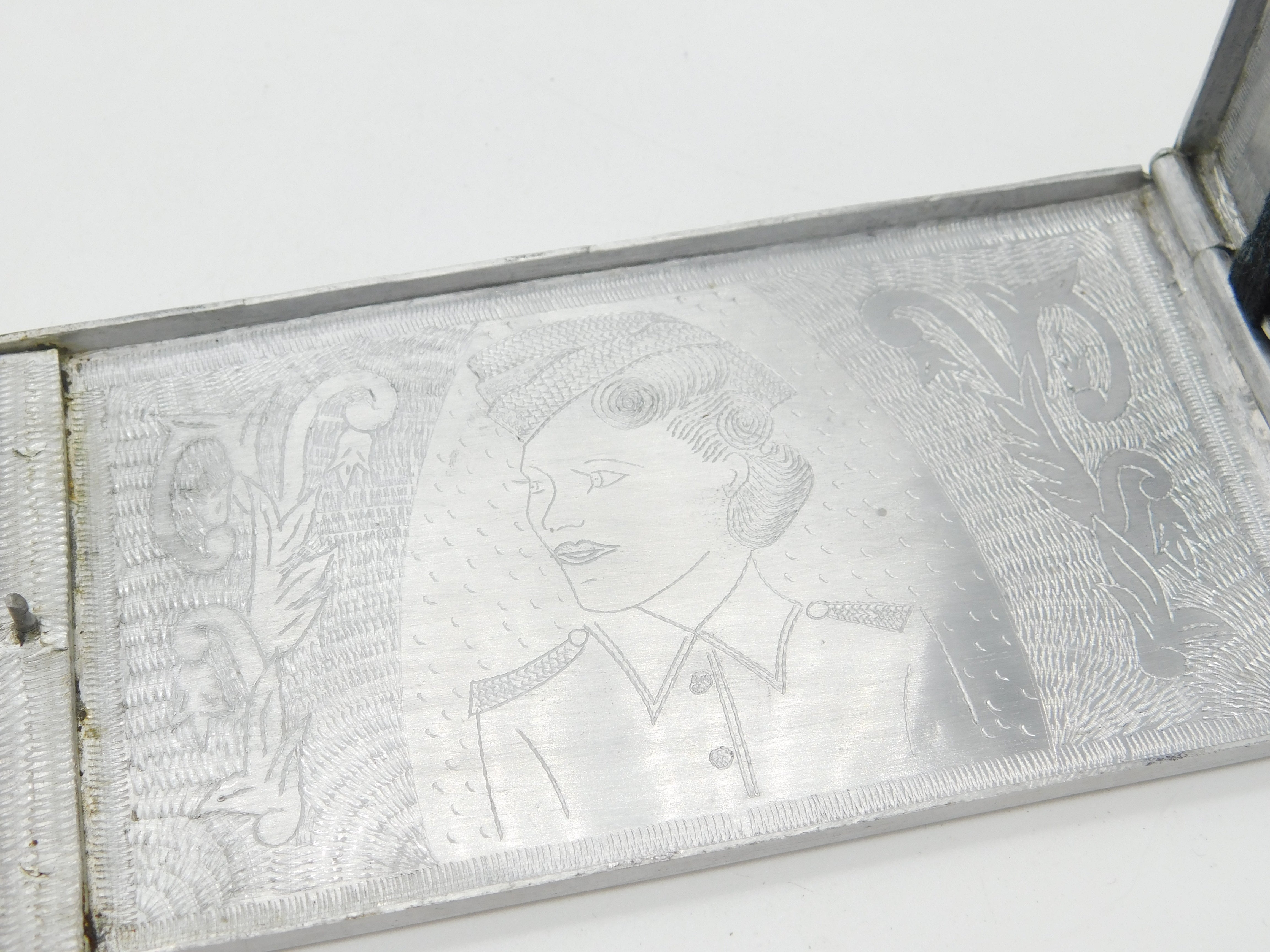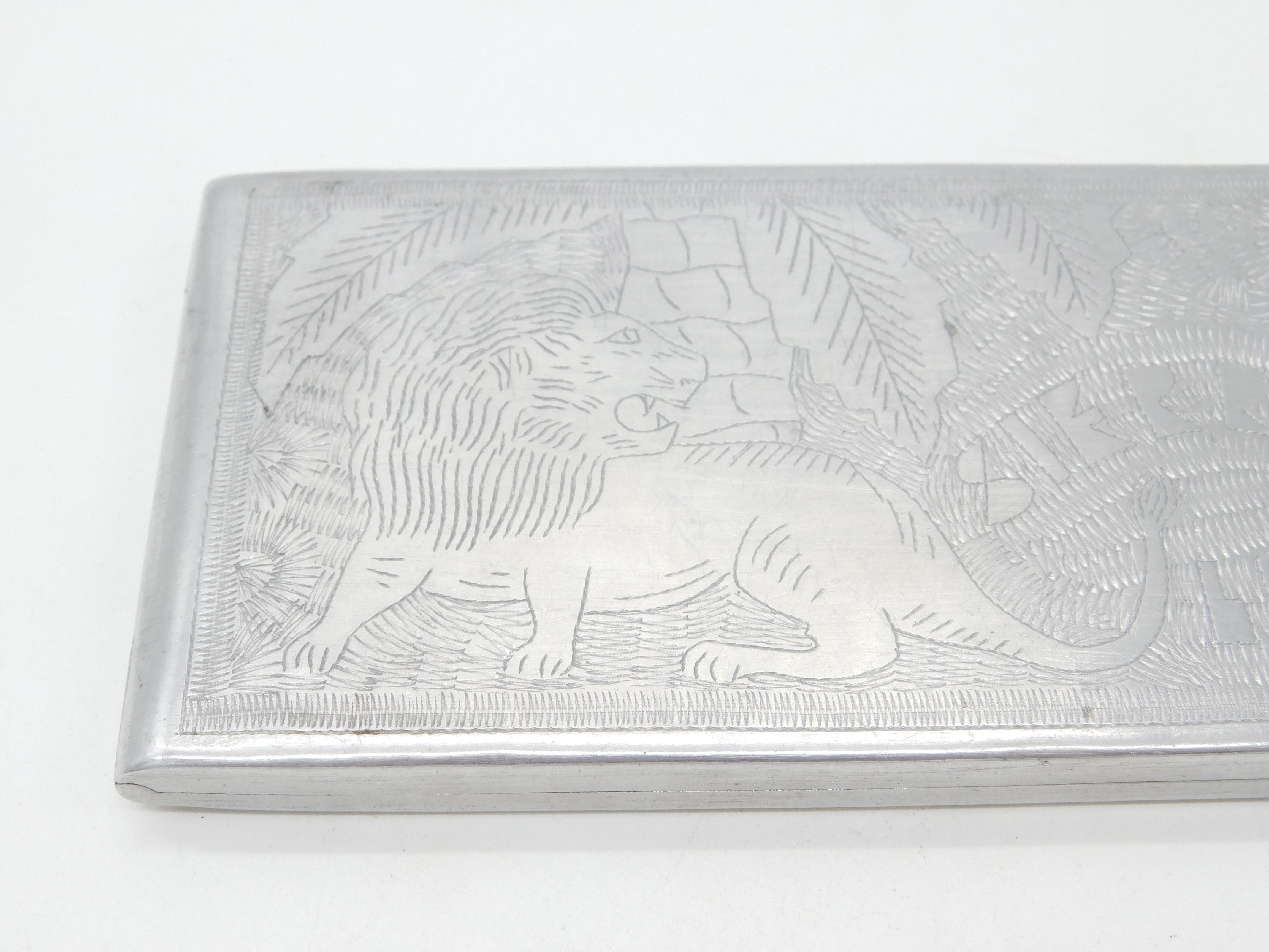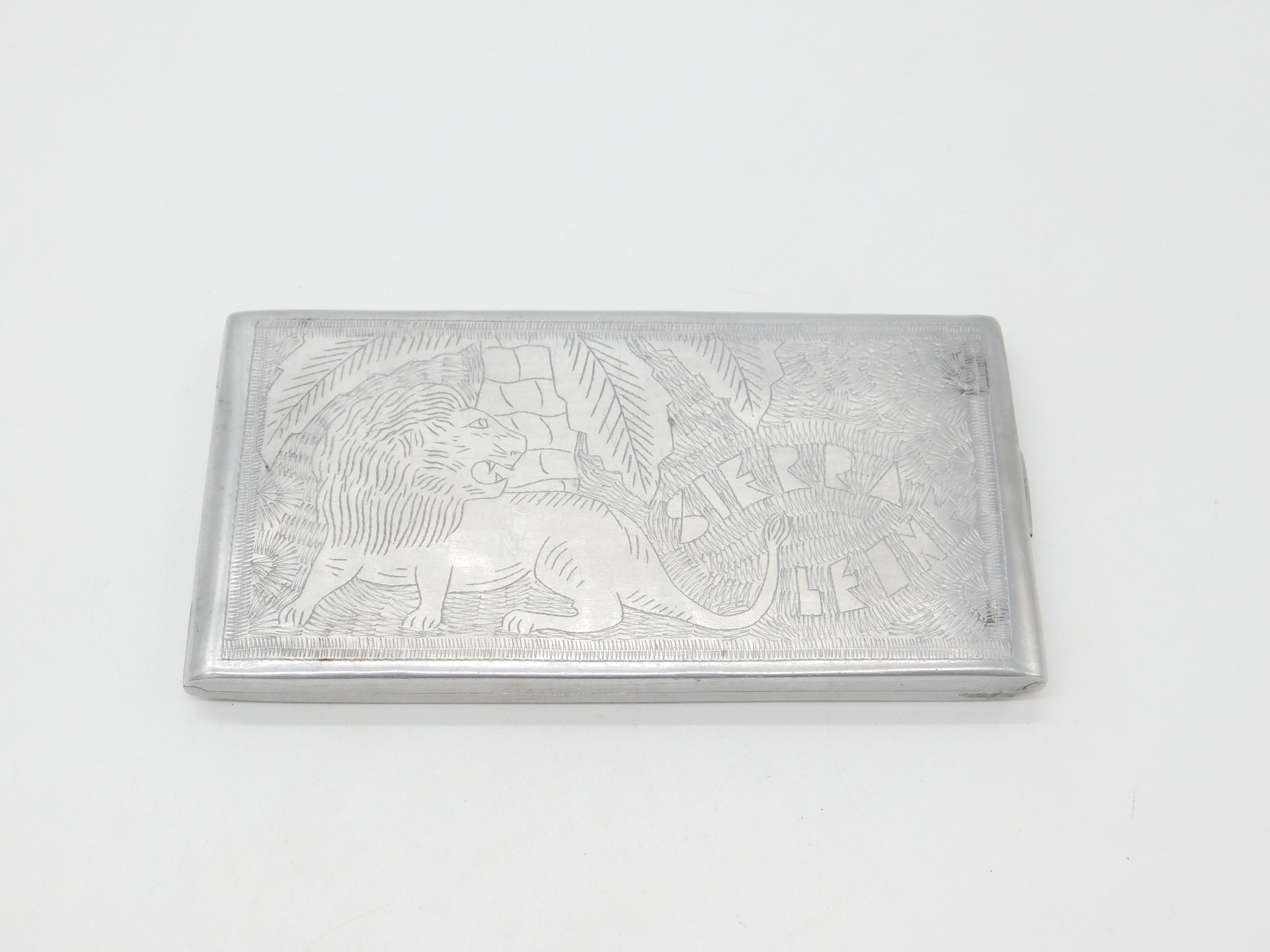 Details: A fantastic and wonderfully designed antique WWII-era 'trench art' or soldier made aluminum large cigarette case with lovely etchings of a Lion and the ladies to the interior marked Sierra Leone c1945 an important convoy station for the allied africa campaign. This is a wonderful item that would make a perfect gift or addition to any collection. The BOX pictured is for PRESENTATION ONLY and is NOT included in the listings but used to frame the pictures unless specifically stated otherwise.