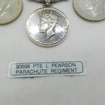 Details: A fantastic and wonderfully designed antique WWII collection of service medals to include France & Germany Star, General Service & Palestine General Service 1946 medal as well as others issued to PTW L Pearson of the Parachute Regiment. This is a wonderful item that would make a perfect gift or addition to any collection. The BOX pictured is for PRESENTATION ONLY and is NOT included in the listings but used to frame the pictures unless specifically stated otherwise.