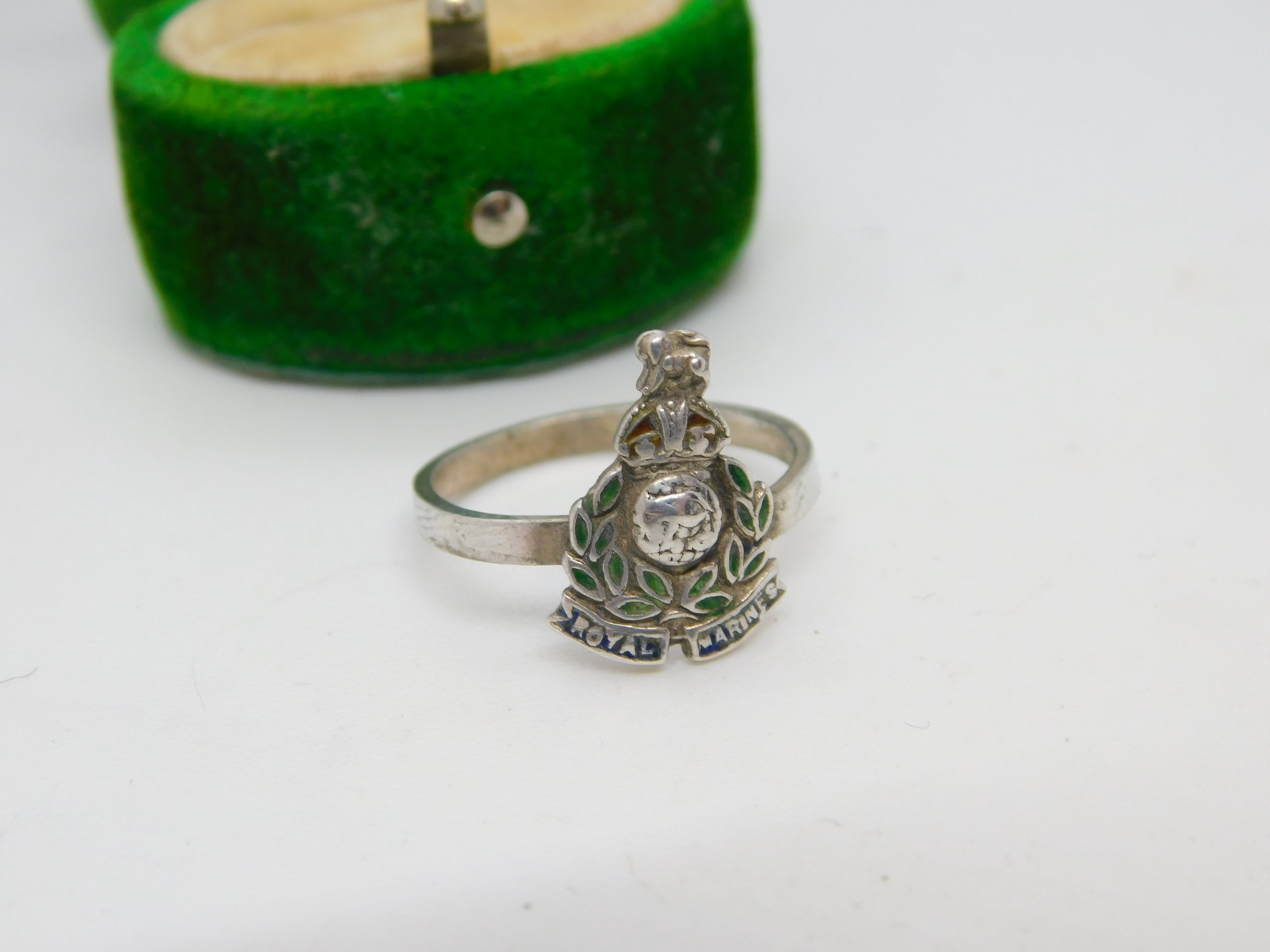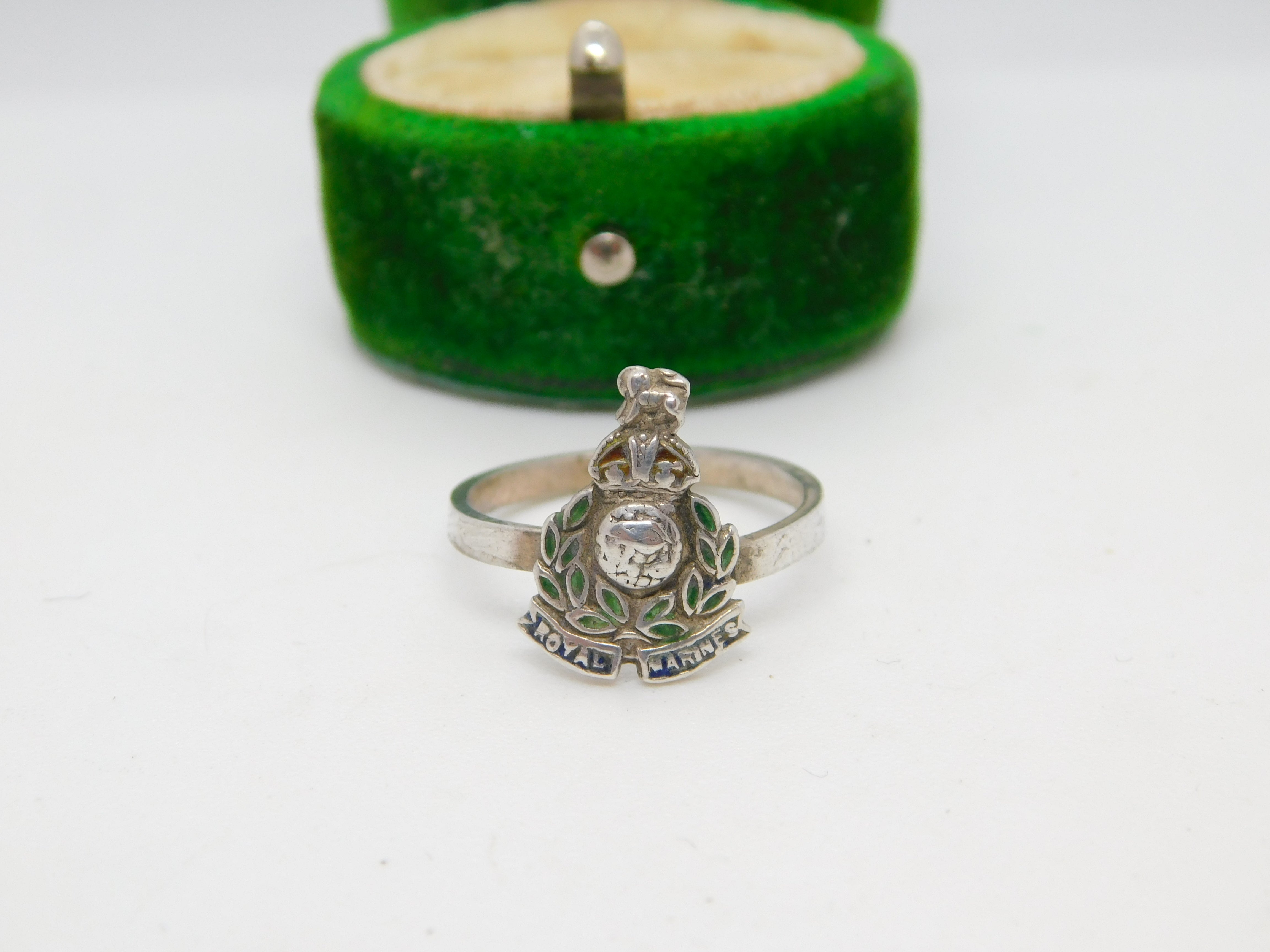 Details: A fantastic and wonderfully designed antique art deco sterling silver enamel Royal Marines sweetheart ring with lovely detailing c1940. This is a wonderful item that would make a perfect gift or addition to any collection. The BOX pictured is for PRESENTATION ONLY and is NOT included in the listings but used to frame the pictures unless specifically stated otherwise.